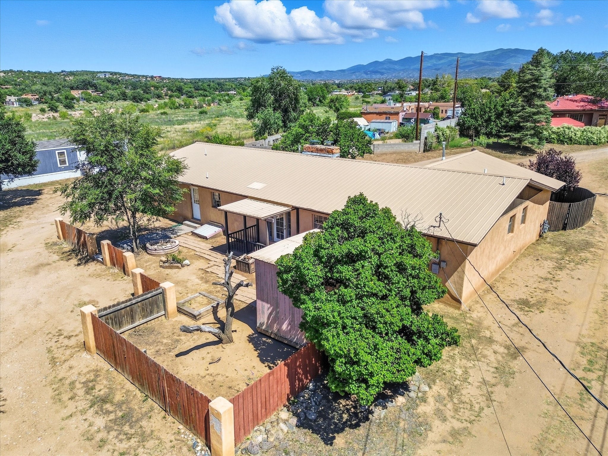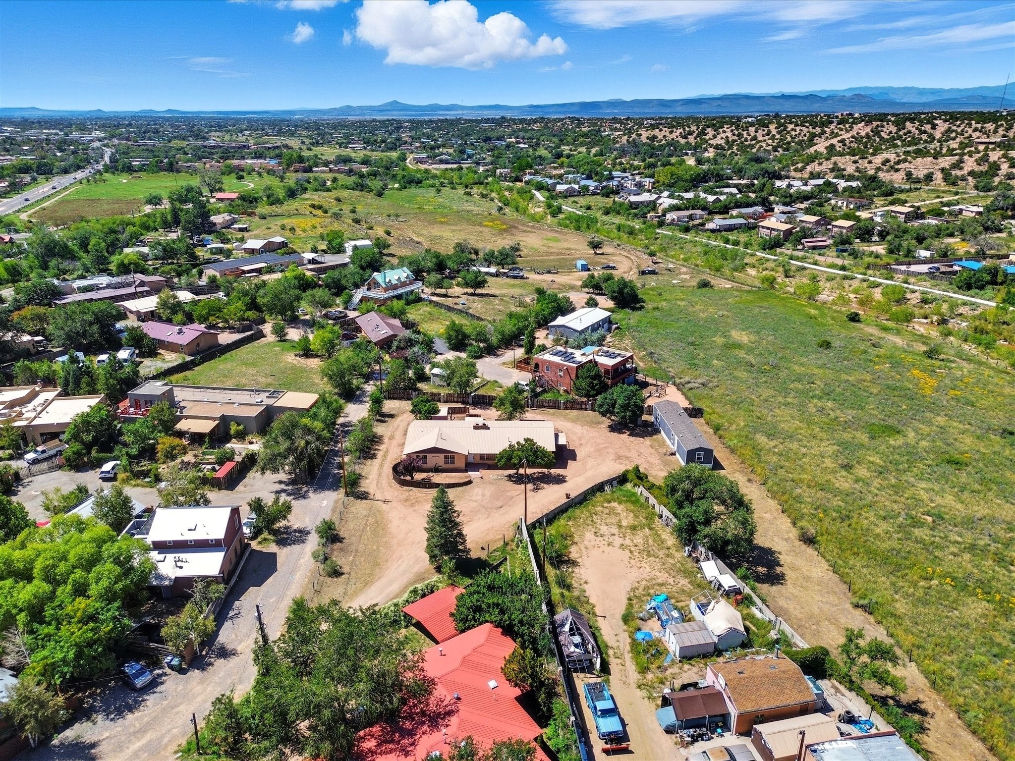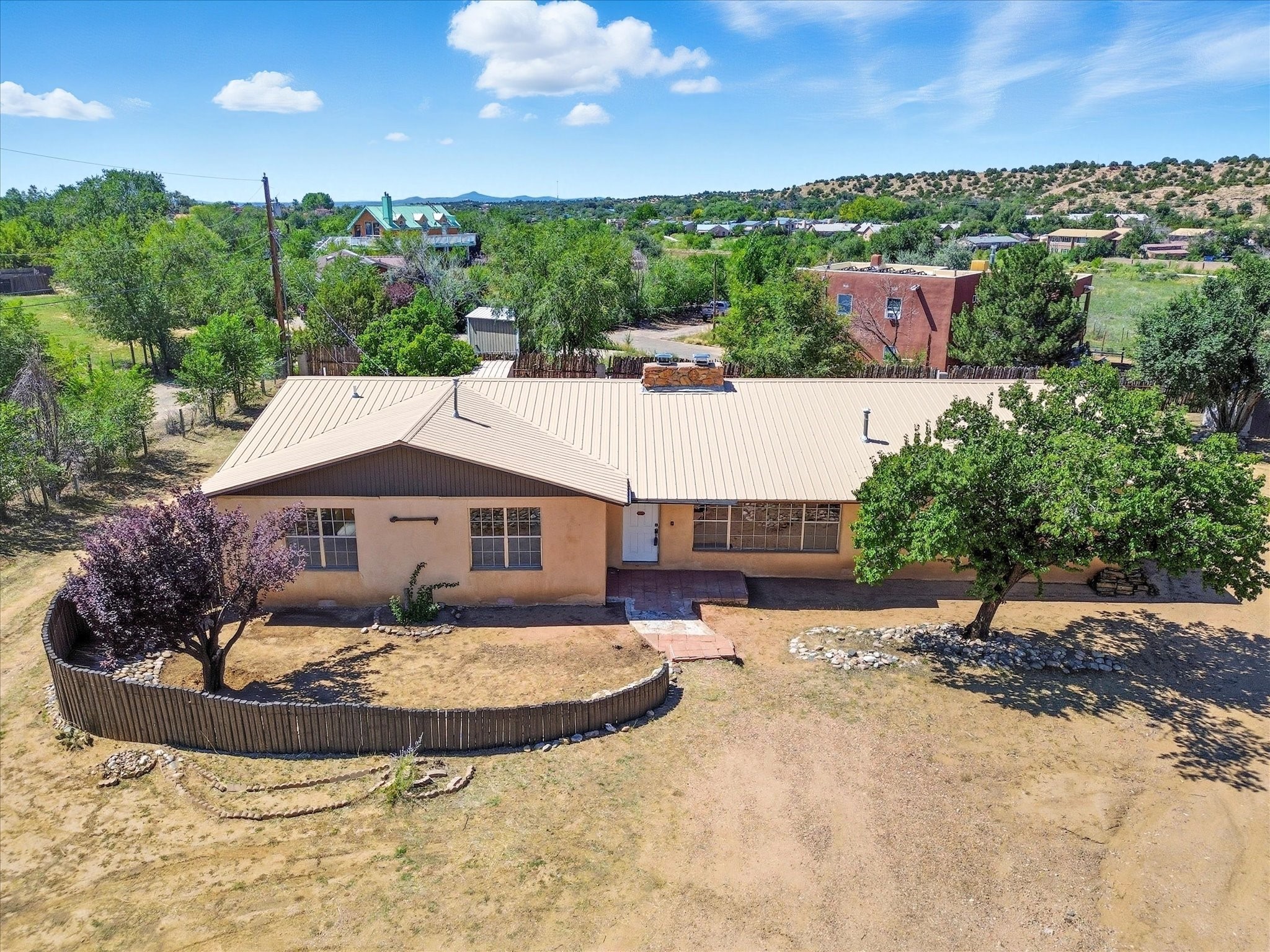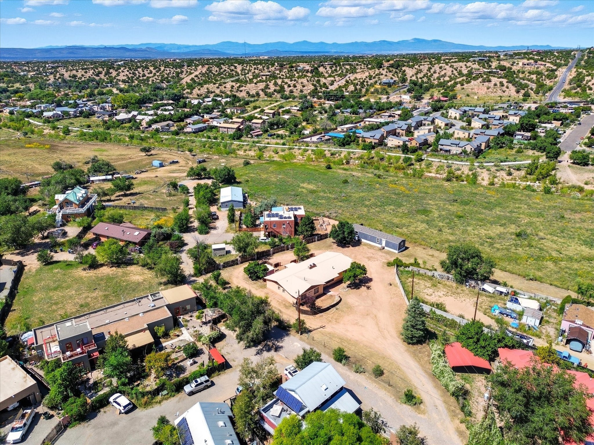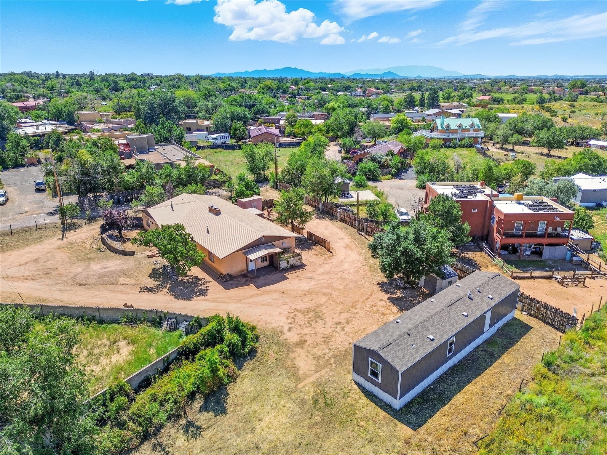 Exceptional opportunity on acre, backing to open land with the Santa Fe River just beyond. This unique property offers a main residence, a private studio apartment, and a manufactured home--ideal for guest quarters, multi-generational living, or income potential. The main house is adobe and has original hardwood floors throughout (under the carpet), a wood burning double-sided fireplace, four bedrooms and two bathrooms. The studio has a large living space, kitchen and full bathroom. The 2019 manufactured home includes two bedrooms, two bathrooms and refrigerated air. Enjoy privacy, space and mountain views, just 3 miles from the Santa Fe plaza and near trails, shopping, dining, parks, and schools.