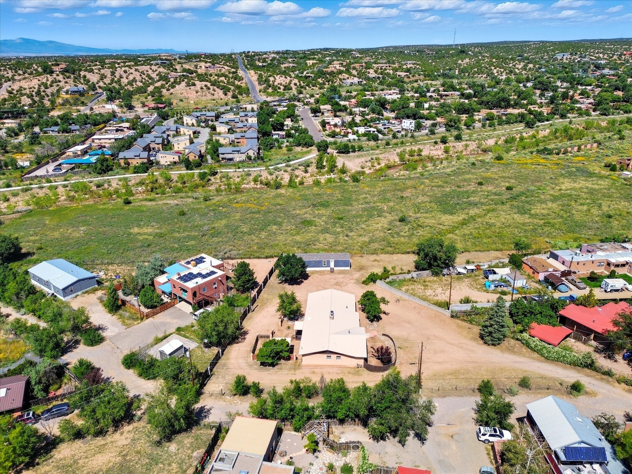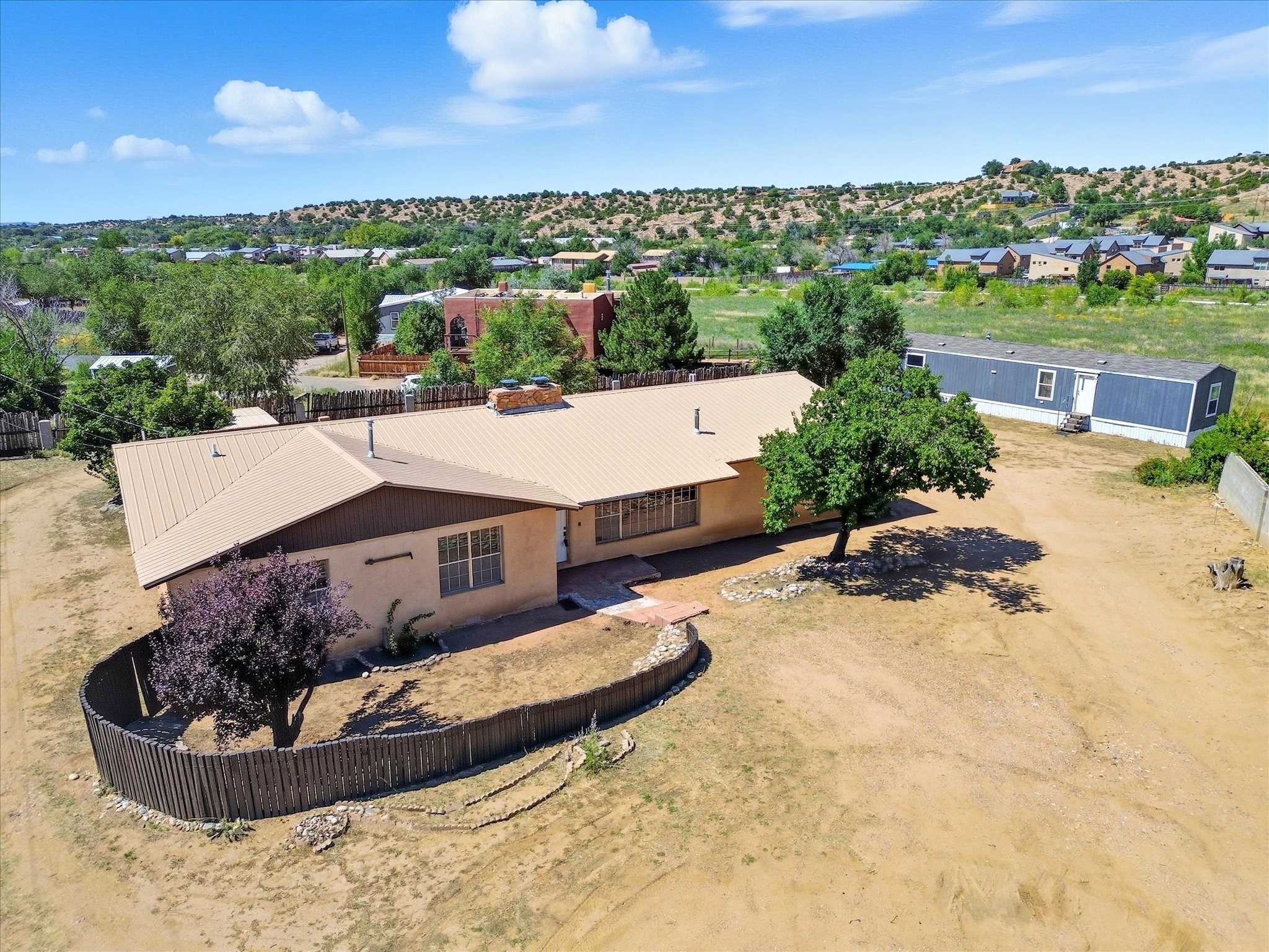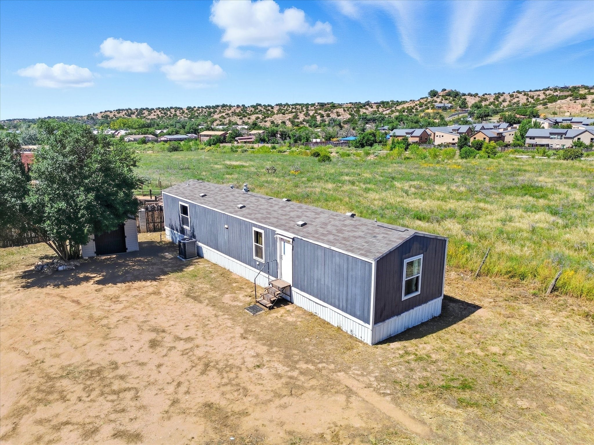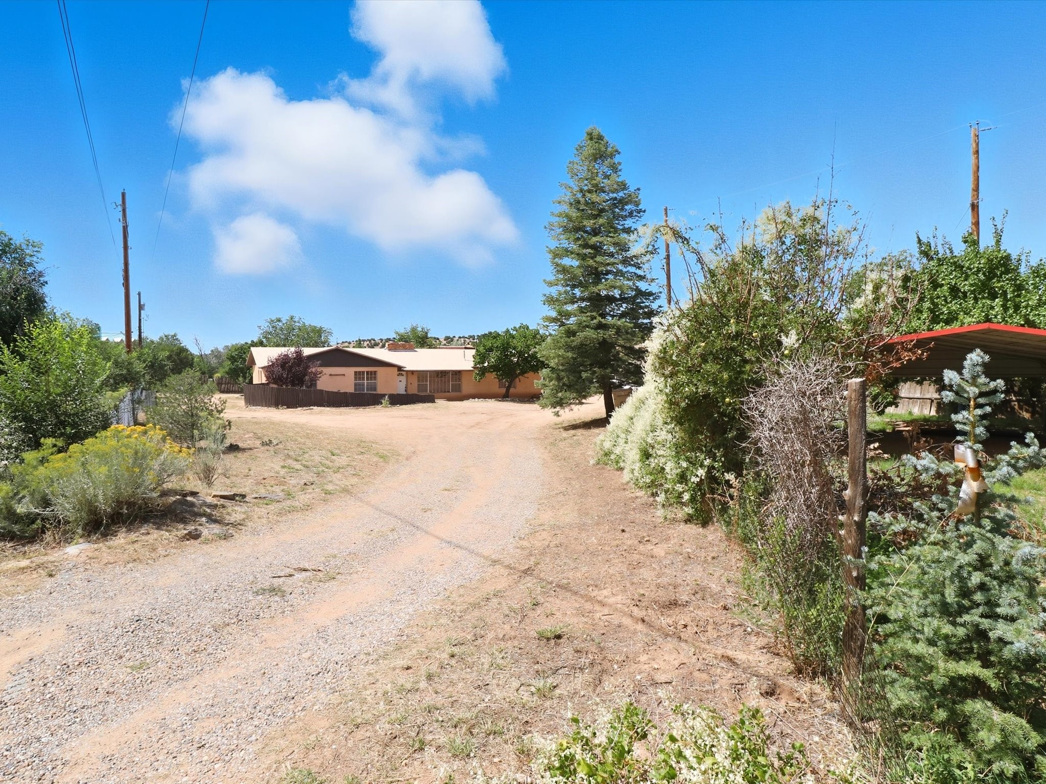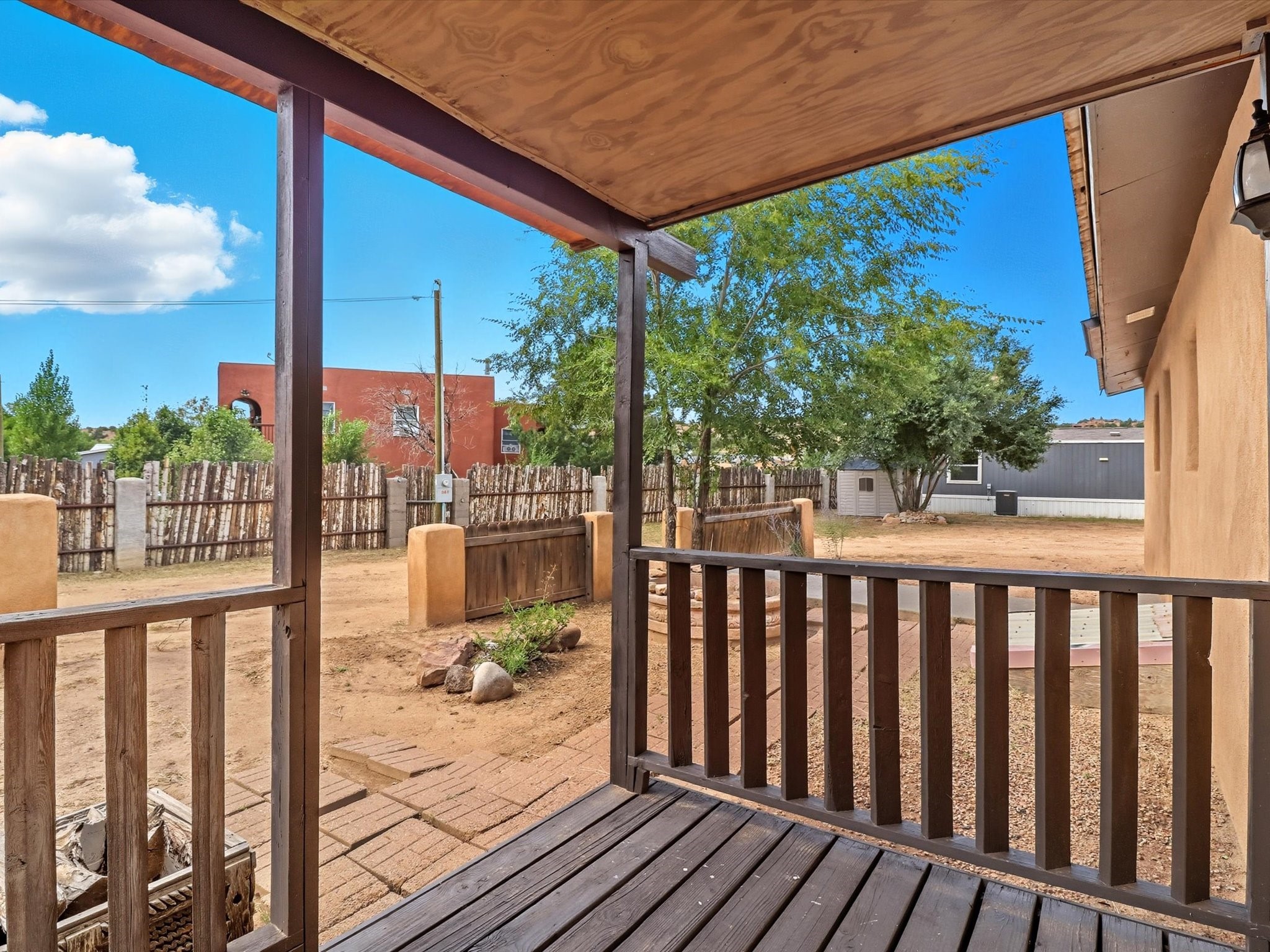 Exceptional opportunity on acre, backing to open land with the Santa Fe River just beyond. This unique property offers a main residence, a private studio apartment, and a manufactured home--ideal for guest quarters, multi-generational living, or income potential. The main house is adobe and has original hardwood floors throughout (under the carpet), a wood burning double-sided fireplace, four bedrooms and two bathrooms. The studio has a large living space, kitchen and full bathroom. The 2019 manufactured home includes two bedrooms, two bathrooms and refrigerated air. Enjoy privacy, space and mountain views, just 3 miles from the Santa Fe plaza and near trails, shopping, dining, parks, and schools.
