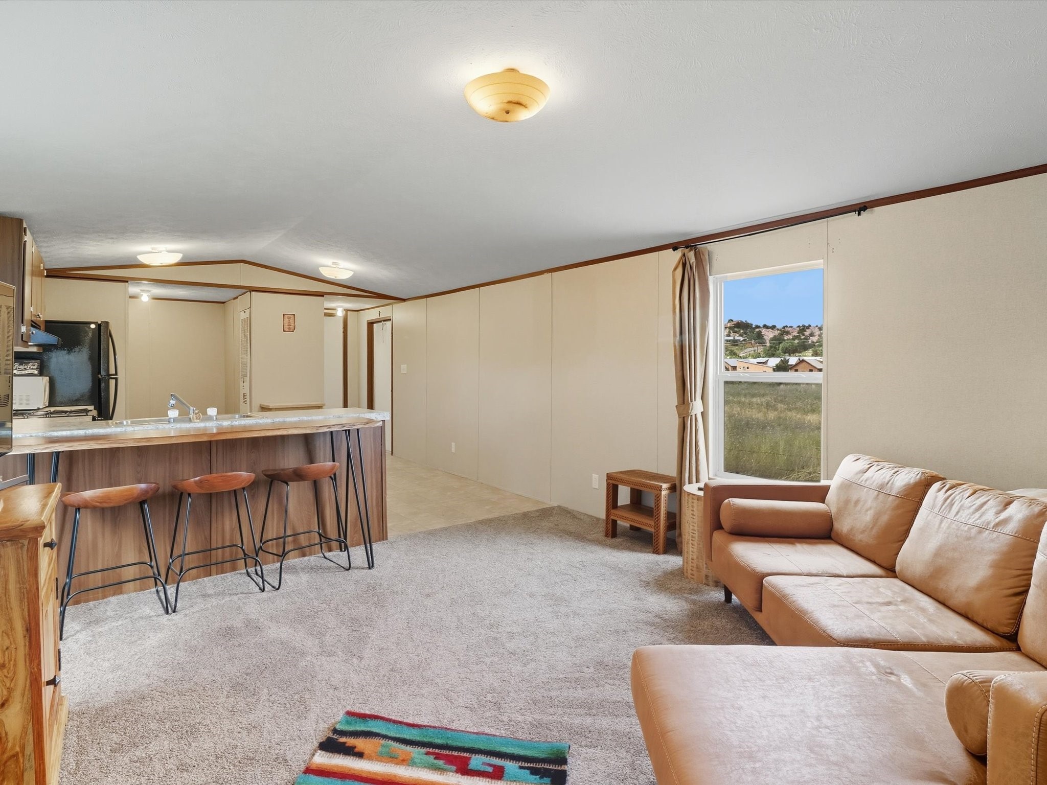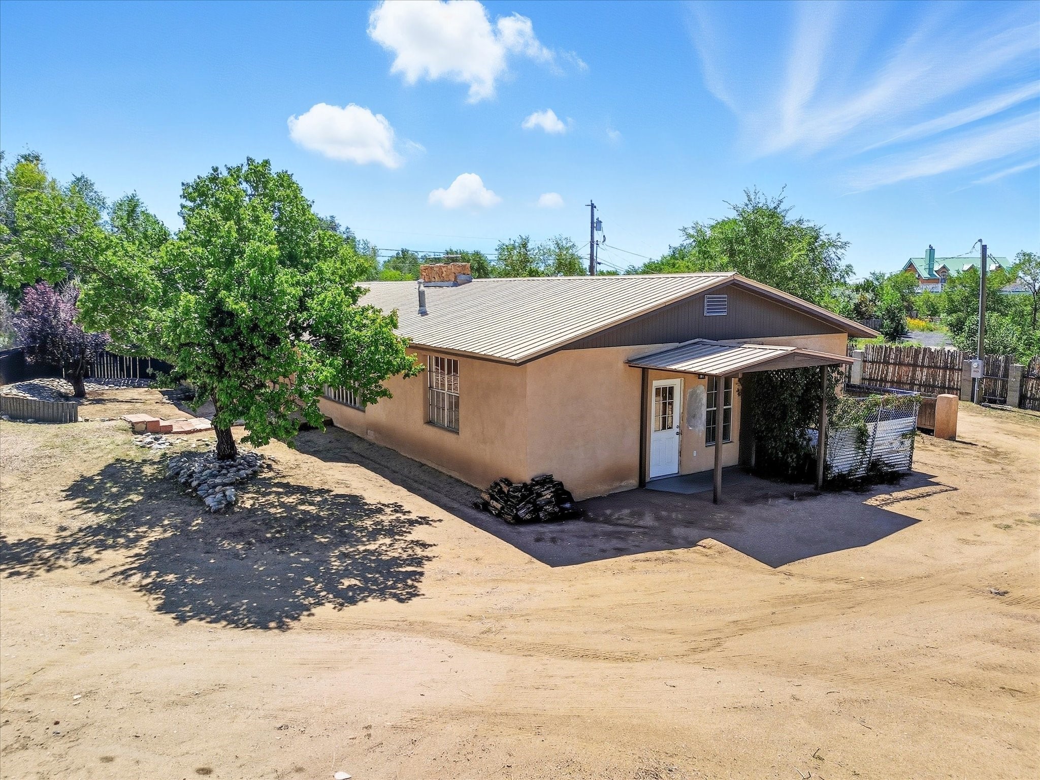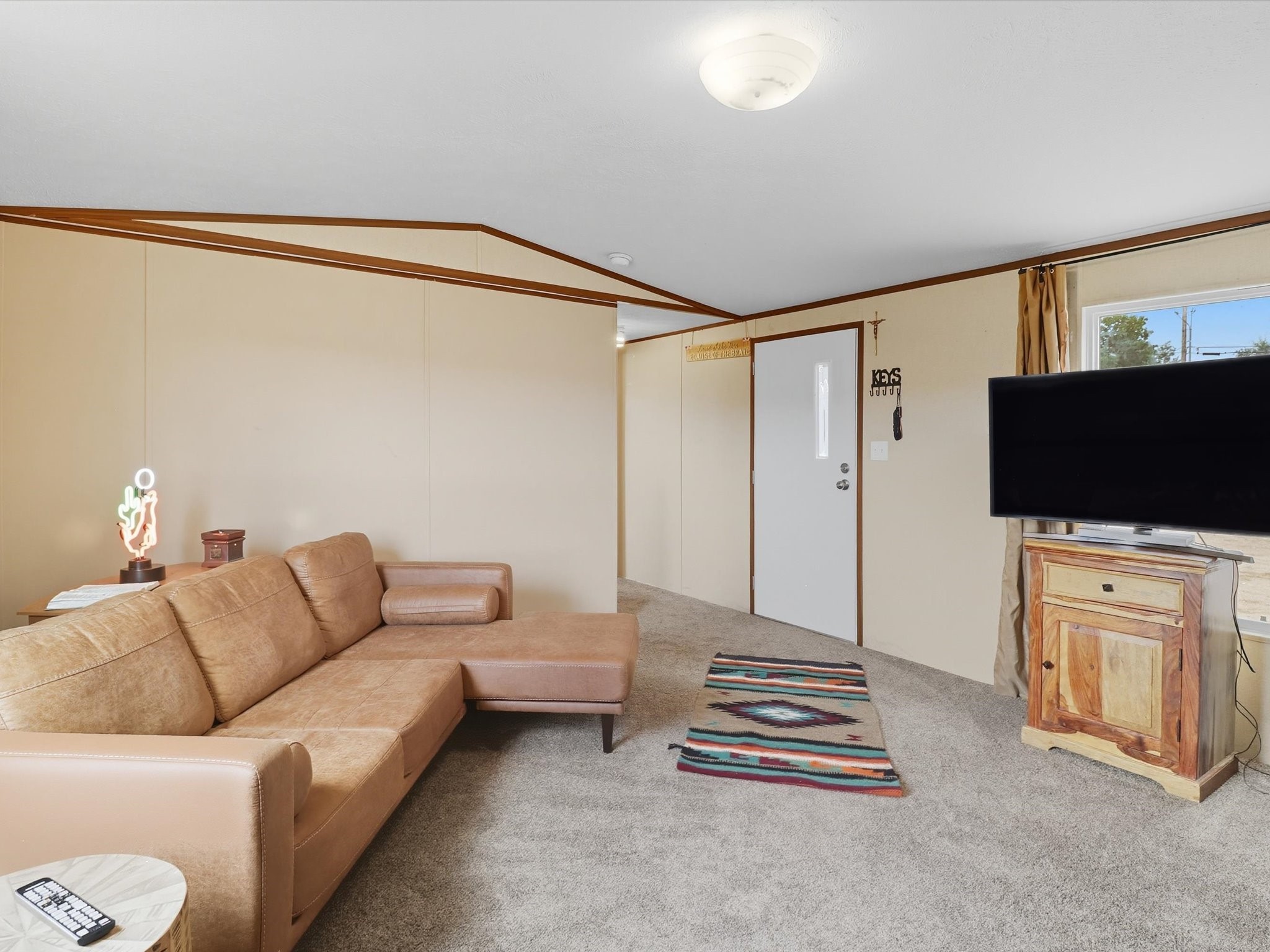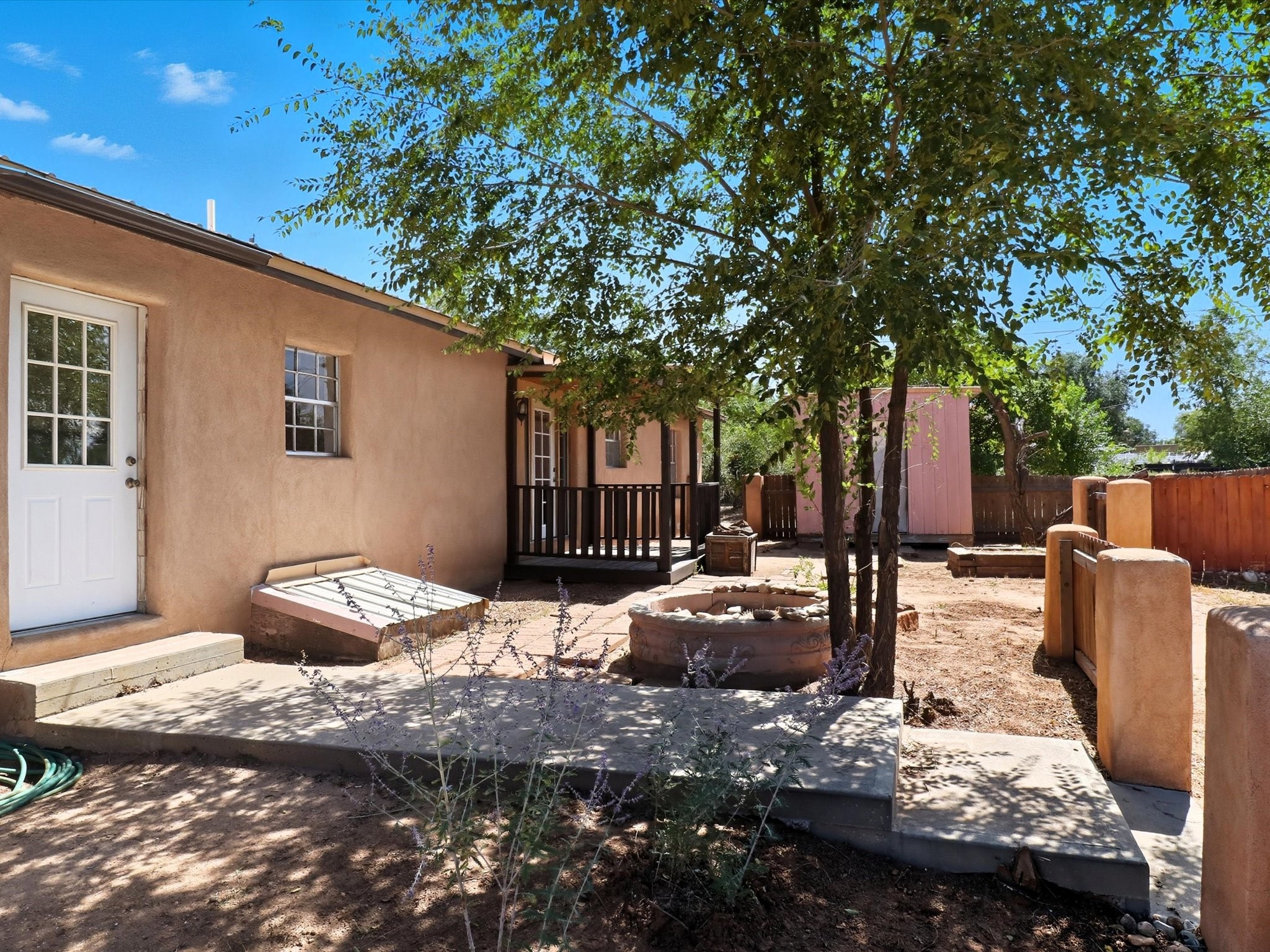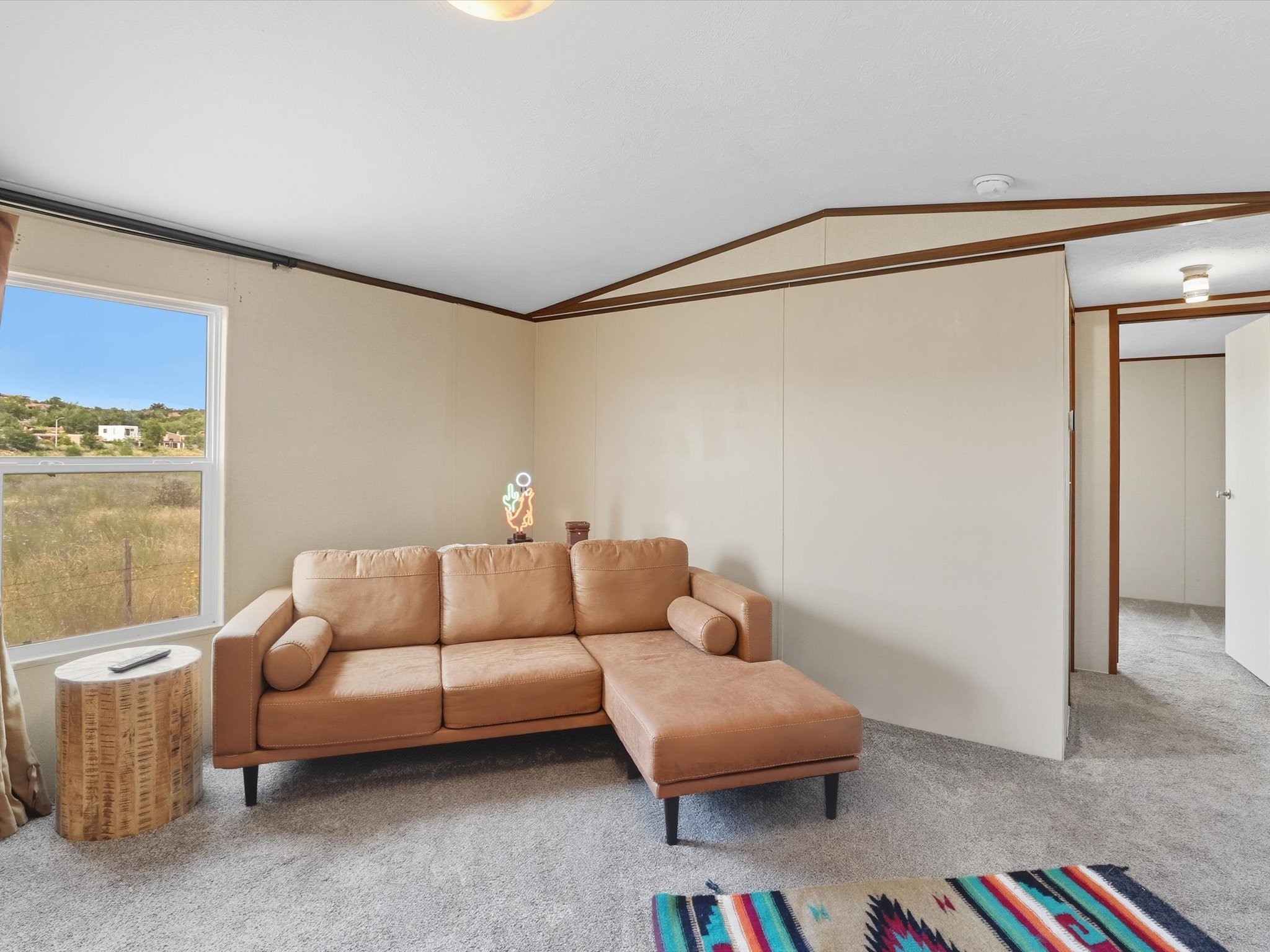 Exceptional opportunity on acre, backing to open land with the Santa Fe River just beyond. This unique property offers a main residence, a private studio apartment, and a manufactured home--ideal for guest quarters, multi-generational living, or income potential. The main house is adobe and has original hardwood floors throughout (under the carpet), a wood burning double-sided fireplace, four bedrooms and two bathrooms. The studio has a large living space, kitchen and full bathroom. The 2019 manufactured home includes two bedrooms, two bathrooms and refrigerated air. Enjoy privacy, space and mountain views, just 3 miles from the Santa Fe plaza and near trails, shopping, dining, parks, and schools.