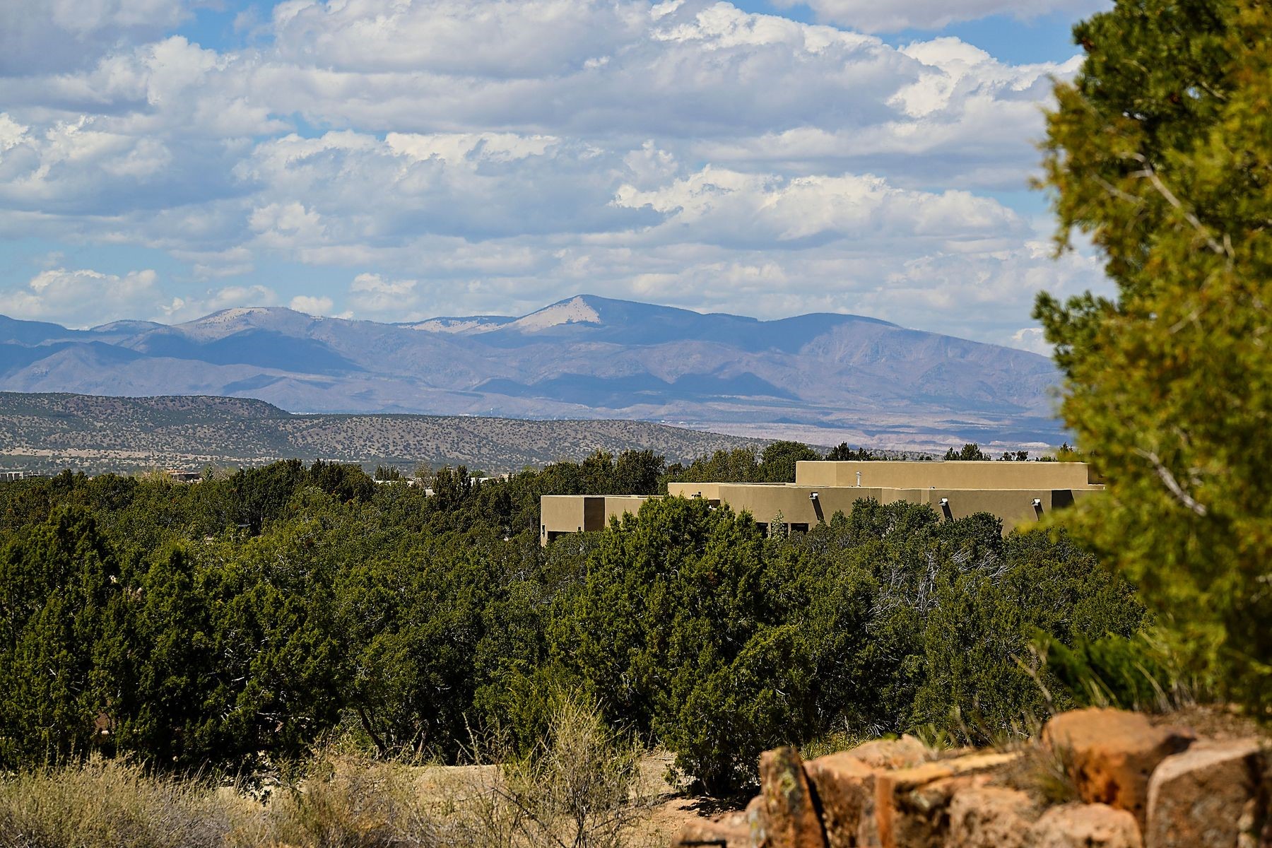 In the rugged reaches of exclusive Las Campanas this secluded estate--a sophisticated home and guesthouse--was custom-designed and -built amid blossoming trees, aspens, and stalwart evergreens. The residence is a bastion of color and volume featuring three luxuriously restful bedroom suites, formal living and dining rooms, a vast cook's kitchen with a wet bar and a family room, an inviting guesthouse with a full kitchen and bath, and painstakingly landscaped grounds. Vibrantly colored polished plaster walls combine with soaring ceilings, wide windows, multiple fireplaces, a collection of portales, a roof deck, and a swimming pool shaded by a pergola to create an ideal setting for grand entertaining, a haven crafted for the appreciation of the outdoors, and the perfect venue for the display of art. Surrounding the home are natural greenery, carefully chosen landscaping, sculpture gardens, water features, and a water-wise artificial turf lawn.