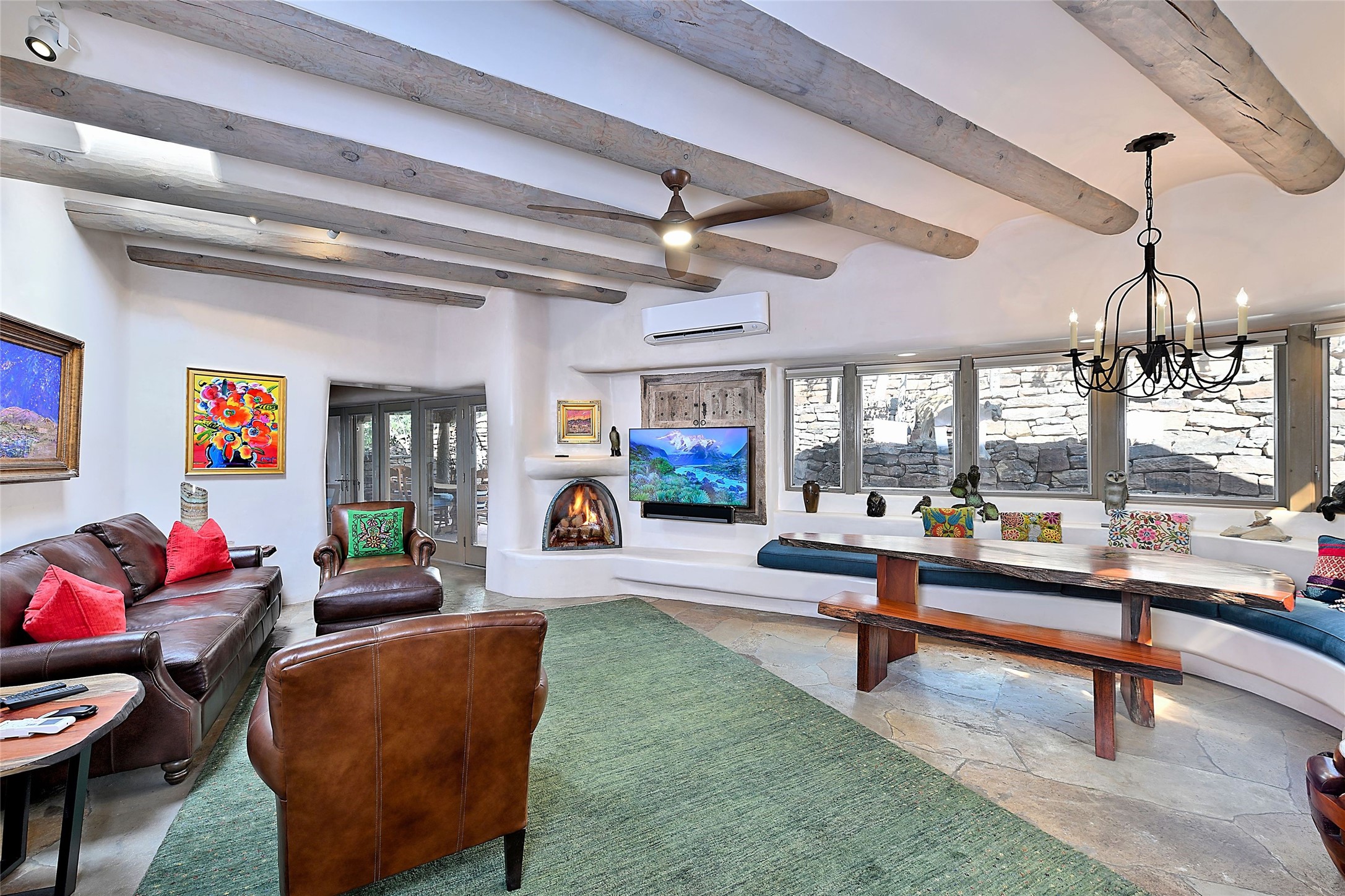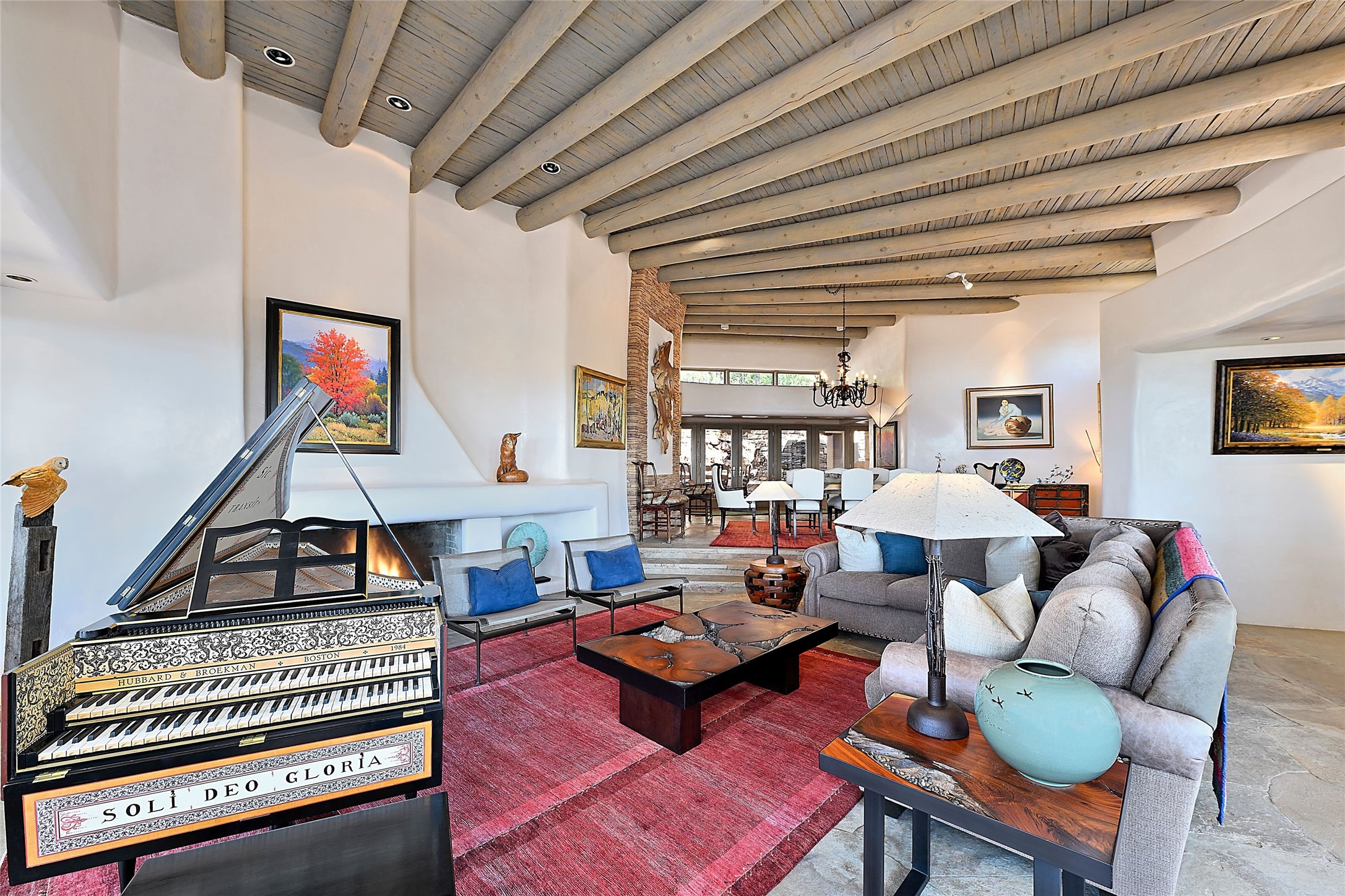 This striking 5-bedroom, 5.5-bath residence, set on 1.19 forested acres in High Summit, offers commanding views of the Jemez Mountains and Santa Fe city lights, creating a mesmerizing backdrop that transforms with the setting sun. Designed with the essence of Santa Fe style, this home includes soaring ceilings framed by rustic beams, a harmonious blend of hardwood and flagstone floors, and unique banco seating areas. Step into the grand living room, where an oversized fireplace makes a bold statement, effortlessly flowing into an elegant dining area that invites gatherings and celebrations. The outside portal calls to those who enjoy alfresco living, featuring an outdoor kiva and a hot tub that promise evenings of relaxation and stargazing. The kitchen, complete with a Wolf range and a Subzero refrigerator, seamlessly connect to a den/media room with its own kiva fireplace. The primary suite features a fireplace, sitting area that opens to the outdoor portal and a gorgeous spa-like bathroom, showcasing a soaking tub, a fireplace for those chilly evenings, and an expansive walk-in shower with double shower heads. In addition, there is a detached 2-bedroom, 2-bath guesthouse. Recent enhancements, including new pine trees and a new driveway, alongside a newer roof with a 10-year warranty. Located just minutes away from the renowned Ten Thousand Waves Spa, the Santa Fe Ski Basin, Dale Ball Trails, and the downtown Plaza