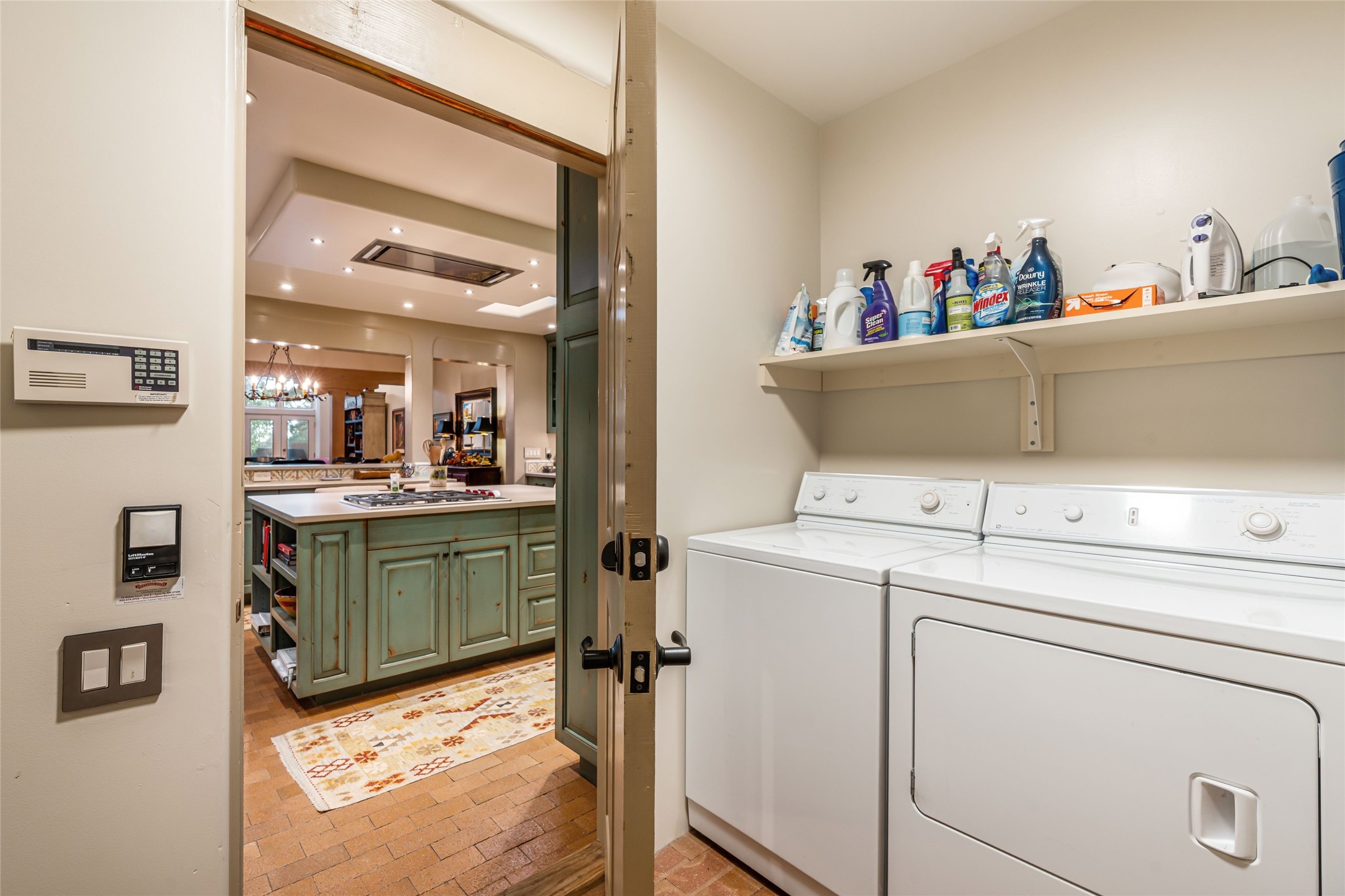 Desirable Los Miradores 3-bedroom, 3-bath residence close to Museum Hill and Canyon Road. Living room with soaring beamed ceilings and stately fireplace framed by high windows that highlight the towering trees outside. Updated kitchen, equipped with high-end appliances including a double oven, Sub-Zero refrigerator, wine fridge, and elegant quartz countertops, along with a center island perfect for casual dining and entertaining. This home features two spacious bedrooms and bathrooms on the first floor, providing convenience and comfort. Upstairs, you'll find a den/office area and a generous bedroom complete with a kiva fireplace and a large bath, both with access to outdoor decks that enhance the living space. All baths have been recently remodeled. The delightful, landscaped backyard combines a flagstone patio, outdoor fireplace, and serene nature paths bedecked with aspen trees and a tranquil fountain. 2-car attached garage. The gated community of Los Miradores offers many amenities, including a seasonal pool, workout facility and tennis court. Additionally, a 2-bedroom casita owned by Los Miradores offers rental opportunities for guests.