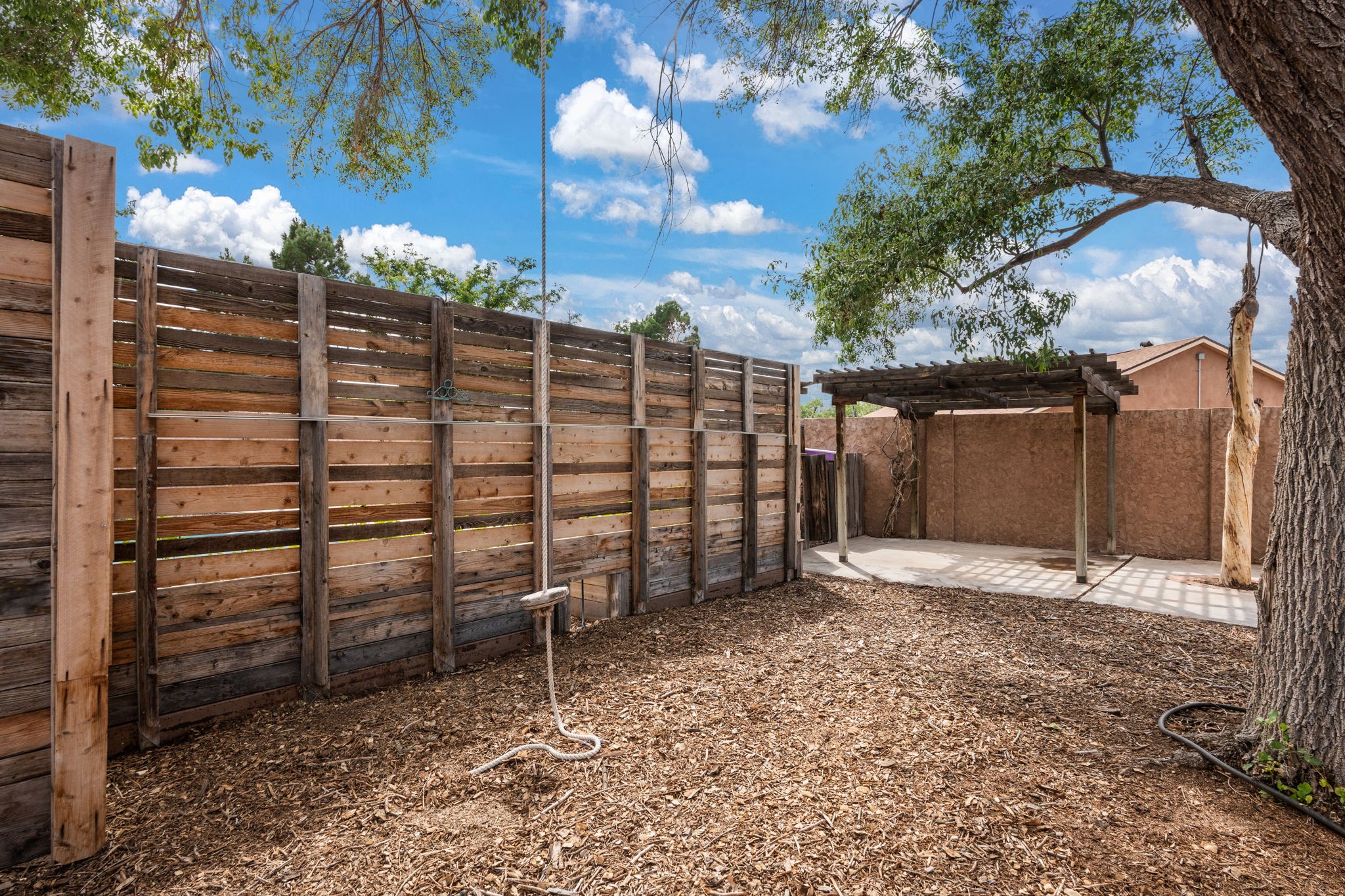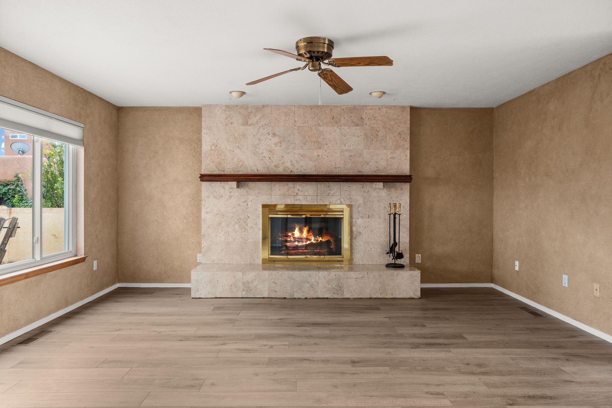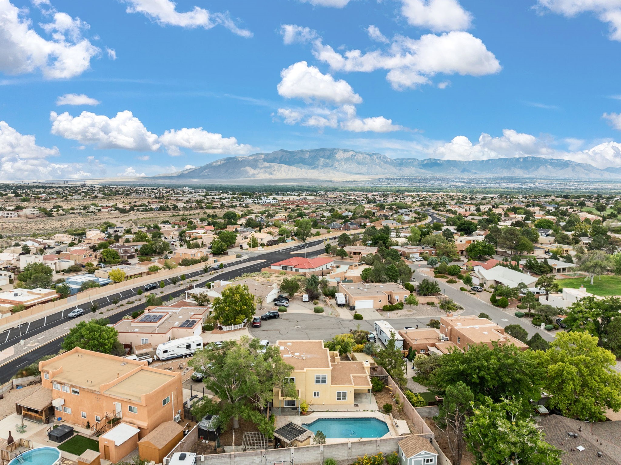 Well loved two story home with an in ground pool 40*18 in Length and 4ft-8ft depth. Updated, new floors, spacious living areas quality living, defined yet open rooms that access the outside pool/ patio area. Large study with built in's, half bath, all on main floor. Upstairs newly carpeted with two large bedrooms, hall bath, primary bedroom with Sandia Mountains views welcoming you every morning. Access to east deck. Fabulous! Situated on a private cul de sac. Green house to enjoy all year long, and dual CFA unit for the second level with Refrigerated air. A wonderful place to call home.