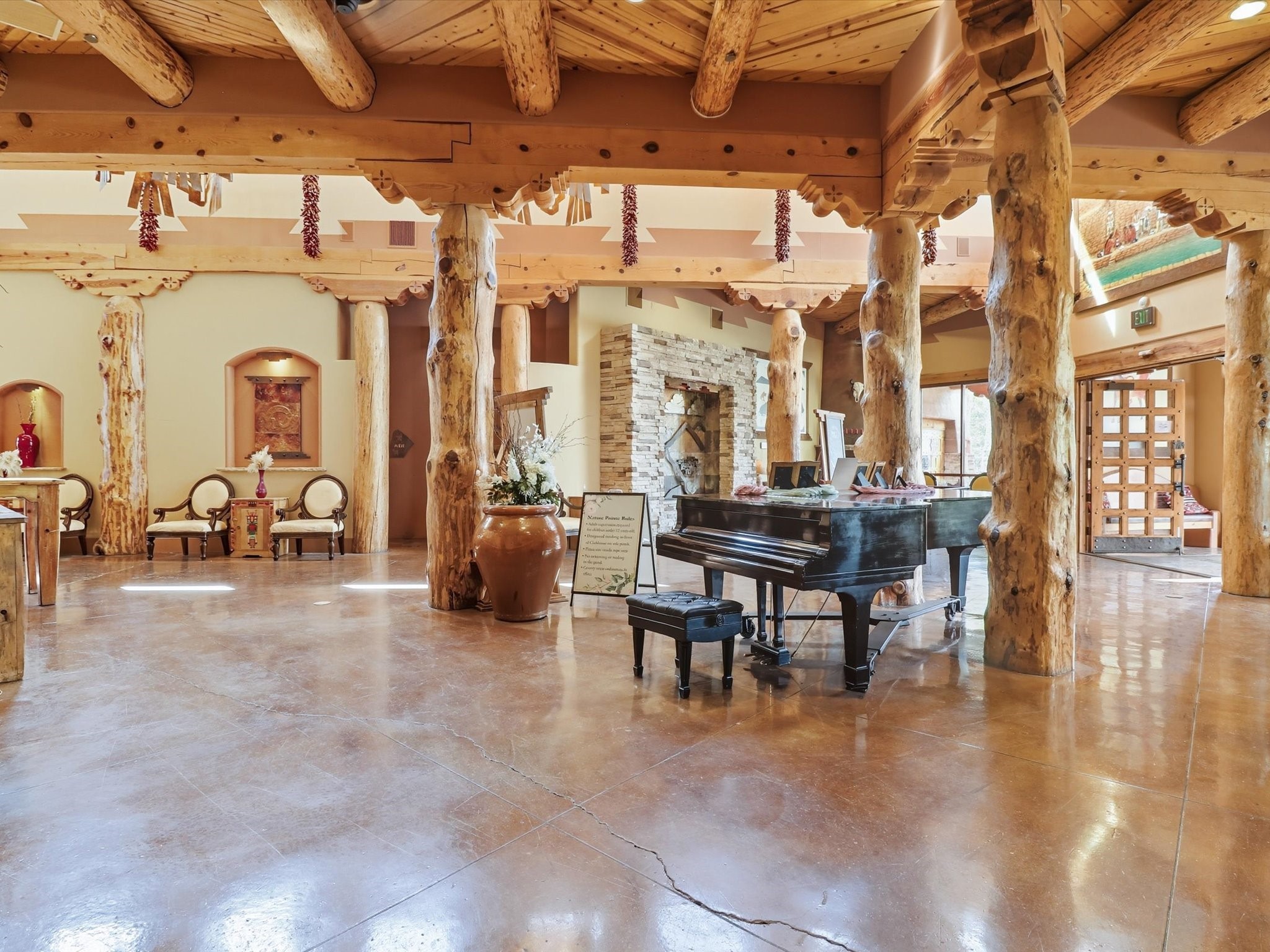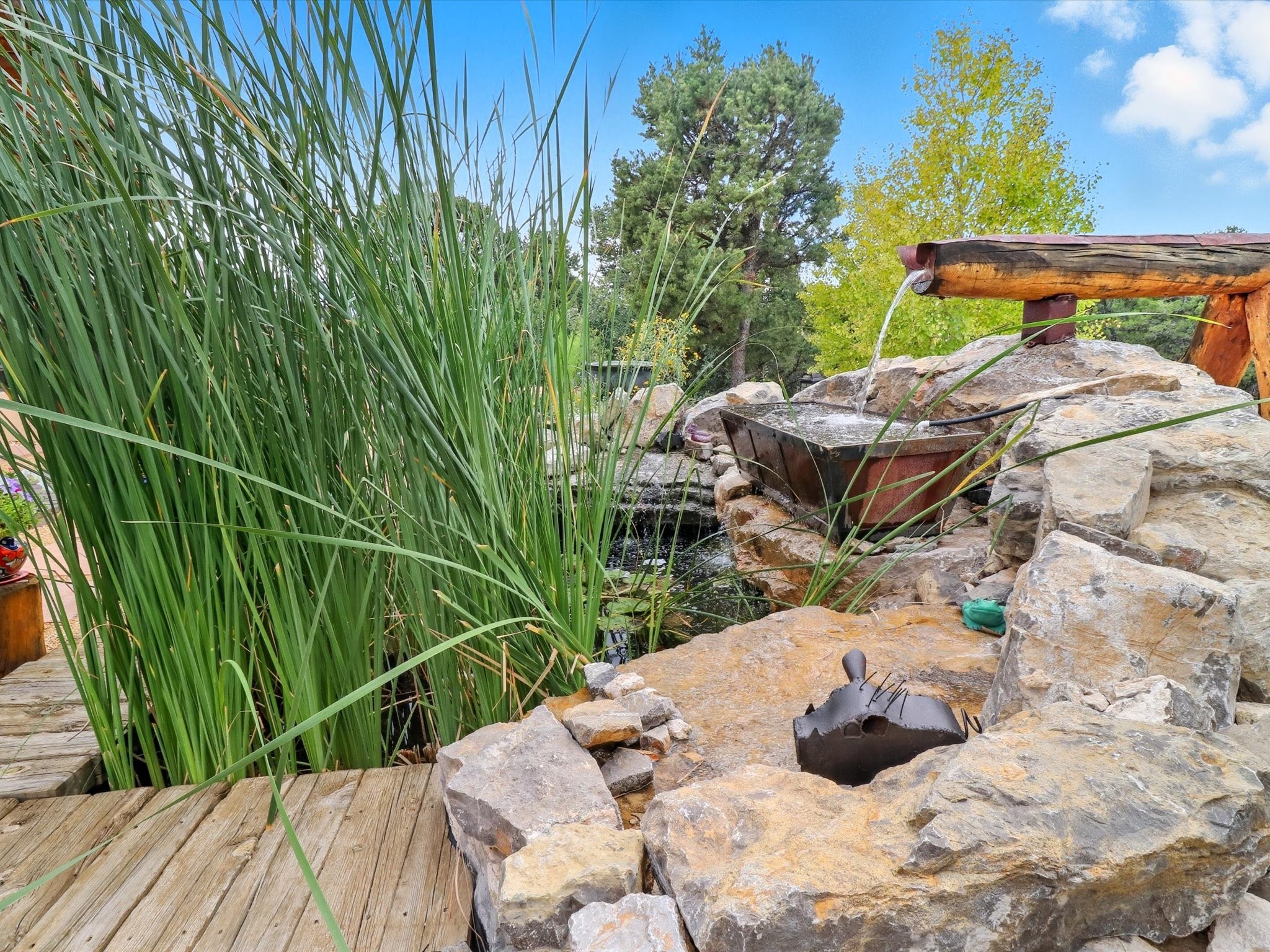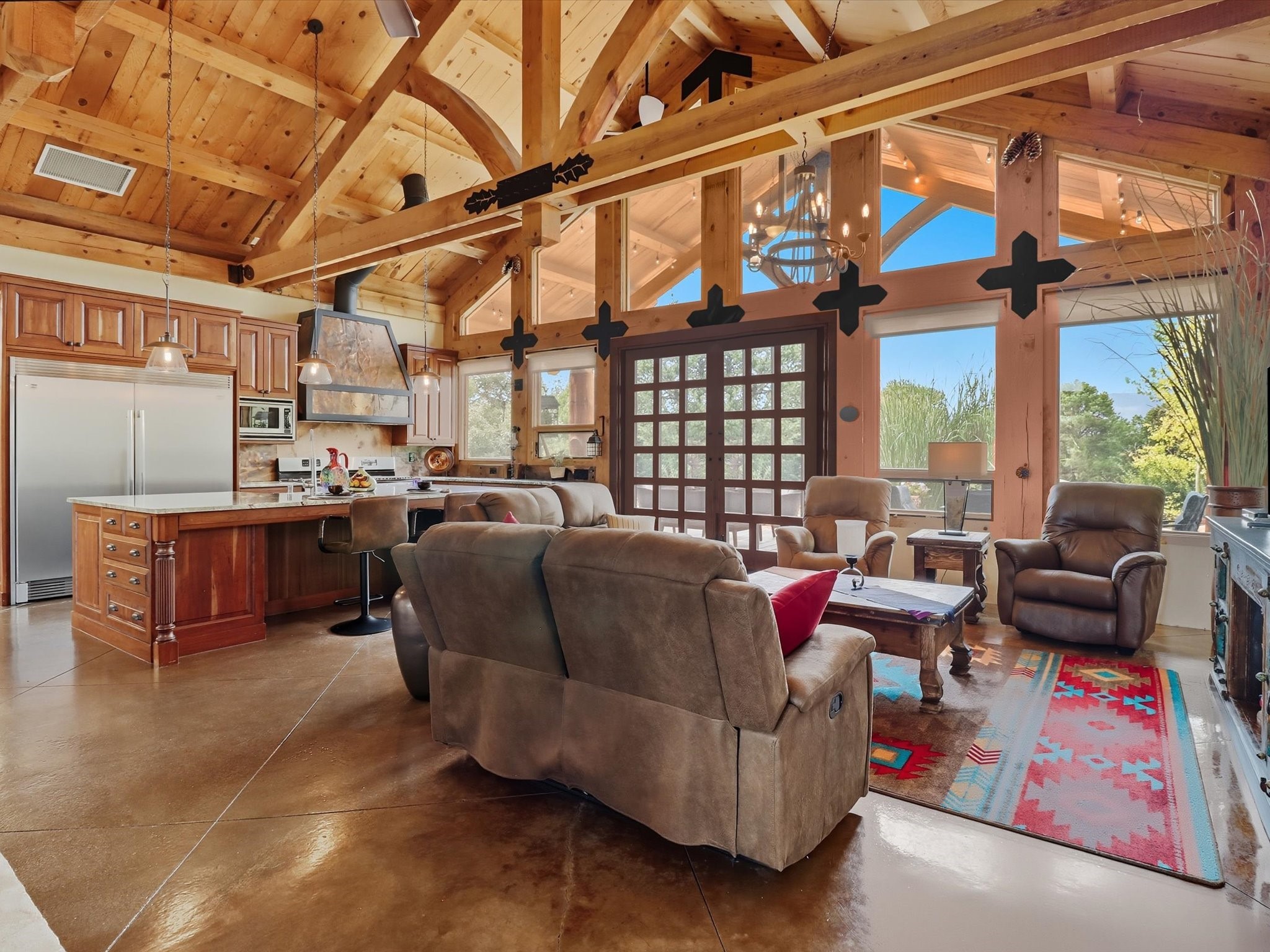 Country Lodge-Style Home in Gated CommunityCasually elegant lodge-style home in a country setting, designed to highlight 4 seasons with walls of windows, 20-foot wood ceilings, and massive trusses in the great room. Two living areas are divided by a two-way stacked stone fireplace, with a striking water feature inside the front entry.Interior features include concrete radiant-heated floors, wood vigas, and a chef's kitchen with 2 ranges, dishwasher, wine cooler, built-in refrigerator, rainforest quartz island, copper hood and backsplash, and a large pantry. A built-in china hutch adds to the custom design.The main suite includes a Jacuzzi tub, fireplace, and a large walk-in closet. Additional amenities feature a 1,369 sq. ft. 3+ car garage/workshop with shelving, porches at the front and back, and an outdoor hot tub. Backyard has a large koi pond with a water feature.Located in a gated, paved community with clubhouse amenities including walking trails, indoor pool, outdoor hot tub, sauna, gym, basketball, racquetball and tennis courts. Approximately 20 minutes east of Albuquerque.
