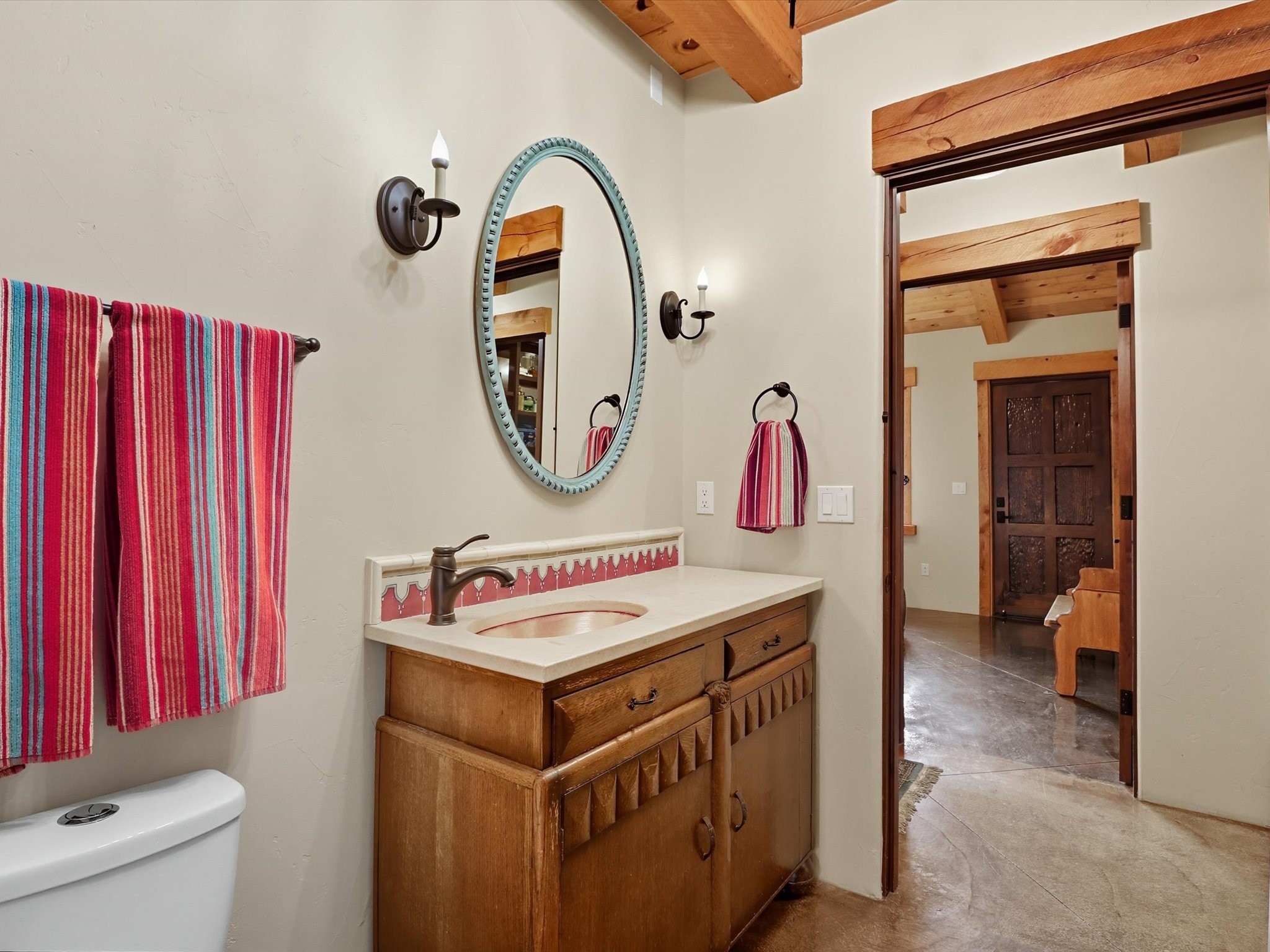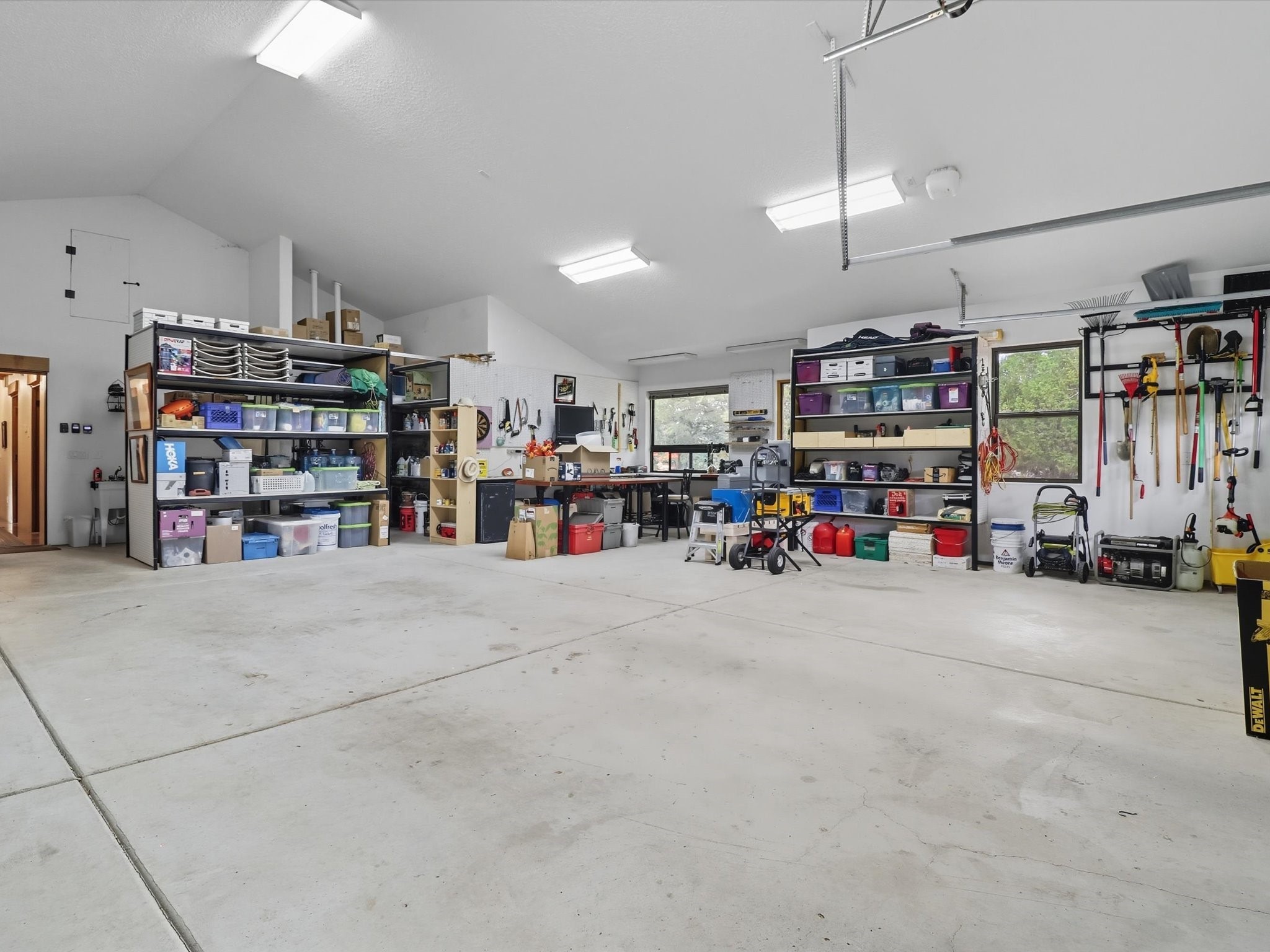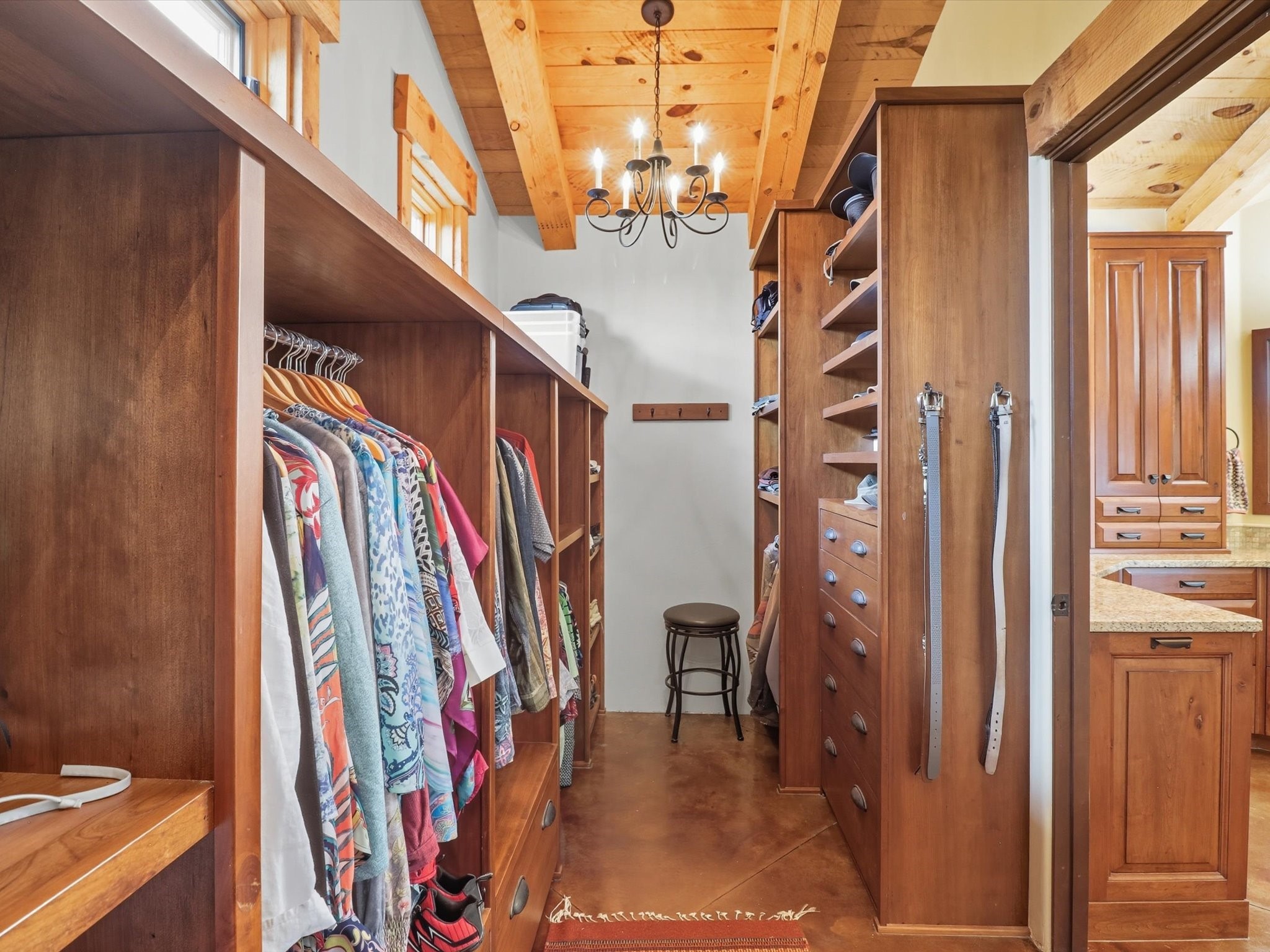 Country Lodge-Style Home in Gated CommunityCasually elegant lodge-style home in a country setting, designed to highlight 4 seasons with walls of windows, 20-foot wood ceilings, and massive trusses in the great room. Two living areas are divided by a two-way stacked stone fireplace, with a striking water feature inside the front entry.Interior features include concrete radiant-heated floors, wood vigas, and a chef's kitchen with 2 ranges, dishwasher, wine cooler, built-in refrigerator, rainforest quartz island, copper hood and backsplash, and a large pantry. A built-in china hutch adds to the custom design.The main suite includes a Jacuzzi tub, fireplace, and a large walk-in closet. Additional amenities feature a 1,369 sq. ft. 3+ car garage/workshop with shelving, porches at the front and back, and an outdoor hot tub. Backyard has a large koi pond with a water feature.Located in a gated, paved community with clubhouse amenities including walking trails, indoor pool, outdoor hot tub, sauna, gym, basketball, racquetball and tennis courts. Approximately 20 minutes east of Albuquerque.