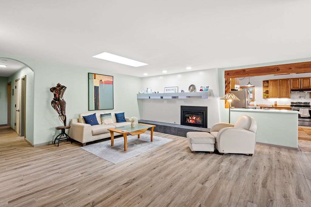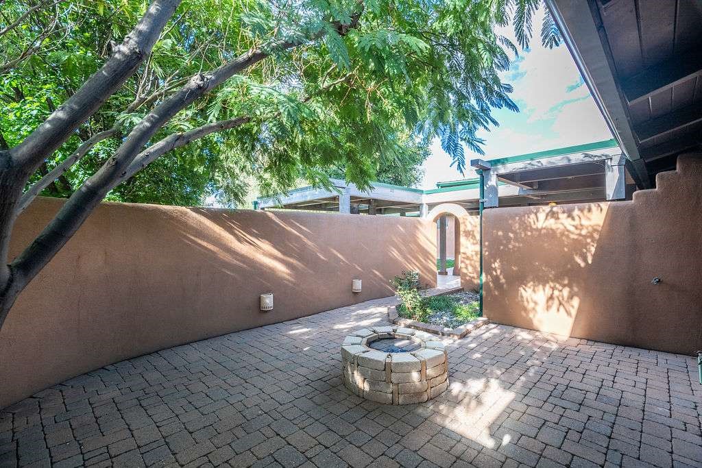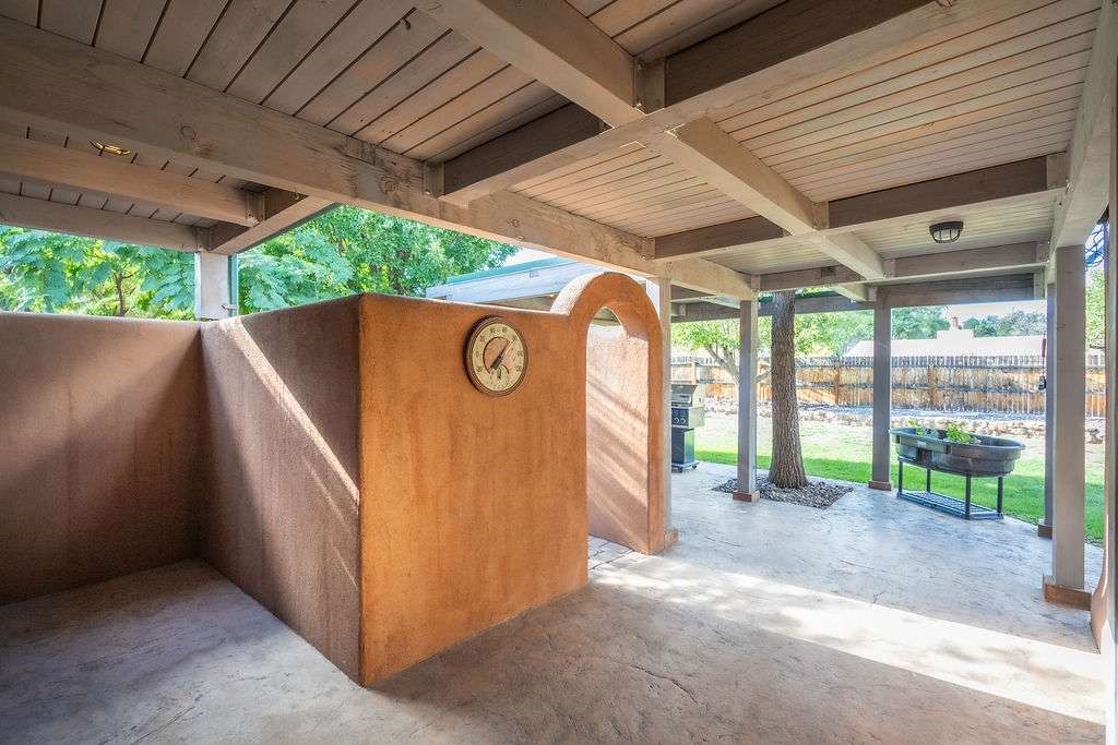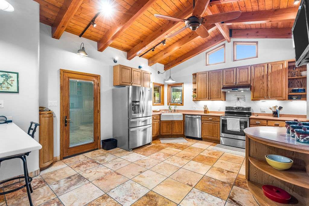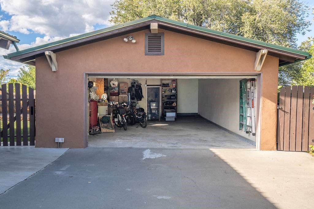 Gorgeous single-level home with an open floor plan and numerous updated architectural finishes. Property includes spacious bedrooms and office, expansive kitchen, and large great room with built-in bar. The primary bedroom has an en suite bath and walk-in closet. Additionally, property has an oversized detached garage and a separate storage shed for your treasures. Mature landscaping with cherry and apple trees is included! Amenities include stainless steel appliances, two fireplaces, convenient location, radiant floor heat, central air conditioning, private fenced back yard, two living room areas, large laundry room with more storage, private walled-off patio adjacent to primary suite with fire pit. Landscaped yard with irrigation system and rainwater collection features. Front driveway gate closes off access to garage and back patios. Best of all, no HOA dues.