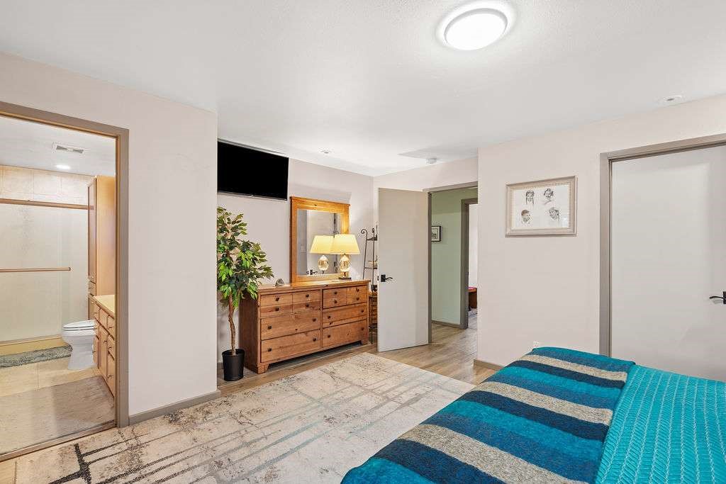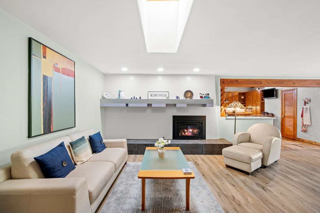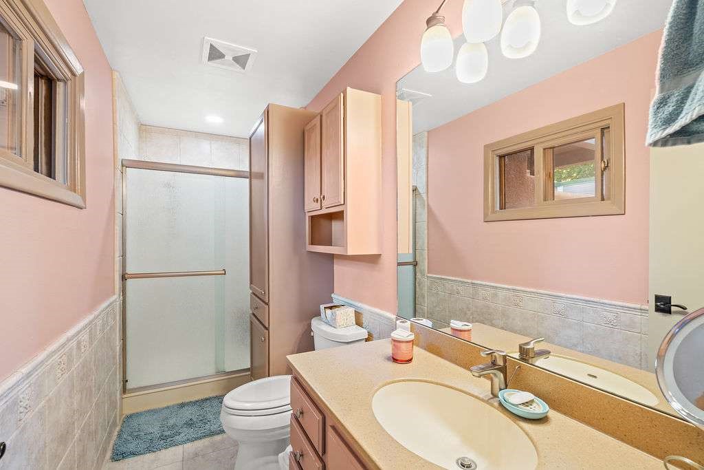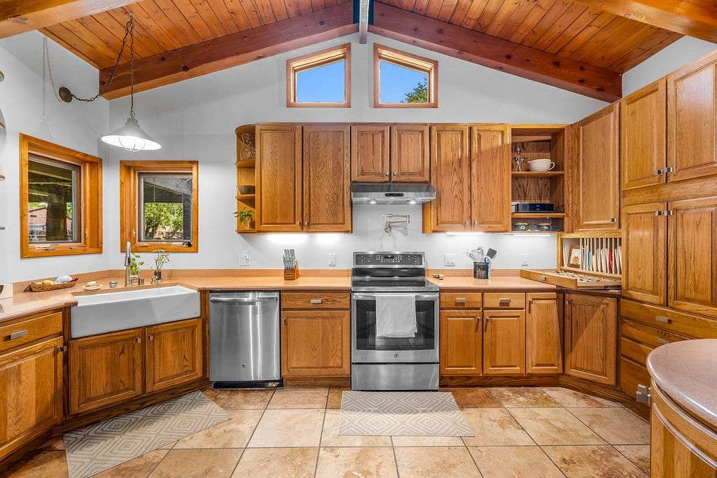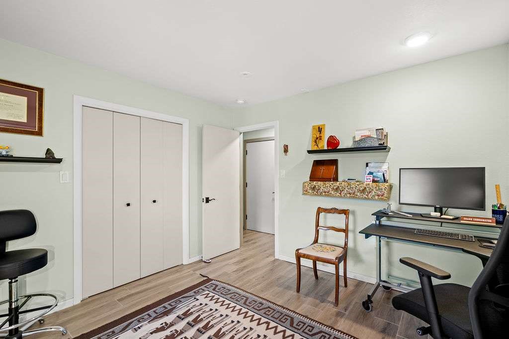 Gorgeous single-level home with an open floor plan and numerous updated architectural finishes. Property includes spacious bedrooms and office, expansive kitchen, and large great room with built-in bar. The primary bedroom has an en suite bath and walk-in closet. Additionally, property has an oversized detached garage and a separate storage shed for your treasures. Mature landscaping with cherry and apple trees is included! Amenities include stainless steel appliances, two fireplaces, convenient location, radiant floor heat, central air conditioning, private fenced back yard, two living room areas, large laundry room with more storage, private walled-off patio adjacent to primary suite with fire pit. Landscaped yard with irrigation system and rainwater collection features. Front driveway gate closes off access to garage and back patios. Best of all, no HOA dues.