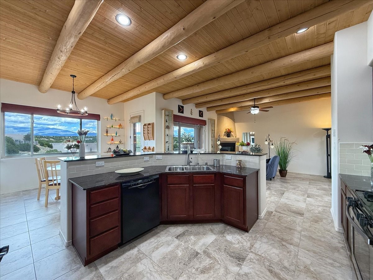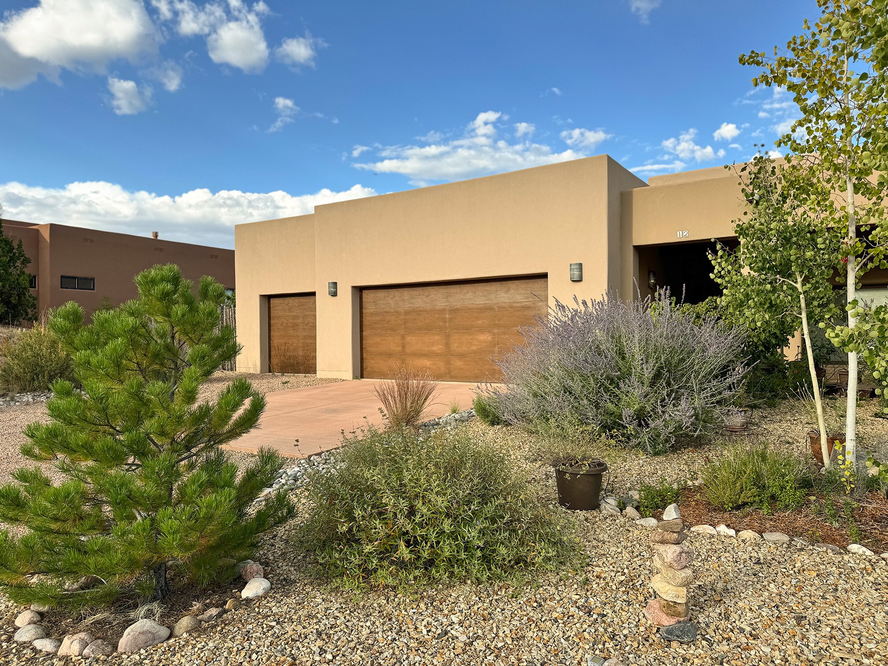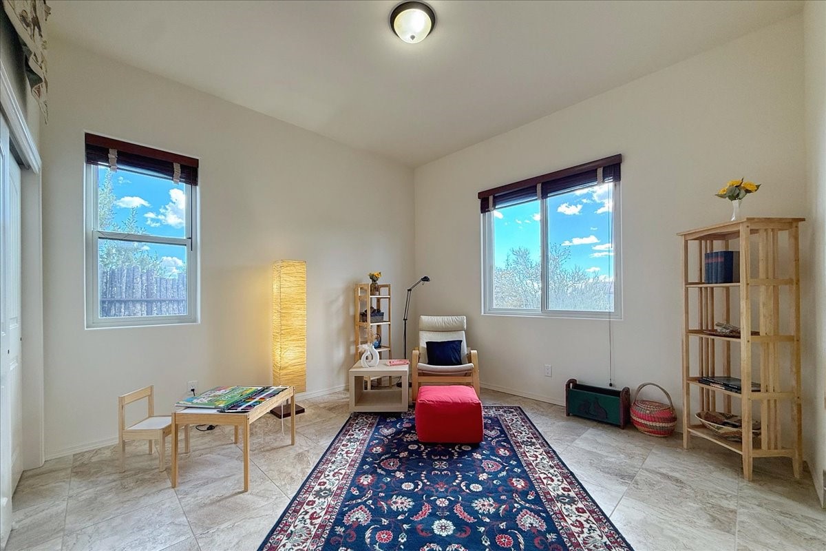 Beautiful 3 bed/2.5-bath home built in 2015. Mostly single-level with 3 stair drop to bedrooms. Perfectly situated on a 0.34-acre lot surrounded by natural pinon and juniper open space, 8 minutes from downtown Santa Fe. Offering 1,850 sq ft of thoughtfully designed living space and a finished 3-car EV-ready garage with workbench area, shelves, and overhead storage, this single-owner home blends Santa Fe charm with modern efficiency. Tall ceilings and large-format tile floors enhance the open feel, while wood ceilings with vigas and latillas add warmth. The kitchen features granite countertops, under-cabinet lighting, gas range, ENERGY STAR® appliances, and hood-mounted microwave. Expansive picture windows frame Sangre de Cristo views, filling the home with natural light. Step from the dining area to a covered patio and a private screened spa retreat with multi-person 220V hot tub off the primary suite. The spacious primary suite offers room for a home office or yoga area, plus a walk-in closet with custom Modular Closets® and built-in staircase to high-bay storage. The primary bath boasts an oversized walk-in shower with no glass door and a private toilet area. Energy efficiency abounds with 31 owned solar panels to power spa, home and 300 miles daily for up to 3 EVs, foam-core insulation, radiant floor heat, solar tubes, recirculating hot water, whole-house fan, and motorized exterior sunshades. Additional features include a water softening and revese osmosis systems, radon mitigation, low-VOC finishes, and a partially concrete driveway for easy snow removal. The driveway can accommodate 5 cars in addition to garage. Outdoors, enjoy professional landscaping, drip irrigation, a secluded flagstone patio for dining or stargazing, a fully fenced garden area with shed, and rainwater barrels. Scenic walking trails with mountain views. Convenient access to Hwy 599 makes commuting to Los Alamos or the Santa Fe Airport a breeze. Views and comfort in one perfect package.