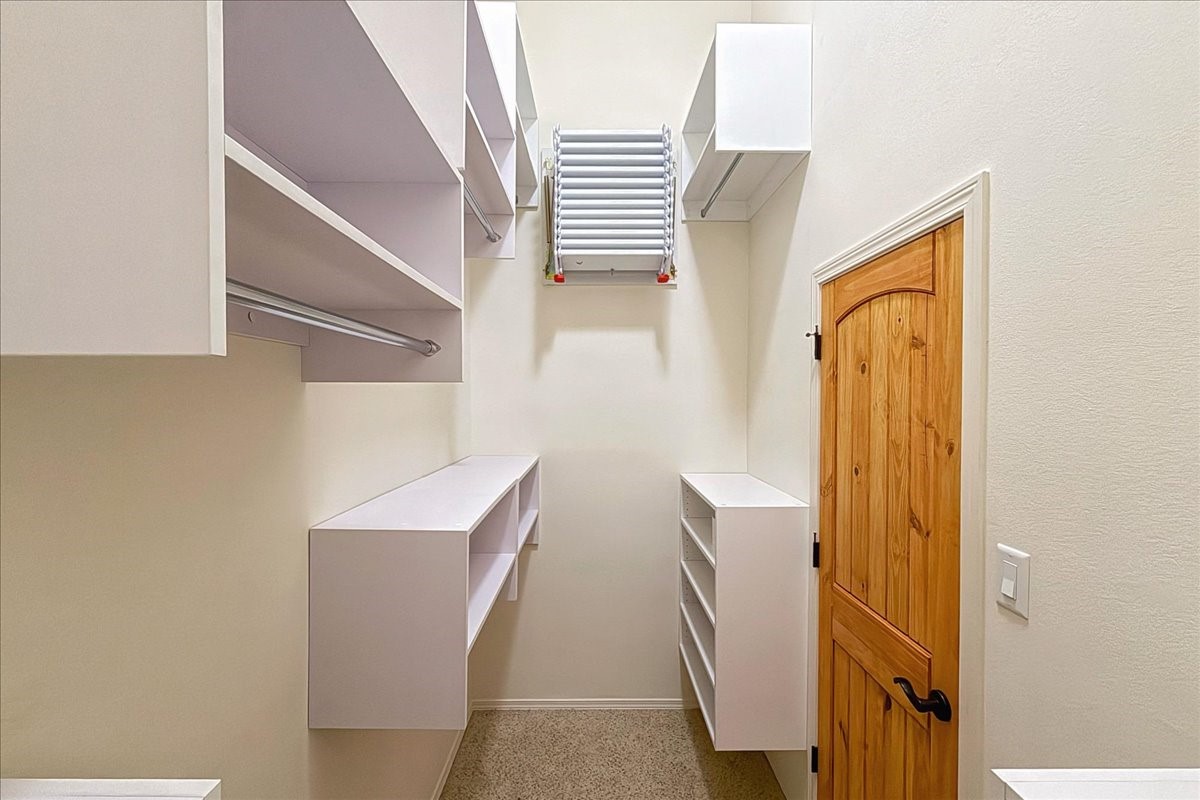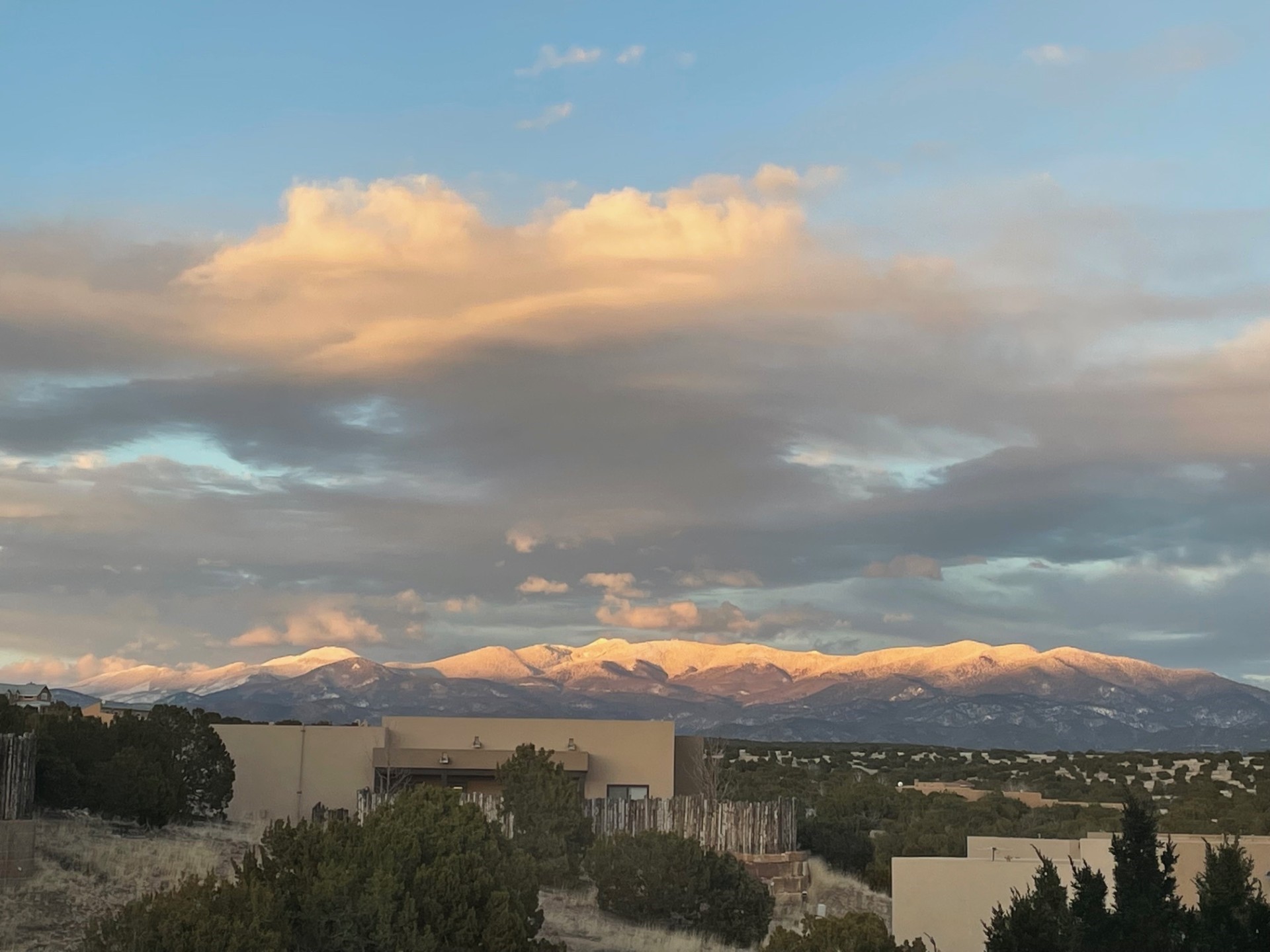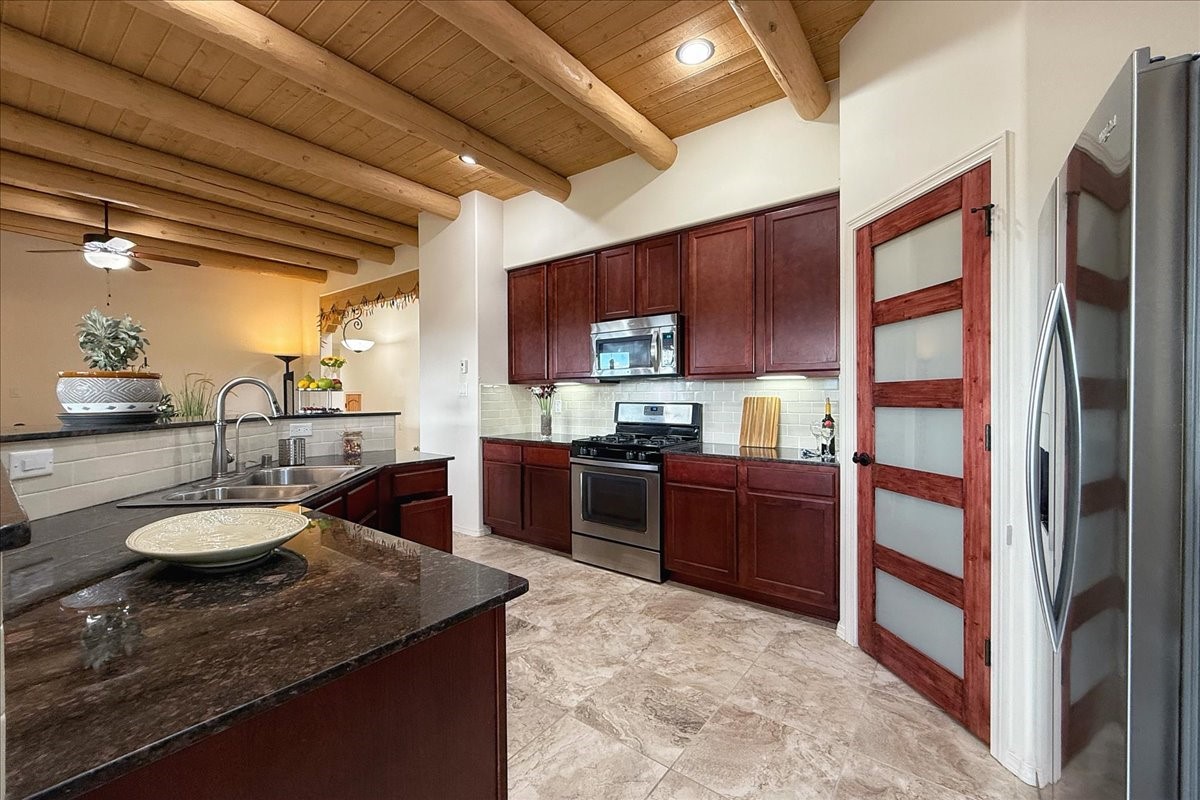 Beautiful 3 bed/2.5-bath home built in 2015. Mostly single-level with 3 stair drop to bedrooms. Perfectly situated on a 0.34-acre lot surrounded by natural pinon and juniper open space, 8 minutes from downtown Santa Fe. Offering 1,850 sq ft of thoughtfully designed living space and a finished 3-car EV-ready garage with workbench area, shelves, and overhead storage, this single-owner home blends Santa Fe charm with modern efficiency. Tall ceilings and large-format tile floors enhance the open feel, while wood ceilings with vigas and latillas add warmth. The kitchen features granite countertops, under-cabinet lighting, gas range, ENERGY STAR® appliances, and hood-mounted microwave. Expansive picture windows frame Sangre de Cristo views, filling the home with natural light. Step from the dining area to a covered patio and a private screened spa retreat with multi-person 220V hot tub off the primary suite. The spacious primary suite offers room for a home office or yoga area, plus a walk-in closet with custom Modular Closets® and built-in staircase to high-bay storage. The primary bath boasts an oversized walk-in shower with no glass door and a private toilet area. Energy efficiency abounds with 31 owned solar panels to power spa, home and 300 miles daily for up to 3 EVs, foam-core insulation, radiant floor heat, solar tubes, recirculating hot water, whole-house fan, and motorized exterior sunshades. Additional features include a water softening and revese osmosis systems, radon mitigation, low-VOC finishes, and a partially concrete driveway for easy snow removal. The driveway can accommodate 5 cars in addition to garage. Outdoors, enjoy professional landscaping, drip irrigation, a secluded flagstone patio for dining or stargazing, a fully fenced garden area with shed, and rainwater barrels. Scenic walking trails with mountain views. Convenient access to Hwy 599 makes commuting to Los Alamos or the Santa Fe Airport a breeze. Views and comfort in one perfect package.