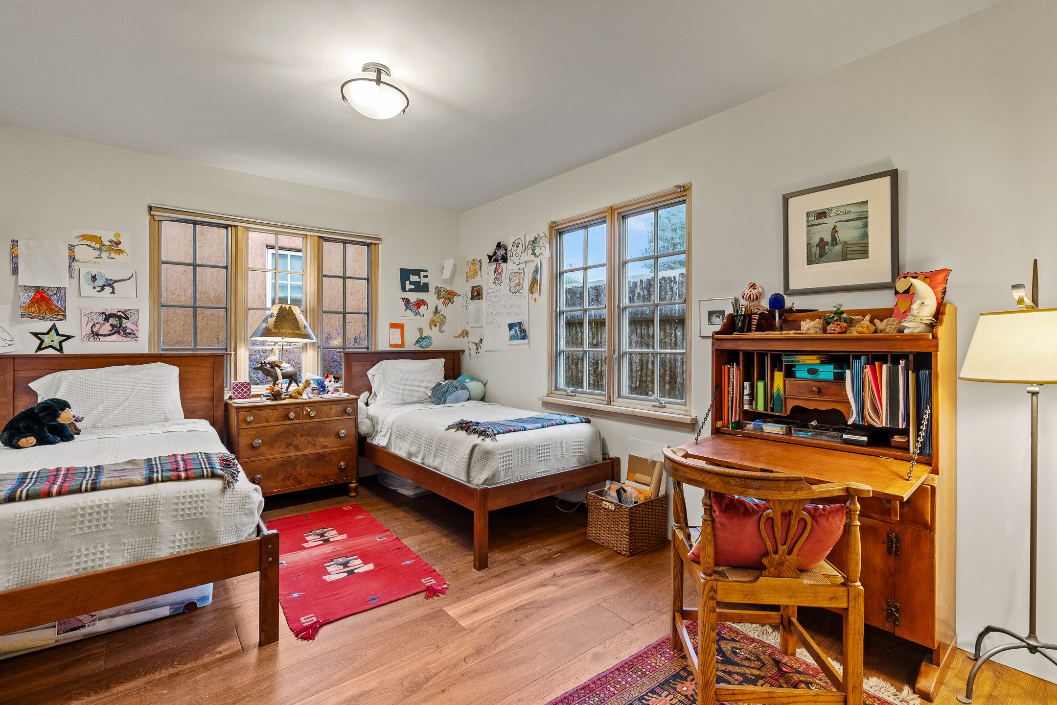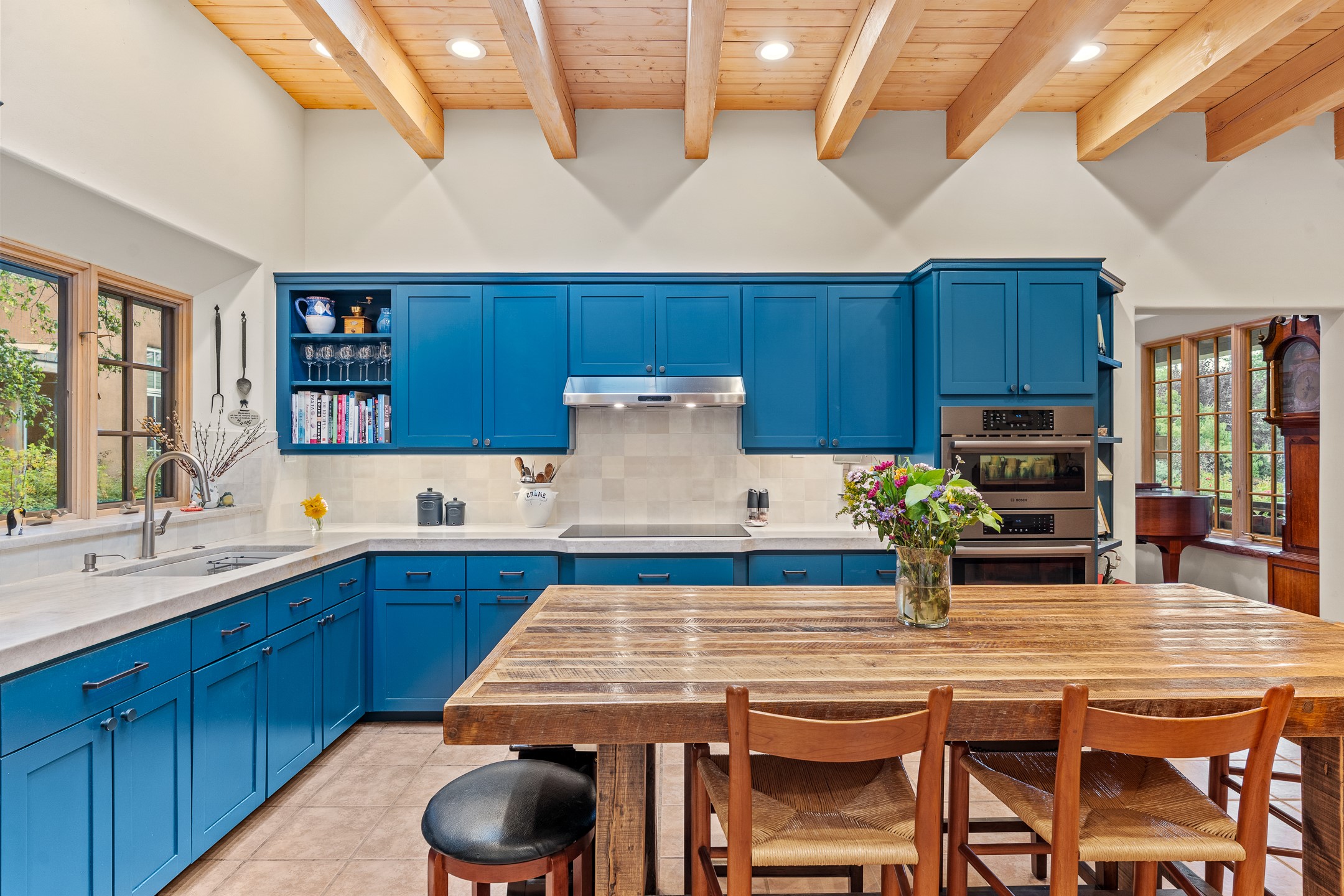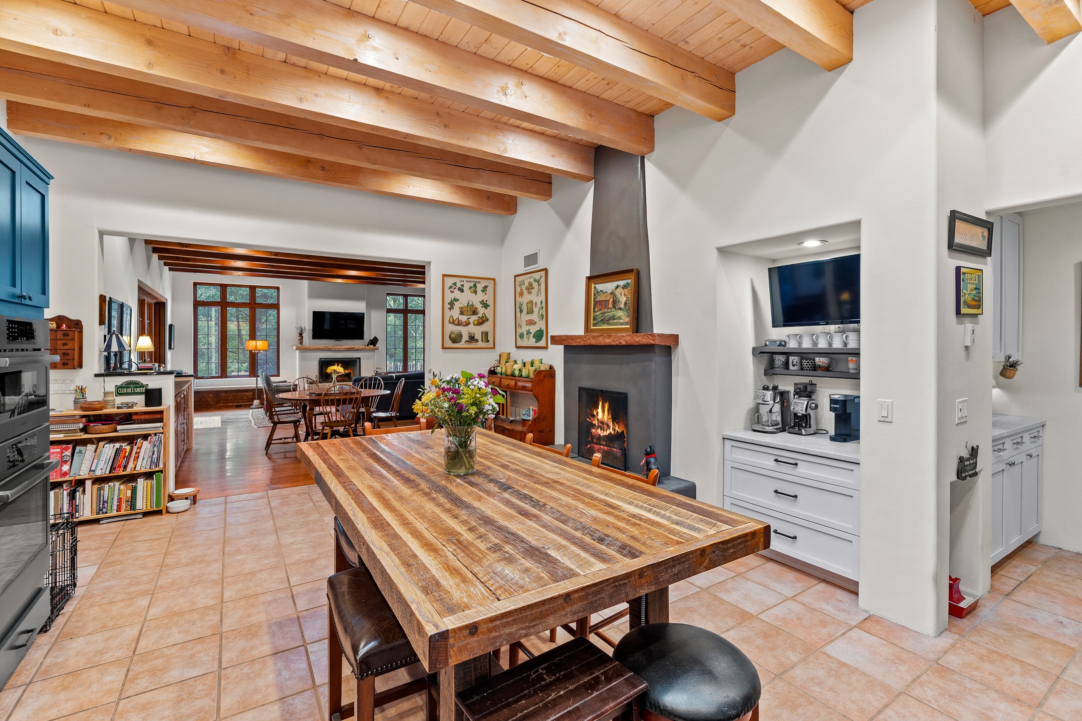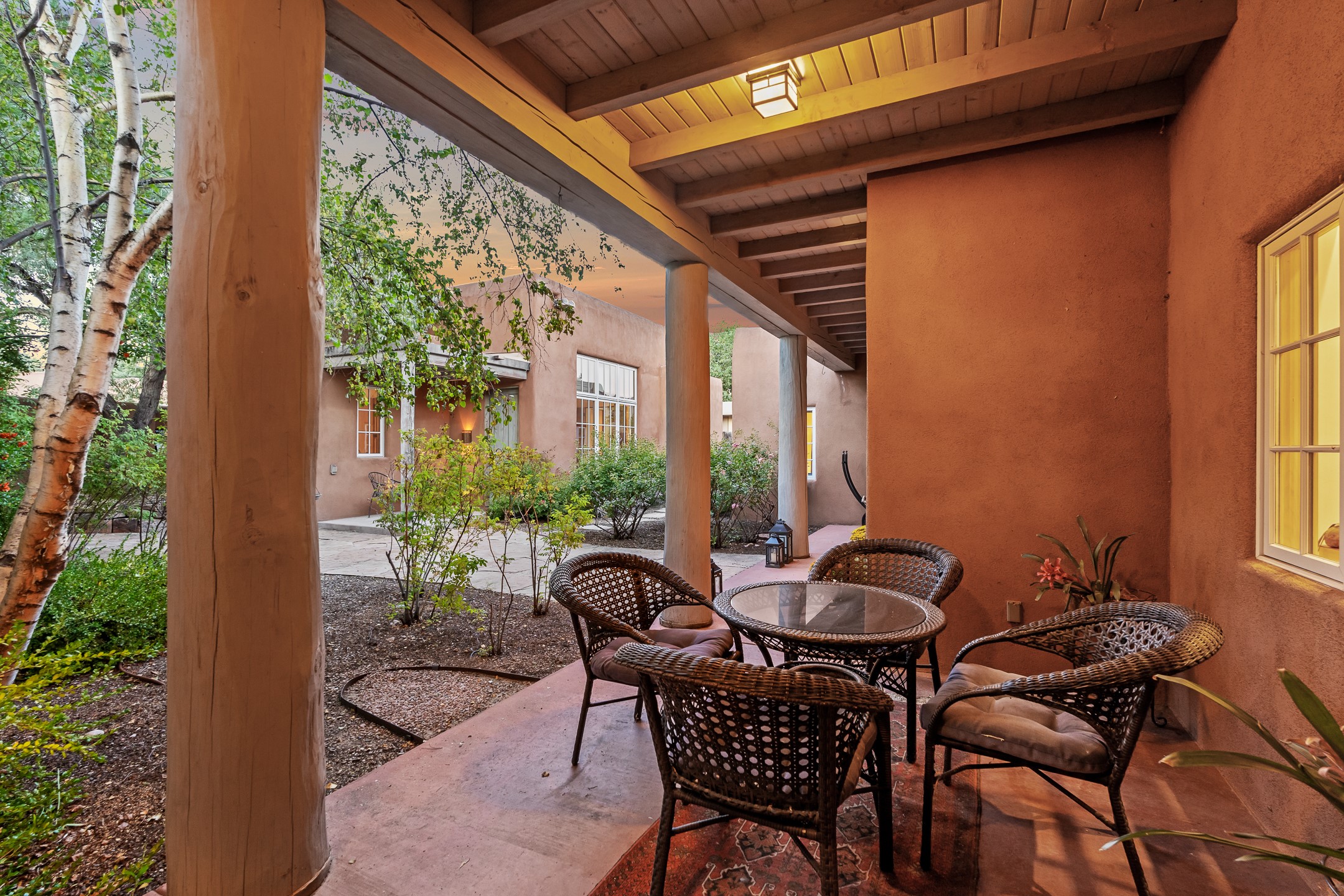 Nestled on just under half an acre in Santa Fe's highly sought-after historic Eastside, this incredible single-level residence offers serene privacy, lush landscaping, and the soothing sounds of the nearby Santa Fe River. Thoughtfully designed for effortless indoor-outdoor living, the home features extensive patios and terraces with beautiful eastern views--perfect for morning coffee or evening entertaining beneath the stars.The main house boasts four bedrooms, including two with en suite baths, providing flexible spaces for family and guests. A separate guesthouse, conceived by acclaimed architect Trey Jordan, serves as a true artist's sanctuary with soaring ceilings, abundant natural light, and a creative, inspiring atmosphere.Step outside to enjoy immediate access to walking trails that connect to the Santa Fe River Walk and the famed Dale Ball Trails. From this idyllic setting, you can stroll to The Teahouse for a quiet morning coffee or wander down Canyon Road to enjoy world-class dining and galleries. This rare Eastside property offers the best of Santa Fe's historic charm, natural beauty, and vibrant cultural life--just steps from your door.