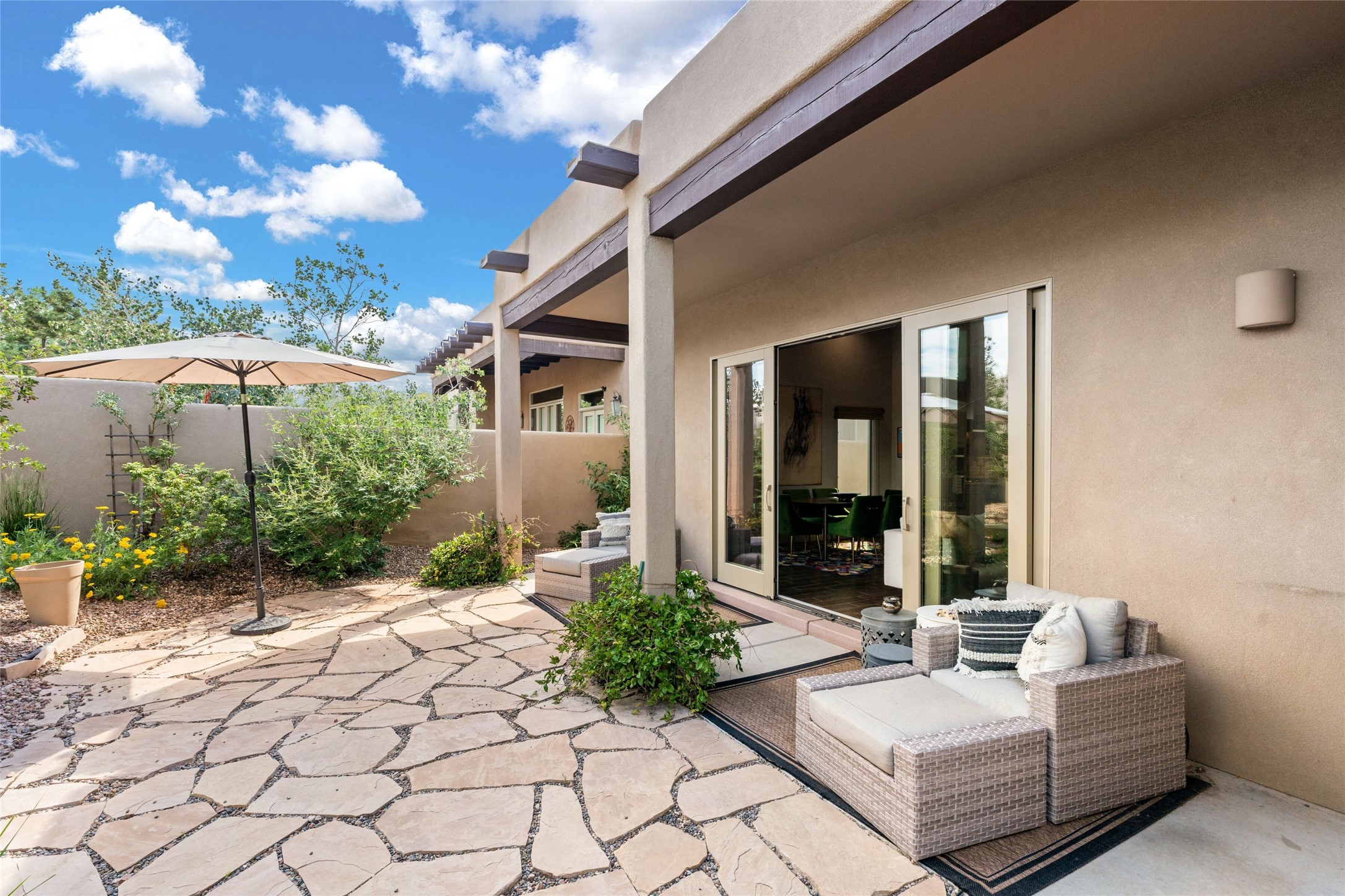 With a flawless new sewer line inspection report available, this home is move-in ready! Showcasing a functional design in one of the most desirable locations in Santa Fe, this stunning home is a rare opportunity to own a home UNDER 1 million dollars in Las Campanas. The home maintains a warm, welcoming feel, filled with natural light and surrounded by native landscaping, and walled backyard for privacy and pet safety. Just minutes from downtown Santa Fe, a quick trip to the airport and easy highway access, this property offers the best of Southwestern living - spacious, secluded, and perfectly situated. This home has been beautifully updated with new kitchen cabinets, a luxurious primary walk-in closet, a full wall of husky cabinets and 2 additional benches in the garage, a new tankless water heater, a reverse osmosis water treatment system and many more upgrades. A private enclosed patio is showcased in this elegant design that seamlessly combines easy living with the rugged Santa Fe views and sunsets that our state has to offer. Beautiful, established landscaping with drip irrigation, flagstone patio and walk ways makes for an enjoyable and low maintenance outdoor space. The open kitchen and living area, framed by a peaceful garden (perfect for pets), offer an inviting space for gathering with friends and family. Complete with a detached studio, this property offers unmatched versatility in a beautiful gated community with 24 hours security/EMS, and designated path walks few steps from your front door. Owners have the option to gain access to The Club at Las Campanas, which provides exclusive access to two Jack Nicklaus Signature Golf Courses, pools, a state-of-the-art fitness facility, and fine dining. Broker can provide a list of all the incredible upgrades and updates that come with this move-in ready home!