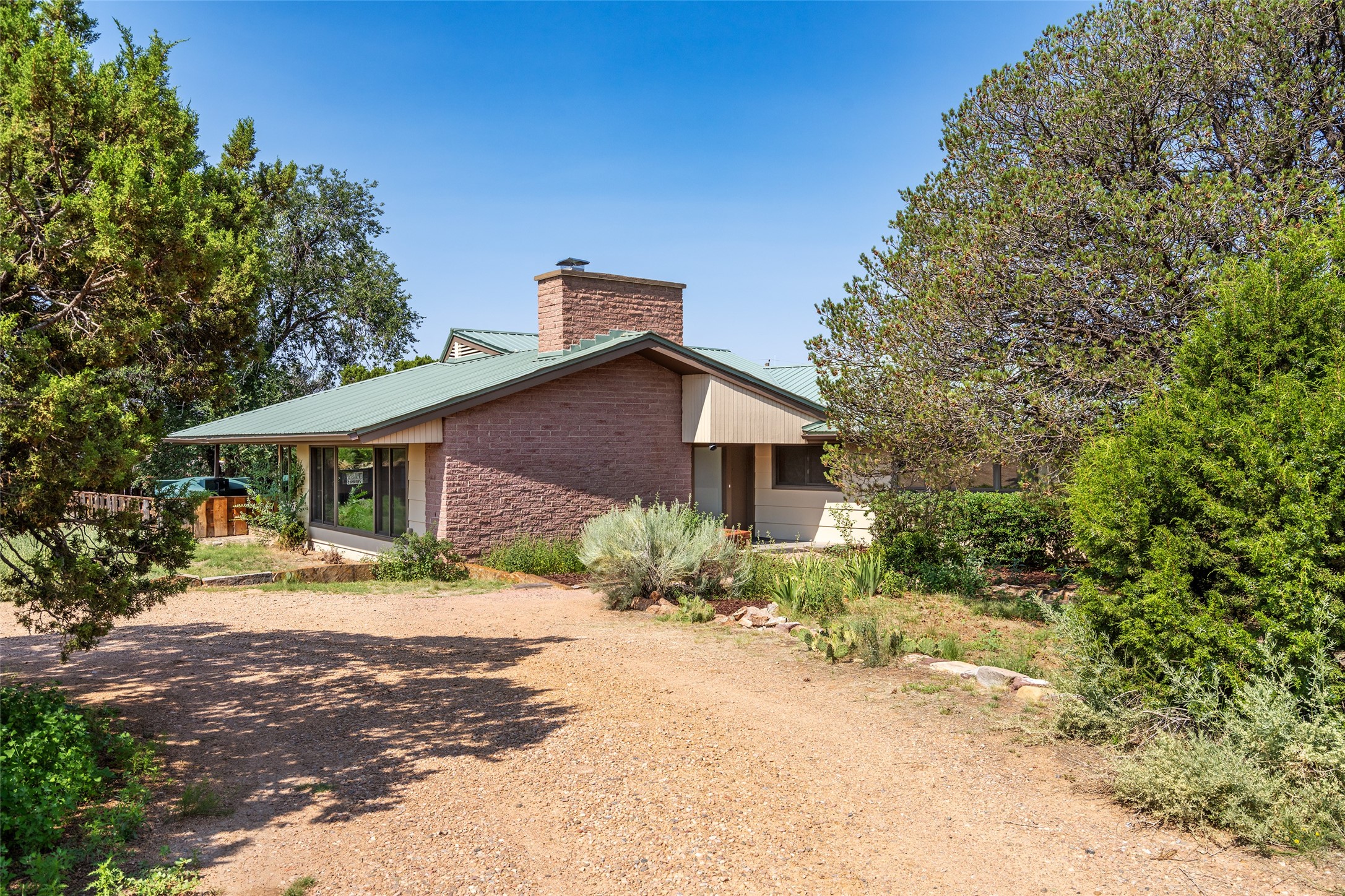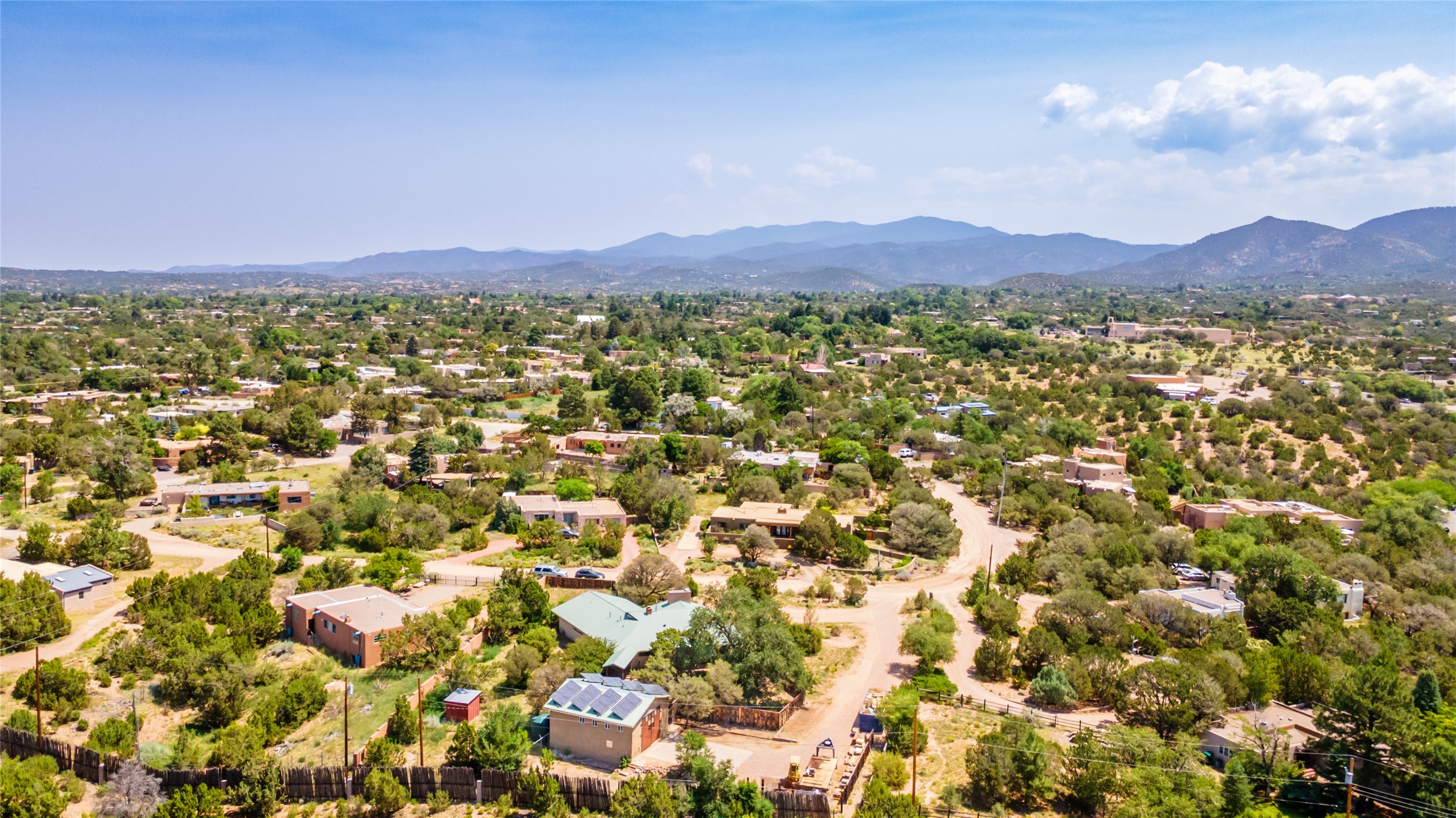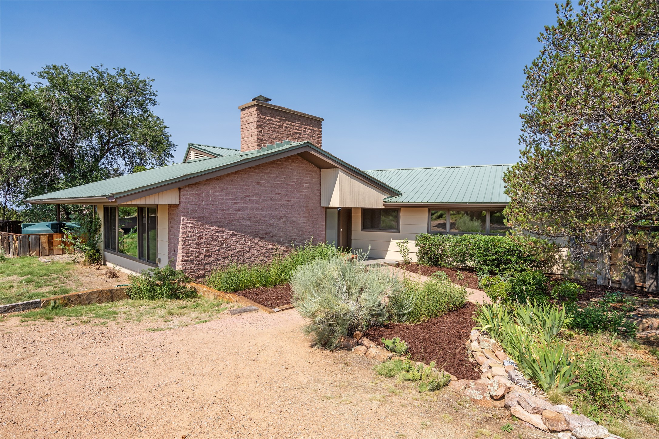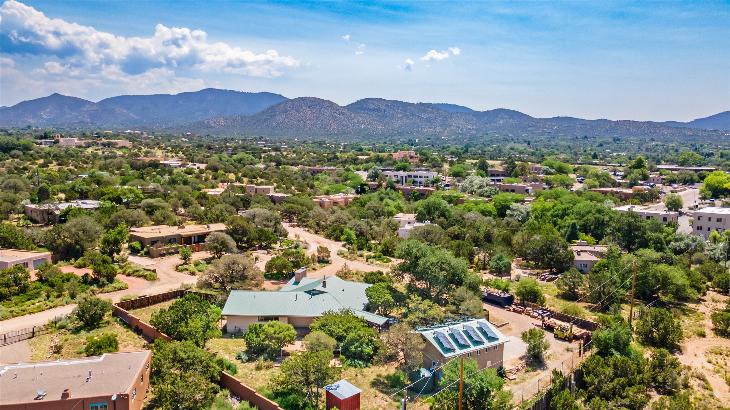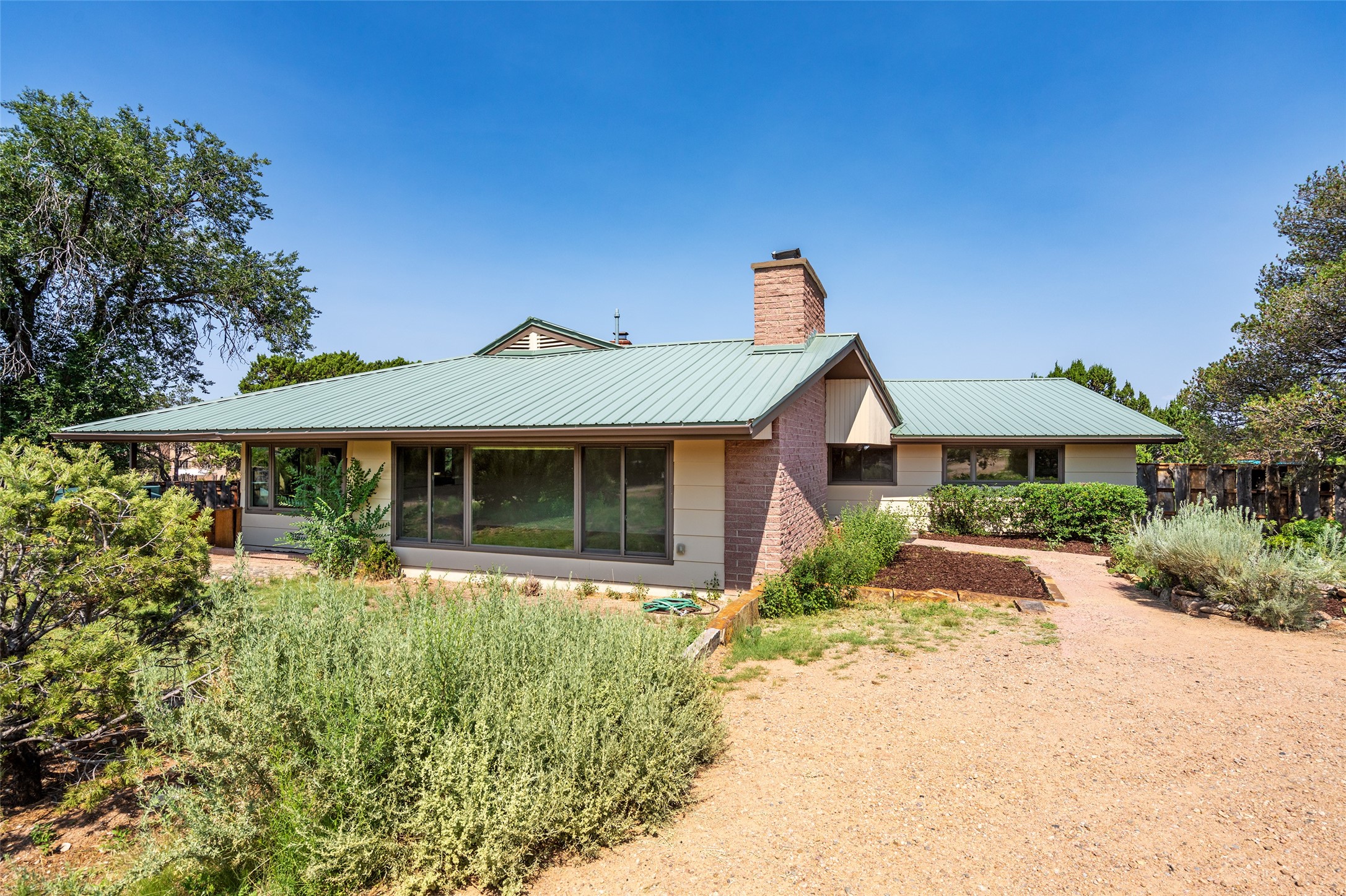 Set apart from the ordinary and just 2.5 miles from the Santa Fe Plaza, this striking custom Stamm home blends classic Northern New Mexico pitched-roof architecture with timeless Santa Fe charm. Sited on a generous 0.70-acre lot with expansive views of the foothills and Ortiz Mountains, this home offers a rare sense of space and privacy -- all while keeping you close to the heart of town. Thoughtfully renovated throughout, the main residence features three bedrooms, wood floors, and a warm, wood-plank ceiling with exposed beams. The living room centers around a charming brick fireplace flanked by custom bookcases, and the stylish kitchen boasts cool glass tile backsplash, great gas cook top, ample storage, and even a wood burning fireplace for ambiance. The sunlit primary suite includes California Closets and a beautifully modern bath with a large walk-in shower. A fully operational photovoltaic solar system helps keep energy costs low. A standout feature of the property is the detached 750-square-foot studio -- complete with its own 100-amp service, bath, soaring ceilings, custom wrought iron doors, and an upstairs loft (not included in the listed square footage). Whether you're an artist, entrepreneur, or simply seeking bonus flex space, this studio delivers. Recent improvements include a Propanel roof, new Anderson windows, high efficiency tankless water heater, remodeled bathrooms, new tile and wood flooring, updated kitchen countertops (2024), all-new interior lighting (2023), and fresh paint throughout (2025). This is a one-of-a-kind offering that feels private and peaceful -- yet is mere minutes from galleries, dining, and all the cultural vibrancy of downtown Santa Fe.