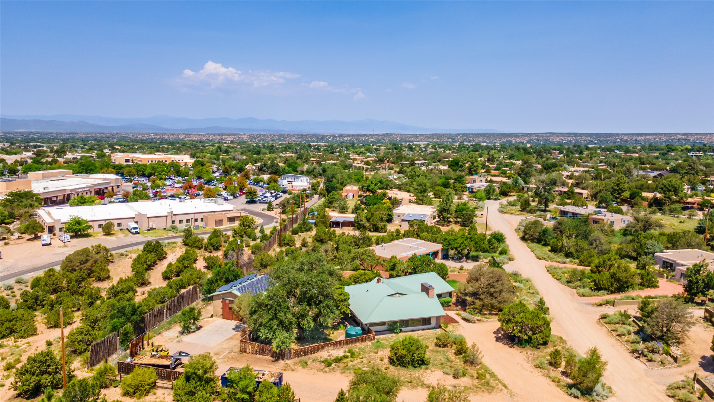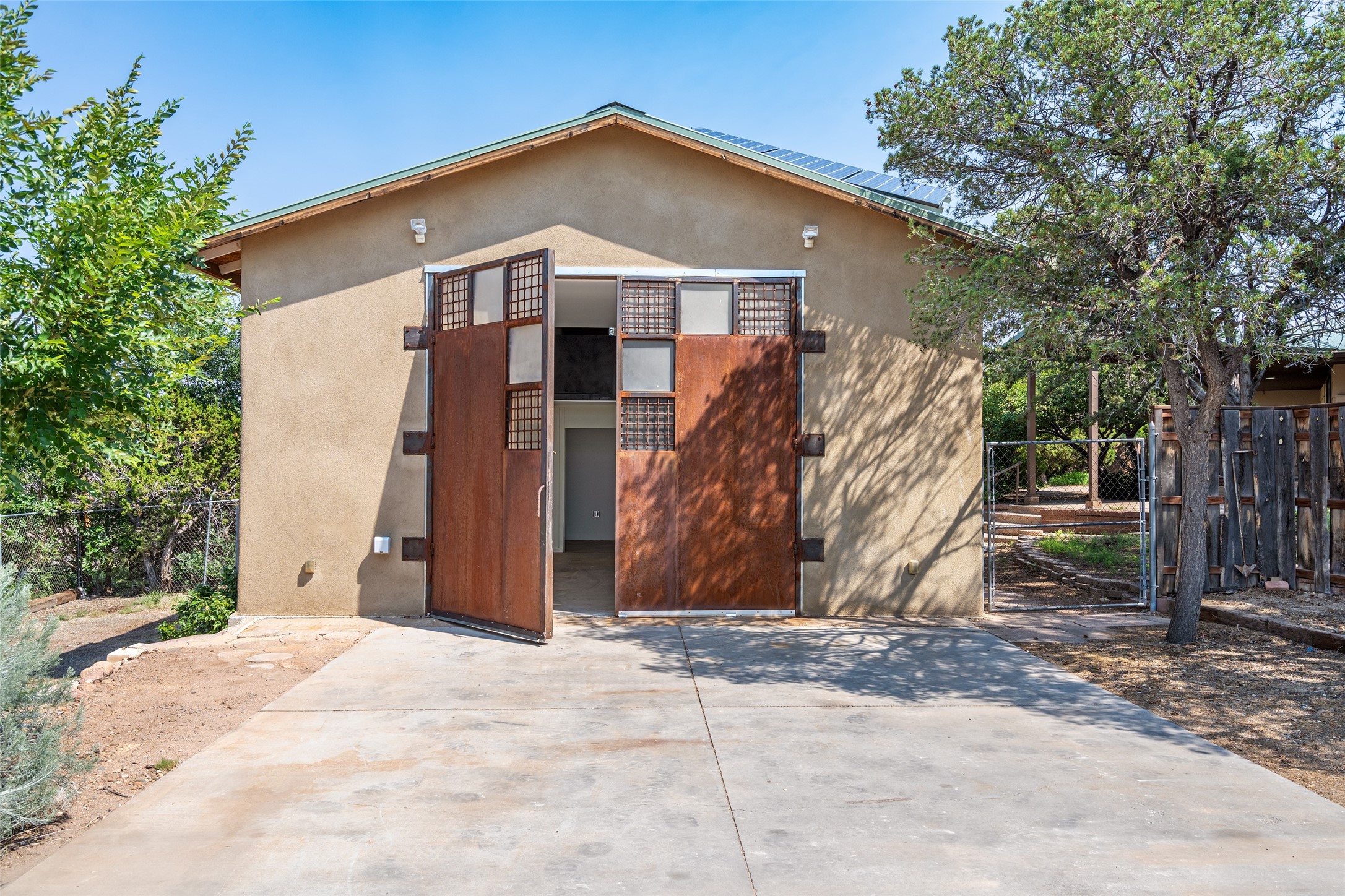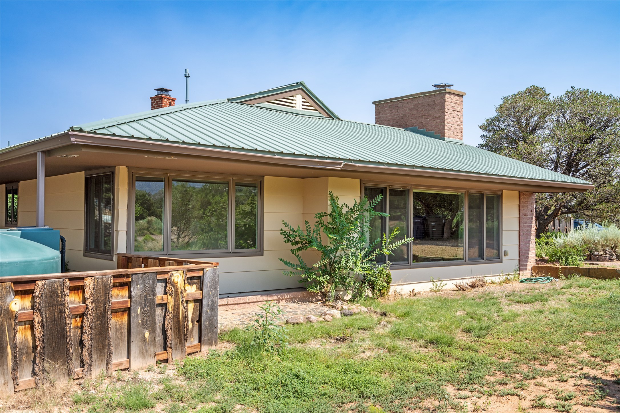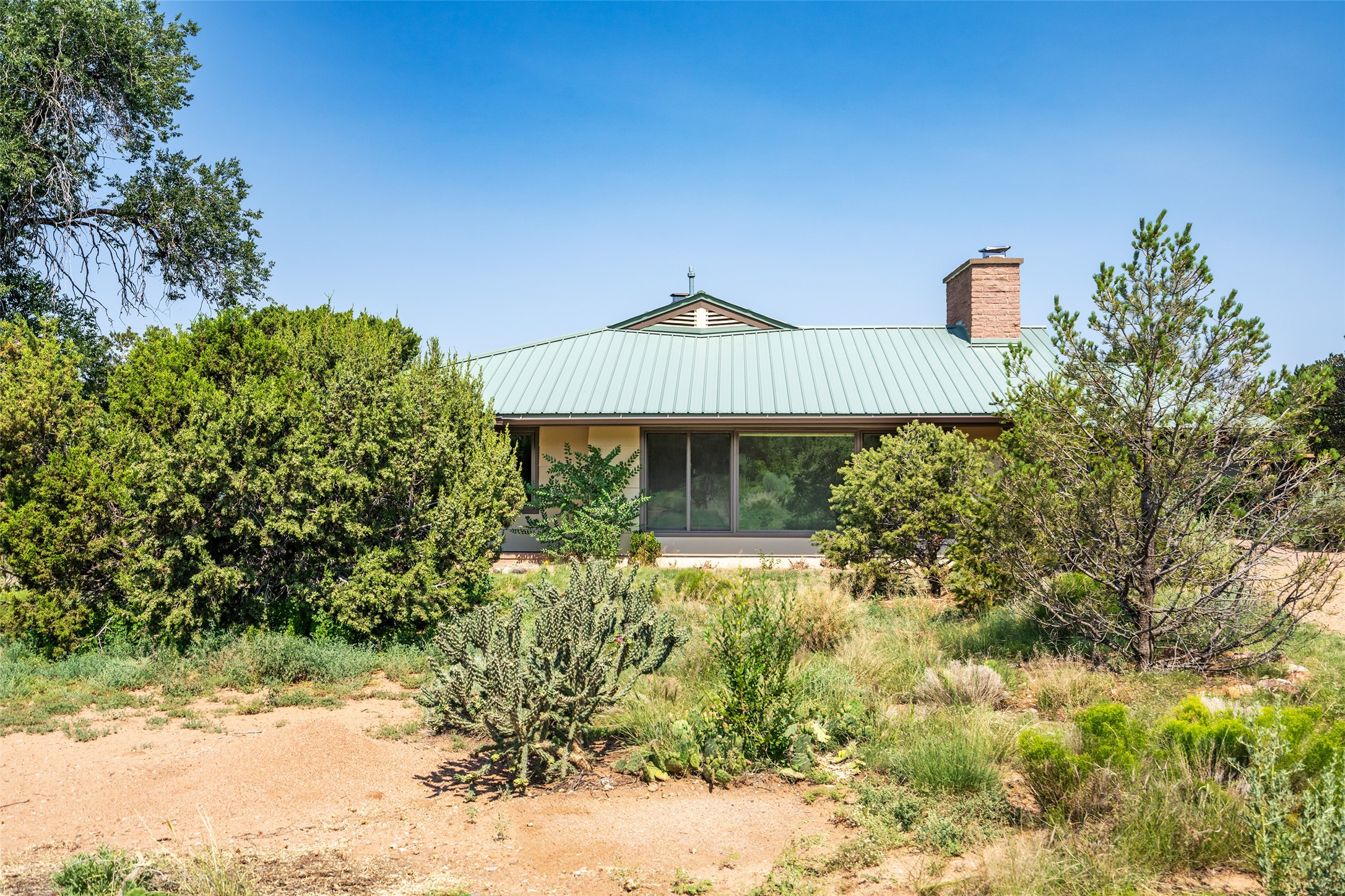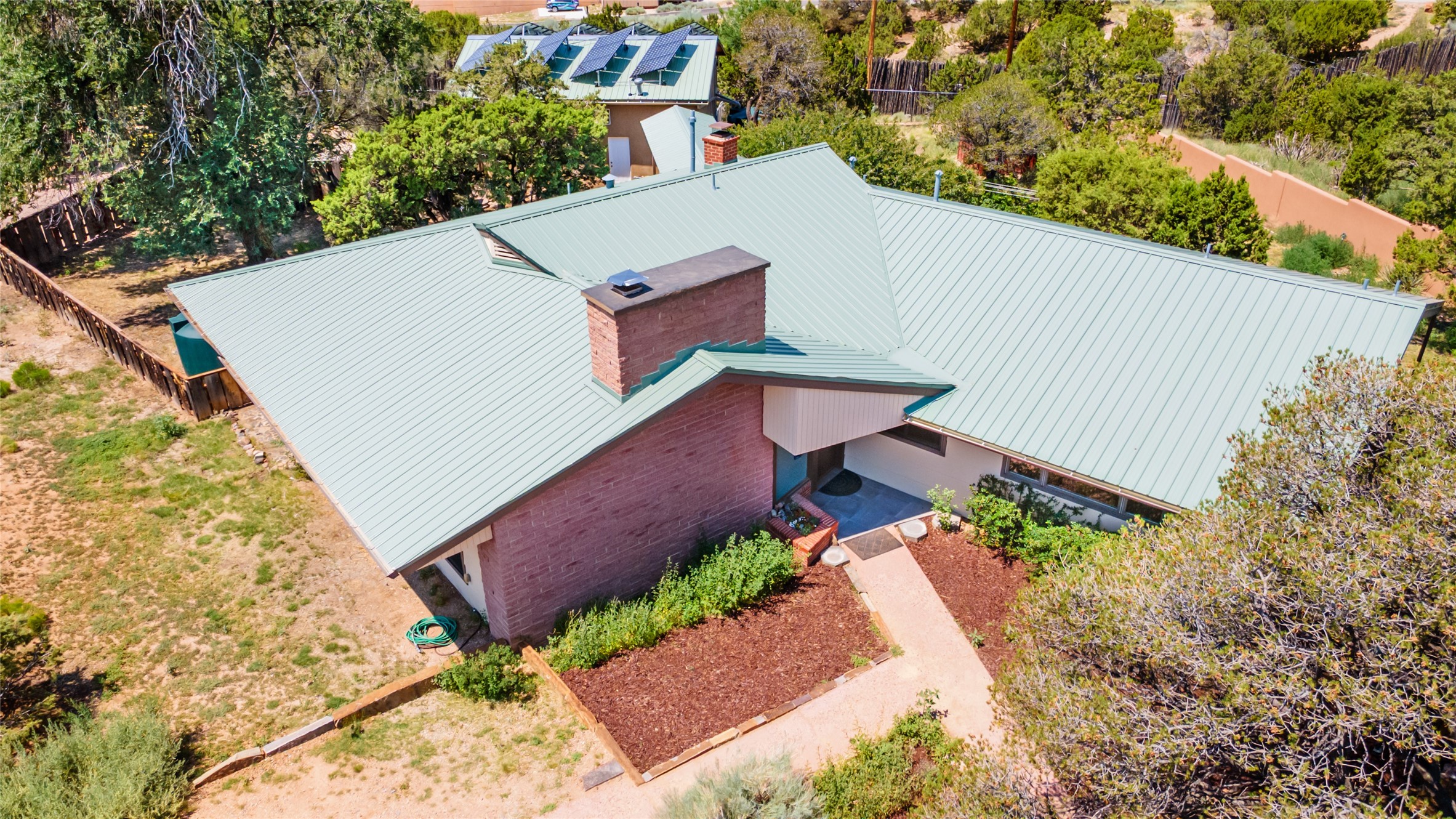 Set apart from the ordinary and just 2.5 miles from the Santa Fe Plaza, this striking custom Stamm home blends classic Northern New Mexico pitched-roof architecture with timeless Santa Fe charm. Sited on a generous 0.70-acre lot with expansive views of the foothills and Ortiz Mountains, this home offers a rare sense of space and privacy -- all while keeping you close to the heart of town. Thoughtfully renovated throughout, the main residence features three bedrooms, wood floors, and a warm, wood-plank ceiling with exposed beams. The living room centers around a charming brick fireplace flanked by custom bookcases, and the stylish kitchen boasts cool glass tile backsplash, great gas cook top, ample storage, and even a wood burning fireplace for ambiance. The sunlit primary suite includes California Closets and a beautifully modern bath with a large walk-in shower. A fully operational photovoltaic solar system helps keep energy costs low. A standout feature of the property is the detached 750-square-foot studio -- complete with its own 100-amp service, bath, soaring ceilings, custom wrought iron doors, and an upstairs loft (not included in the listed square footage). Whether you're an artist, entrepreneur, or simply seeking bonus flex space, this studio delivers. Recent improvements include a Propanel roof, new Anderson windows, high efficiency tankless water heater, remodeled bathrooms, new tile and wood flooring, updated kitchen countertops (2024), all-new interior lighting (2023), and fresh paint throughout (2025). This is a one-of-a-kind offering that feels private and peaceful -- yet is mere minutes from galleries, dining, and all the cultural vibrancy of downtown Santa Fe.