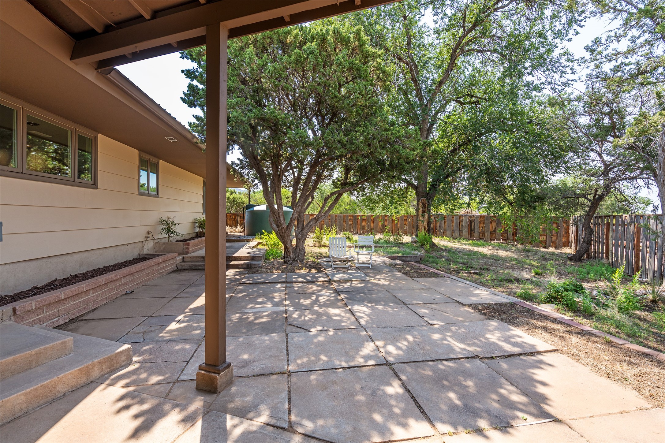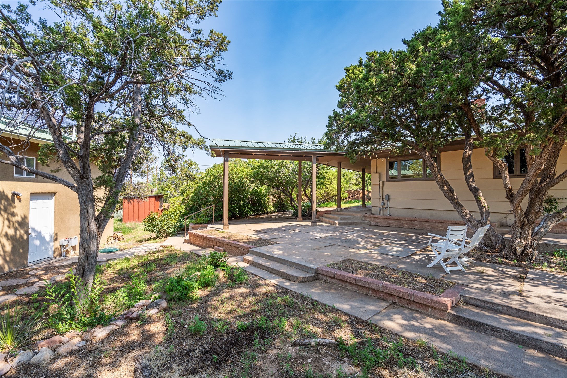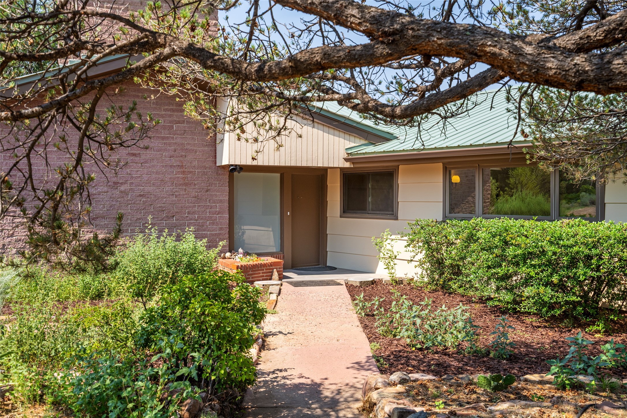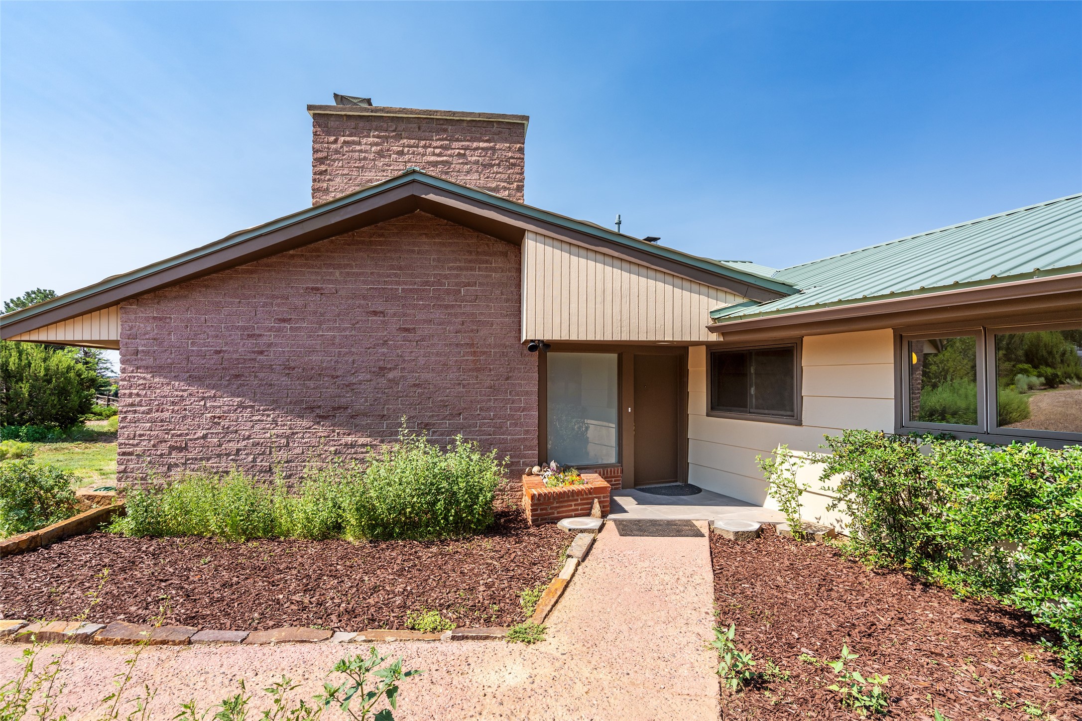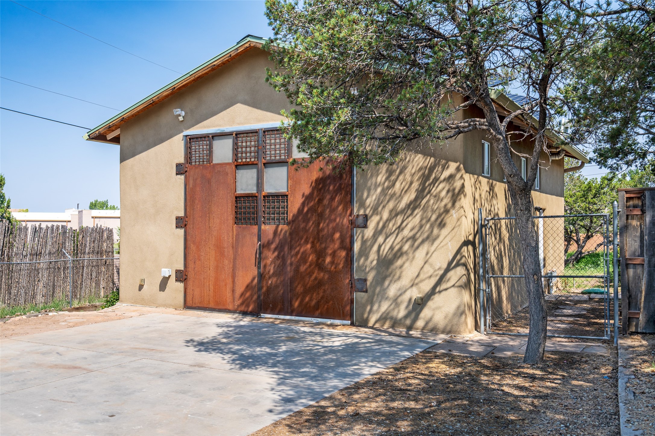 Set apart from the ordinary and just 2.5 miles from the Santa Fe Plaza, this striking custom Stamm home blends classic Northern New Mexico pitched-roof architecture with timeless Santa Fe charm. Sited on a generous 0.70-acre lot with expansive views of the foothills and Ortiz Mountains, this home offers a rare sense of space and privacy -- all while keeping you close to the heart of town. Thoughtfully renovated throughout, the main residence features three bedrooms, wood floors, and a warm, wood-plank ceiling with exposed beams. The living room centers around a charming brick fireplace flanked by custom bookcases, and the stylish kitchen boasts cool glass tile backsplash, great gas cook top, ample storage, and even a wood burning fireplace for ambiance. The sunlit primary suite includes California Closets and a beautifully modern bath with a large walk-in shower. A fully operational photovoltaic solar system helps keep energy costs low. A standout feature of the property is the detached 750-square-foot studio -- complete with its own 100-amp service, bath, soaring ceilings, custom wrought iron doors, and an upstairs loft (not included in the listed square footage). Whether you're an artist, entrepreneur, or simply seeking bonus flex space, this studio delivers. Recent improvements include a Propanel roof, new Anderson windows, high efficiency tankless water heater, remodeled bathrooms, new tile and wood flooring, updated kitchen countertops (2024), all-new interior lighting (2023), and fresh paint throughout (2025). This is a one-of-a-kind offering that feels private and peaceful -- yet is mere minutes from galleries, dining, and all the cultural vibrancy of downtown Santa Fe.