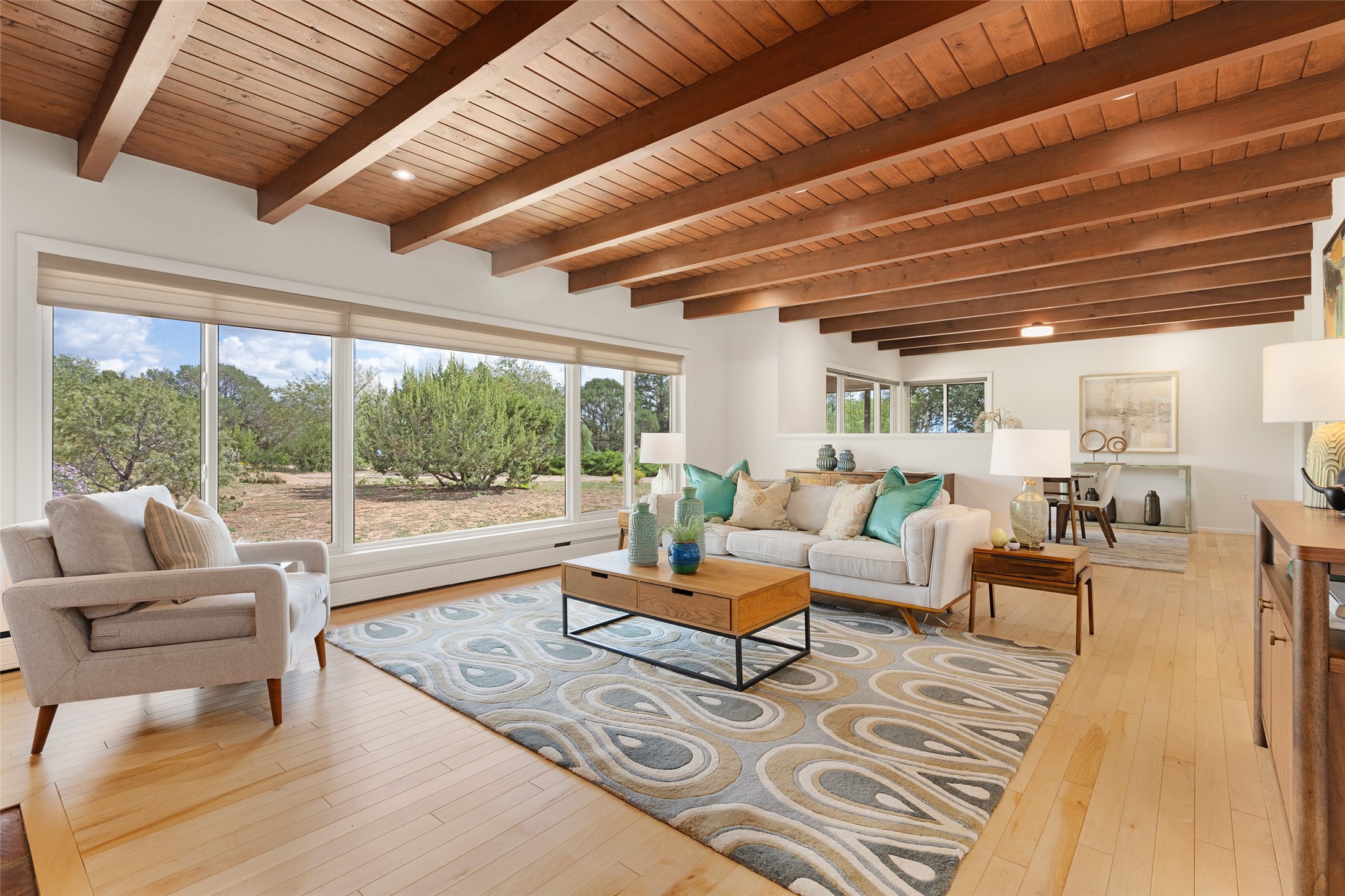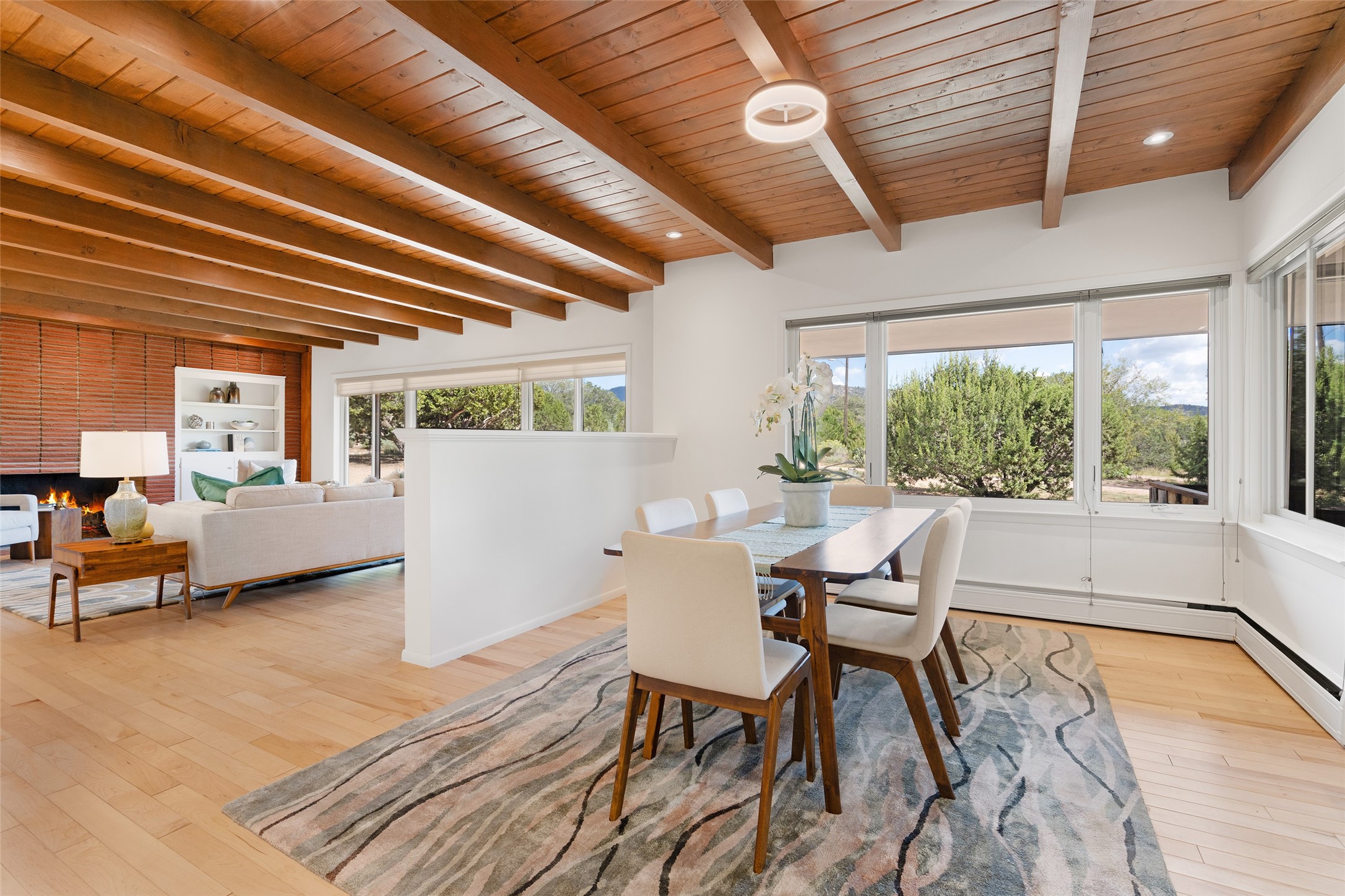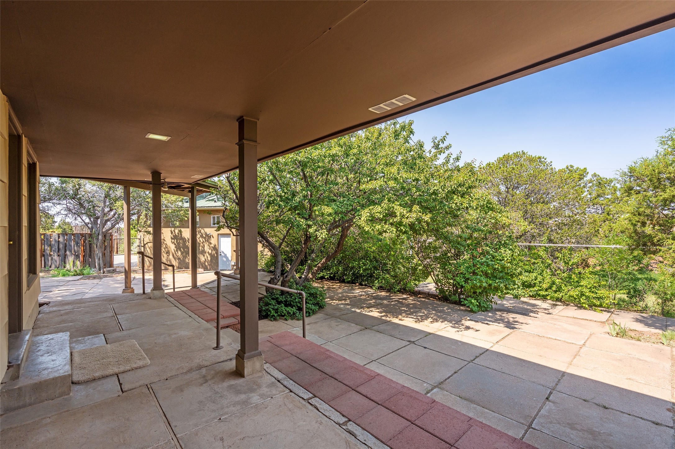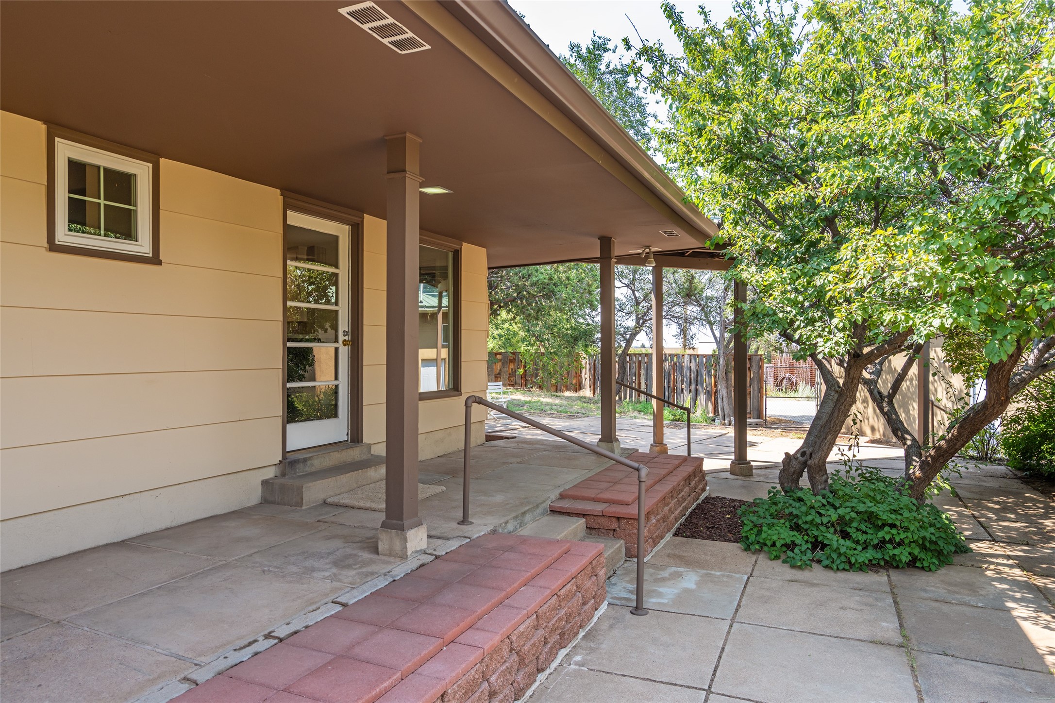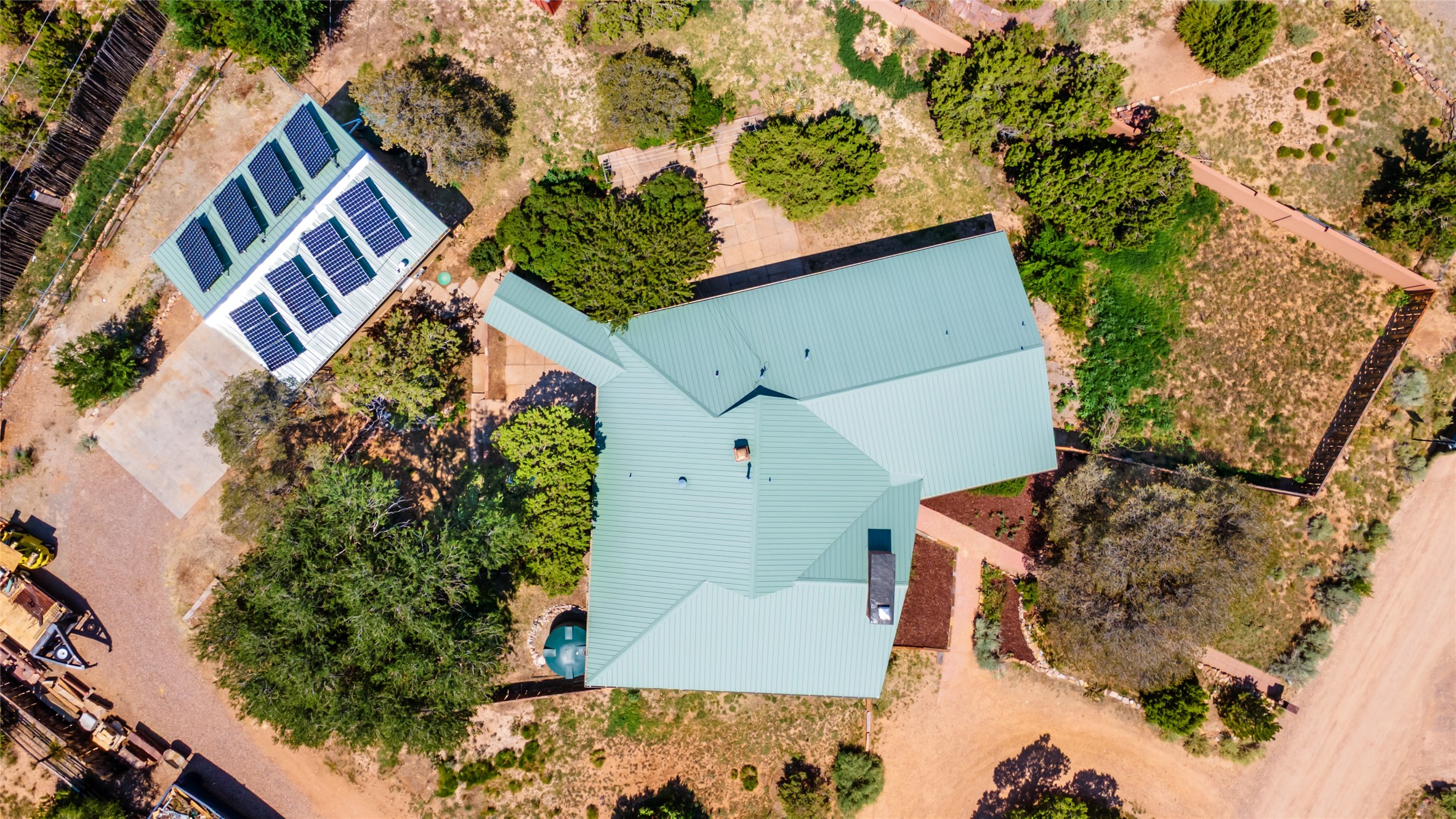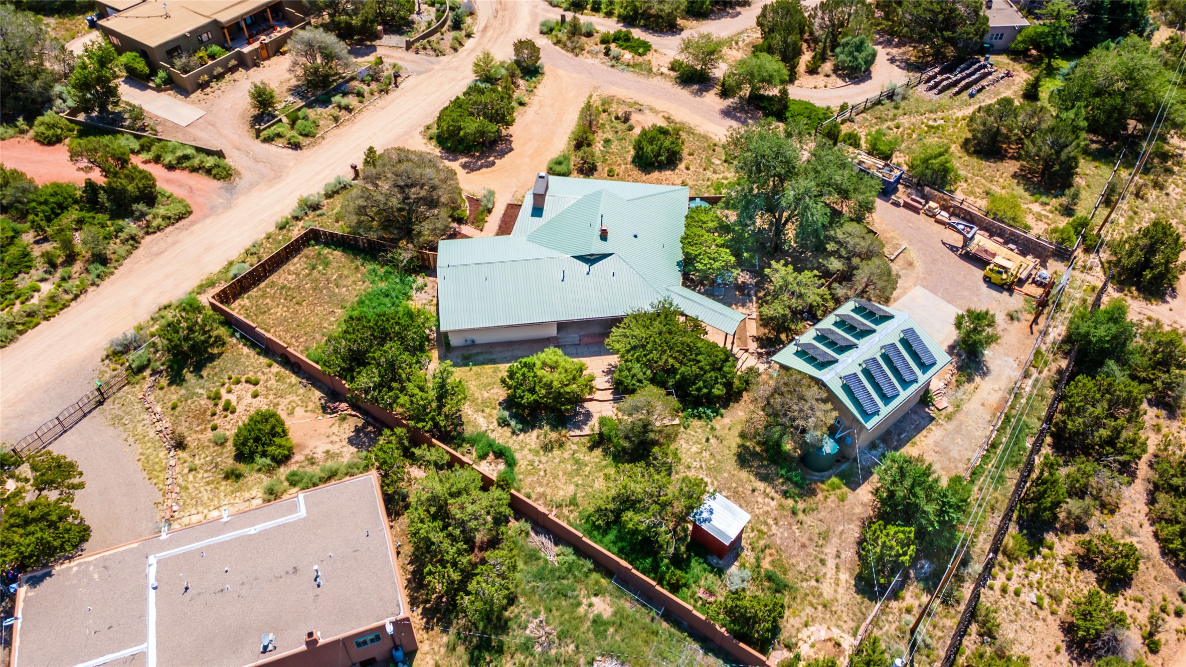 Set apart from the ordinary and just 2.5 miles from the Santa Fe Plaza, this striking custom Stamm home blends classic Northern New Mexico pitched-roof architecture with timeless Santa Fe charm. Sited on a generous 0.70-acre lot with expansive views of the foothills and Ortiz Mountains, this home offers a rare sense of space and privacy -- all while keeping you close to the heart of town. Thoughtfully renovated throughout, the main residence features three bedrooms, wood floors, and a warm, wood-plank ceiling with exposed beams. The living room centers around a charming brick fireplace flanked by custom bookcases, and the stylish kitchen boasts cool glass tile backsplash, great gas cook top, ample storage, and even a wood burning fireplace for ambiance. The sunlit primary suite includes California Closets and a beautifully modern bath with a large walk-in shower. A fully operational photovoltaic solar system helps keep energy costs low. A standout feature of the property is the detached 750-square-foot studio -- complete with its own 100-amp service, bath, soaring ceilings, custom wrought iron doors, and an upstairs loft (not included in the listed square footage). Whether you're an artist, entrepreneur, or simply seeking bonus flex space, this studio delivers. Recent improvements include a Propanel roof, new Anderson windows, high efficiency tankless water heater, remodeled bathrooms, new tile and wood flooring, updated kitchen countertops (2024), all-new interior lighting (2023), and fresh paint throughout (2025). This is a one-of-a-kind offering that feels private and peaceful -- yet is mere minutes from galleries, dining, and all the cultural vibrancy of downtown Santa Fe.