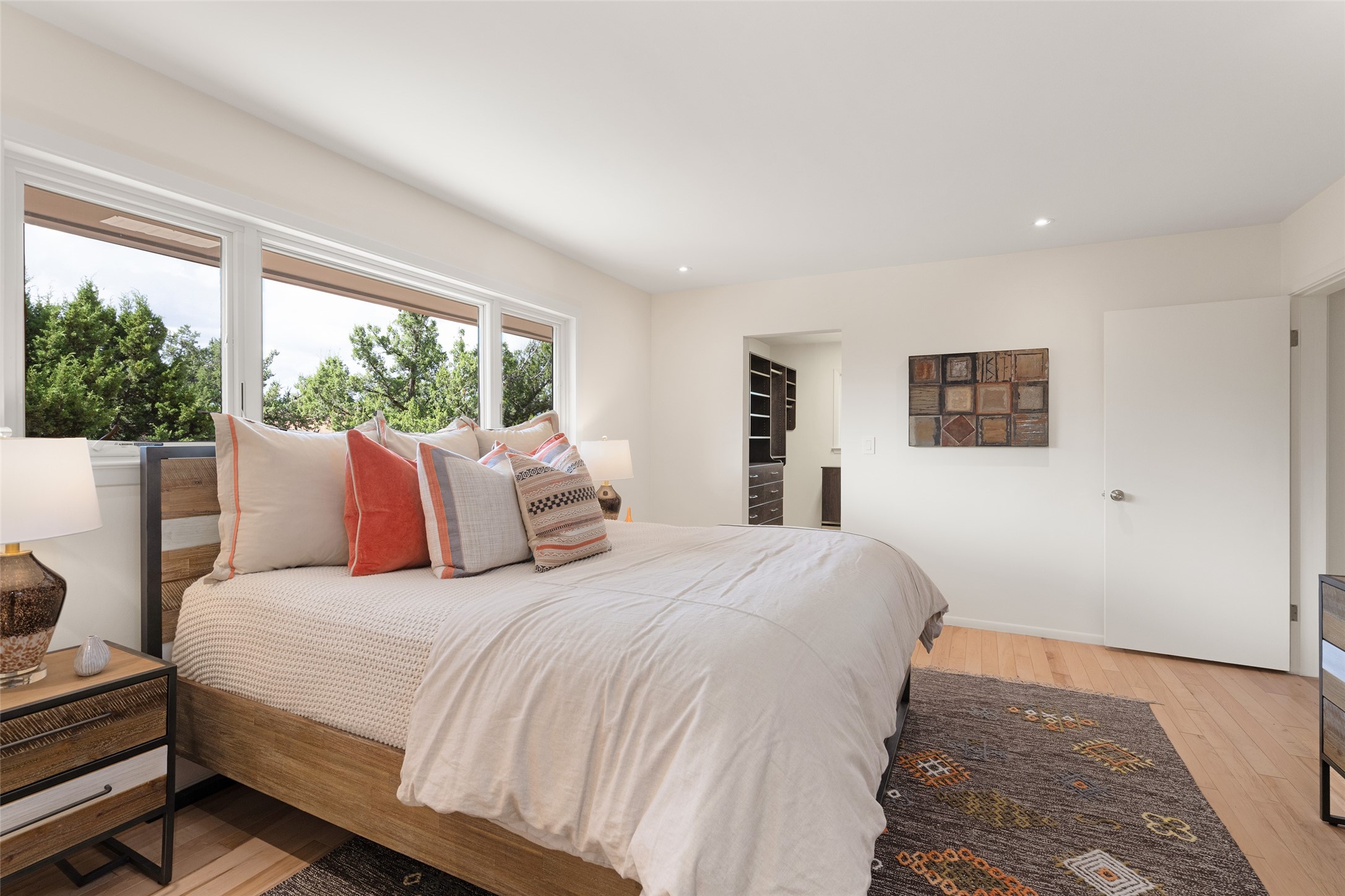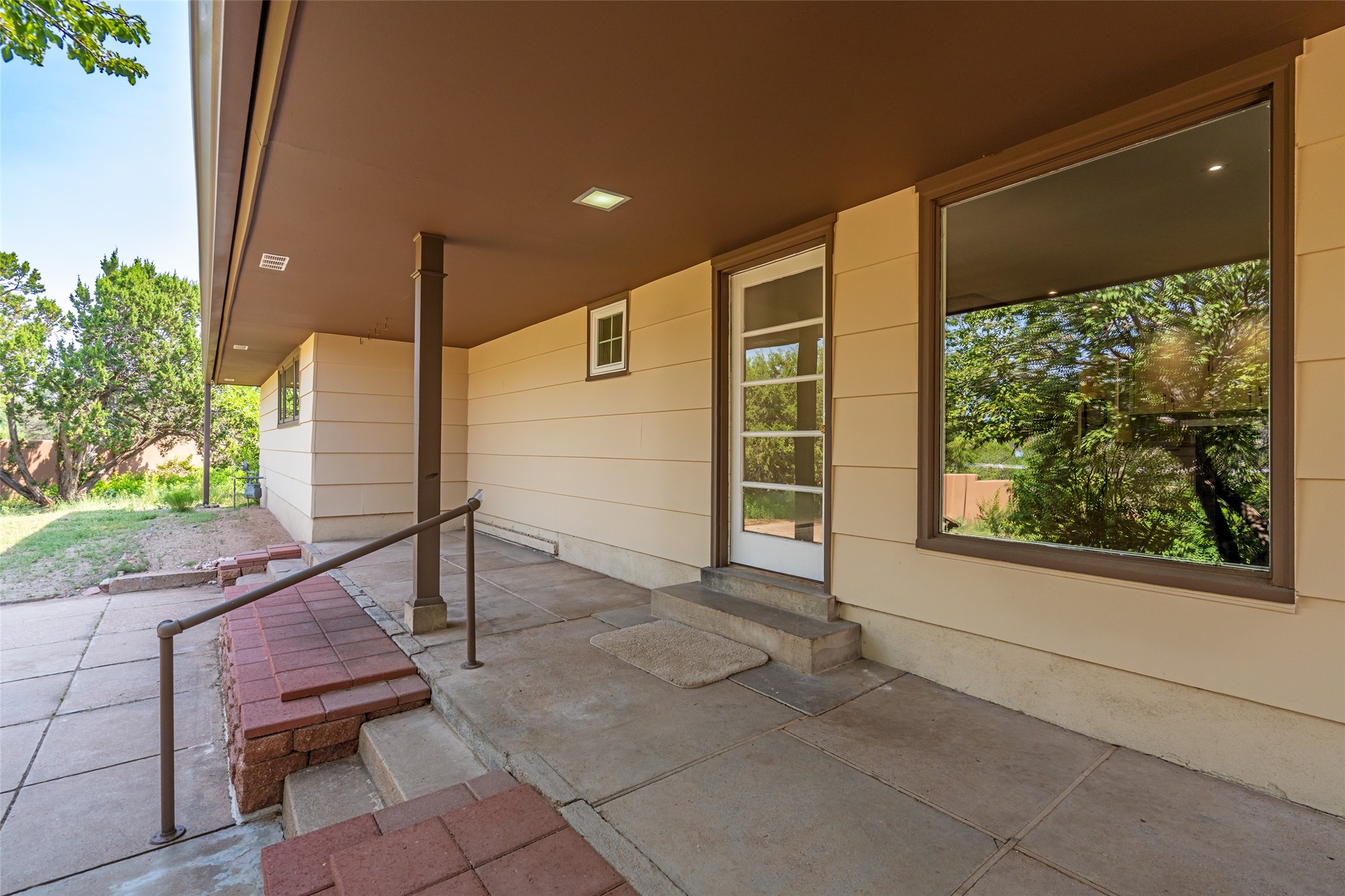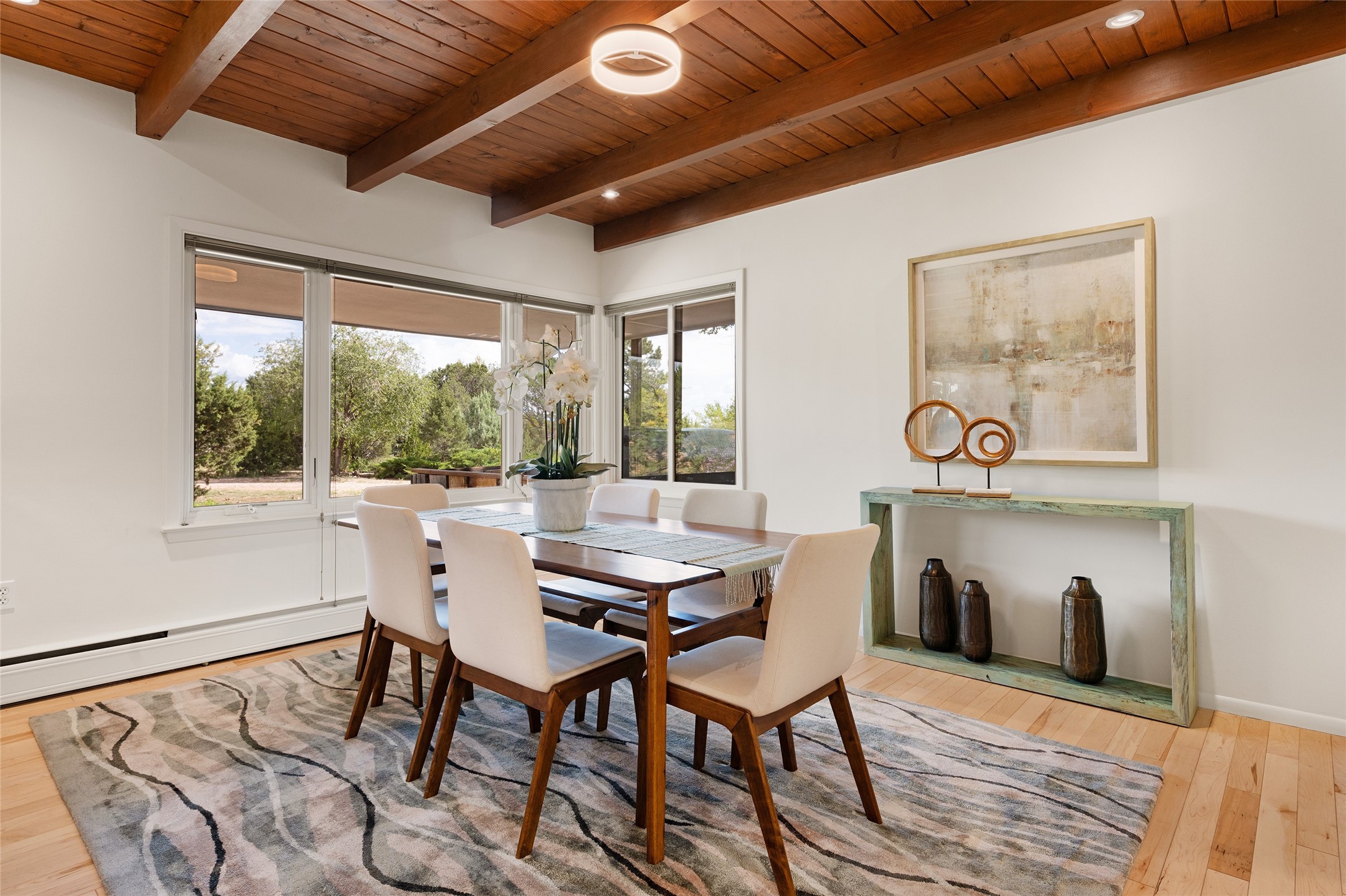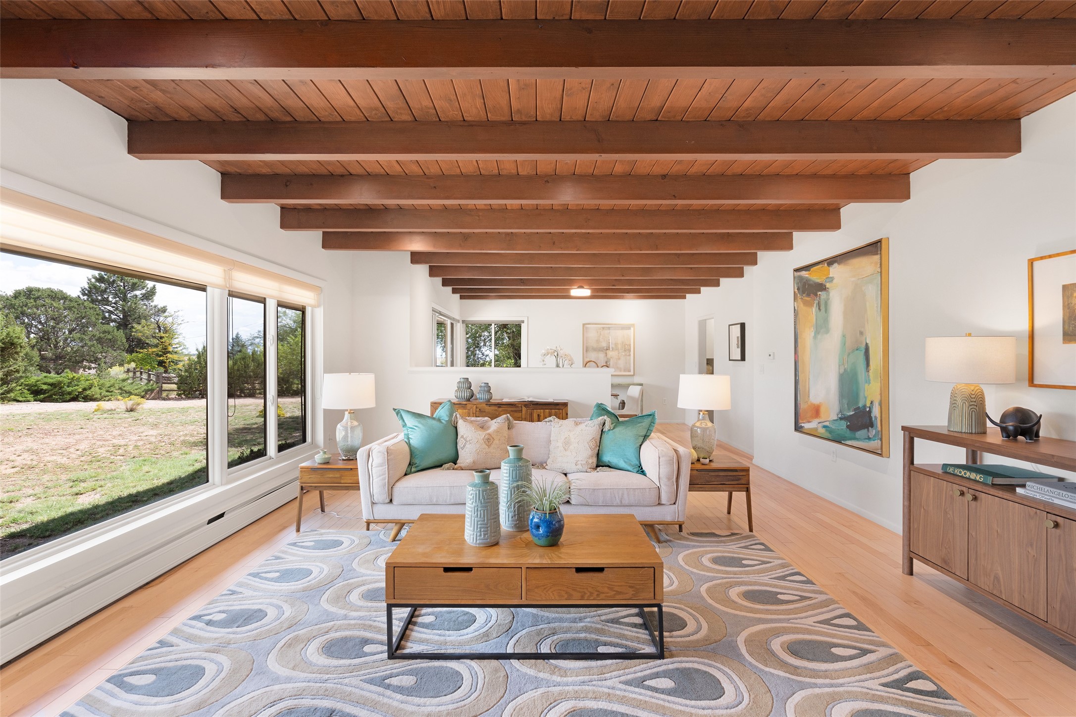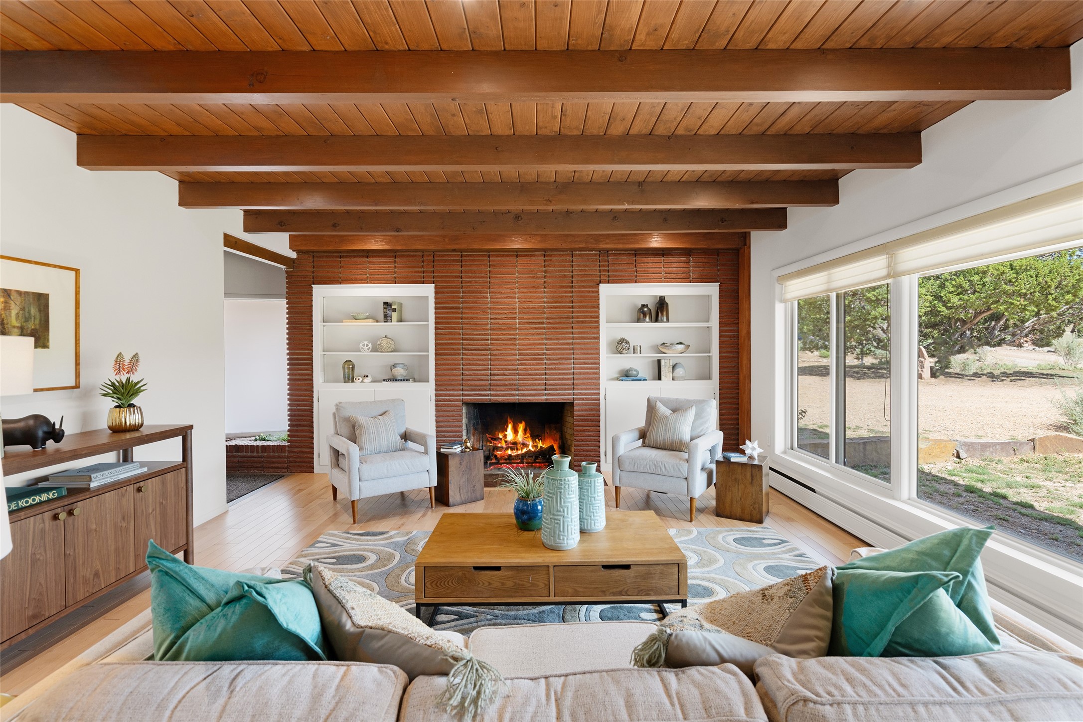 Set apart from the ordinary and just 2.5 miles from the Santa Fe Plaza, this striking custom Stamm home blends classic Northern New Mexico pitched-roof architecture with timeless Santa Fe charm. Sited on a generous 0.70-acre lot with expansive views of the foothills and Ortiz Mountains, this home offers a rare sense of space and privacy -- all while keeping you close to the heart of town. Thoughtfully renovated throughout, the main residence features three bedrooms, wood floors, and a warm, wood-plank ceiling with exposed beams. The living room centers around a charming brick fireplace flanked by custom bookcases, and the stylish kitchen boasts cool glass tile backsplash, great gas cook top, ample storage, and even a wood burning fireplace for ambiance. The sunlit primary suite includes California Closets and a beautifully modern bath with a large walk-in shower. A fully operational photovoltaic solar system helps keep energy costs low. A standout feature of the property is the detached 750-square-foot studio -- complete with its own 100-amp service, bath, soaring ceilings, custom wrought iron doors, and an upstairs loft (not included in the listed square footage). Whether you're an artist, entrepreneur, or simply seeking bonus flex space, this studio delivers. Recent improvements include a Propanel roof, new Anderson windows, high efficiency tankless water heater, remodeled bathrooms, new tile and wood flooring, updated kitchen countertops (2024), all-new interior lighting (2023), and fresh paint throughout (2025). This is a one-of-a-kind offering that feels private and peaceful -- yet is mere minutes from galleries, dining, and all the cultural vibrancy of downtown Santa Fe.