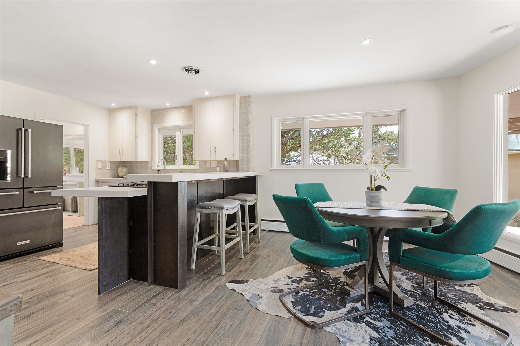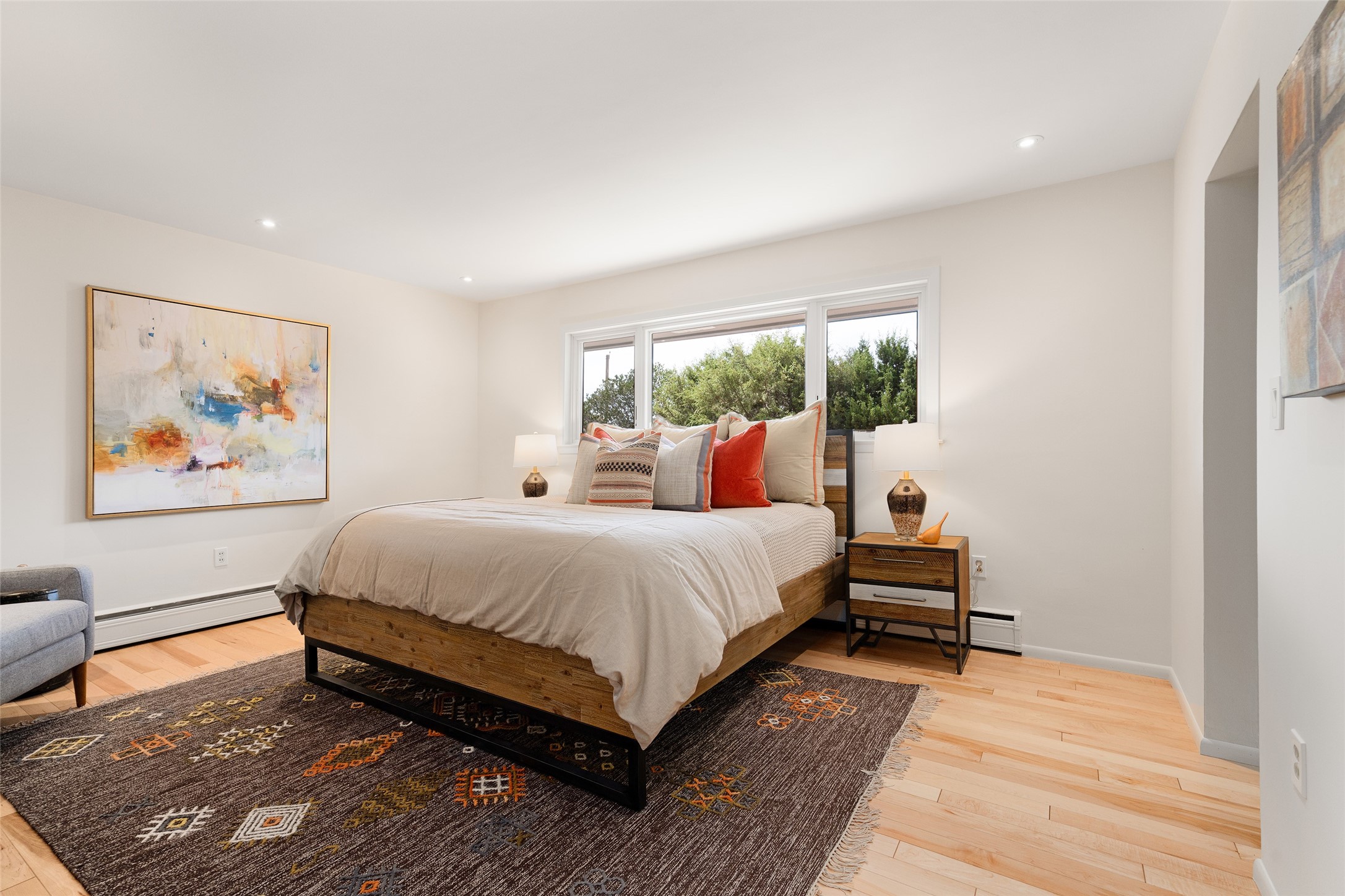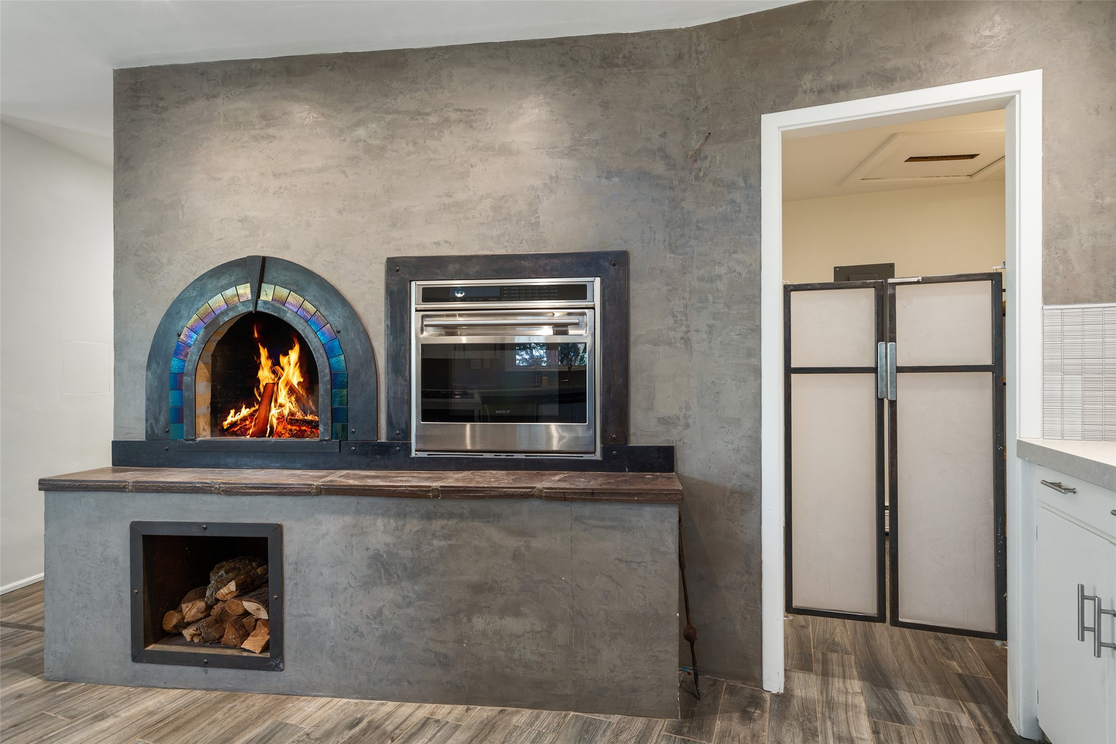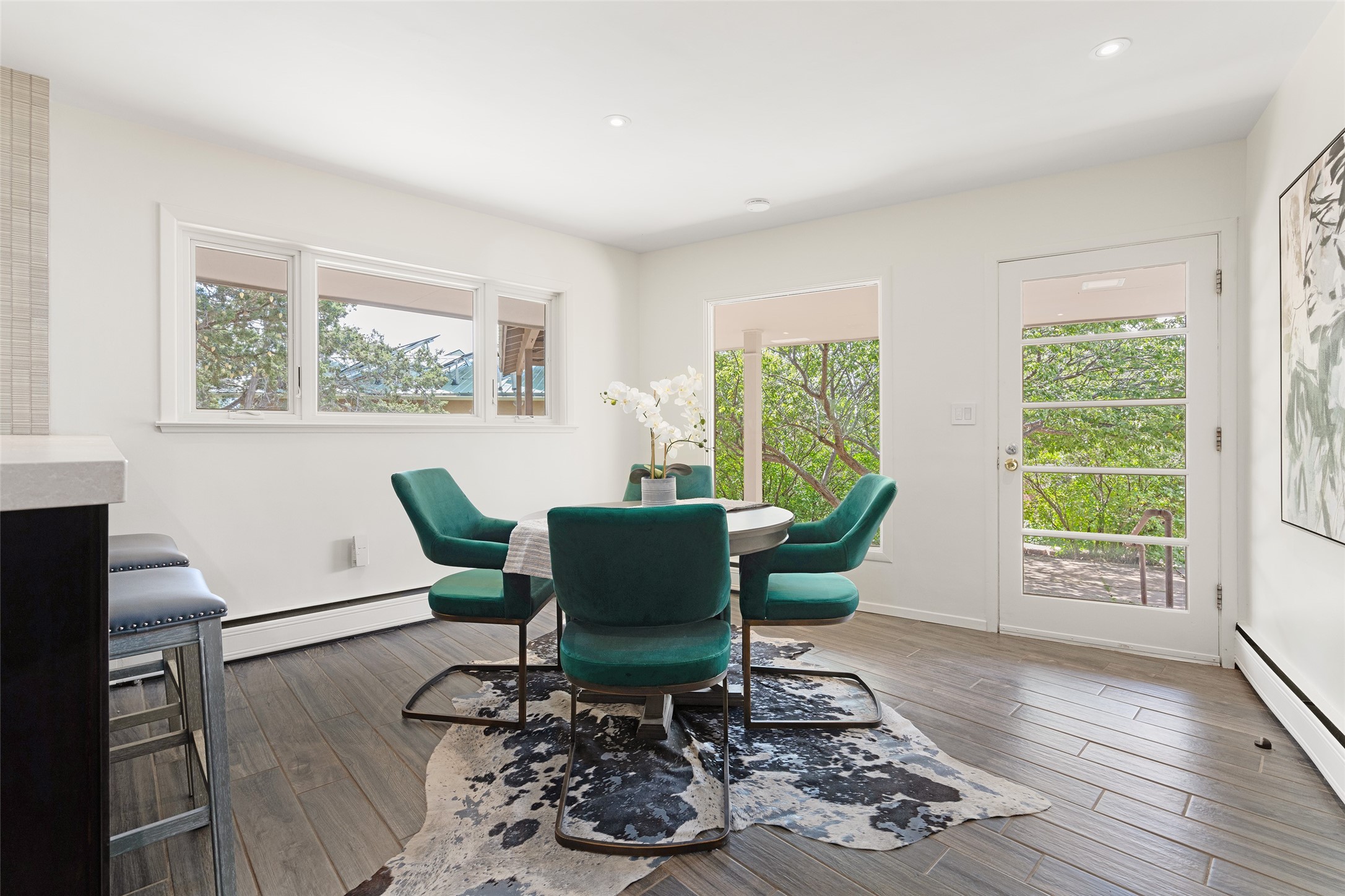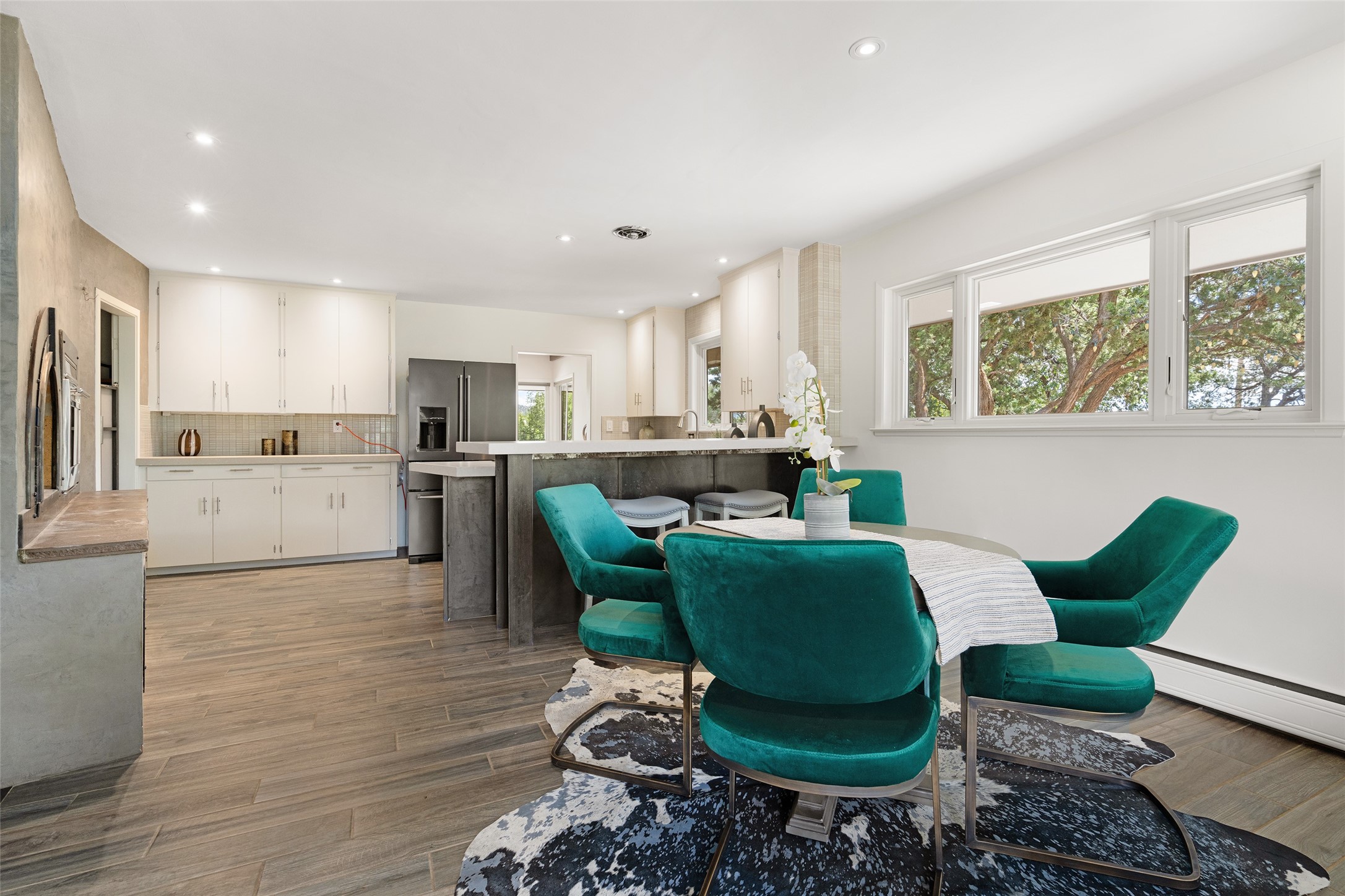 Set apart from the ordinary and just 2.5 miles from the Santa Fe Plaza, this striking custom Stamm home blends classic Northern New Mexico pitched-roof architecture with timeless Santa Fe charm. Sited on a generous 0.70-acre lot with expansive views of the foothills and Ortiz Mountains, this home offers a rare sense of space and privacy -- all while keeping you close to the heart of town. Thoughtfully renovated throughout, the main residence features three bedrooms, wood floors, and a warm, wood-plank ceiling with exposed beams. The living room centers around a charming brick fireplace flanked by custom bookcases, and the stylish kitchen boasts cool glass tile backsplash, great gas cook top, ample storage, and even a wood burning fireplace for ambiance. The sunlit primary suite includes California Closets and a beautifully modern bath with a large walk-in shower. A fully operational photovoltaic solar system helps keep energy costs low. A standout feature of the property is the detached 750-square-foot studio -- complete with its own 100-amp service, bath, soaring ceilings, custom wrought iron doors, and an upstairs loft (not included in the listed square footage). Whether you're an artist, entrepreneur, or simply seeking bonus flex space, this studio delivers. Recent improvements include a Propanel roof, new Anderson windows, high efficiency tankless water heater, remodeled bathrooms, new tile and wood flooring, updated kitchen countertops (2024), all-new interior lighting (2023), and fresh paint throughout (2025). This is a one-of-a-kind offering that feels private and peaceful -- yet is mere minutes from galleries, dining, and all the cultural vibrancy of downtown Santa Fe.