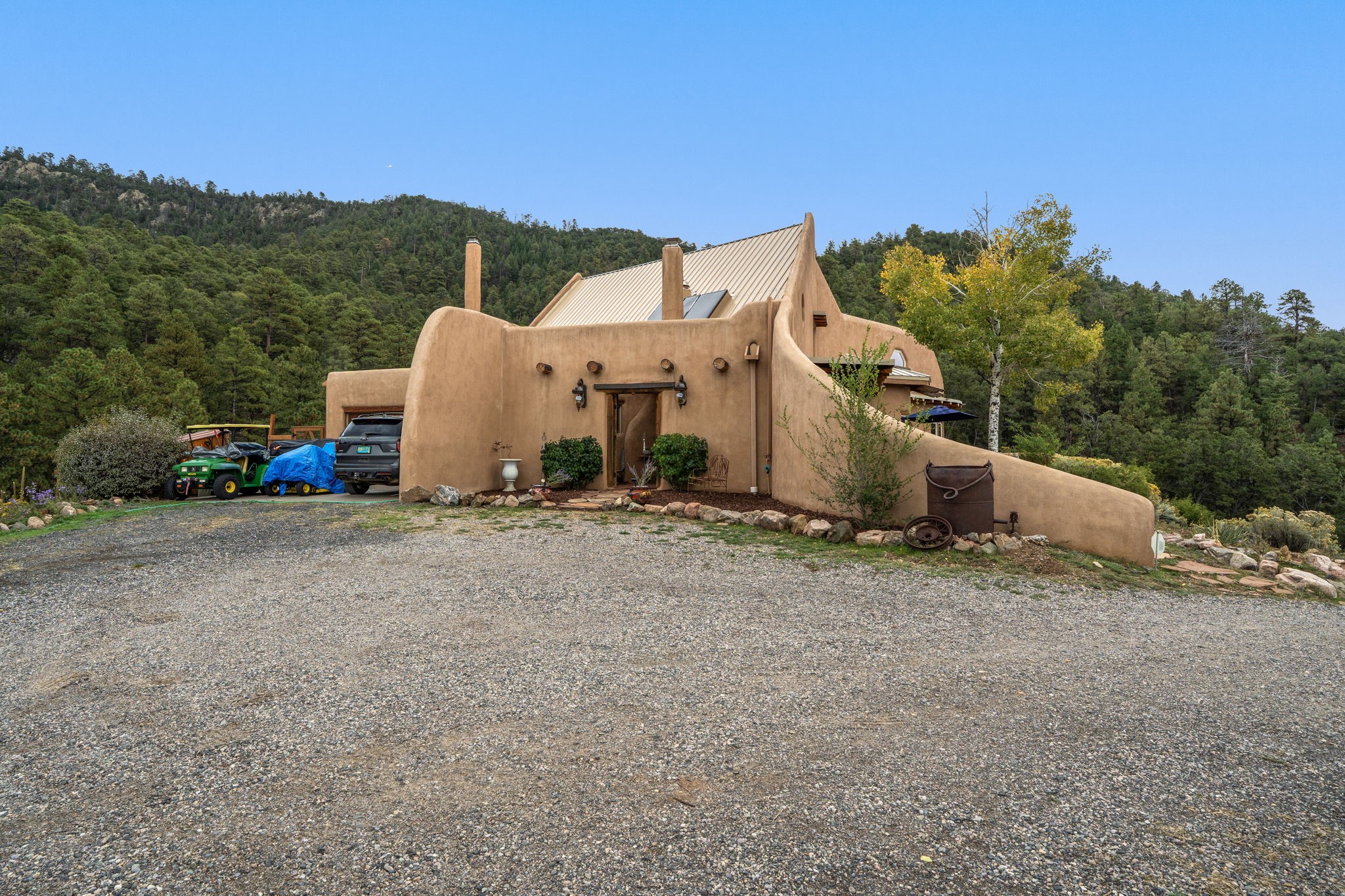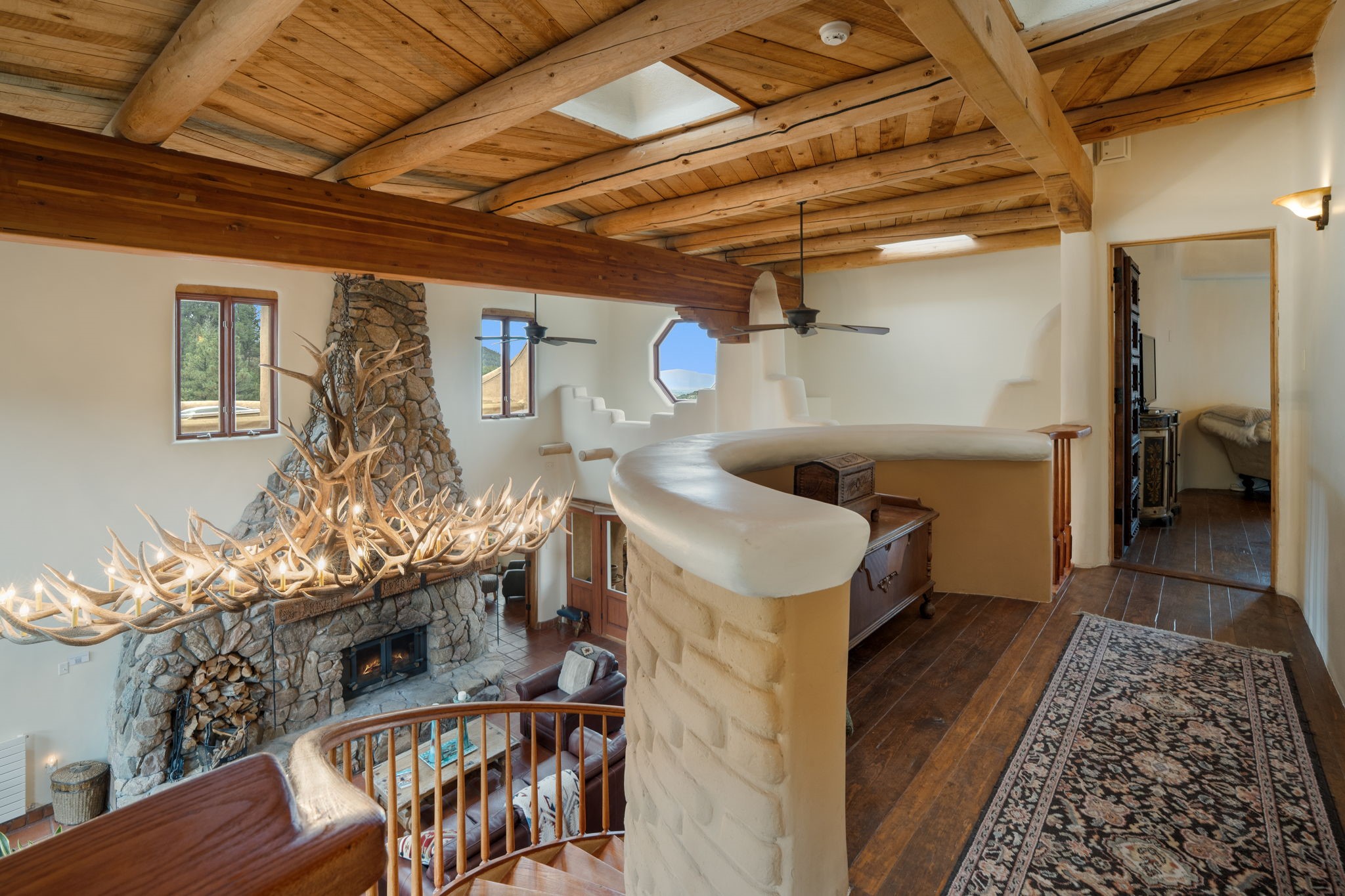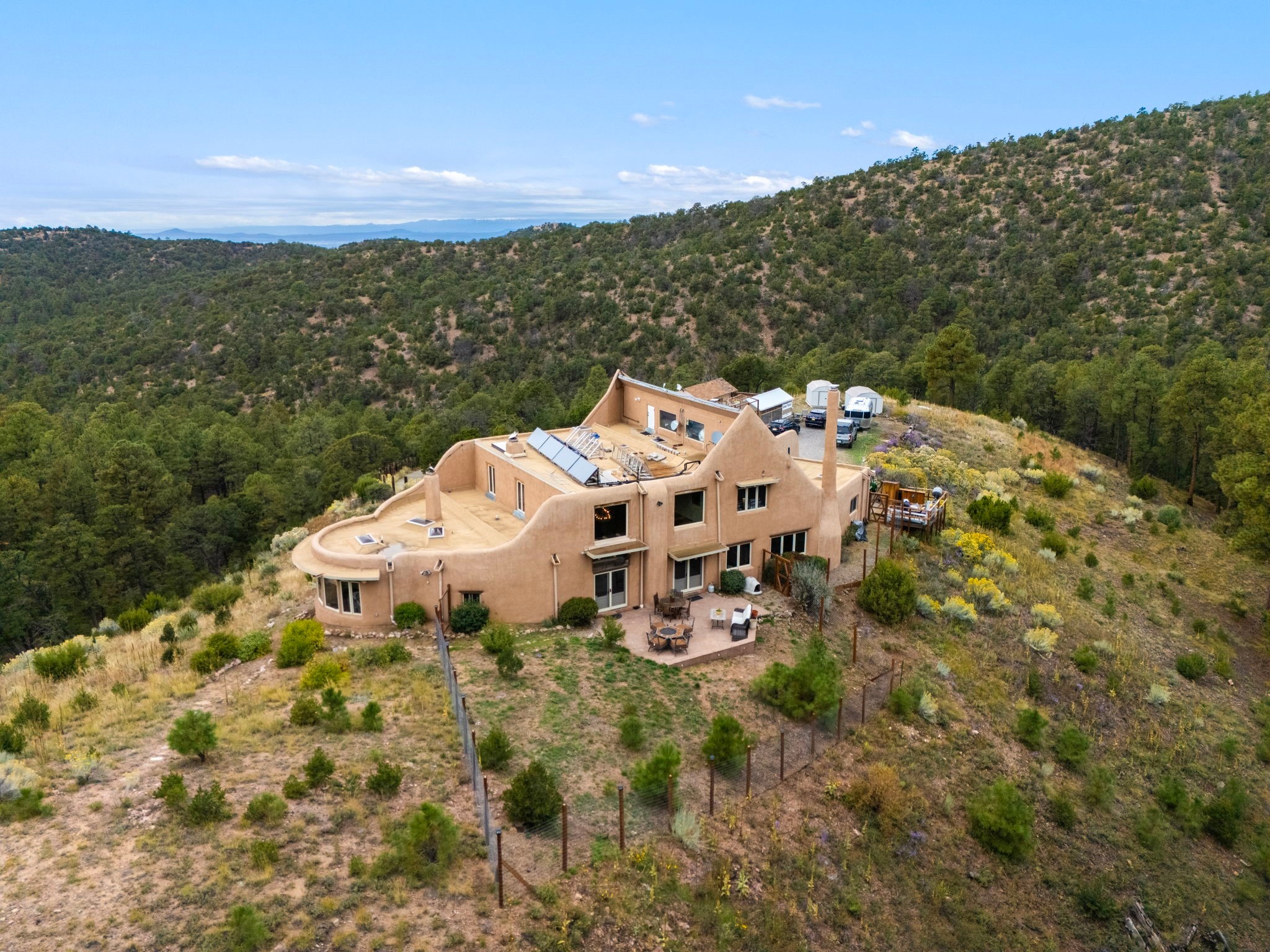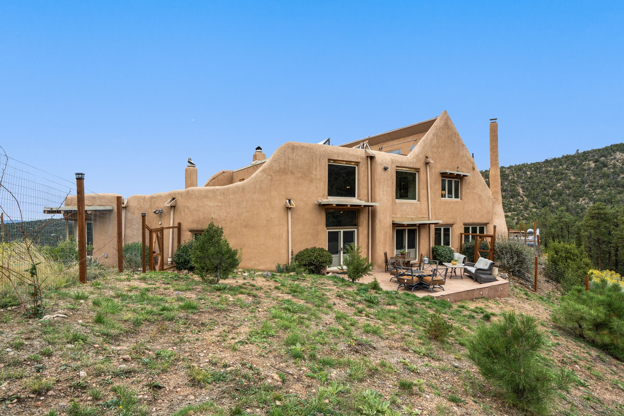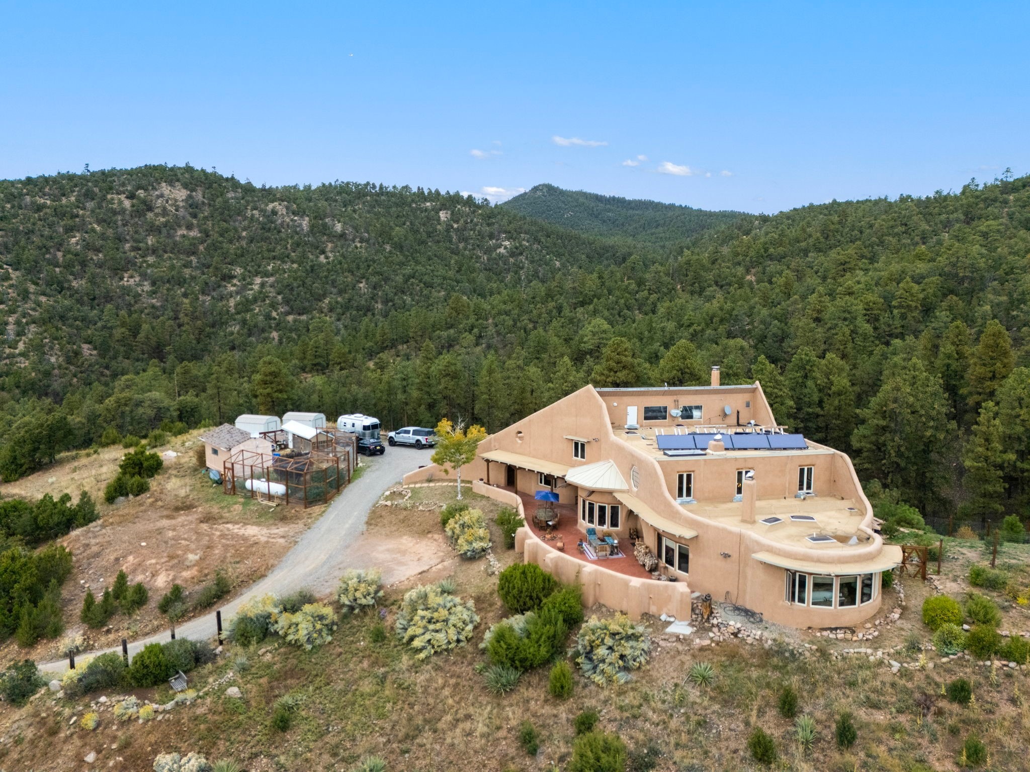 Nestled on 78 pristine private acres spread across four deeded lots, this extraordinary estate offers a blend of seclusion, artistry and timeless Southwestern charm just 25 minutes from downtown Santa Fe.The 4,400 square foot adobe home is a masterpiece of craftsmanship and comfort. Solid adobe construction provides natural insulation that keeps interiors warm in winter and cool in summer. Inside, four ensuite bedrooms and 4.5 baths offer comfort and privacy while 30 hand carved doors and accents from Seret and Sons lend a one of a kind artistic touch throughout the home.The great room is the heart of this residence anchored by a dramatic stone fireplace, high viga ceilings and a custom antler chandelier that adds rustic elegance. French doors open to a spacious front portal framing sweeping views of the Sangre de Cristo Mountains.A graceful circular staircase leads to the upper level where two ensuite bedrooms and a balcony overlooking the great room create an inviting sense of openness and connection. The kitchen is both functional and charming with granite counters, abundant cabinetry and a cozy breakfast nook warmed by its own fireplace. Saltillo tile floors flow throughout the main level while hardwood floors add warmth upstairs.The primary suite is a private retreat with panoramic mountain views and a luxurious bath with a jetted tub, tiled shower and granite counters.Step outside to a fenced backyard and patio perfect for watching the weather in the distance, peaceful wildlife and star filled nights. Additional features include solar hot water, four fireplaces, a two car garage, two sheds and a chicken coop with eight hens that provide fresh eggs daily.This property is more than a home. It is a work of art set deep in nature offering tranquility, authenticity and soul. Experience a place where art, architecture and landscape come together in harmony.