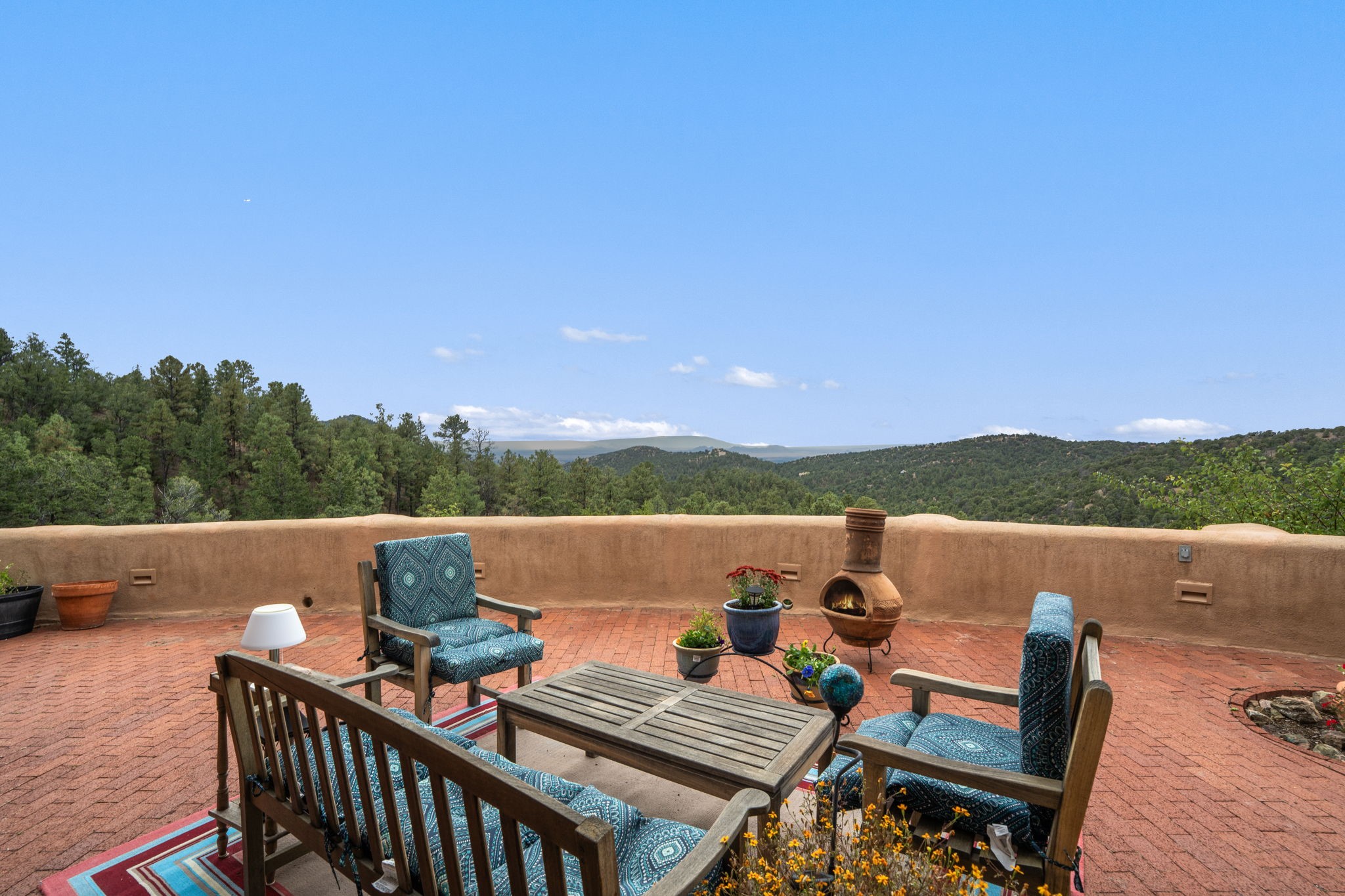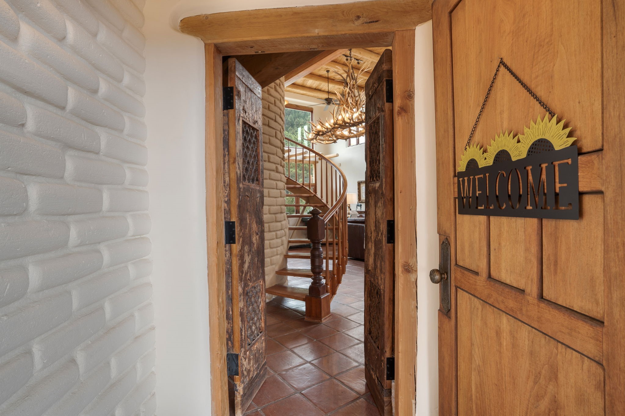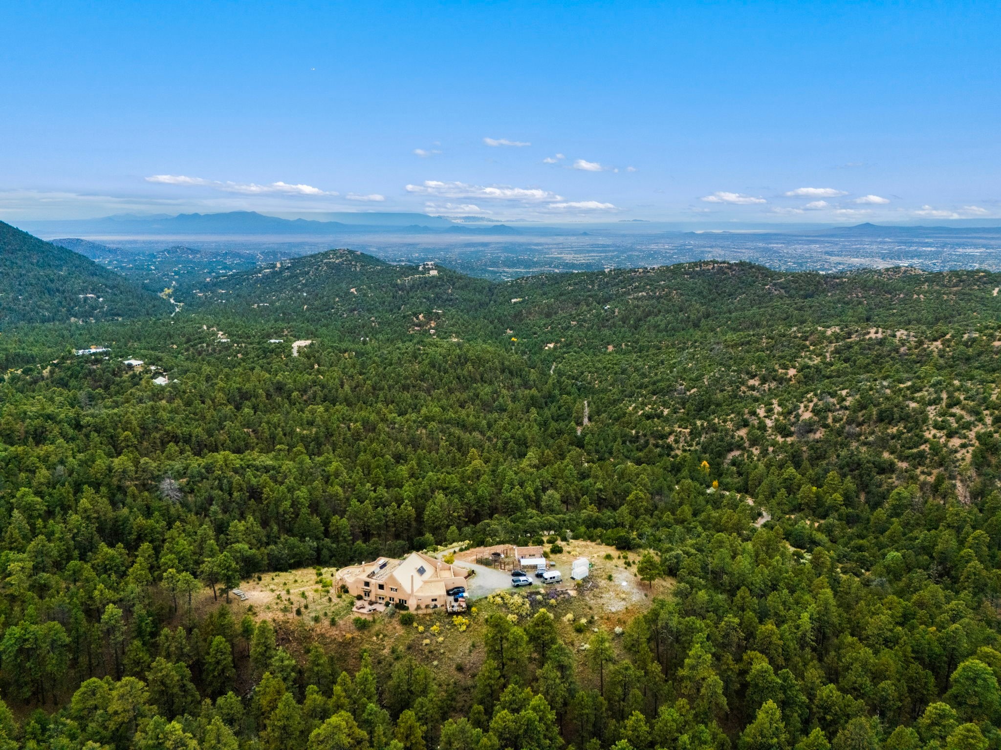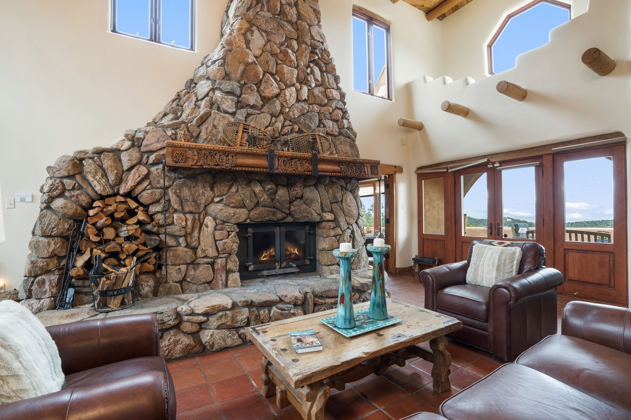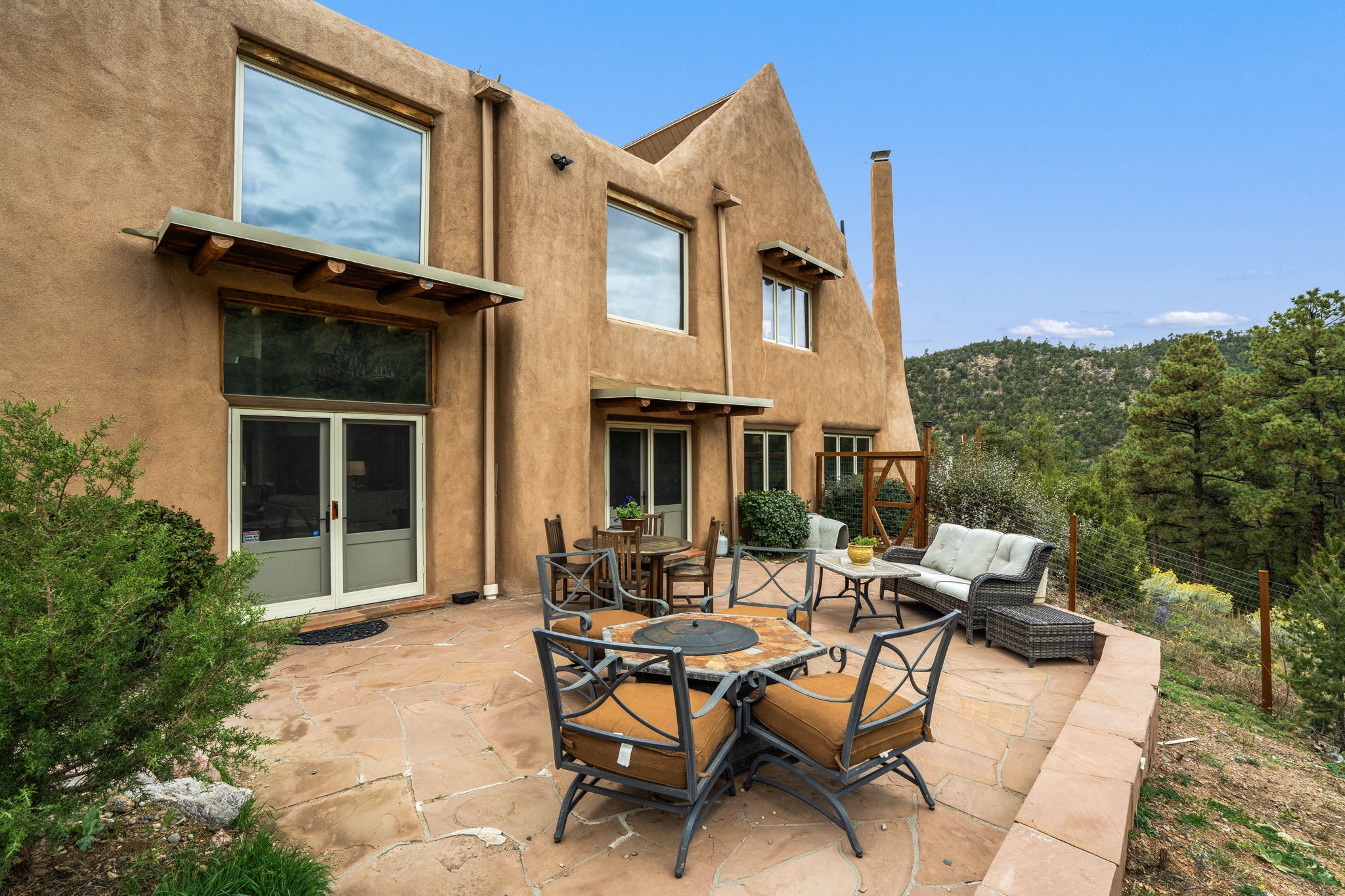 Nestled on 78 pristine private acres spread across four deeded lots, this extraordinary estate offers a blend of seclusion, artistry and timeless Southwestern charm just 25 minutes from downtown Santa Fe.The 4,400 square foot adobe home is a masterpiece of craftsmanship and comfort. Solid adobe construction provides natural insulation that keeps interiors warm in winter and cool in summer. Inside, four ensuite bedrooms and 4.5 baths offer comfort and privacy while 30 hand carved doors and accents from Seret and Sons lend a one of a kind artistic touch throughout the home.The great room is the heart of this residence anchored by a dramatic stone fireplace, high viga ceilings and a custom antler chandelier that adds rustic elegance. French doors open to a spacious front portal framing sweeping views of the Sangre de Cristo Mountains.A graceful circular staircase leads to the upper level where two ensuite bedrooms and a balcony overlooking the great room create an inviting sense of openness and connection. The kitchen is both functional and charming with granite counters, abundant cabinetry and a cozy breakfast nook warmed by its own fireplace. Saltillo tile floors flow throughout the main level while hardwood floors add warmth upstairs.The primary suite is a private retreat with panoramic mountain views and a luxurious bath with a jetted tub, tiled shower and granite counters.Step outside to a fenced backyard and patio perfect for watching the weather in the distance, peaceful wildlife and star filled nights. Additional features include solar hot water, four fireplaces, a two car garage, two sheds and a chicken coop with eight hens that provide fresh eggs daily.This property is more than a home. It is a work of art set deep in nature offering tranquility, authenticity and soul. Experience a place where art, architecture and landscape come together in harmony.