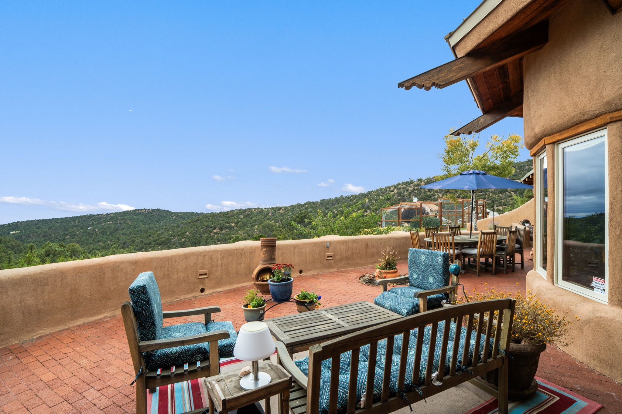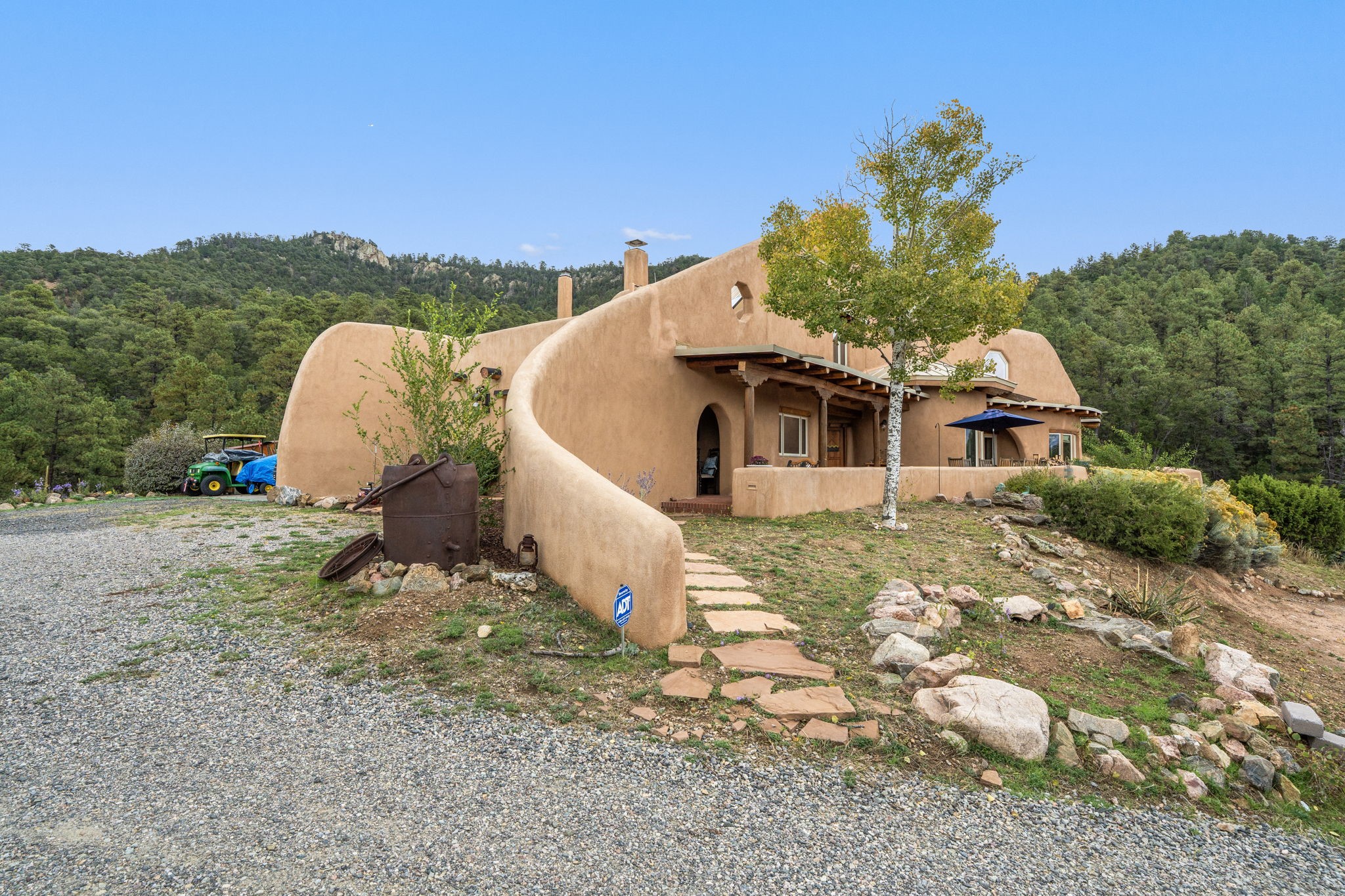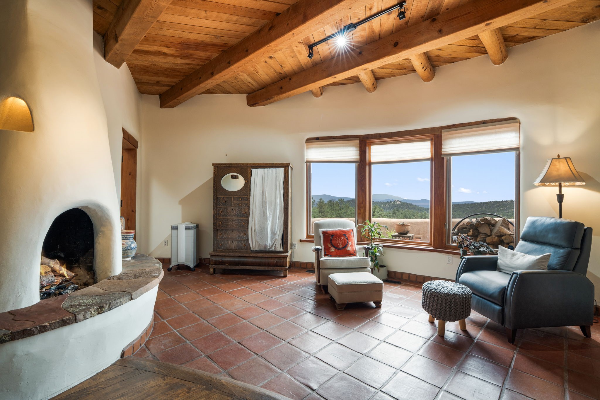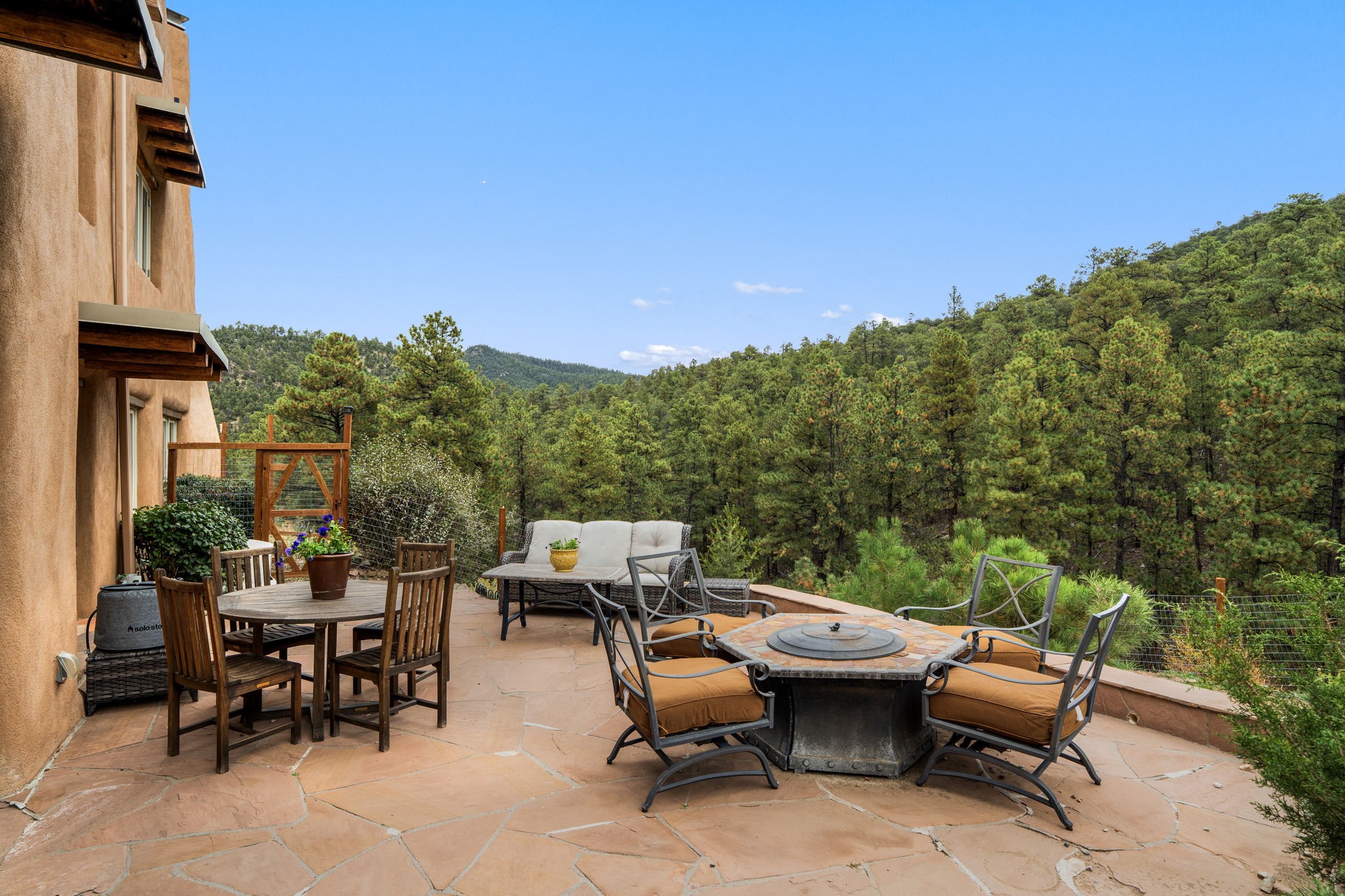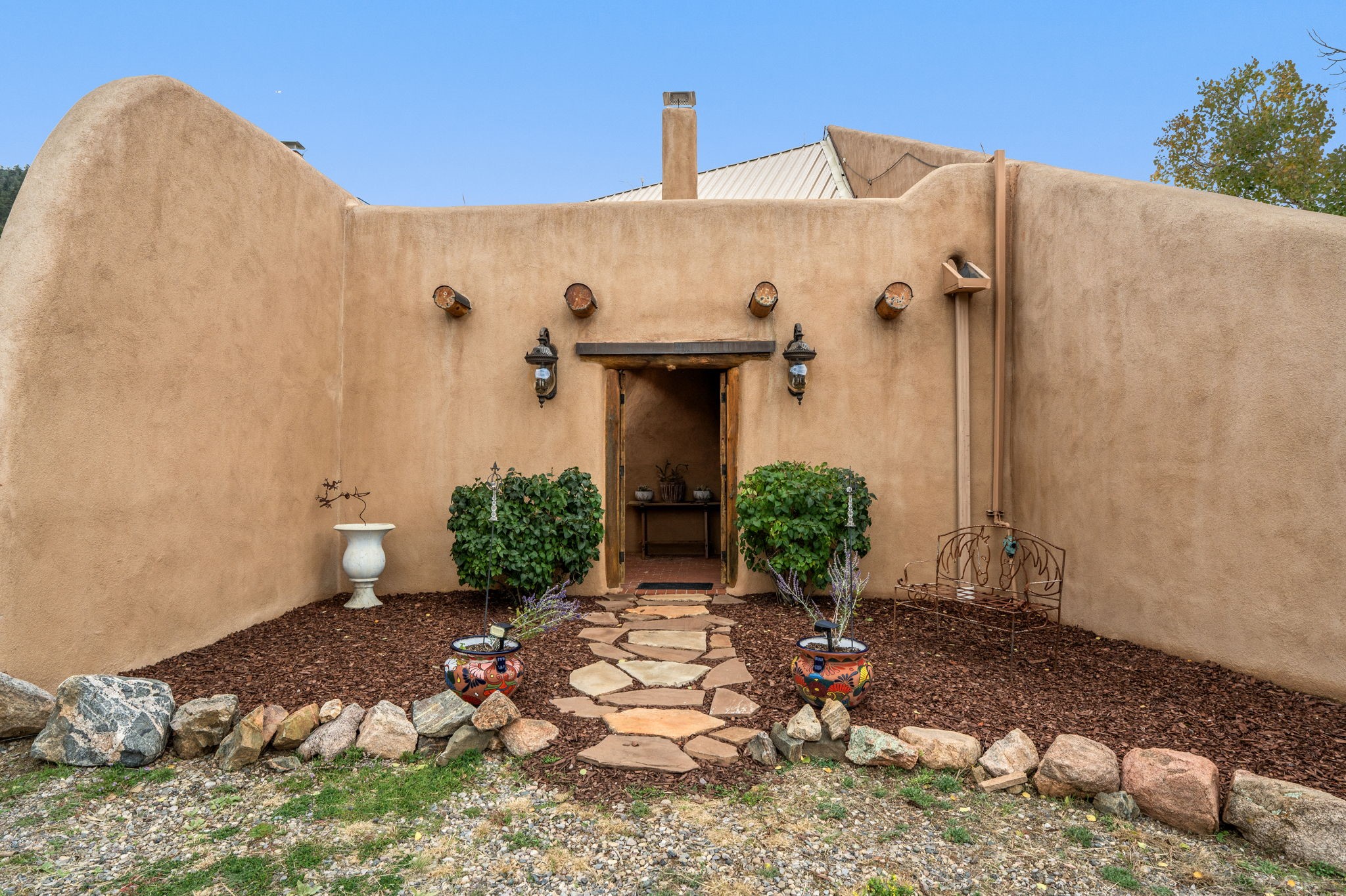 Nestled on 78 pristine private acres spread across four deeded lots, this extraordinary estate offers a blend of seclusion, artistry and timeless Southwestern charm just 25 minutes from downtown Santa Fe.The 4,400 square foot adobe home is a masterpiece of craftsmanship and comfort. Solid adobe construction provides natural insulation that keeps interiors warm in winter and cool in summer. Inside, four ensuite bedrooms and 4.5 baths offer comfort and privacy while 30 hand carved doors and accents from Seret and Sons lend a one of a kind artistic touch throughout the home.The great room is the heart of this residence anchored by a dramatic stone fireplace, high viga ceilings and a custom antler chandelier that adds rustic elegance. French doors open to a spacious front portal framing sweeping views of the Sangre de Cristo Mountains.A graceful circular staircase leads to the upper level where two ensuite bedrooms and a balcony overlooking the great room create an inviting sense of openness and connection. The kitchen is both functional and charming with granite counters, abundant cabinetry and a cozy breakfast nook warmed by its own fireplace. Saltillo tile floors flow throughout the main level while hardwood floors add warmth upstairs.The primary suite is a private retreat with panoramic mountain views and a luxurious bath with a jetted tub, tiled shower and granite counters.Step outside to a fenced backyard and patio perfect for watching the weather in the distance, peaceful wildlife and star filled nights. Additional features include solar hot water, four fireplaces, a two car garage, two sheds and a chicken coop with eight hens that provide fresh eggs daily.This property is more than a home. It is a work of art set deep in nature offering tranquility, authenticity and soul. Experience a place where art, architecture and landscape come together in harmony.