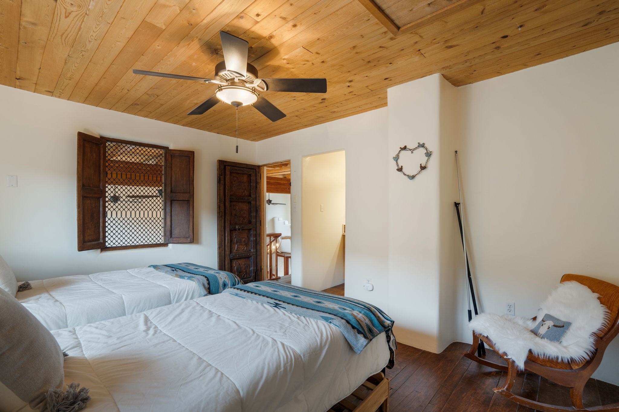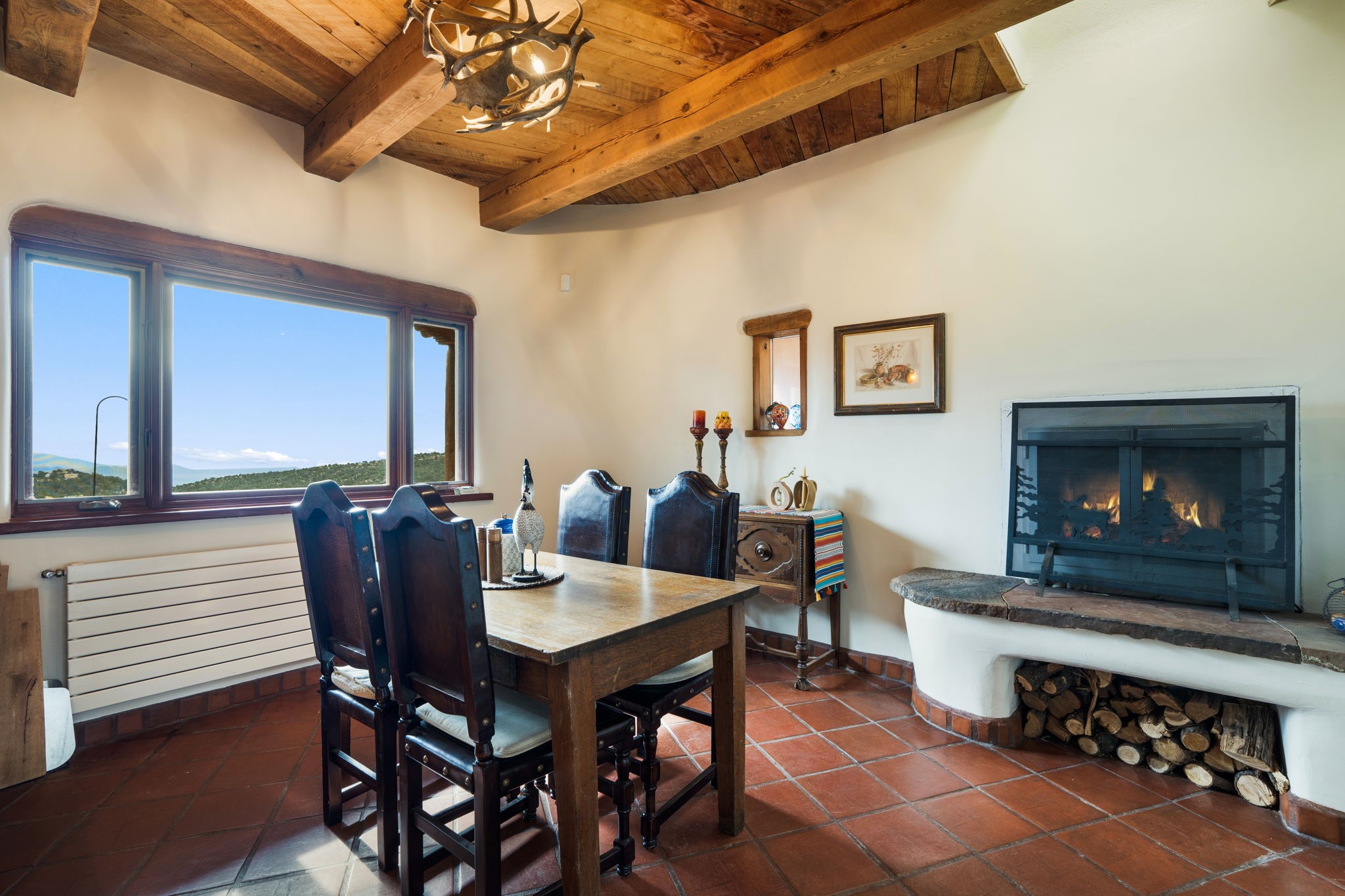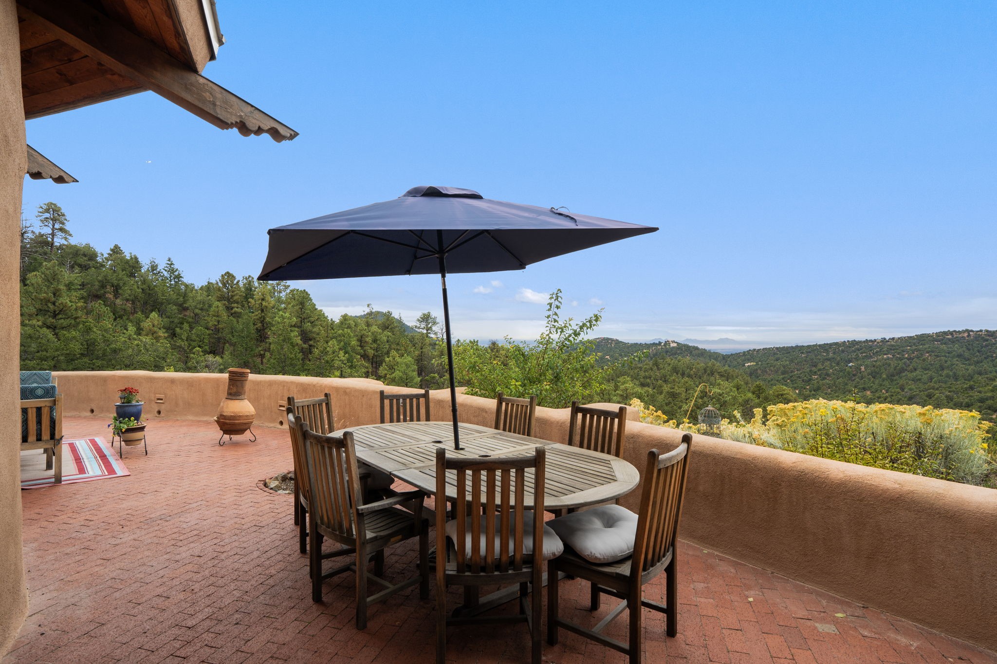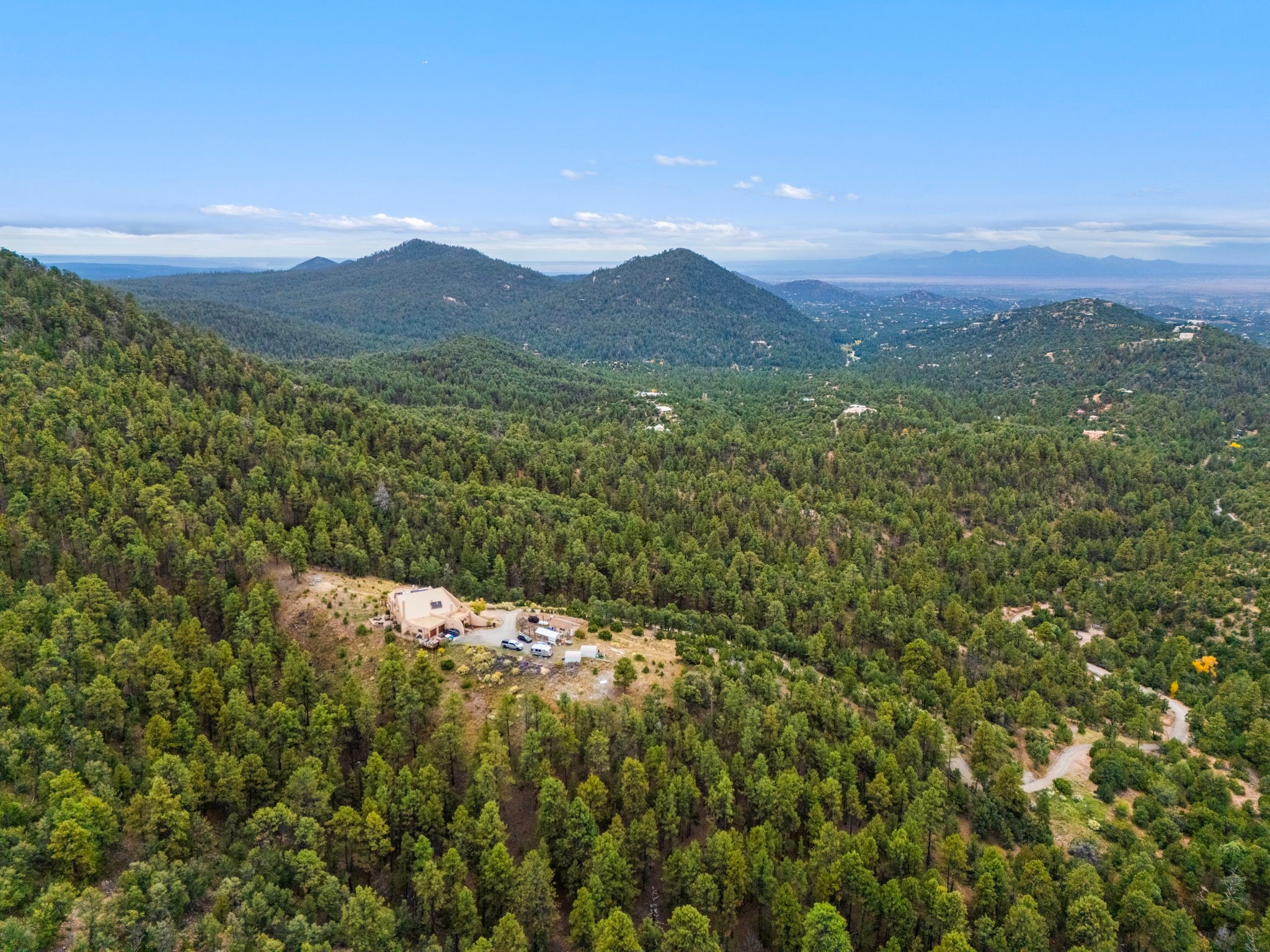 Nestled on 78 pristine private acres spread across four deeded lots, this extraordinary estate offers a blend of seclusion, artistry and timeless Southwestern charm just 25 minutes from downtown Santa Fe.The 4,400 square foot adobe home is a masterpiece of craftsmanship and comfort. Solid adobe construction provides natural insulation that keeps interiors warm in winter and cool in summer. Inside, four ensuite bedrooms and 4.5 baths offer comfort and privacy while 30 hand carved doors and accents from Seret and Sons lend a one of a kind artistic touch throughout the home.The great room is the heart of this residence anchored by a dramatic stone fireplace, high viga ceilings and a custom antler chandelier that adds rustic elegance. French doors open to a spacious front portal framing sweeping views of the Sangre de Cristo Mountains.A graceful circular staircase leads to the upper level where two ensuite bedrooms and a balcony overlooking the great room create an inviting sense of openness and connection. The kitchen is both functional and charming with granite counters, abundant cabinetry and a cozy breakfast nook warmed by its own fireplace. Saltillo tile floors flow throughout the main level while hardwood floors add warmth upstairs.The primary suite is a private retreat with panoramic mountain views and a luxurious bath with a jetted tub, tiled shower and granite counters.Step outside to a fenced backyard and patio perfect for watching the weather in the distance, peaceful wildlife and star filled nights. Additional features include solar hot water, four fireplaces, a two car garage, two sheds and a chicken coop with eight hens that provide fresh eggs daily.This property is more than a home. It is a work of art set deep in nature offering tranquility, authenticity and soul. Experience a place where art, architecture and landscape come together in harmony.