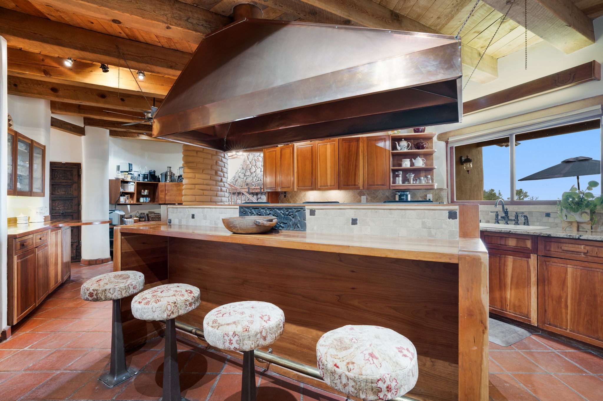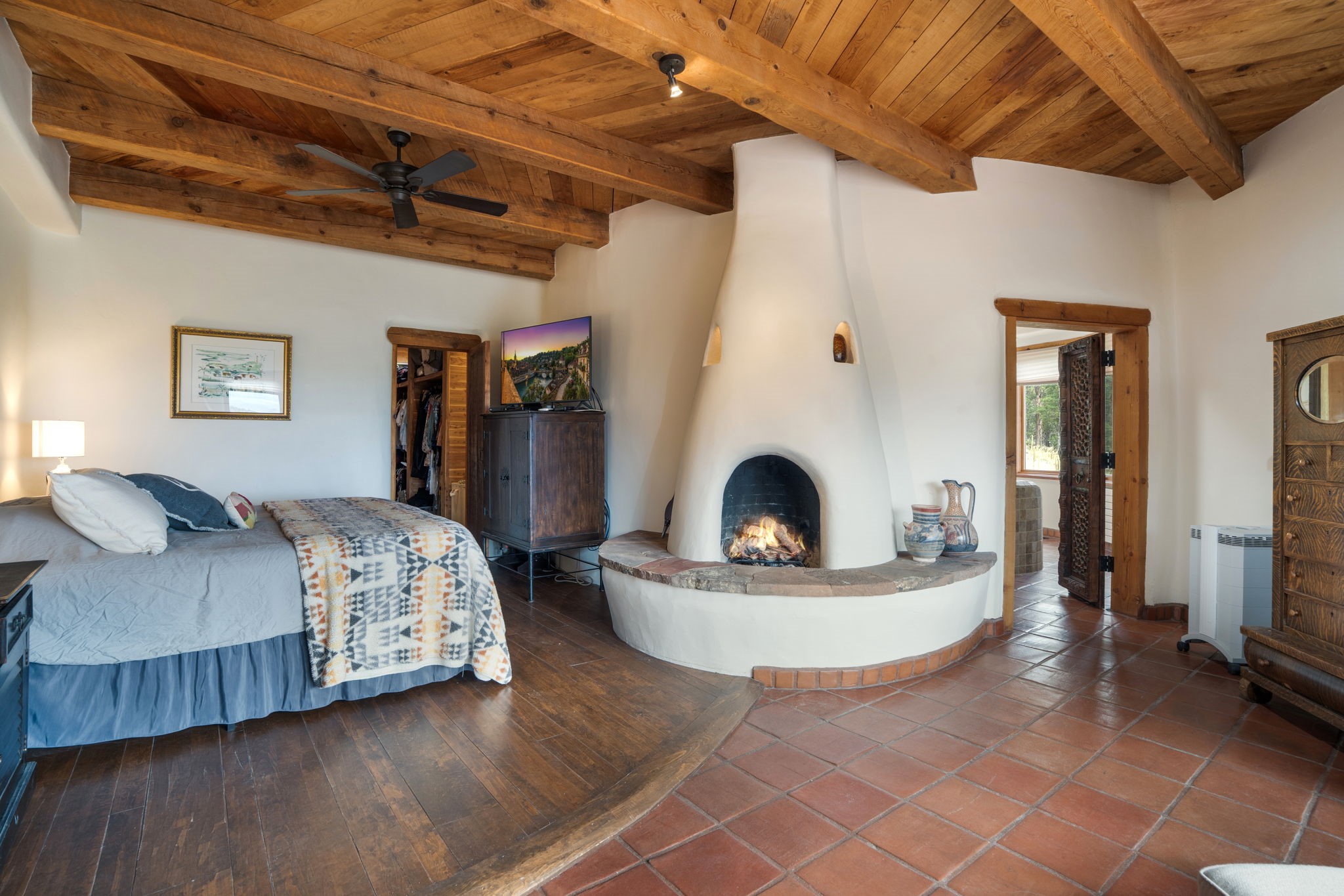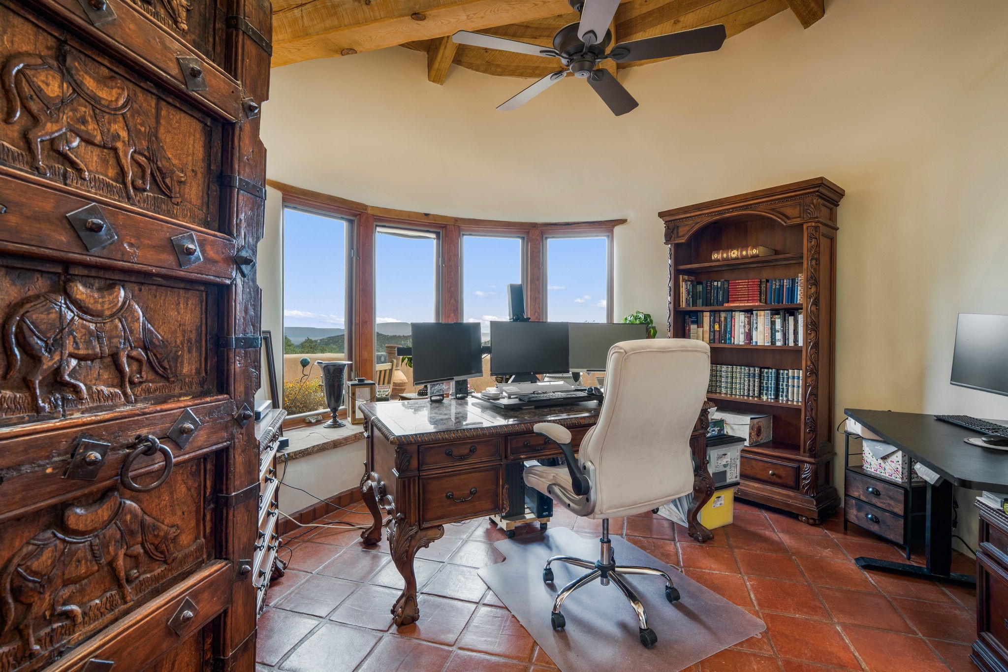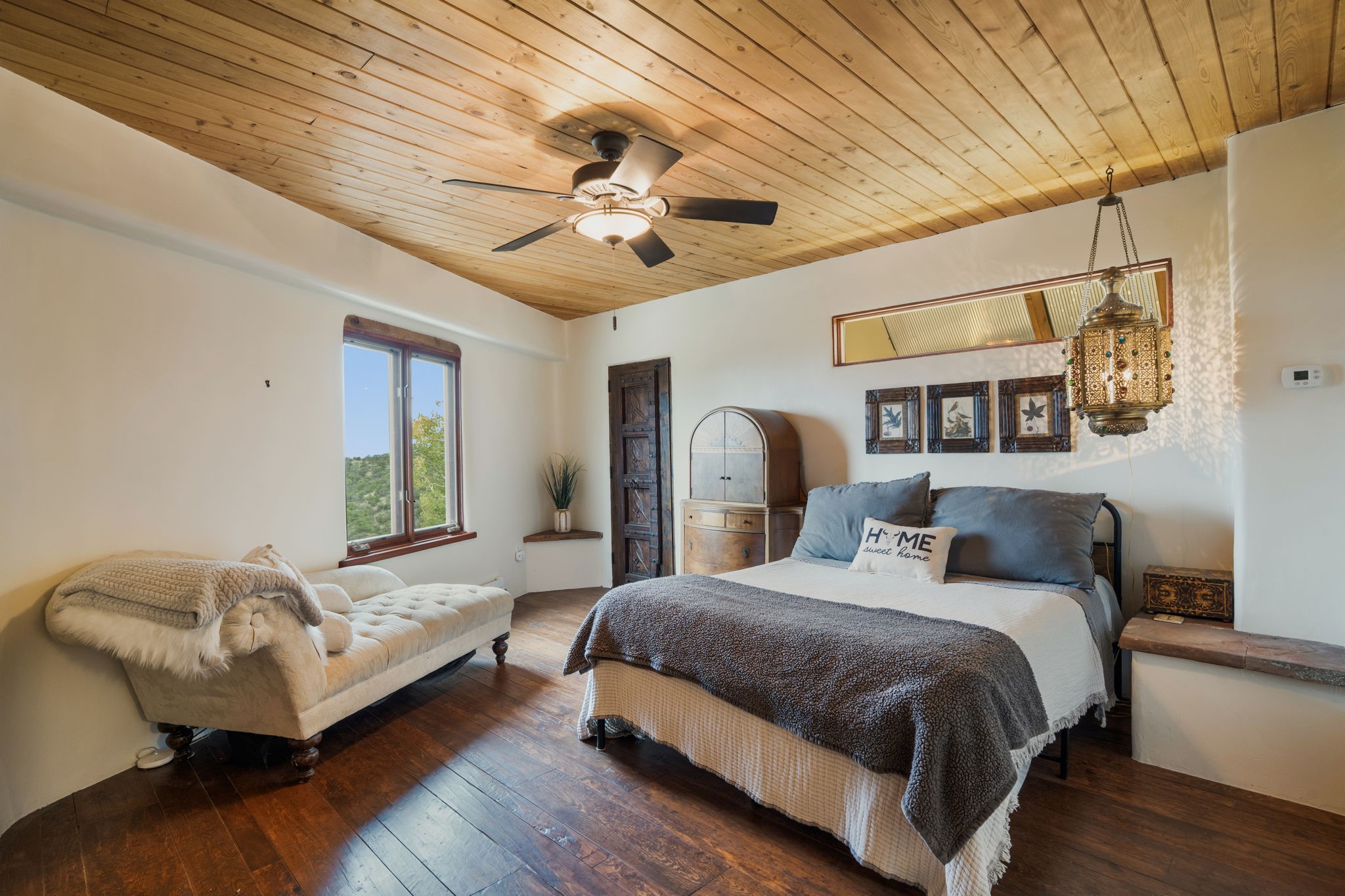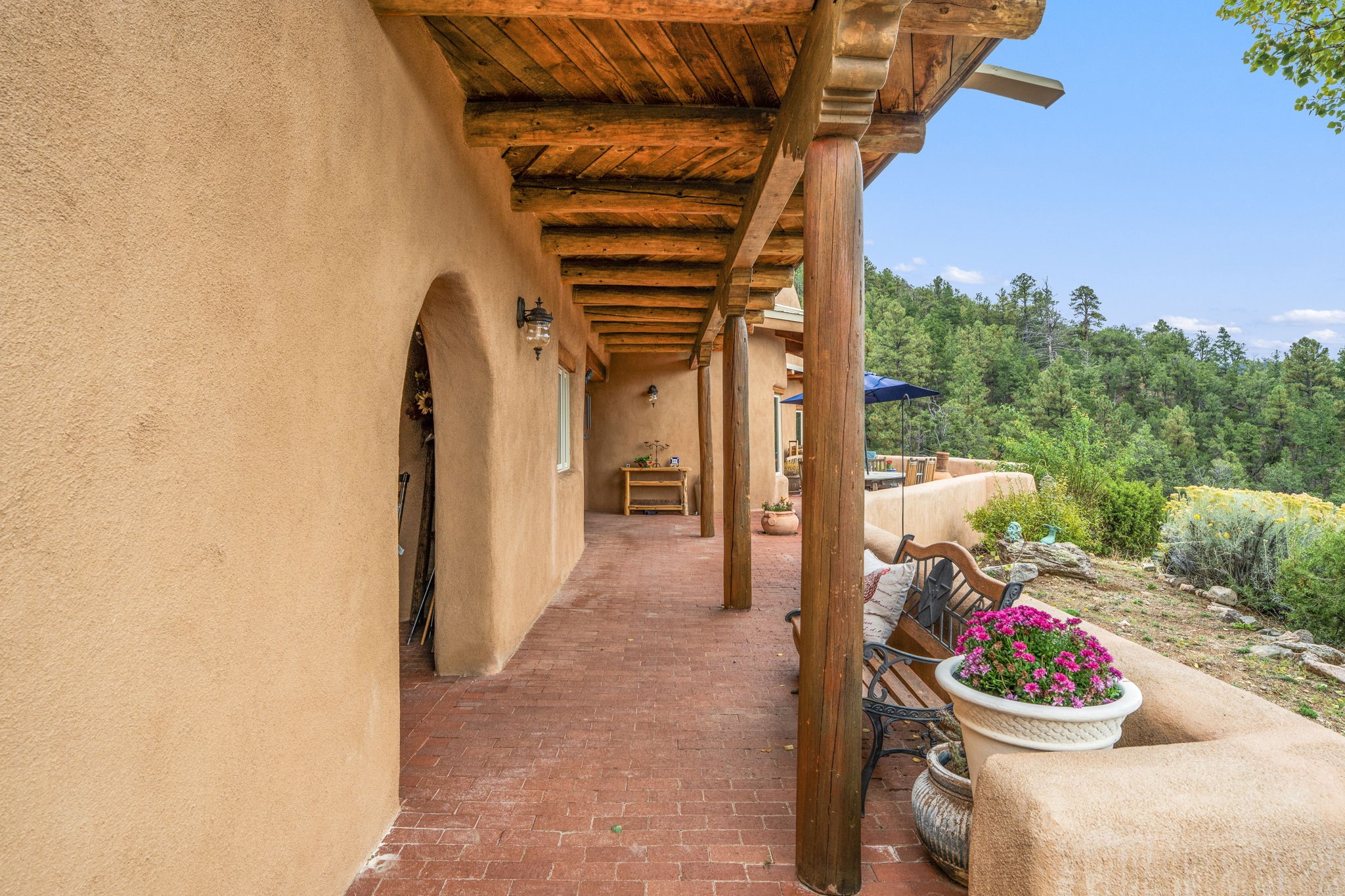 Nestled on 78 pristine private acres spread across four deeded lots, this extraordinary estate offers a blend of seclusion, artistry and timeless Southwestern charm just 25 minutes from downtown Santa Fe.The 4,400 square foot adobe home is a masterpiece of craftsmanship and comfort. Solid adobe construction provides natural insulation that keeps interiors warm in winter and cool in summer. Inside, four ensuite bedrooms and 4.5 baths offer comfort and privacy while 30 hand carved doors and accents from Seret and Sons lend a one of a kind artistic touch throughout the home.The great room is the heart of this residence anchored by a dramatic stone fireplace, high viga ceilings and a custom antler chandelier that adds rustic elegance. French doors open to a spacious front portal framing sweeping views of the Sangre de Cristo Mountains.A graceful circular staircase leads to the upper level where two ensuite bedrooms and a balcony overlooking the great room create an inviting sense of openness and connection. The kitchen is both functional and charming with granite counters, abundant cabinetry and a cozy breakfast nook warmed by its own fireplace. Saltillo tile floors flow throughout the main level while hardwood floors add warmth upstairs.The primary suite is a private retreat with panoramic mountain views and a luxurious bath with a jetted tub, tiled shower and granite counters.Step outside to a fenced backyard and patio perfect for watching the weather in the distance, peaceful wildlife and star filled nights. Additional features include solar hot water, four fireplaces, a two car garage, two sheds and a chicken coop with eight hens that provide fresh eggs daily.This property is more than a home. It is a work of art set deep in nature offering tranquility, authenticity and soul. Experience a place where art, architecture and landscape come together in harmony.