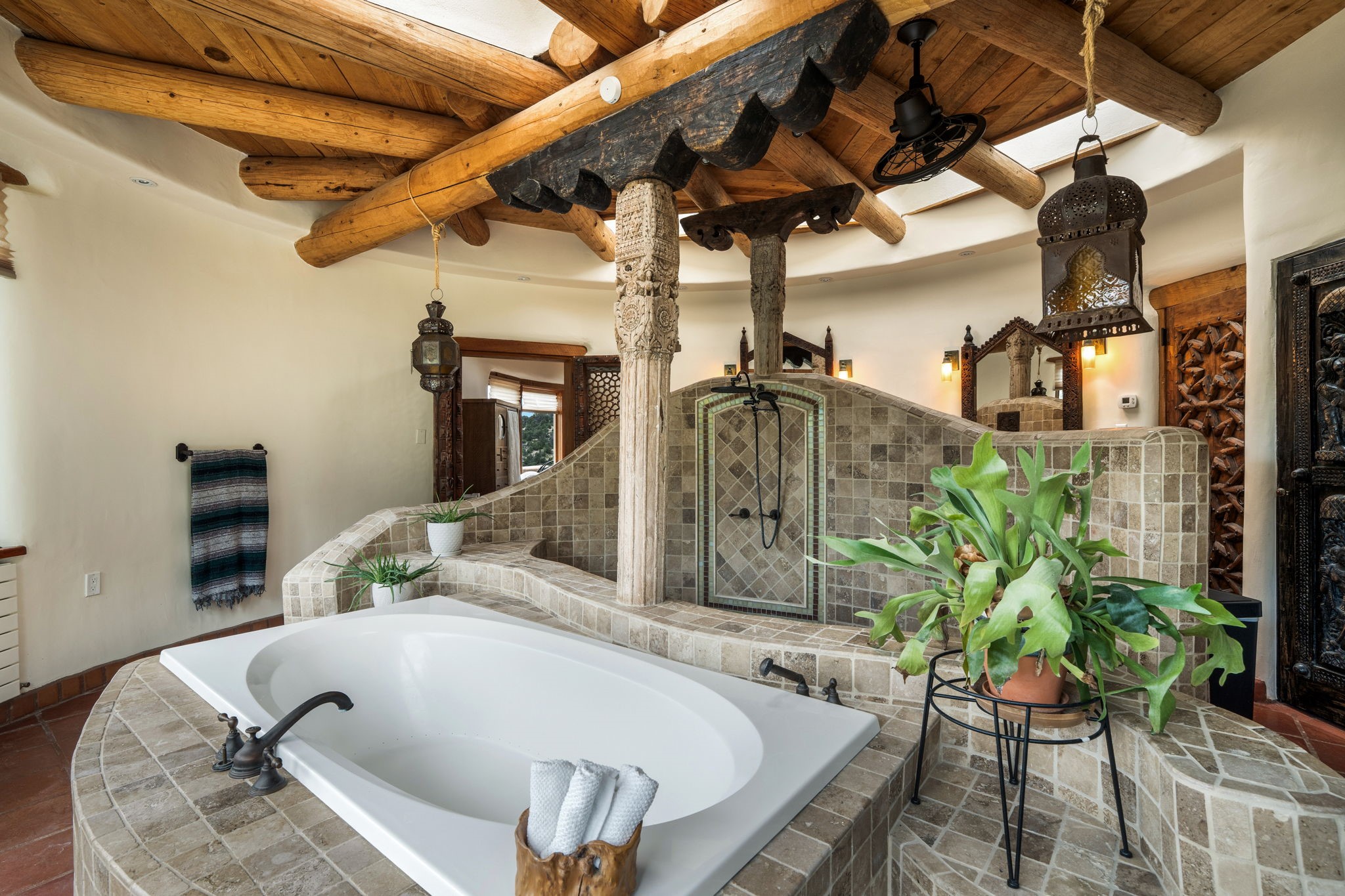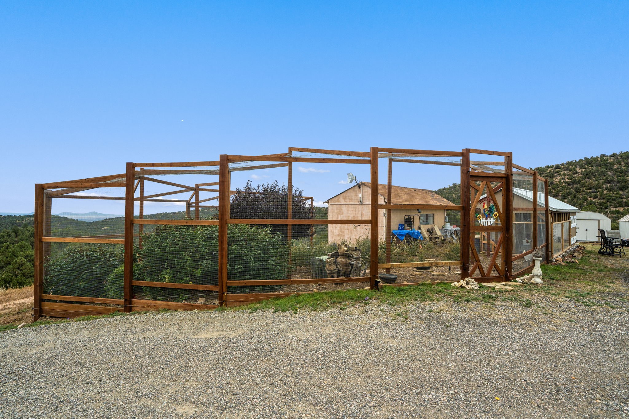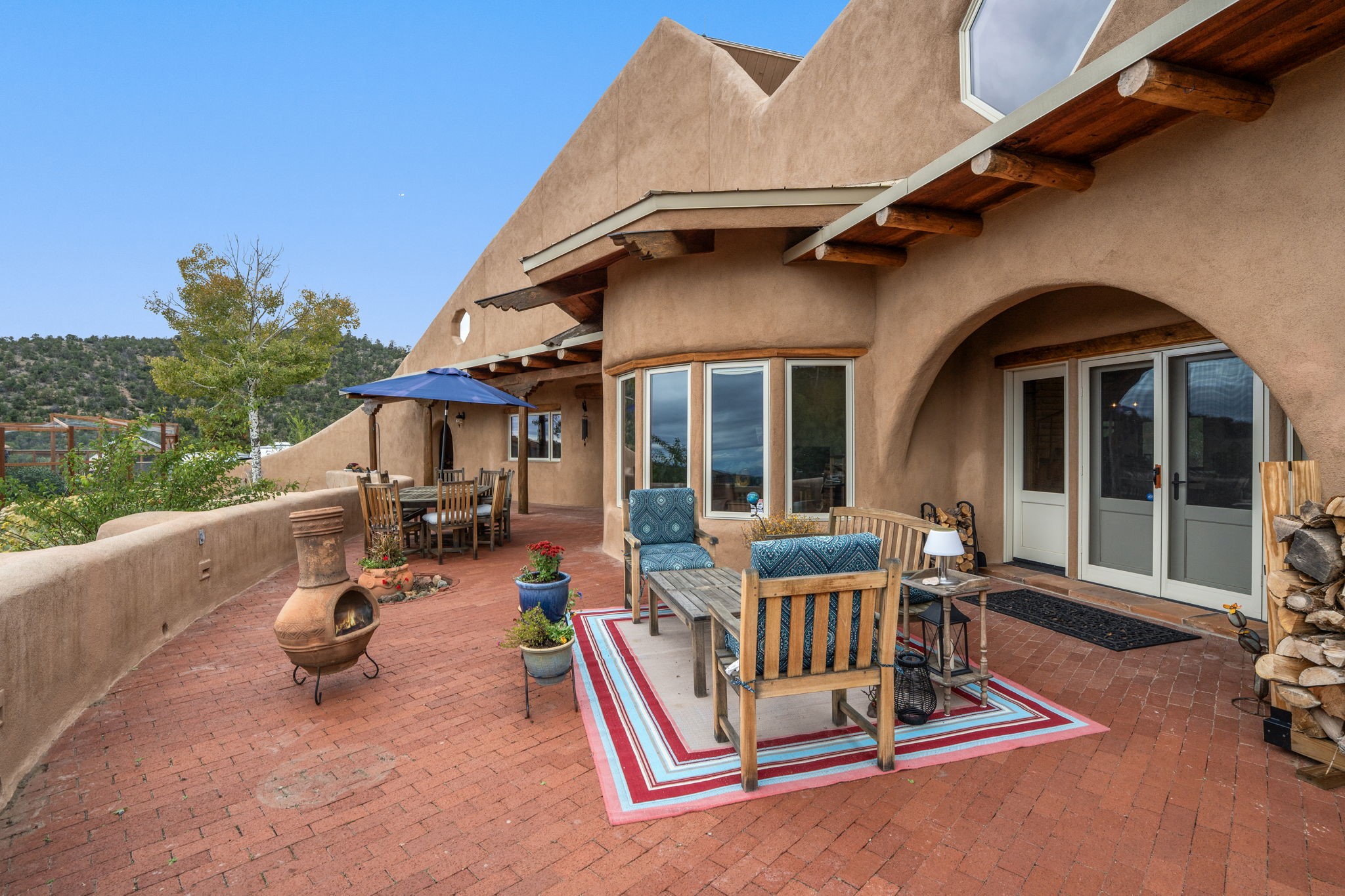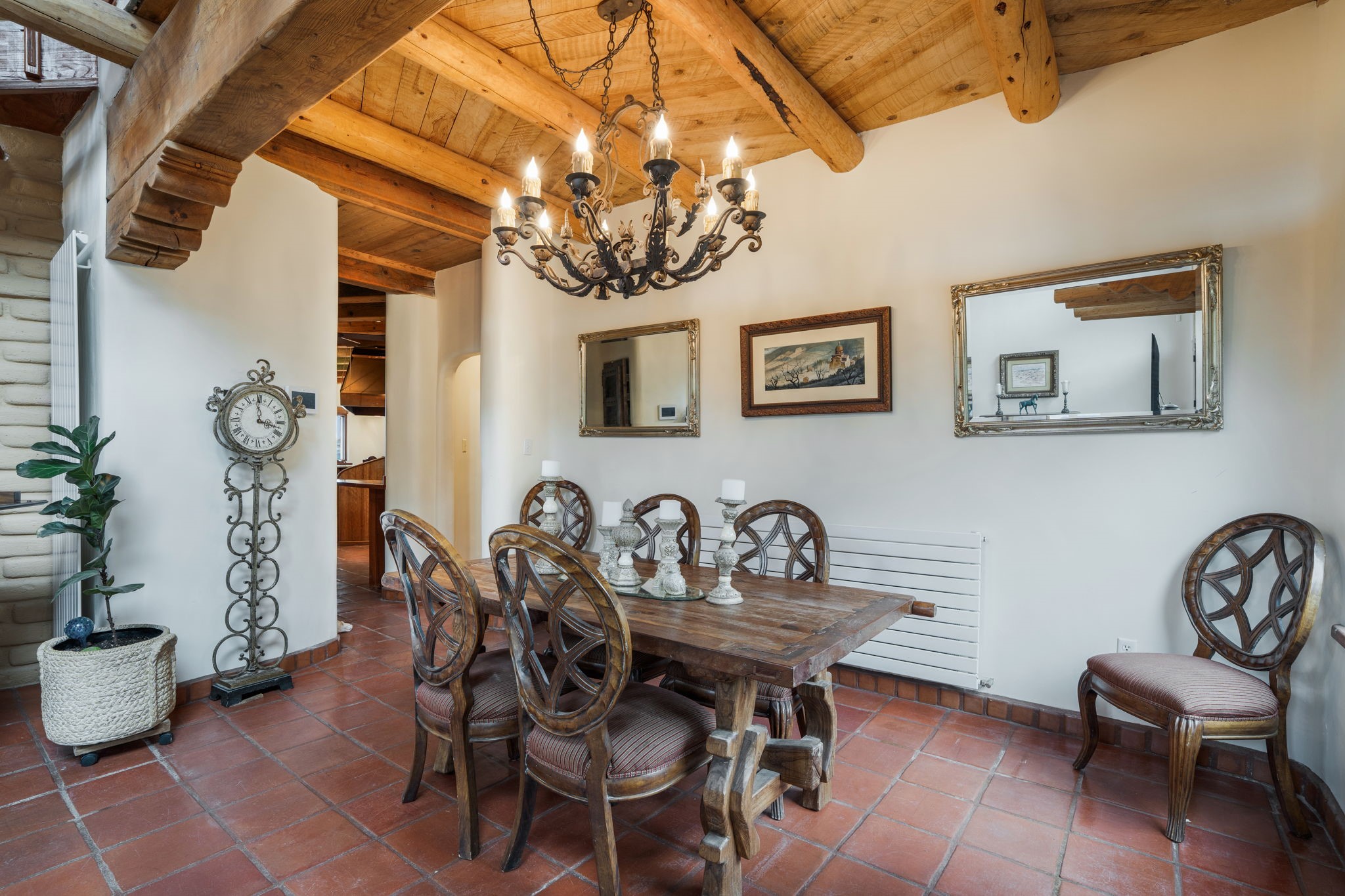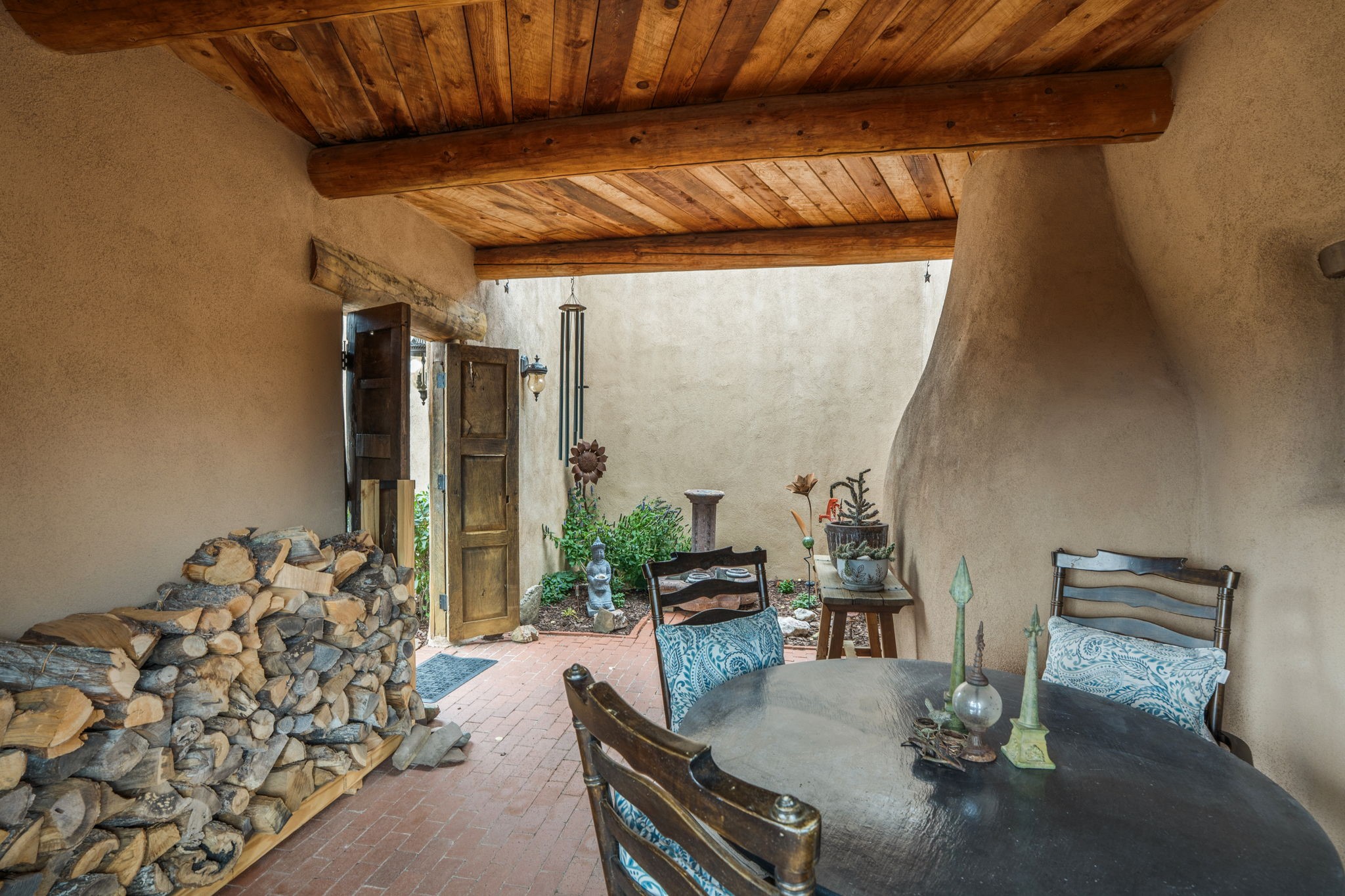 Nestled on 78 pristine private acres spread across four deeded lots, this extraordinary estate offers a blend of seclusion, artistry and timeless Southwestern charm just 25 minutes from downtown Santa Fe.The 4,400 square foot adobe home is a masterpiece of craftsmanship and comfort. Solid adobe construction provides natural insulation that keeps interiors warm in winter and cool in summer. Inside, four ensuite bedrooms and 4.5 baths offer comfort and privacy while 30 hand carved doors and accents from Seret and Sons lend a one of a kind artistic touch throughout the home.The great room is the heart of this residence anchored by a dramatic stone fireplace, high viga ceilings and a custom antler chandelier that adds rustic elegance. French doors open to a spacious front portal framing sweeping views of the Sangre de Cristo Mountains.A graceful circular staircase leads to the upper level where two ensuite bedrooms and a balcony overlooking the great room create an inviting sense of openness and connection. The kitchen is both functional and charming with granite counters, abundant cabinetry and a cozy breakfast nook warmed by its own fireplace. Saltillo tile floors flow throughout the main level while hardwood floors add warmth upstairs.The primary suite is a private retreat with panoramic mountain views and a luxurious bath with a jetted tub, tiled shower and granite counters.Step outside to a fenced backyard and patio perfect for watching the weather in the distance, peaceful wildlife and star filled nights. Additional features include solar hot water, four fireplaces, a two car garage, two sheds and a chicken coop with eight hens that provide fresh eggs daily.This property is more than a home. It is a work of art set deep in nature offering tranquility, authenticity and soul. Experience a place where art, architecture and landscape come together in harmony.