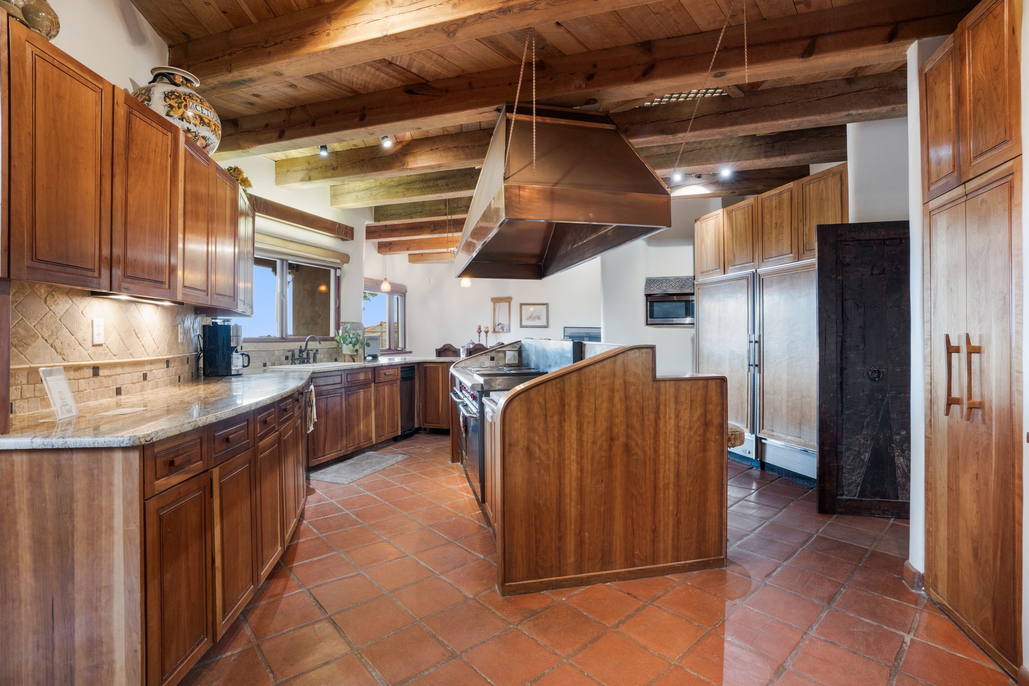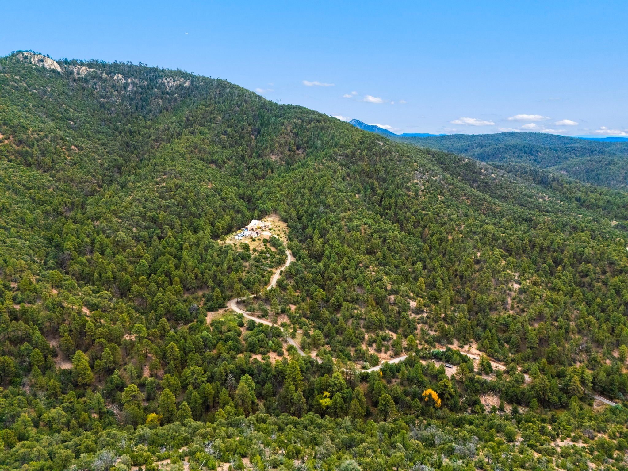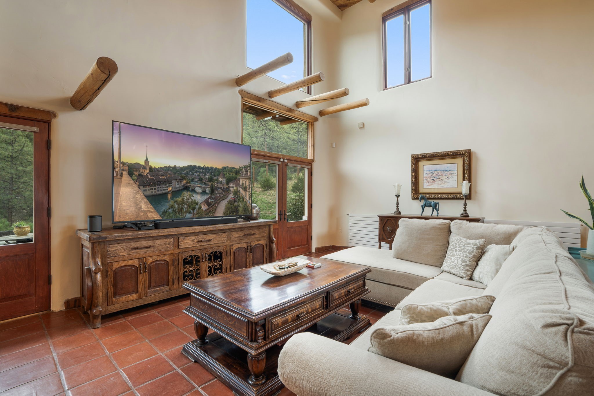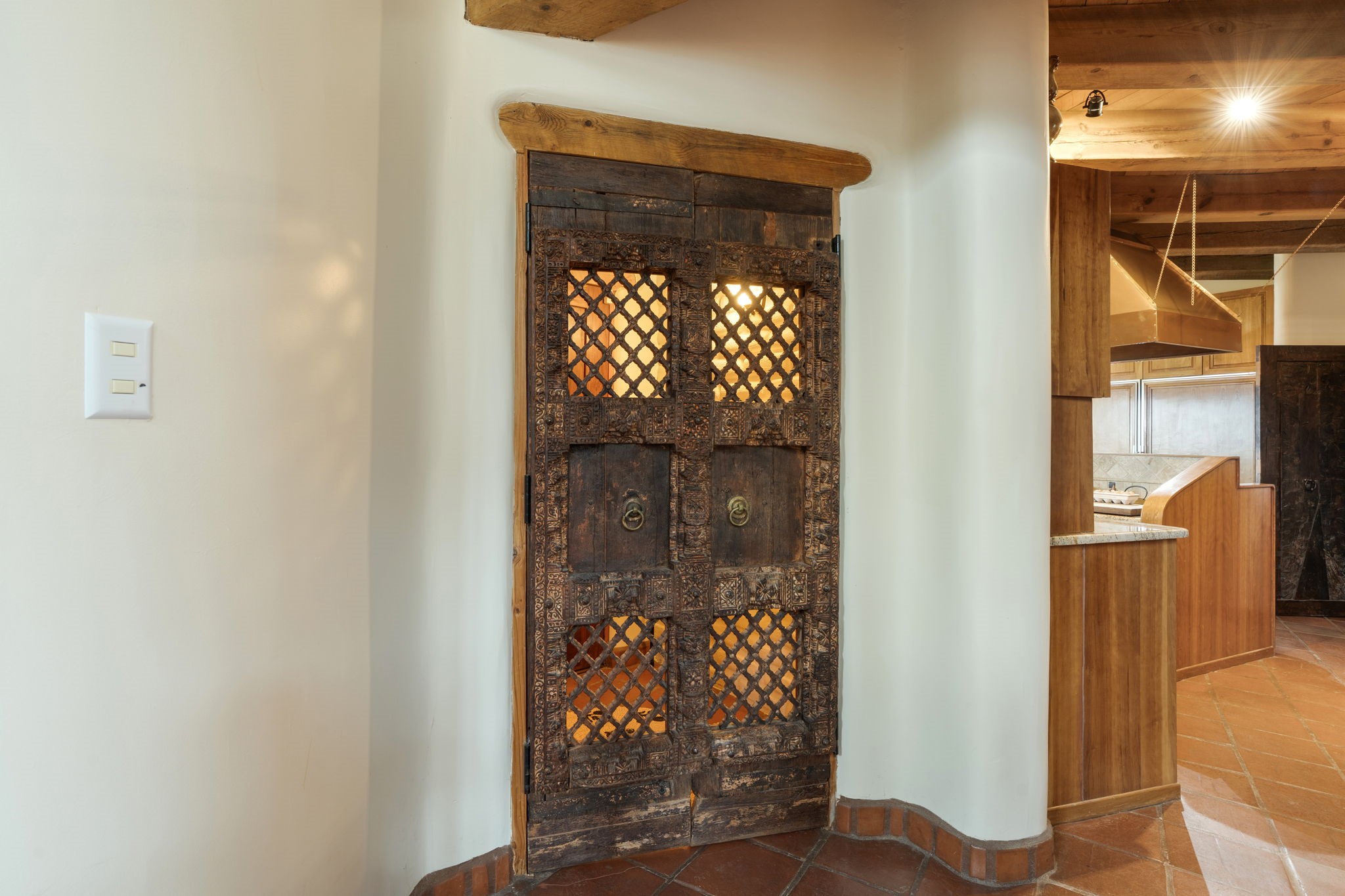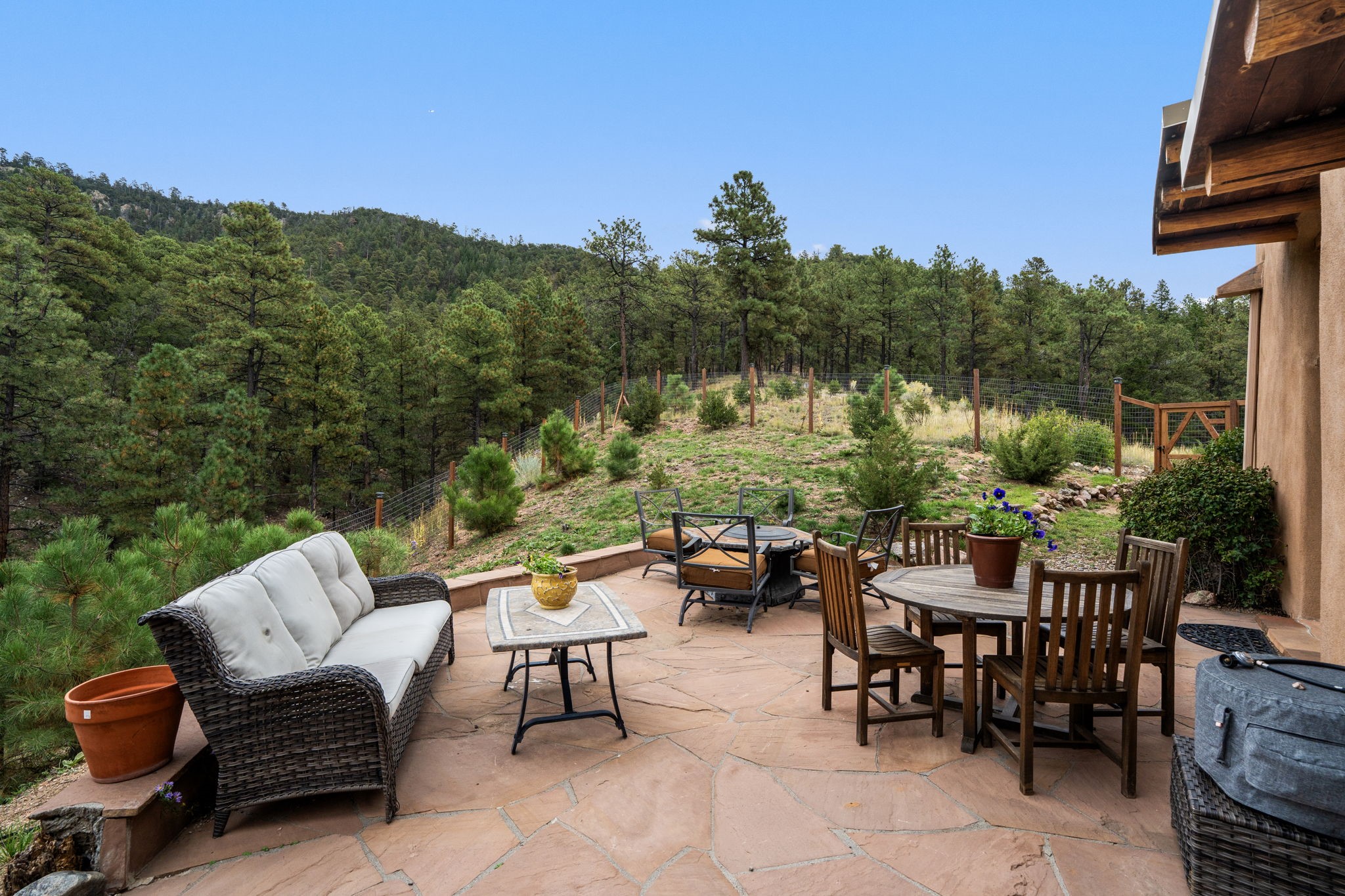 Nestled on 78 pristine private acres spread across four deeded lots, this extraordinary estate offers a blend of seclusion, artistry and timeless Southwestern charm just 25 minutes from downtown Santa Fe.The 4,400 square foot adobe home is a masterpiece of craftsmanship and comfort. Solid adobe construction provides natural insulation that keeps interiors warm in winter and cool in summer. Inside, four ensuite bedrooms and 4.5 baths offer comfort and privacy while 30 hand carved doors and accents from Seret and Sons lend a one of a kind artistic touch throughout the home.The great room is the heart of this residence anchored by a dramatic stone fireplace, high viga ceilings and a custom antler chandelier that adds rustic elegance. French doors open to a spacious front portal framing sweeping views of the Sangre de Cristo Mountains.A graceful circular staircase leads to the upper level where two ensuite bedrooms and a balcony overlooking the great room create an inviting sense of openness and connection. The kitchen is both functional and charming with granite counters, abundant cabinetry and a cozy breakfast nook warmed by its own fireplace. Saltillo tile floors flow throughout the main level while hardwood floors add warmth upstairs.The primary suite is a private retreat with panoramic mountain views and a luxurious bath with a jetted tub, tiled shower and granite counters.Step outside to a fenced backyard and patio perfect for watching the weather in the distance, peaceful wildlife and star filled nights. Additional features include solar hot water, four fireplaces, a two car garage, two sheds and a chicken coop with eight hens that provide fresh eggs daily.This property is more than a home. It is a work of art set deep in nature offering tranquility, authenticity and soul. Experience a place where art, architecture and landscape come together in harmony.