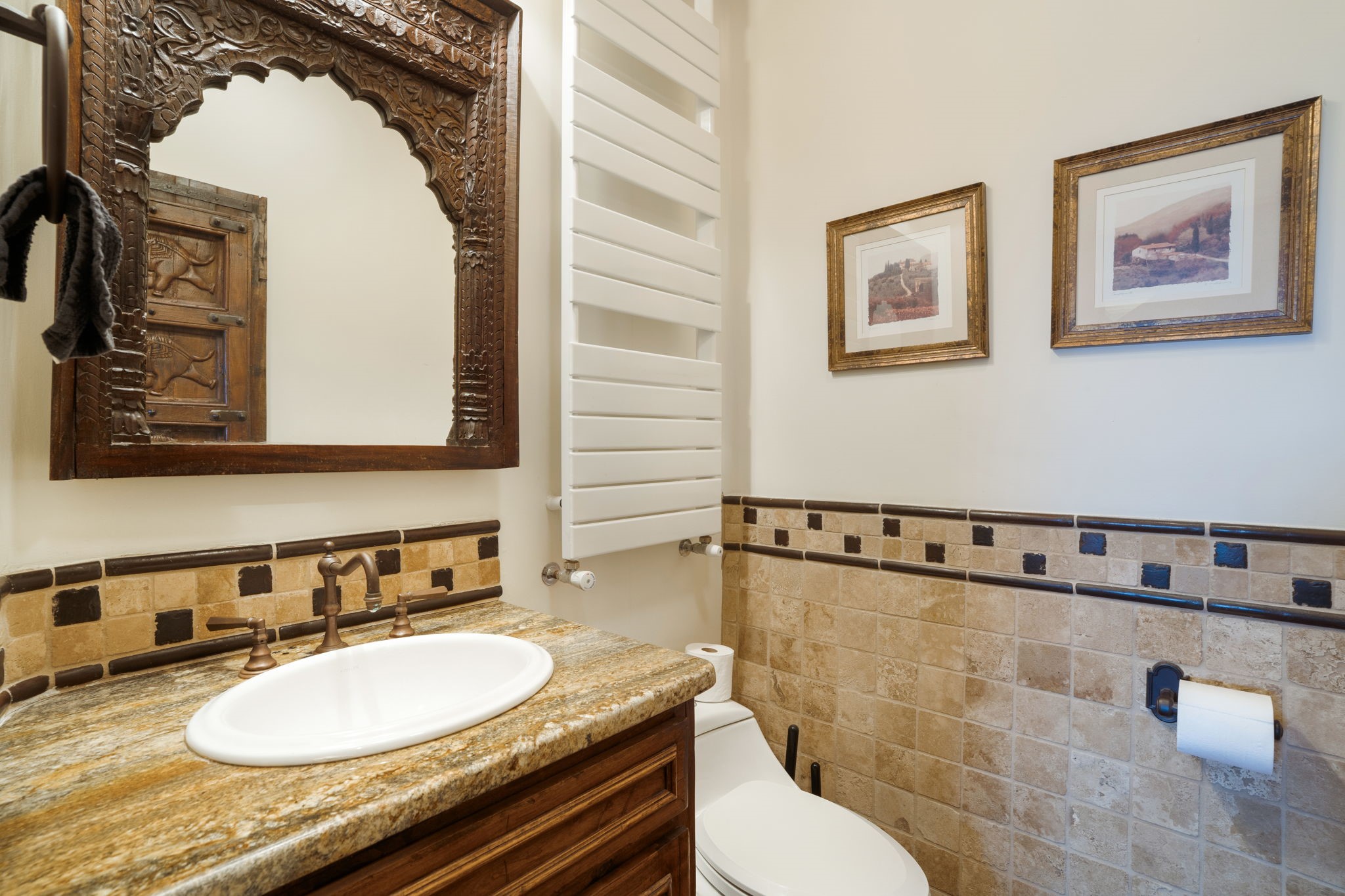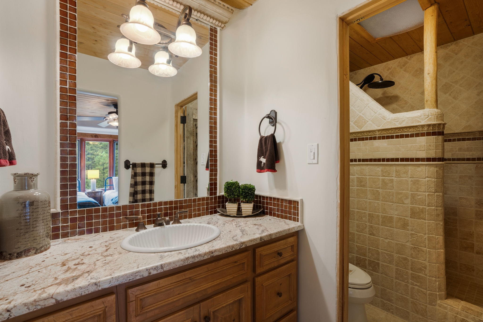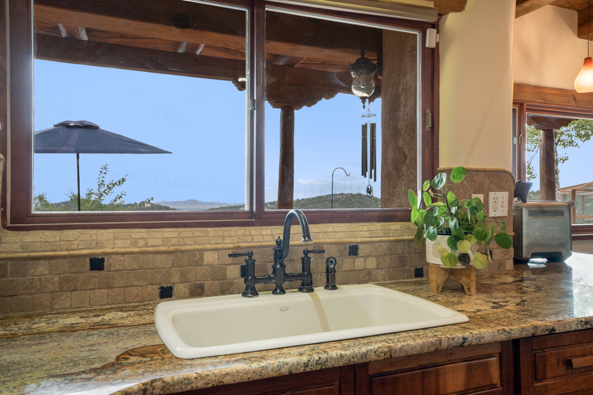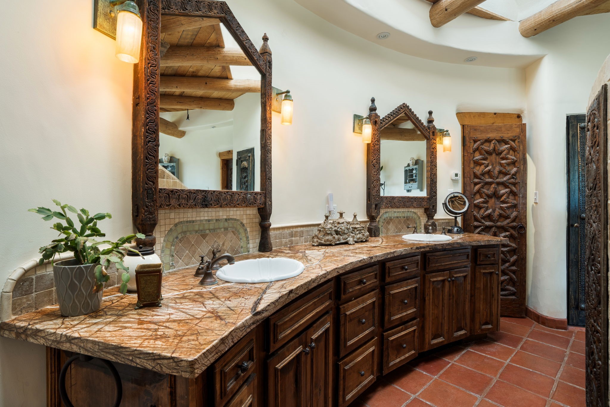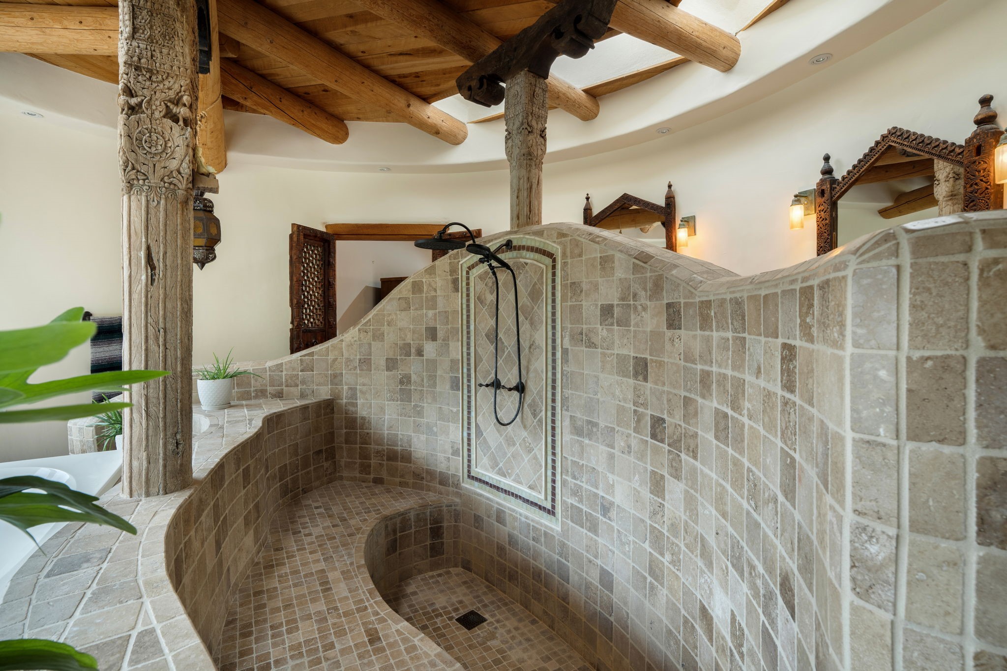 Nestled on 78 pristine private acres spread across four deeded lots, this extraordinary estate offers a blend of seclusion, artistry and timeless Southwestern charm just 25 minutes from downtown Santa Fe.The 4,400 square foot adobe home is a masterpiece of craftsmanship and comfort. Solid adobe construction provides natural insulation that keeps interiors warm in winter and cool in summer. Inside, four ensuite bedrooms and 4.5 baths offer comfort and privacy while 30 hand carved doors and accents from Seret and Sons lend a one of a kind artistic touch throughout the home.The great room is the heart of this residence anchored by a dramatic stone fireplace, high viga ceilings and a custom antler chandelier that adds rustic elegance. French doors open to a spacious front portal framing sweeping views of the Sangre de Cristo Mountains.A graceful circular staircase leads to the upper level where two ensuite bedrooms and a balcony overlooking the great room create an inviting sense of openness and connection. The kitchen is both functional and charming with granite counters, abundant cabinetry and a cozy breakfast nook warmed by its own fireplace. Saltillo tile floors flow throughout the main level while hardwood floors add warmth upstairs.The primary suite is a private retreat with panoramic mountain views and a luxurious bath with a jetted tub, tiled shower and granite counters.Step outside to a fenced backyard and patio perfect for watching the weather in the distance, peaceful wildlife and star filled nights. Additional features include solar hot water, four fireplaces, a two car garage, two sheds and a chicken coop with eight hens that provide fresh eggs daily.This property is more than a home. It is a work of art set deep in nature offering tranquility, authenticity and soul. Experience a place where art, architecture and landscape come together in harmony.