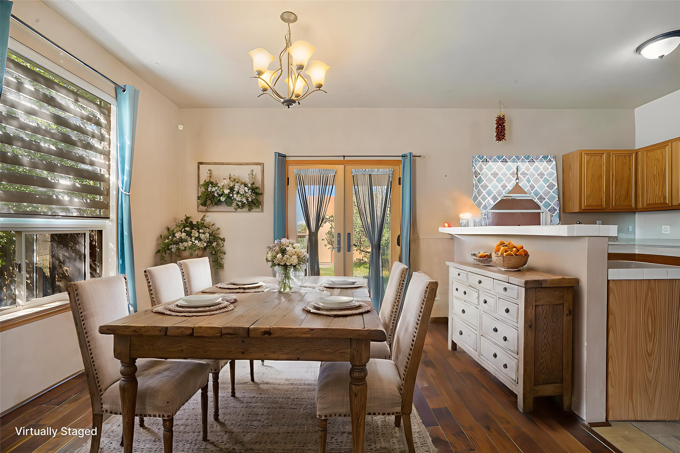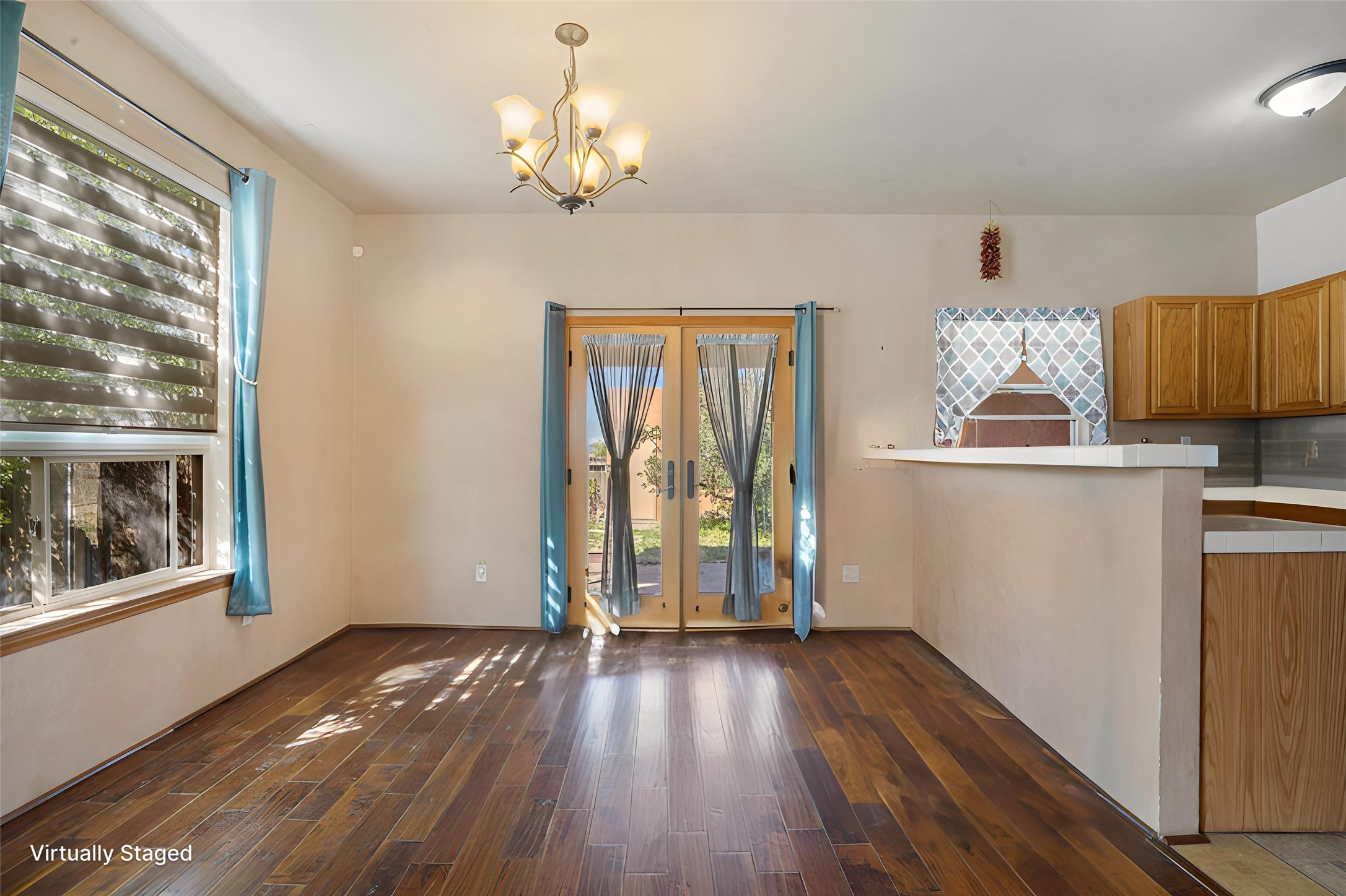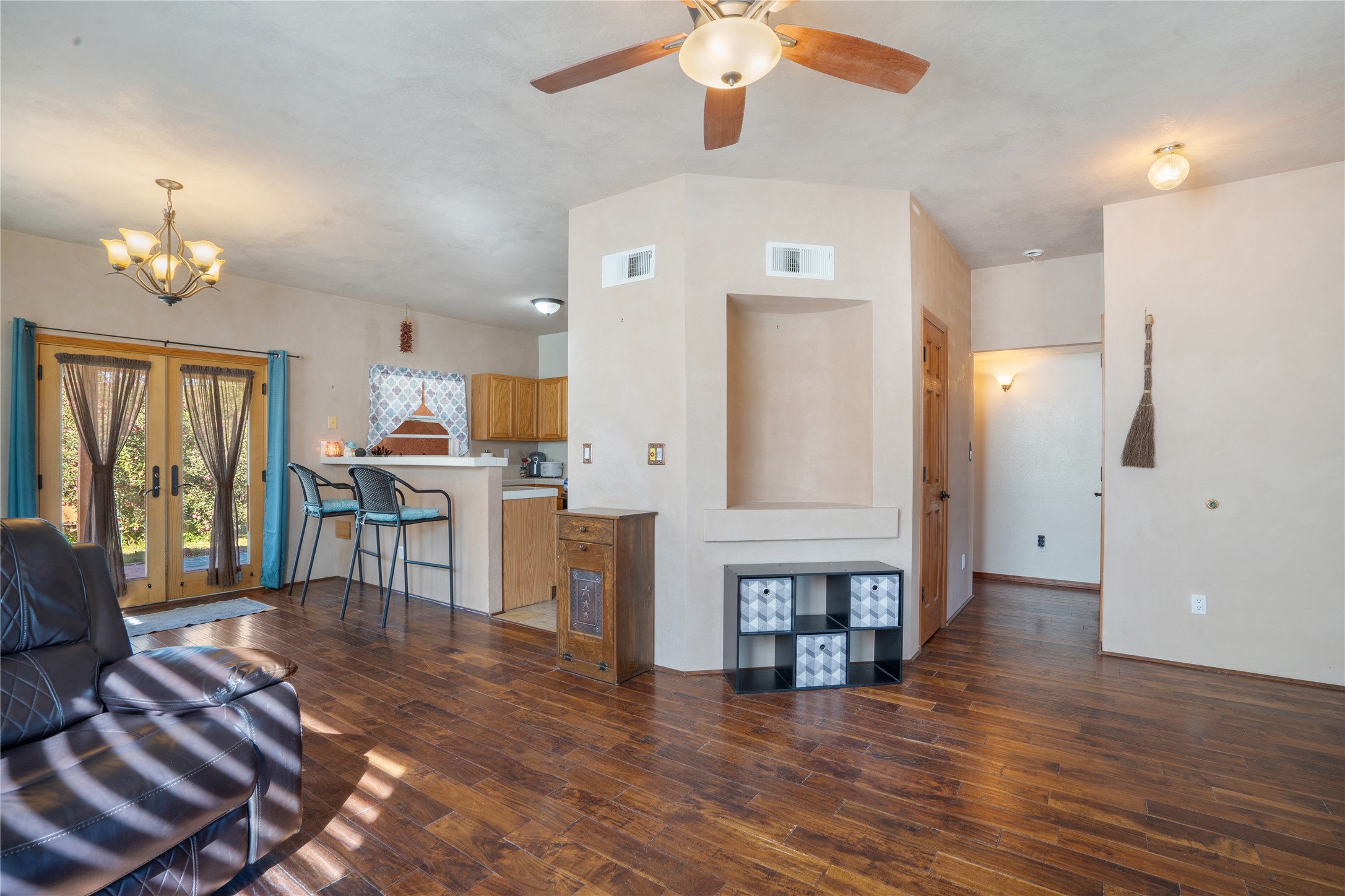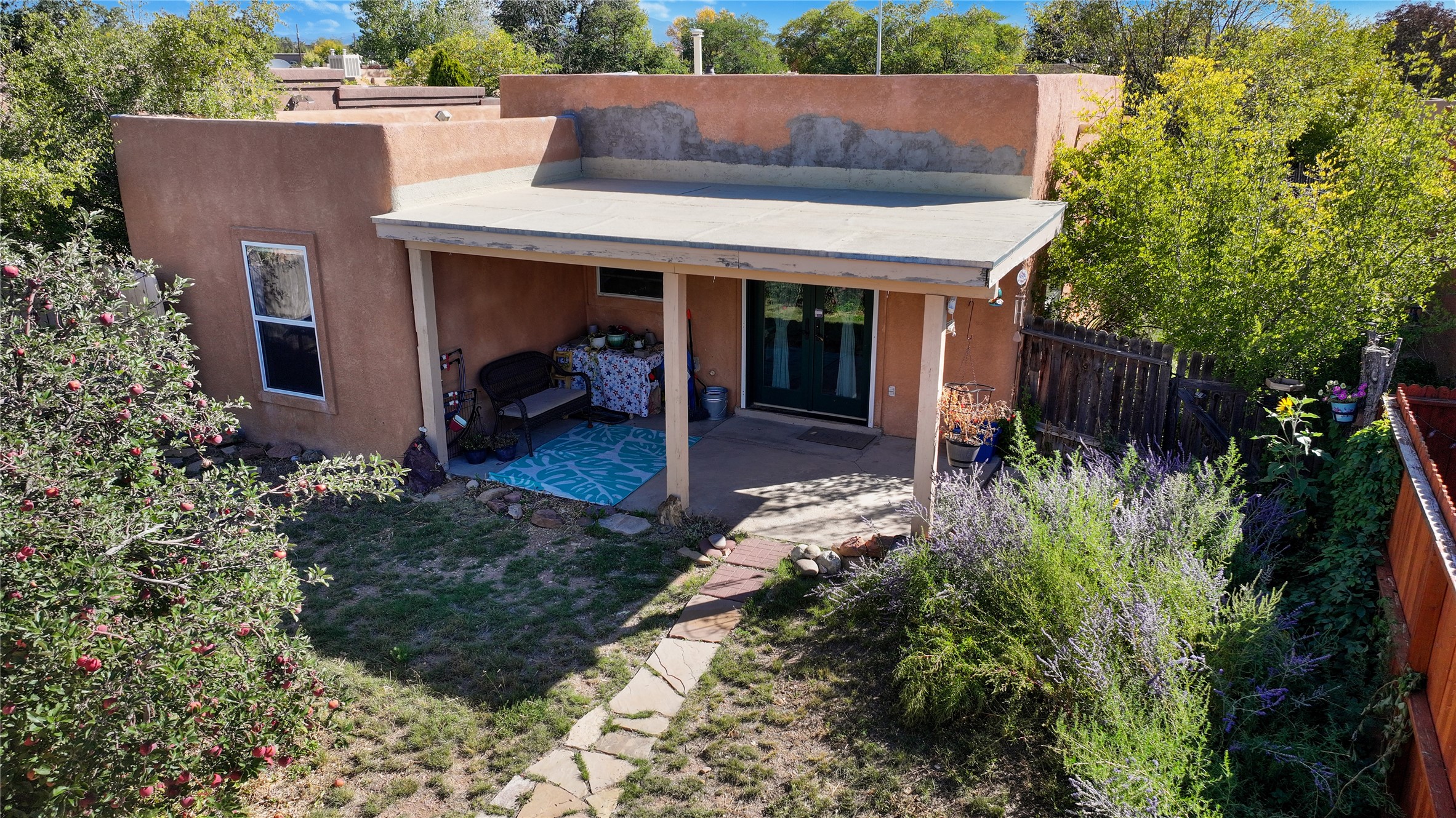 Charming 2-bedroom, 1-bath home with a 1-car garage and off-street parking. Comfortable, move-in ready living with tranquil outdoor spaces. A gated, fenced front yard with established, drip-irrigated plantings provides curb appeal and privacy. Inside, the living and dining areas flow into the kitchen, and an updated bathroom showcases clean, modern finishes. The fully enclosed backyard is a gardener's delight with bountiful apple trees and lush landscaping, plus a detached garage that could also serve as a gym or workshop. Ideally located with easy access to I-25 and NM-599 and near shopping, schools, popular restaurants, and Presbyterian Hospital. Schedule your showing today!