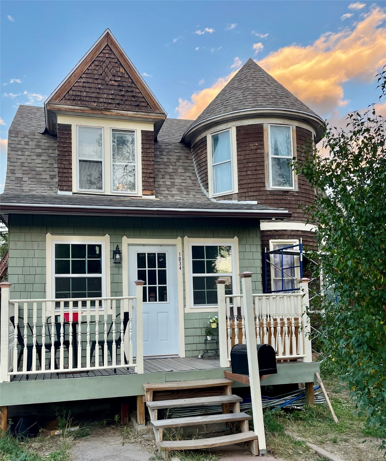 Charming and spacious home, with turret tower, cedar shingle siding, Juliet balcony, large pocket door, and 3 season enclosed porch, along with 2 bedroom rental unit make this the ideal in town home. Main home sits on 4 city lots and has 4 bedrooms, 2 bathrooms, living room, dining room, kitchen, foyer, large laundry/craft room, enclosed front porch, outside front and back porches, and basement. Updates: 2 new furnaces with central air and separate zone control, new dimensional shingle roof, new insulation and drywall, updated bathrooms but one still has original clawfoot tub!, new plumbing, new tile, all new appliances, updated electric with 200 amp service, new carpet in 2 bedrooms, new front porch, new 30 amp RV hookup. The backyard is fenced with raised garden beds, chicken coop, detached garage with alley access, patio areas and porches, grape covered trellis, and many mature trees and perennials including apple and cherry trees. The rental unit has separate meters and it's own laundry room, as well as new covered front porch, and back porch and balcony. All of this and walking distance to New Mexico Highlands University, shops, and grocery store, as well as the historic Las Vegas New Mexico Plaza make this home so livable!