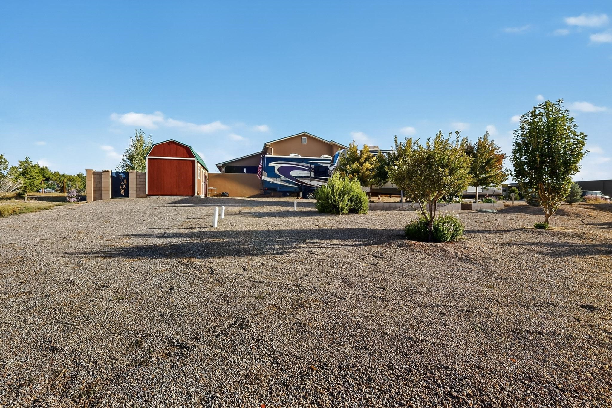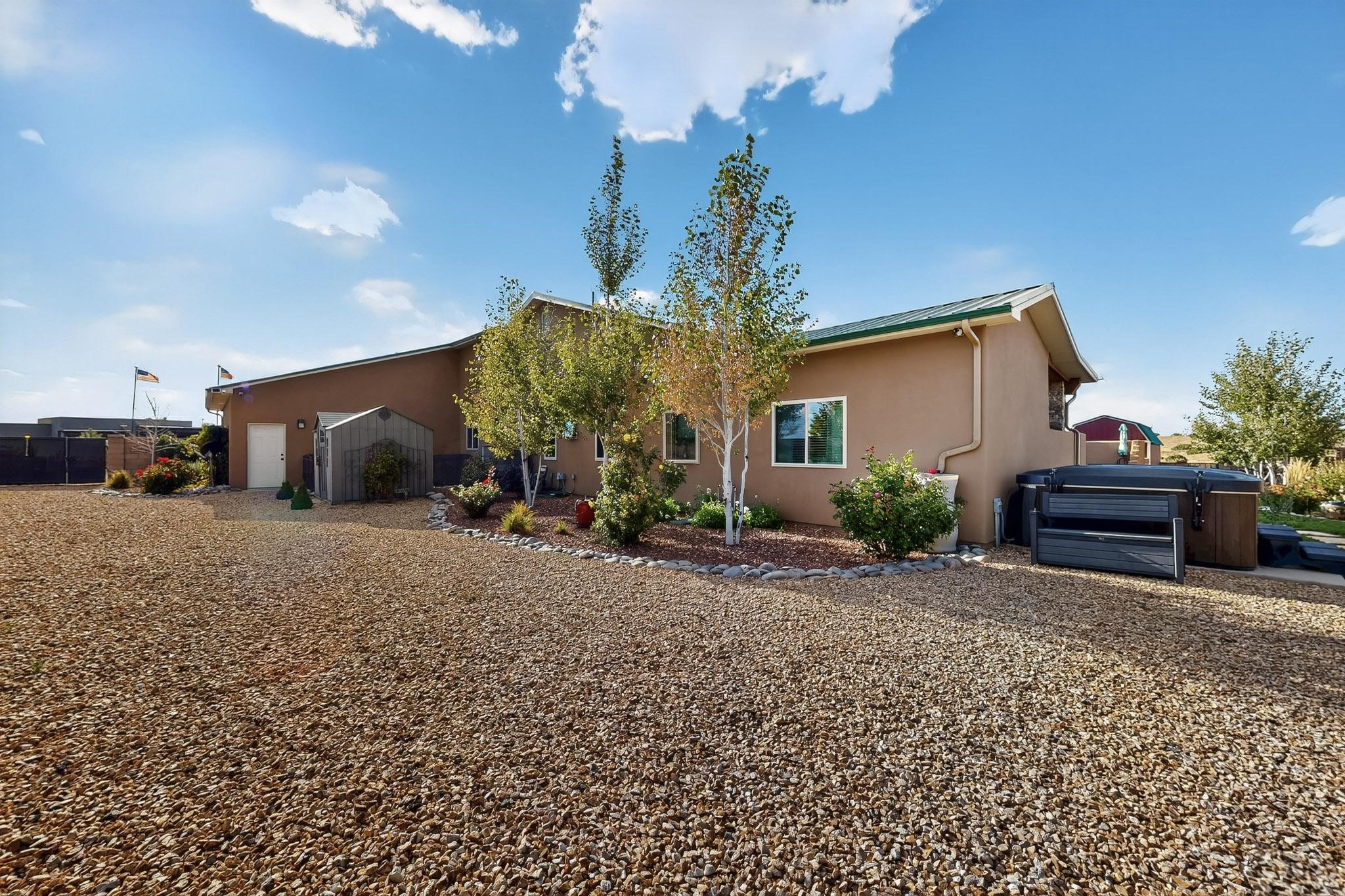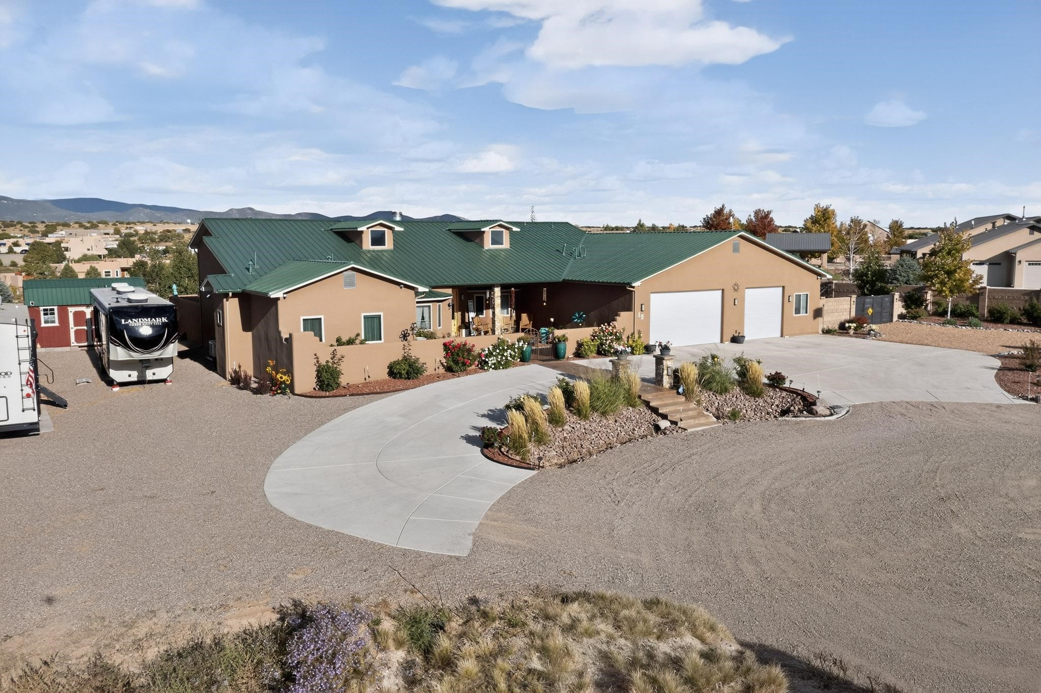 PRICE REDUCED! Nestled in the private, gated community of Valle Serena, this meticulously designed single-level home offers the perfect balance of comfort, luxury, and practicality. Built in 2022, the residence spans 3 bedrooms (two with ensuite baths) and includes an additional full bath and half bath for your guests' convenience. The bright, open-concept interior is both inviting and functional. The living area features soaring ceilings and a cozy wood-burning fireplace, ideal for enjoying Santa Fe's crisp fall evenings and snowy winter nights. Transition effortlessly into the chef's kitchen, a culinary haven outfitted with premium appliances, custom cabinetry, a large island, and a generous butler's pantry for all your storage needs.Step outside to experience your own private oasis -- the fully fenced backyard is beautifully landscaped with fruit trees, a vibrant rose garden, and delicate aspen trees, creating a serene setting to relax or entertain. Whether soaking in the luxurious hot tub or enjoying alfresco dining on the extended patio, you'll be treated to breathtaking views of the enchanting Sangre de Cristo Mountains. This home is not only aesthetically stunning but is also rich with thoughtful amenities, including a pitched pro-panel roof (with a transferable warranty), security system (audio/visual), central refrigerated air conditioning, two storage sheds, and RV parking with hook-ups for added convenience. A spacious 3-car garage, complete with extra storage and workspace, rounds out this home's exceptional offerings. Located just minutes from Santa Fe's world-renowned art galleries, fine dining, and unparalleled outdoor recreation, this residence offers a unique opportunity to embrace privacy, modern luxury, and unbeatable convenience. Don't miss the chance to make this exquisite Southwest retreat your own--schedule your showing today!