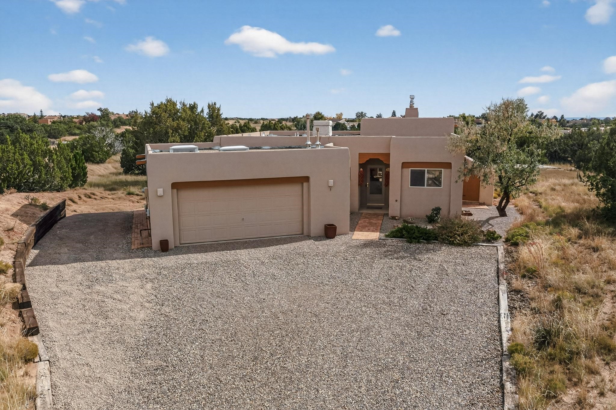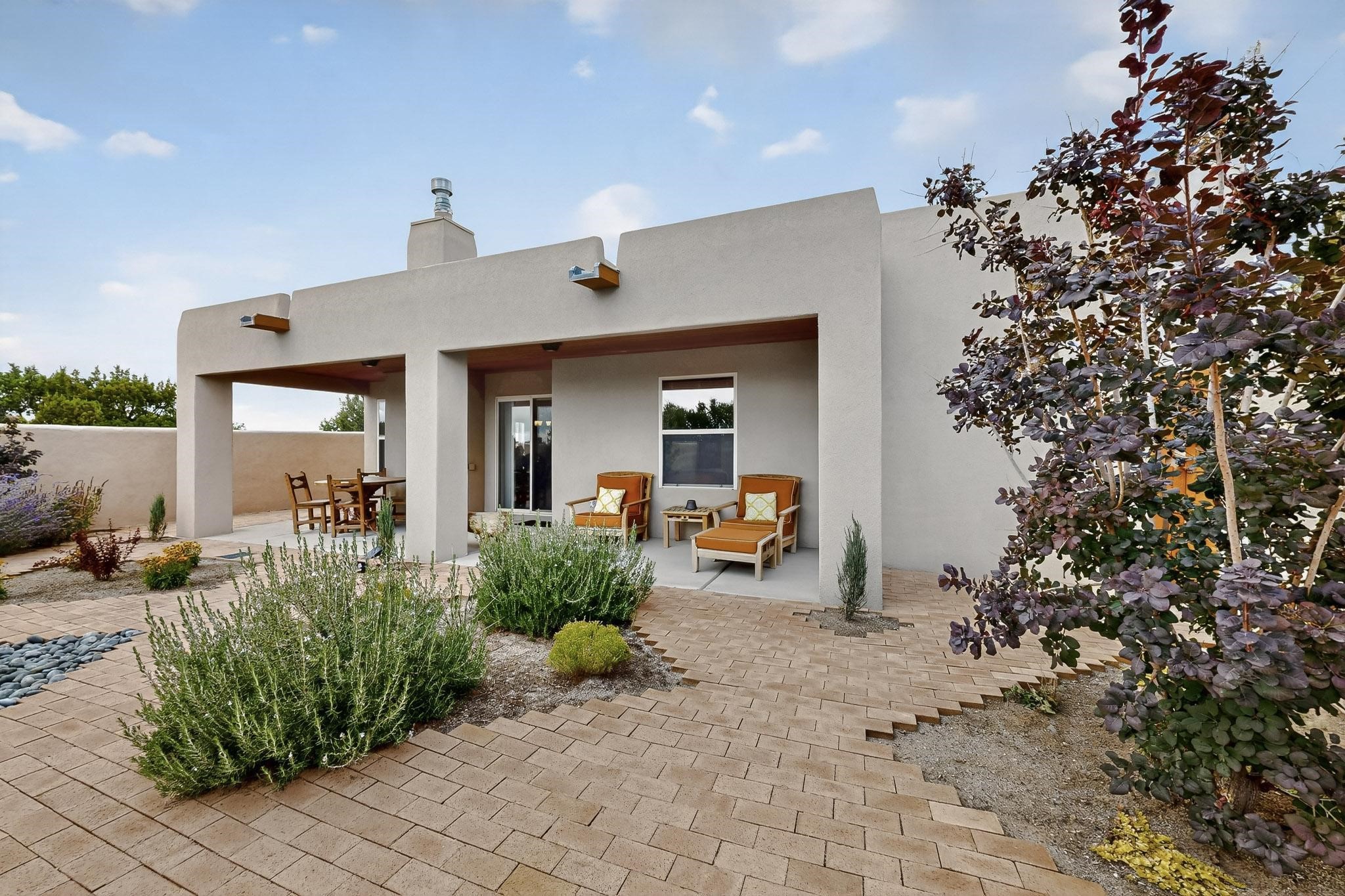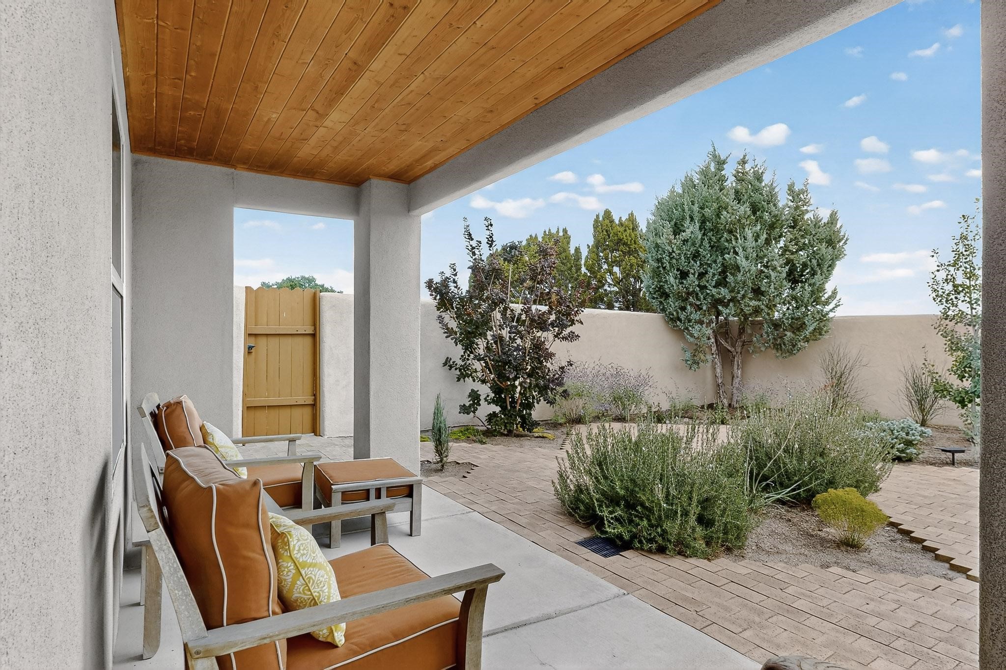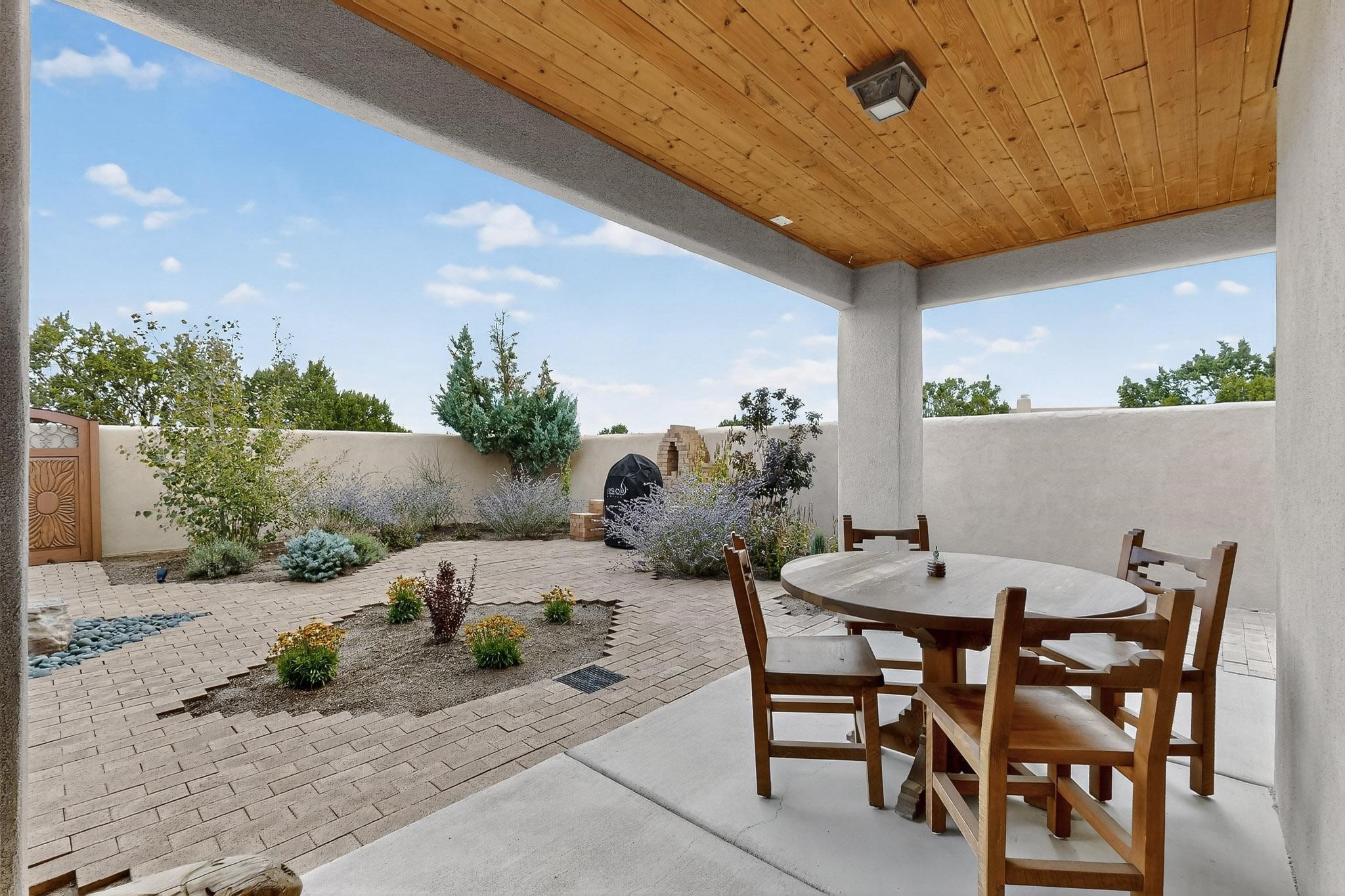 Immaculate and move-in ready, this Eldorado home combines timeless Santa Fe style with modern comfort. Featuring 3 bedrooms and 2 full baths, the home boasts travertine floors throughout, granite countertops, and stainless steel appliances. Classic details include vigas and a gas kiva gas fireplace with blower creating warmth and character. The spacious living areas open to a beautifully landscaped, fully enclosed courtyard with water feature perfect for entertaining or quiet relaxation. Enjoy year-round outdoor living under the large covered portal and take in the peace, privacy, and expansive views of open green space that borders the property. Additional highlights include a 2-car garage, energy-efficient features, and meticulous attention to detail. Ideally located near Eldorado amenities, trails, and the community center, this home offers effortless elegance in one of Eldorado's most desirable settings.