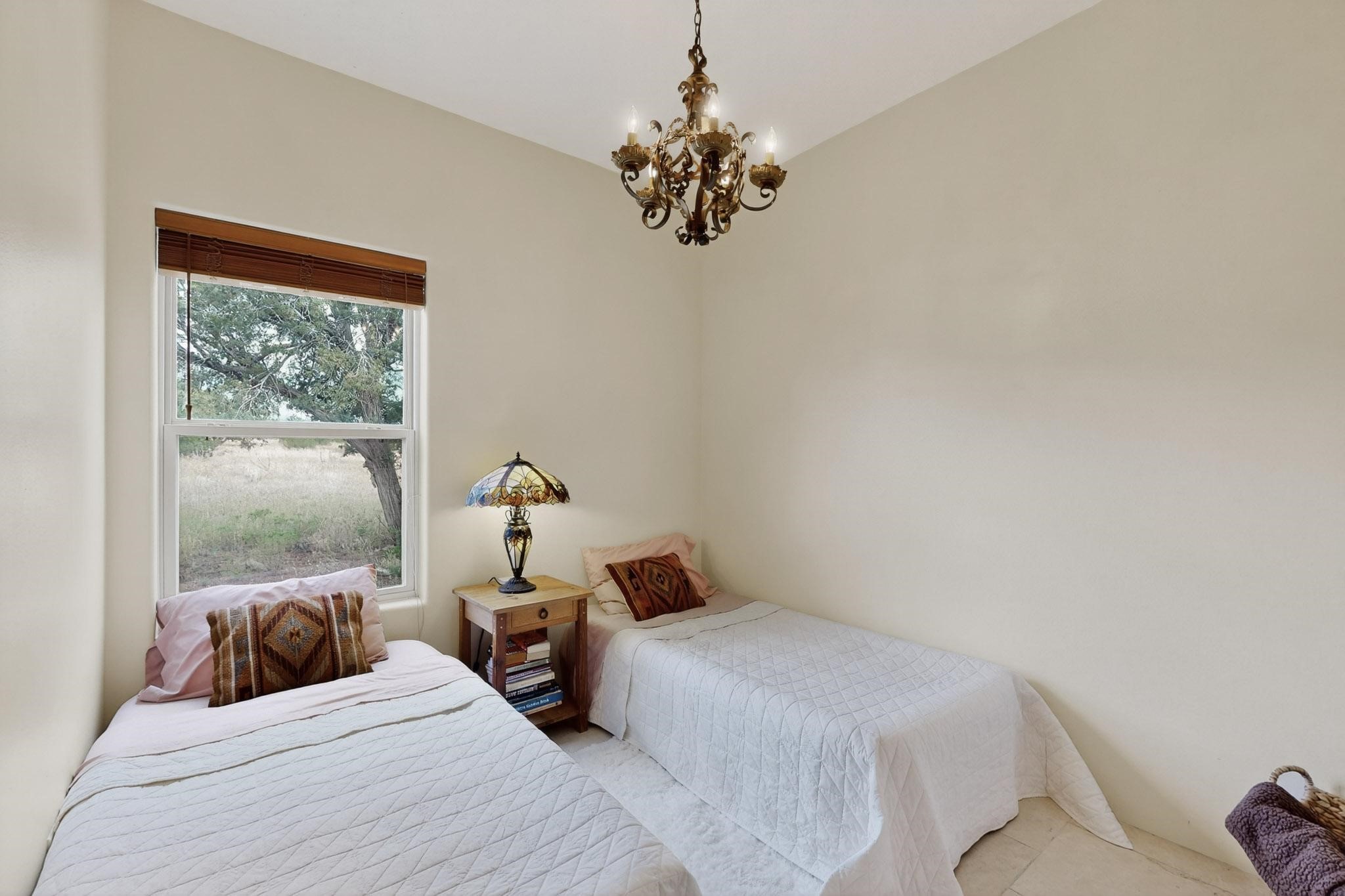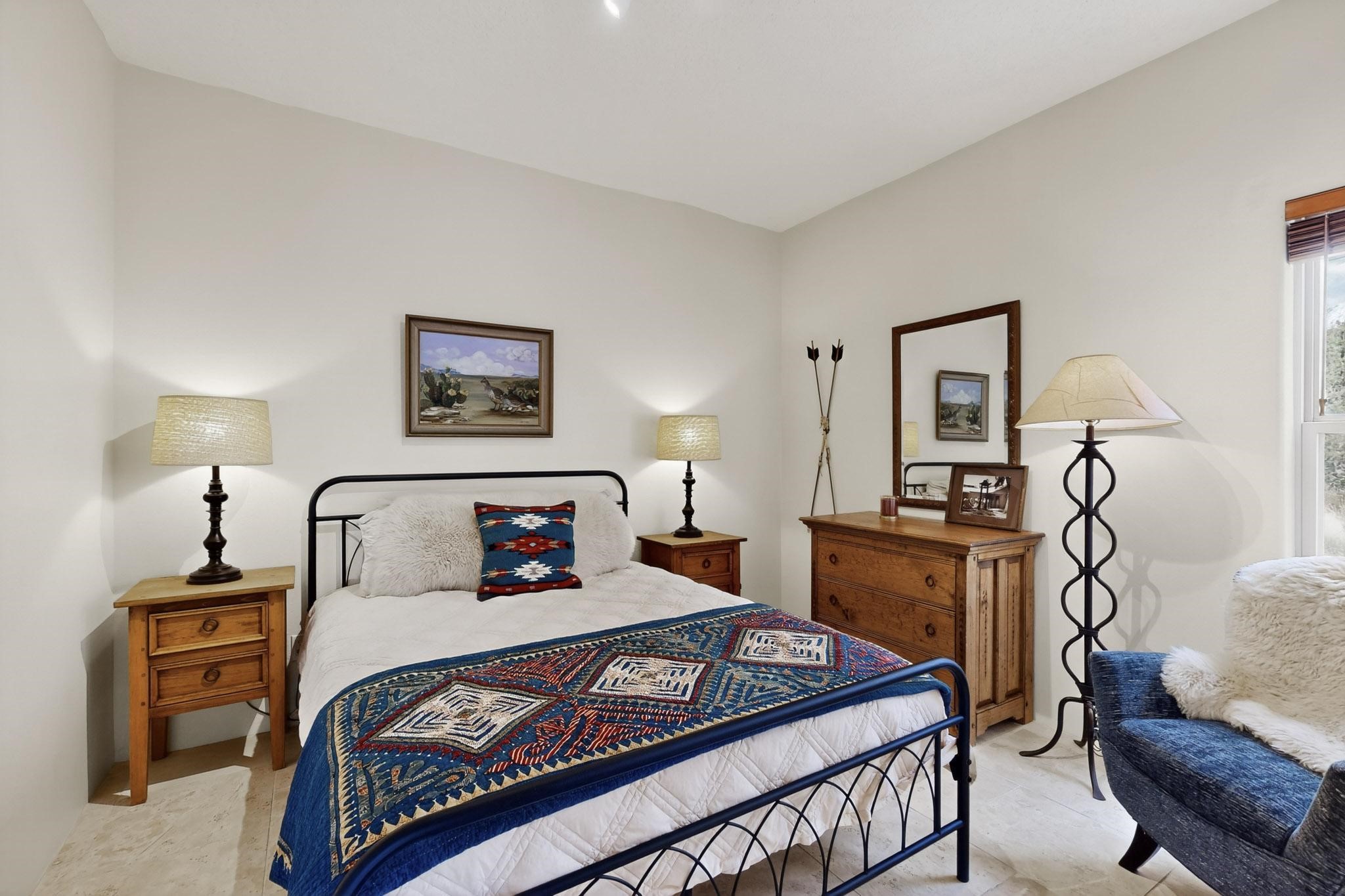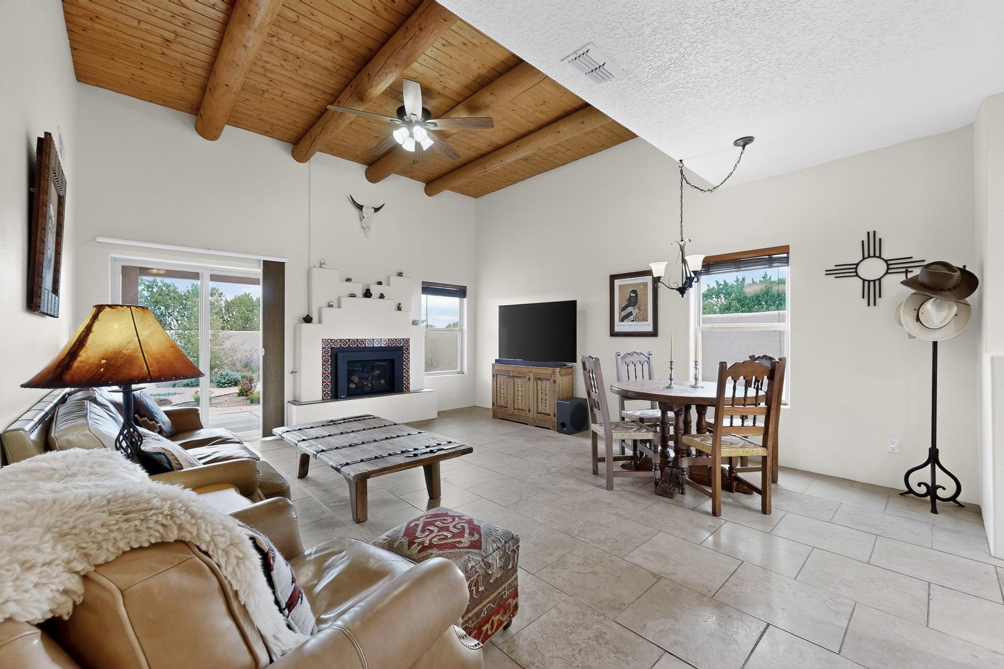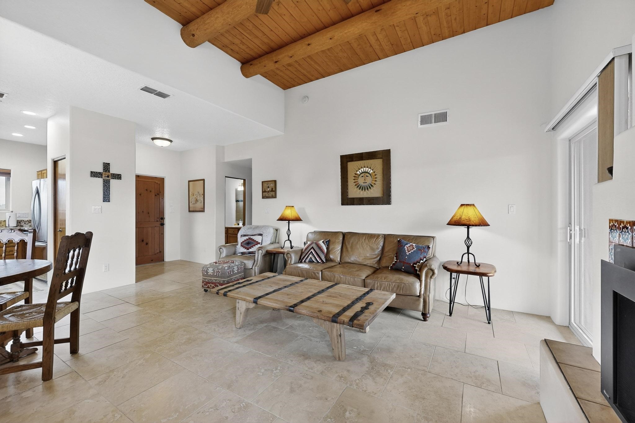 Immaculate and move-in ready, this Eldorado home combines timeless Santa Fe style with modern comfort. Featuring 3 bedrooms and 2 full baths, the home boasts travertine floors throughout, granite countertops, and stainless steel appliances. Classic details include vigas and a gas kiva gas fireplace with blower creating warmth and character. The spacious living areas open to a beautifully landscaped, fully enclosed courtyard with water feature perfect for entertaining or quiet relaxation. Enjoy year-round outdoor living under the large covered portal and take in the peace, privacy, and expansive views of open green space that borders the property. Additional highlights include a 2-car garage, energy-efficient features, and meticulous attention to detail. Ideally located near Eldorado amenities, trails, and the community center, this home offers effortless elegance in one of Eldorado's most desirable settings.