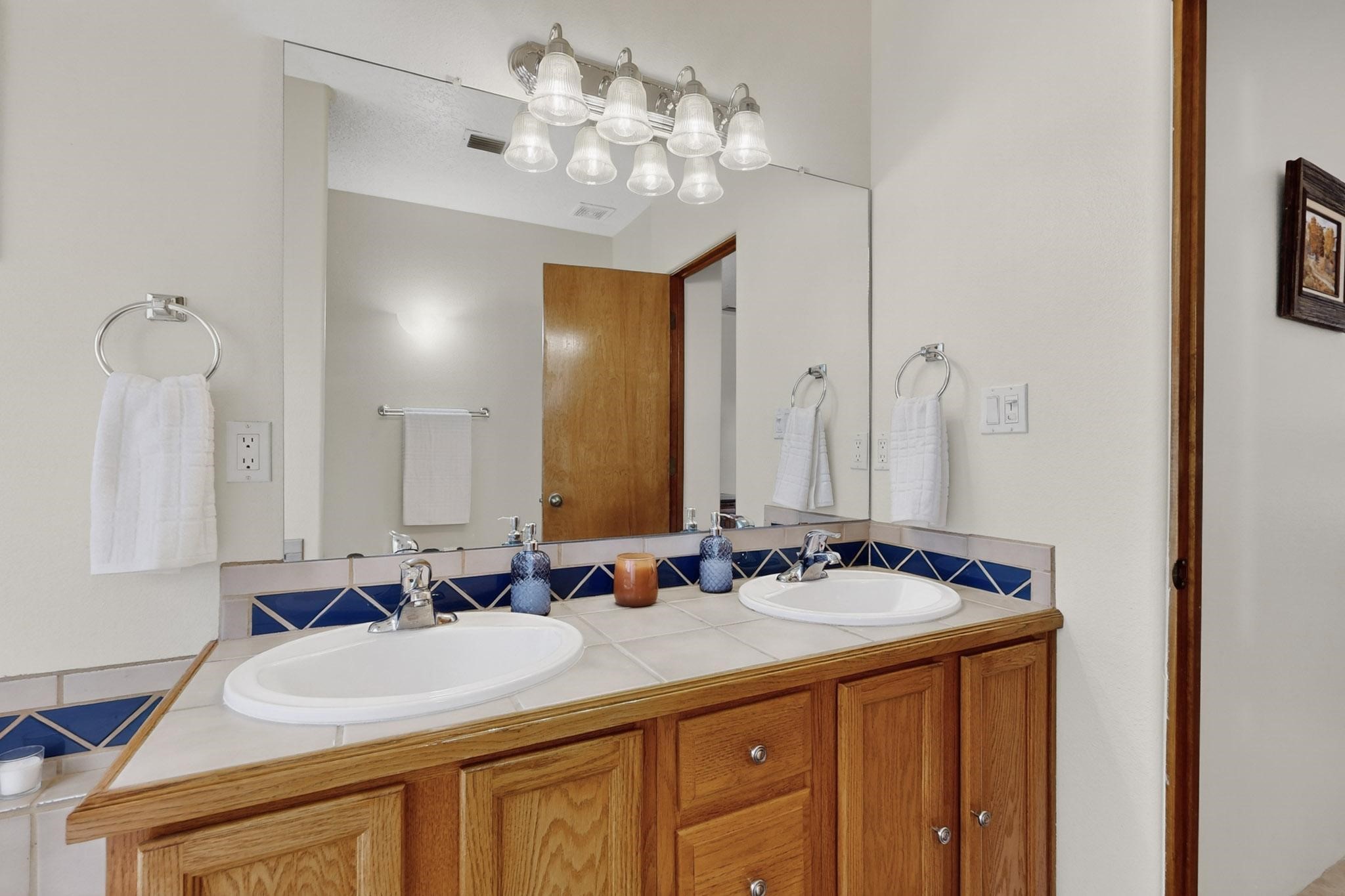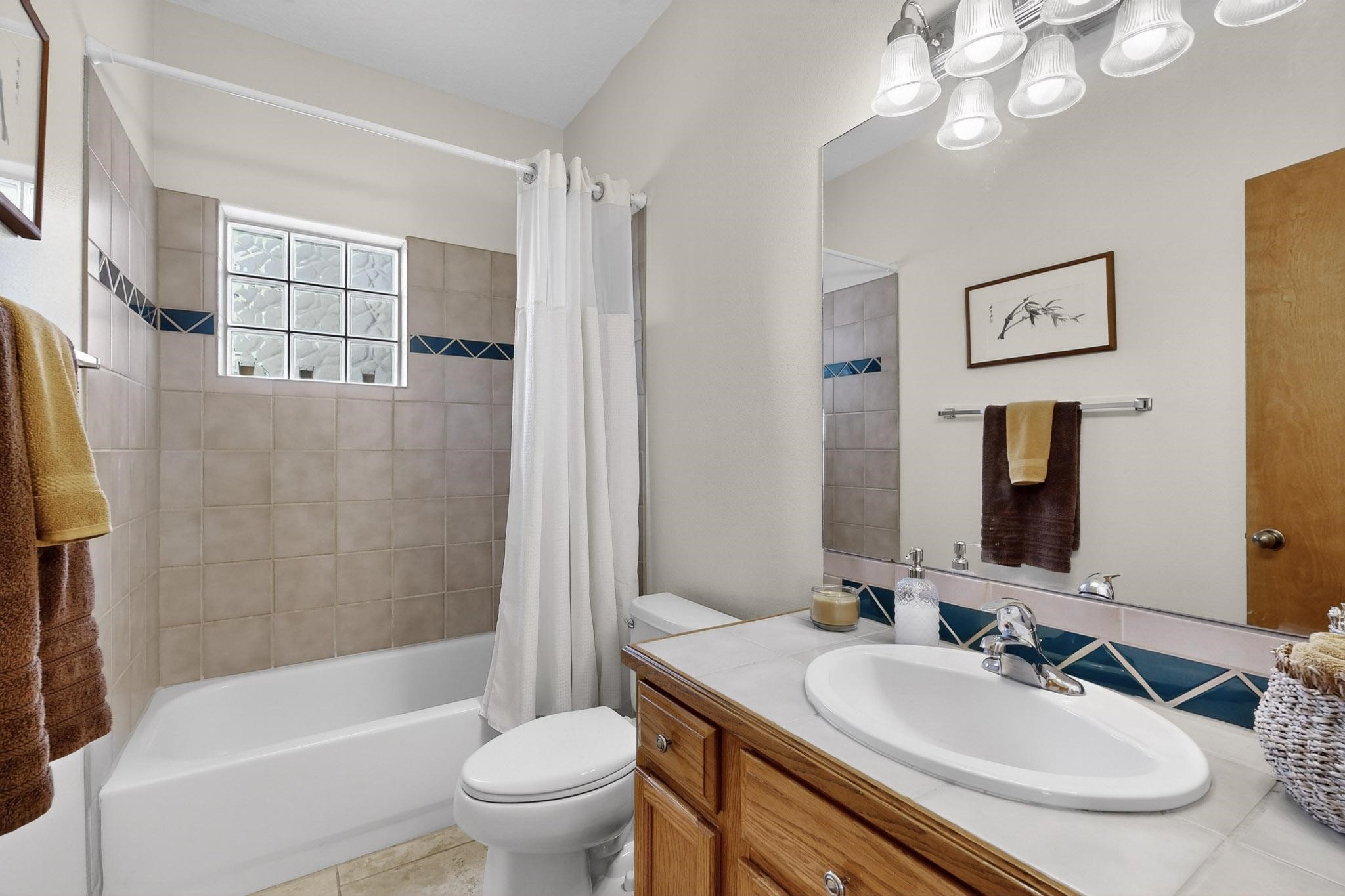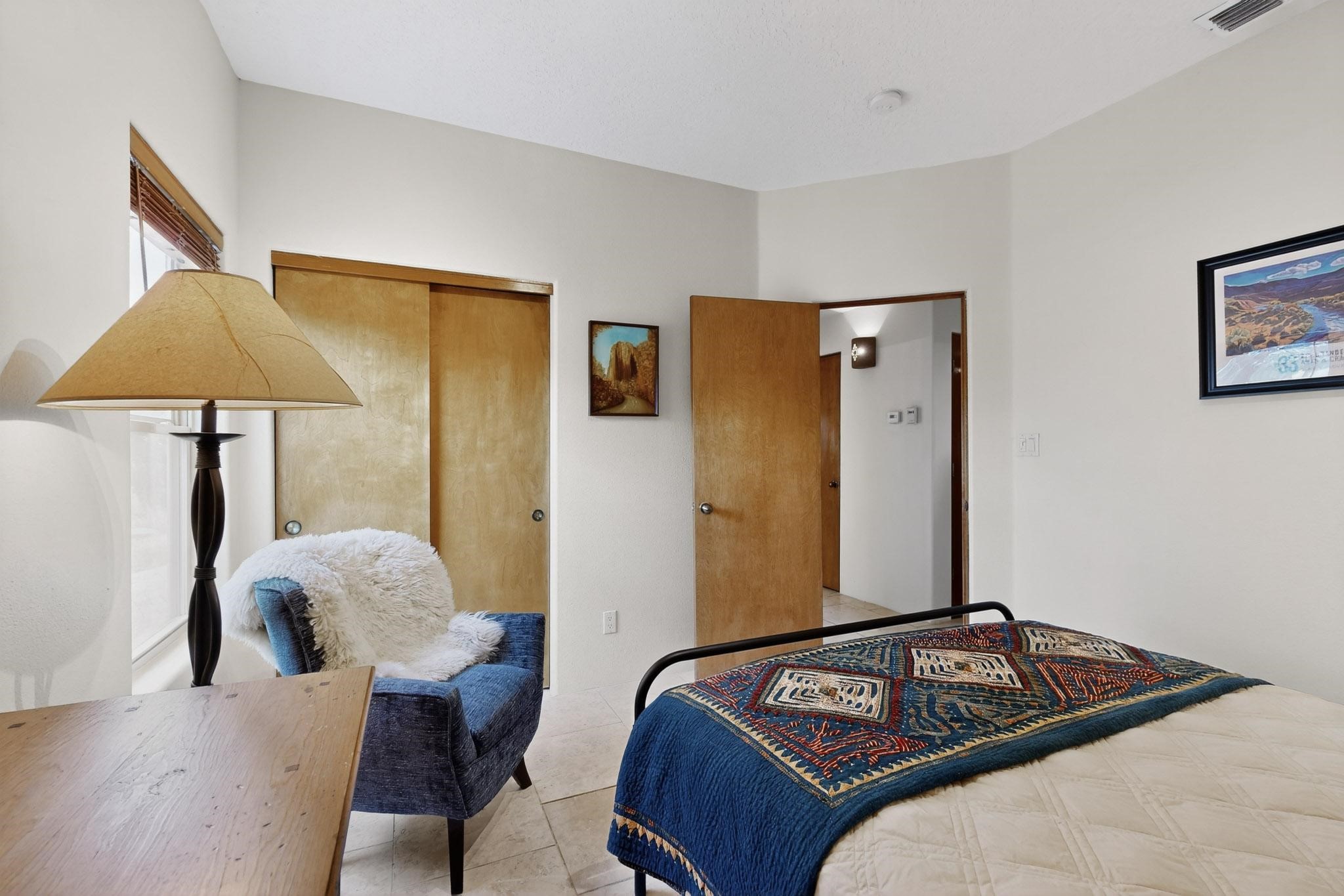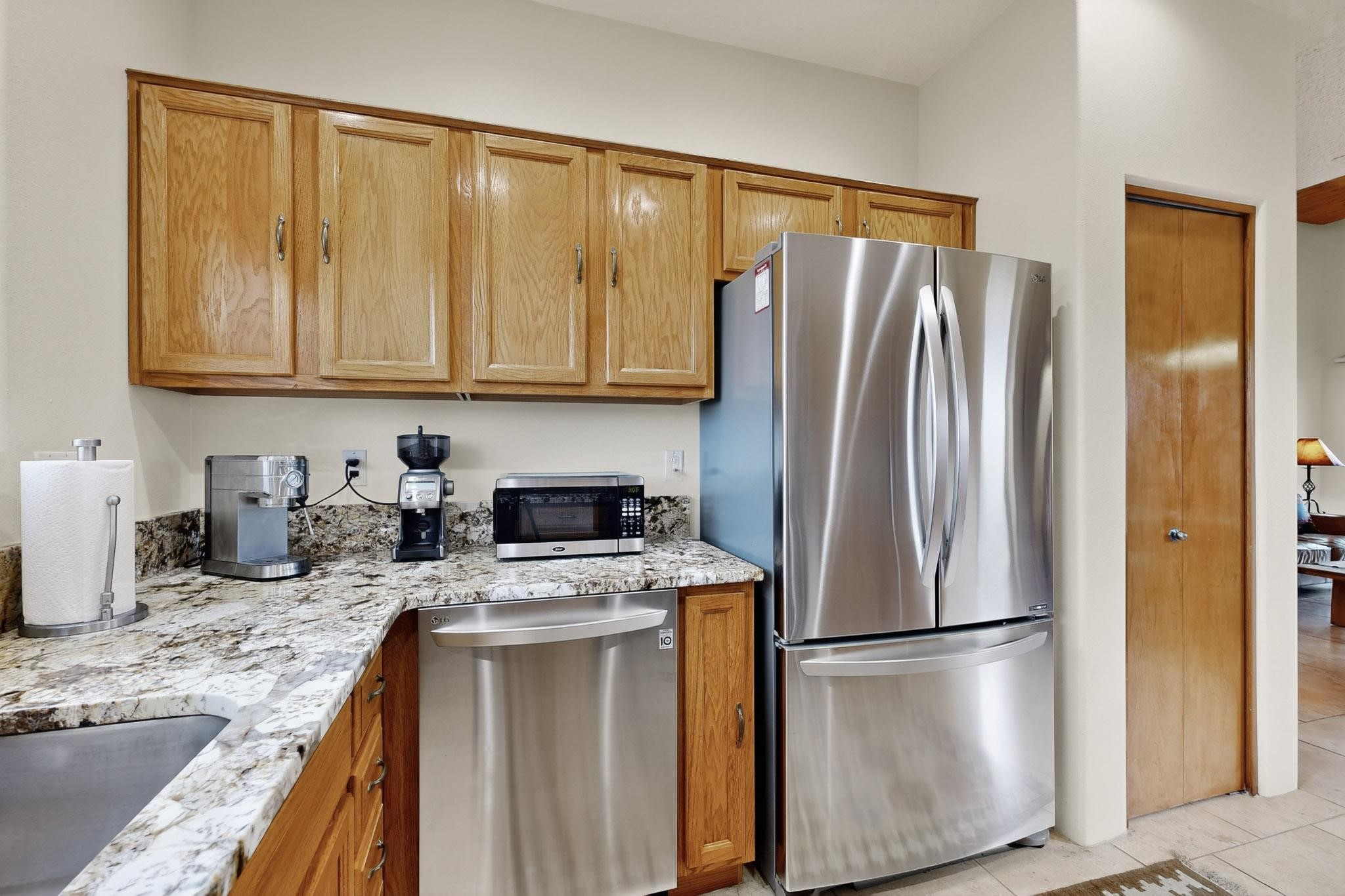 Immaculate and move-in ready, this Eldorado home combines timeless Santa Fe style with modern comfort. Featuring 3 bedrooms and 2 full baths, the home boasts travertine floors throughout, granite countertops, and stainless steel appliances. Classic details include vigas and a gas kiva gas fireplace with blower creating warmth and character. The spacious living areas open to a beautifully landscaped, fully enclosed courtyard with water feature perfect for entertaining or quiet relaxation. Enjoy year-round outdoor living under the large covered portal and take in the peace, privacy, and expansive views of open green space that borders the property. Additional highlights include a 2-car garage, energy-efficient features, and meticulous attention to detail. Ideally located near Eldorado amenities, trails, and the community center, this home offers effortless elegance in one of Eldorado's most desirable settings.