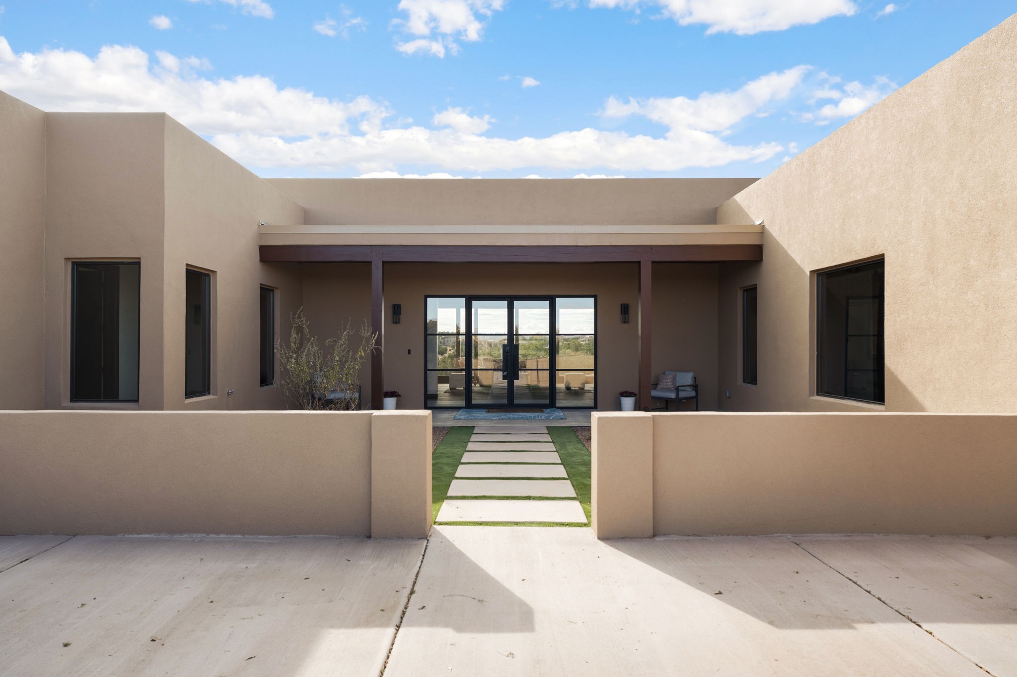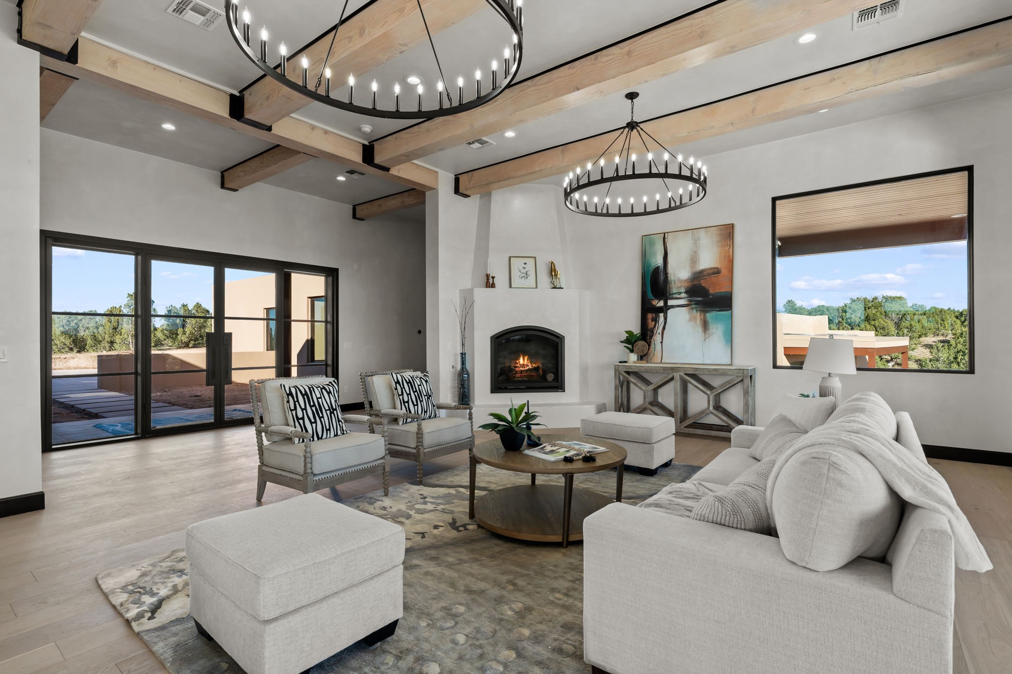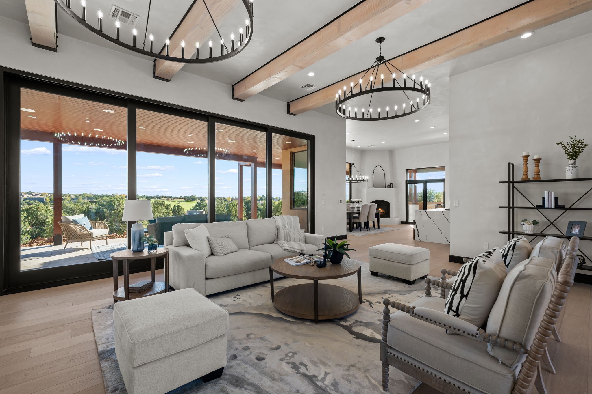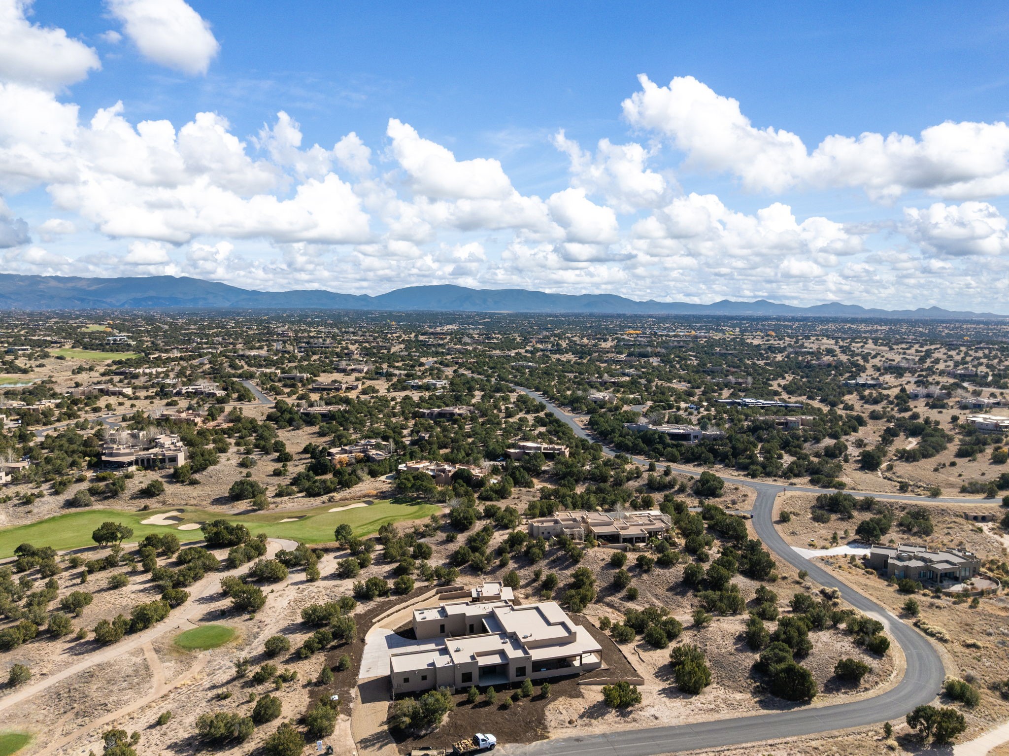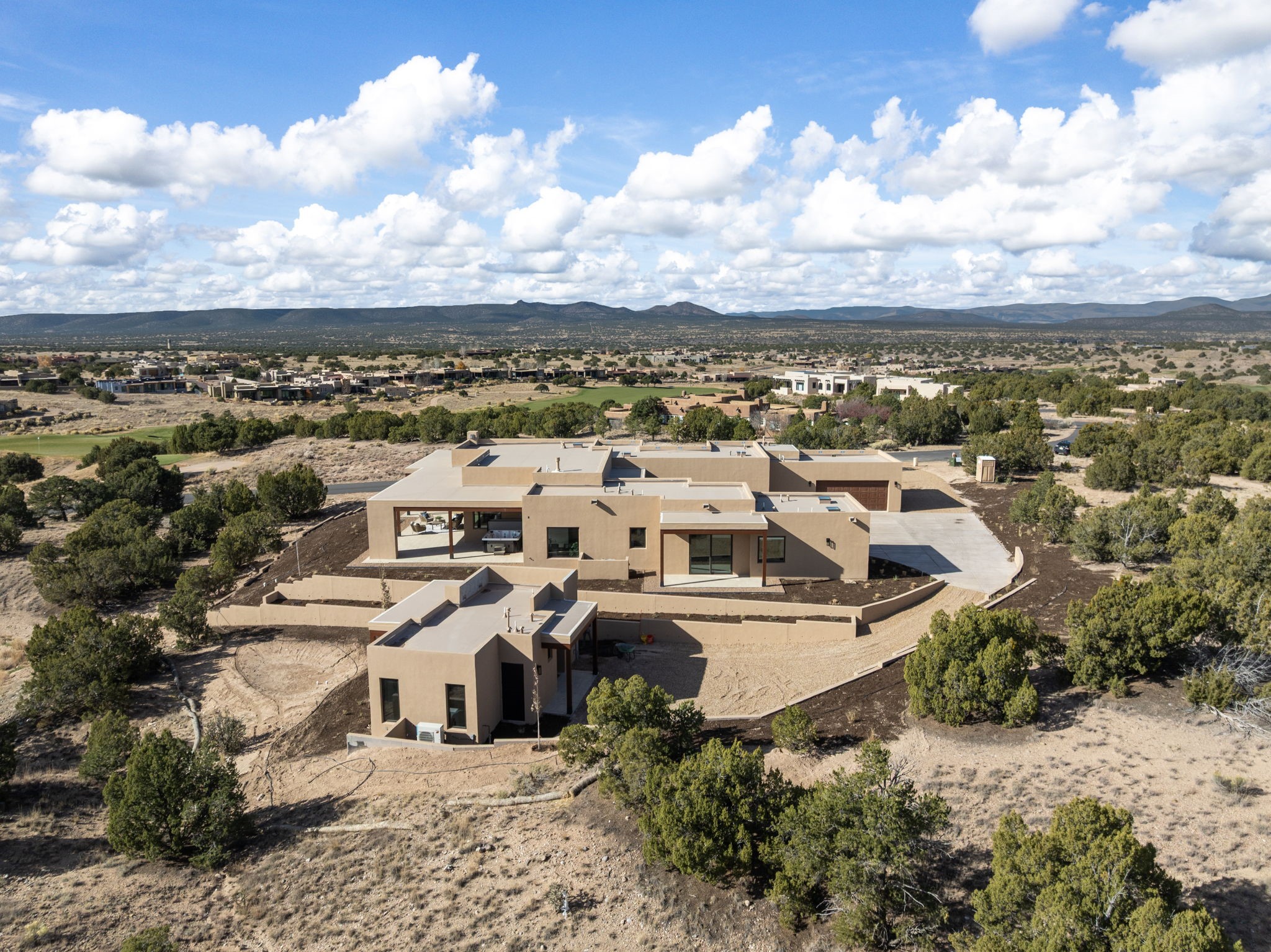 $50,000 SELLERS CREDITS TO BUYER WITH A FULL PRICE OFFER. Nestled in the prestigious Las Campanas community of Santa Fe, this newly built custom estate blends modern architecture with timeless New Mexican charm. Situated on a 1.64-acre homesite overlooking two picturesque golf holes, the home captures breathtaking views of both the fairways and surrounding mountains.Built by Candelaria Homes, one of New Mexico's most respected luxury builders, this residence reflects exceptional craftsmanship and attention to detail in every corner--from its open floor plan to its refined finishes.Designed for comfort and sophistication, the single-story layout features heated floors throughout the main living and family areas, creating warmth and luxury in every season. A beautifully designed detached one-bedroom Casita offers the perfect retreat for guests, extended family, or a private studio.The gourmet kitchen impresses with bold dark finishes, high-end Sub-Zero appliances, a spacious center island, and a large butler's pantry, seamlessly combining style and function.A versatile bonus living area provides flexibility as a children's playroom, home library, or secondary living space. Expansive picture windows fill the home with natural light, framing Santa Fe's stunning landscape and creating a seamless indoor-outdoor connection.With its open-concept great room, spacious patios, and sweeping golf course and mountain views, this Las Campanas masterpiece defines elevated desert living. Golf course views are of holes 14 and 15.