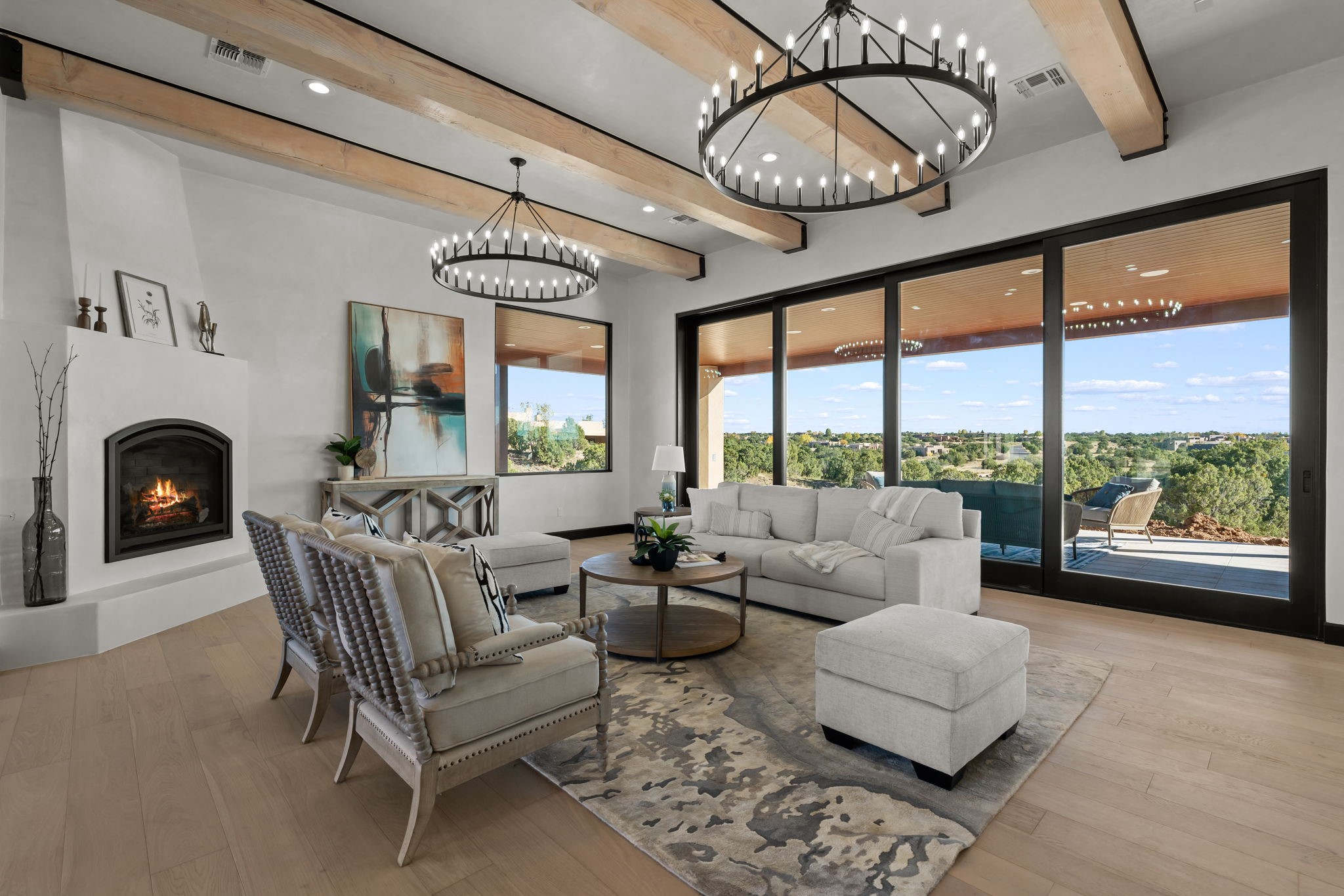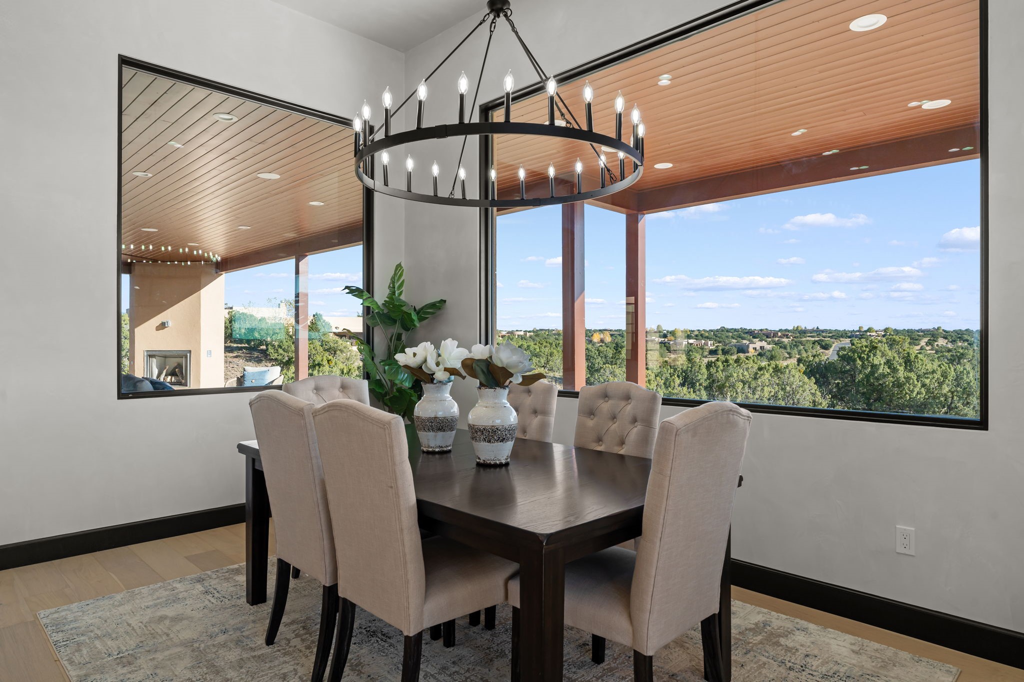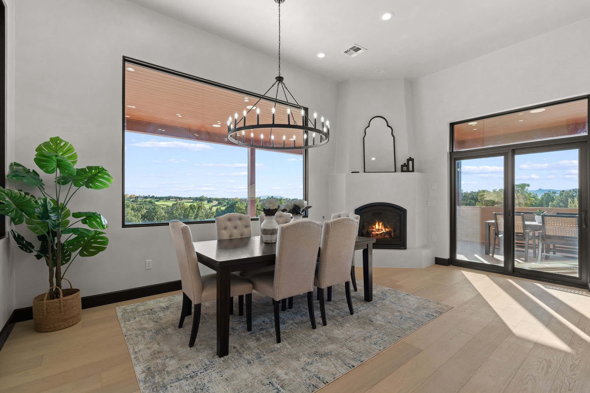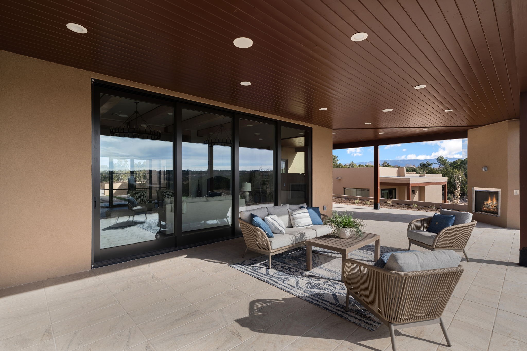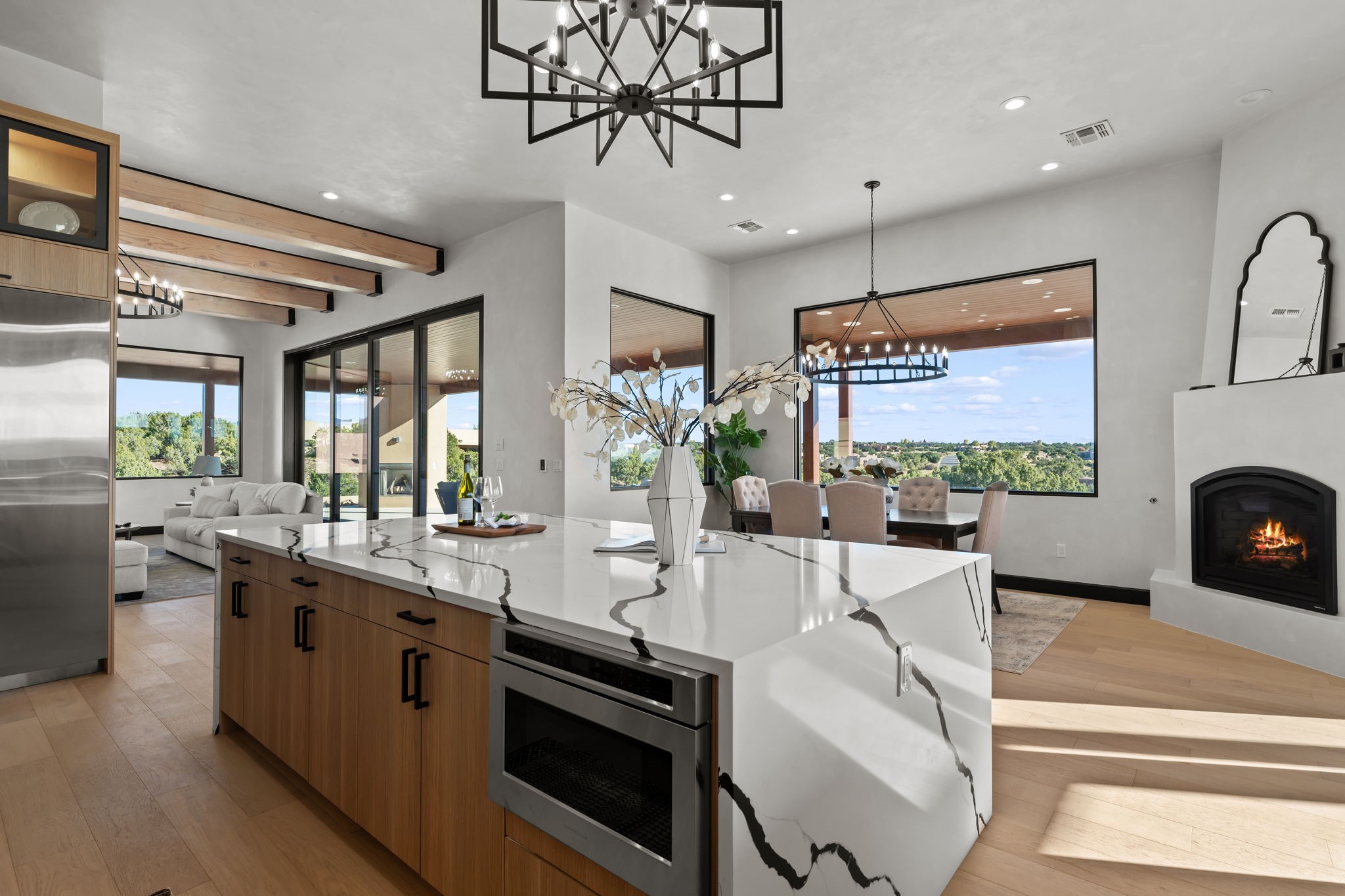 $50,000 SELLERS CREDITS TO BUYER WITH A FULL PRICE OFFER. Nestled in the prestigious Las Campanas community of Santa Fe, this newly built custom estate blends modern architecture with timeless New Mexican charm. Situated on a 1.64-acre homesite overlooking two picturesque golf holes, the home captures breathtaking views of both the fairways and surrounding mountains.Built by Candelaria Homes, one of New Mexico's most respected luxury builders, this residence reflects exceptional craftsmanship and attention to detail in every corner--from its open floor plan to its refined finishes.Designed for comfort and sophistication, the single-story layout features heated floors throughout the main living and family areas, creating warmth and luxury in every season. A beautifully designed detached one-bedroom Casita offers the perfect retreat for guests, extended family, or a private studio.The gourmet kitchen impresses with bold dark finishes, high-end Sub-Zero appliances, a spacious center island, and a large butler's pantry, seamlessly combining style and function.A versatile bonus living area provides flexibility as a children's playroom, home library, or secondary living space. Expansive picture windows fill the home with natural light, framing Santa Fe's stunning landscape and creating a seamless indoor-outdoor connection.With its open-concept great room, spacious patios, and sweeping golf course and mountain views, this Las Campanas masterpiece defines elevated desert living. Golf course views are of holes 14 and 15.
