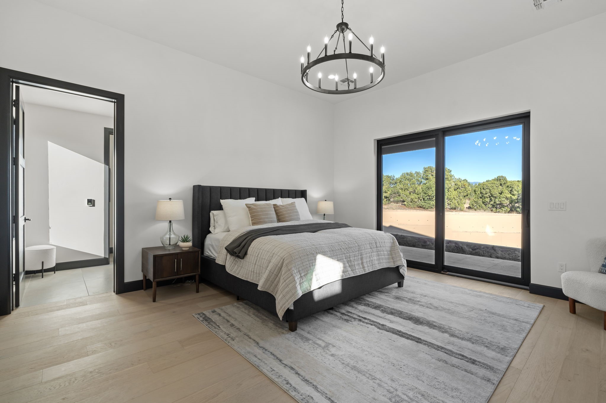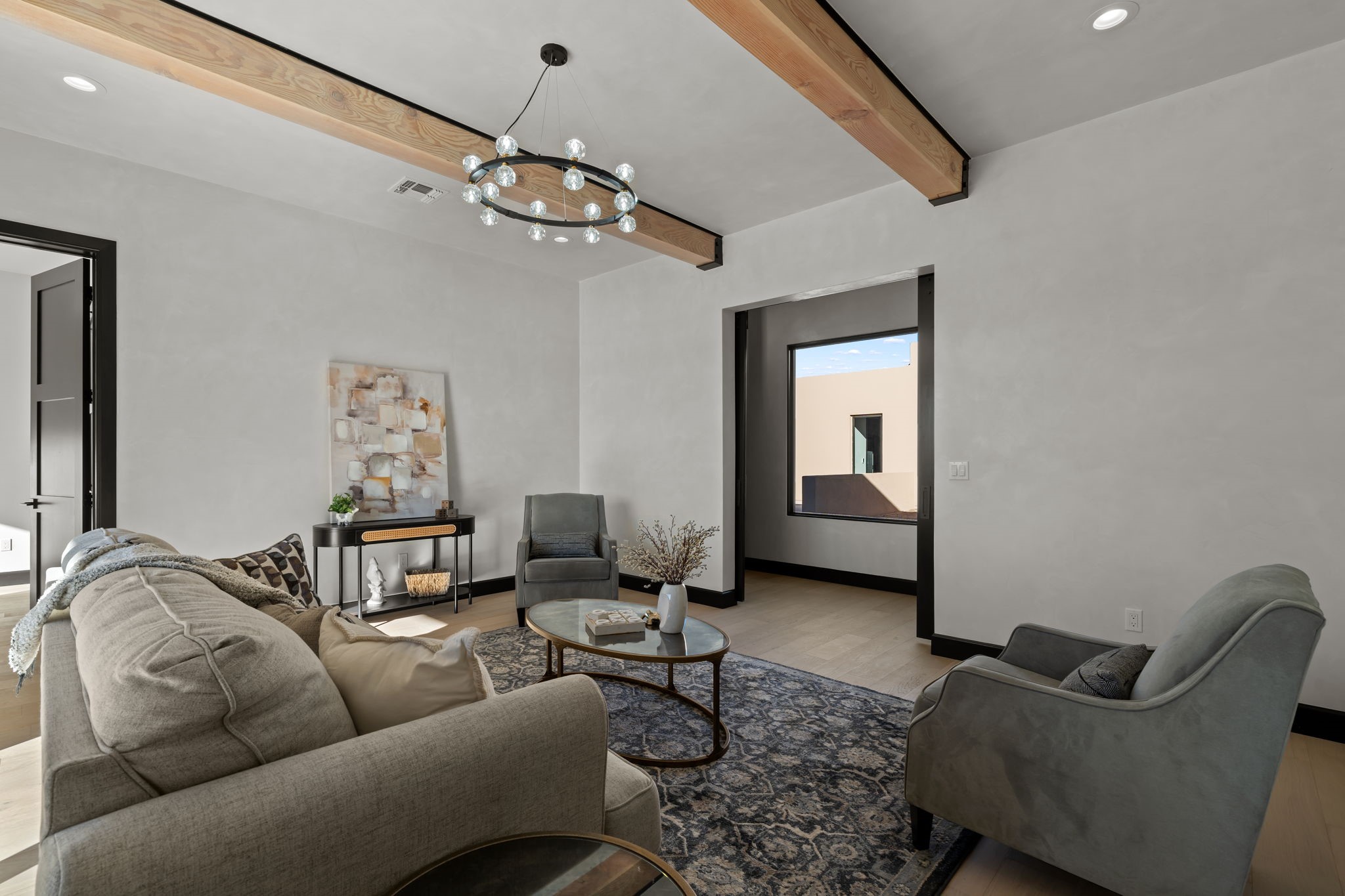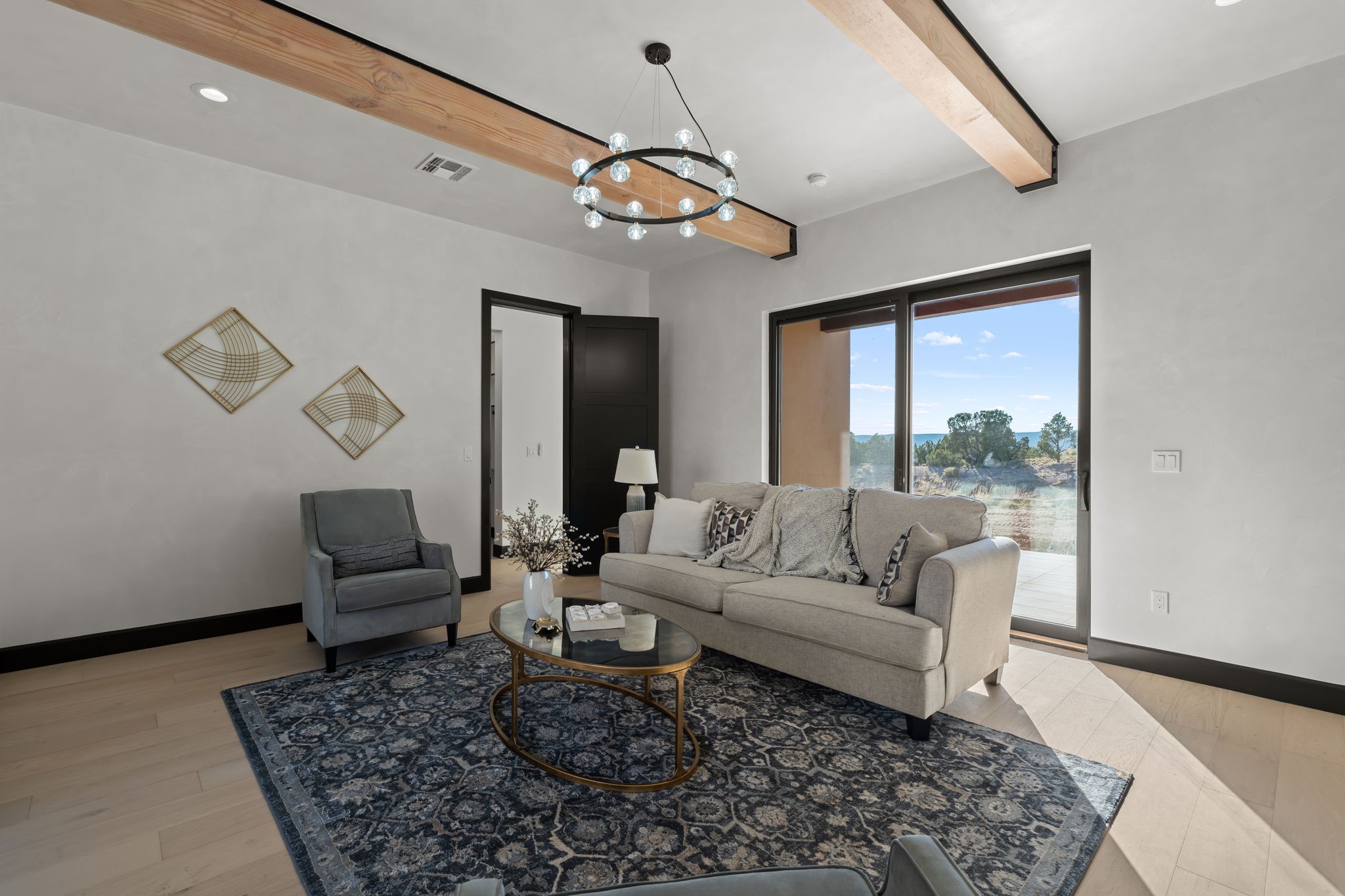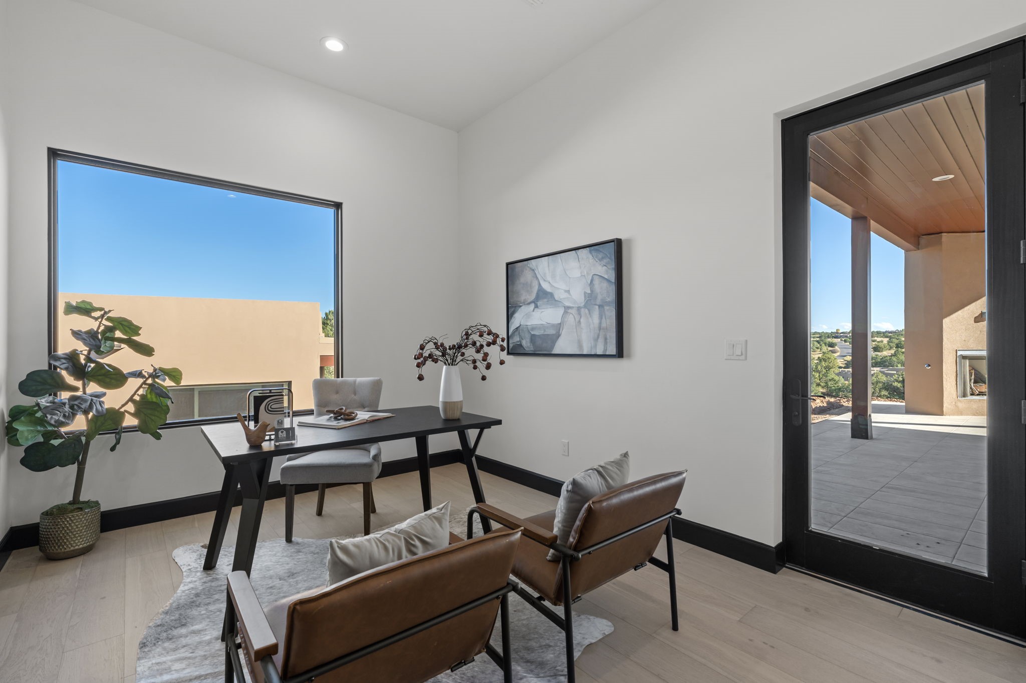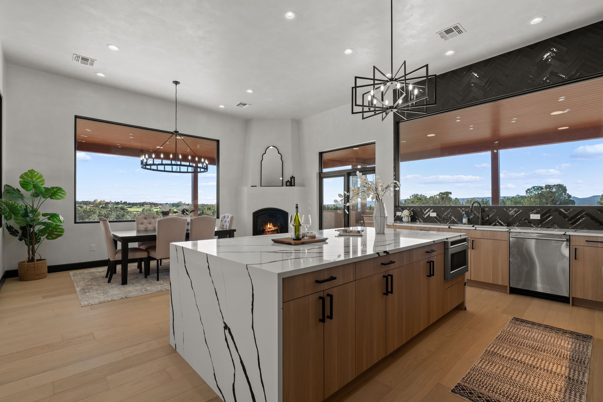 $50,000 SELLERS CREDITS TO BUYER WITH A FULL PRICE OFFER. Nestled in the prestigious Las Campanas community of Santa Fe, this newly built custom estate blends modern architecture with timeless New Mexican charm. Situated on a 1.64-acre homesite overlooking two picturesque golf holes, the home captures breathtaking views of both the fairways and surrounding mountains.Built by Candelaria Homes, one of New Mexico's most respected luxury builders, this residence reflects exceptional craftsmanship and attention to detail in every corner--from its open floor plan to its refined finishes.Designed for comfort and sophistication, the single-story layout features heated floors throughout the main living and family areas, creating warmth and luxury in every season. A beautifully designed detached one-bedroom Casita offers the perfect retreat for guests, extended family, or a private studio.The gourmet kitchen impresses with bold dark finishes, high-end Sub-Zero appliances, a spacious center island, and a large butler's pantry, seamlessly combining style and function.A versatile bonus living area provides flexibility as a children's playroom, home library, or secondary living space. Expansive picture windows fill the home with natural light, framing Santa Fe's stunning landscape and creating a seamless indoor-outdoor connection.With its open-concept great room, spacious patios, and sweeping golf course and mountain views, this Las Campanas masterpiece defines elevated desert living. Golf course views are of holes 14 and 15.
