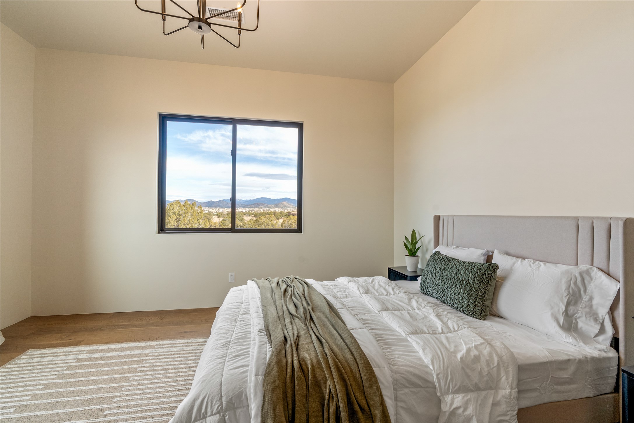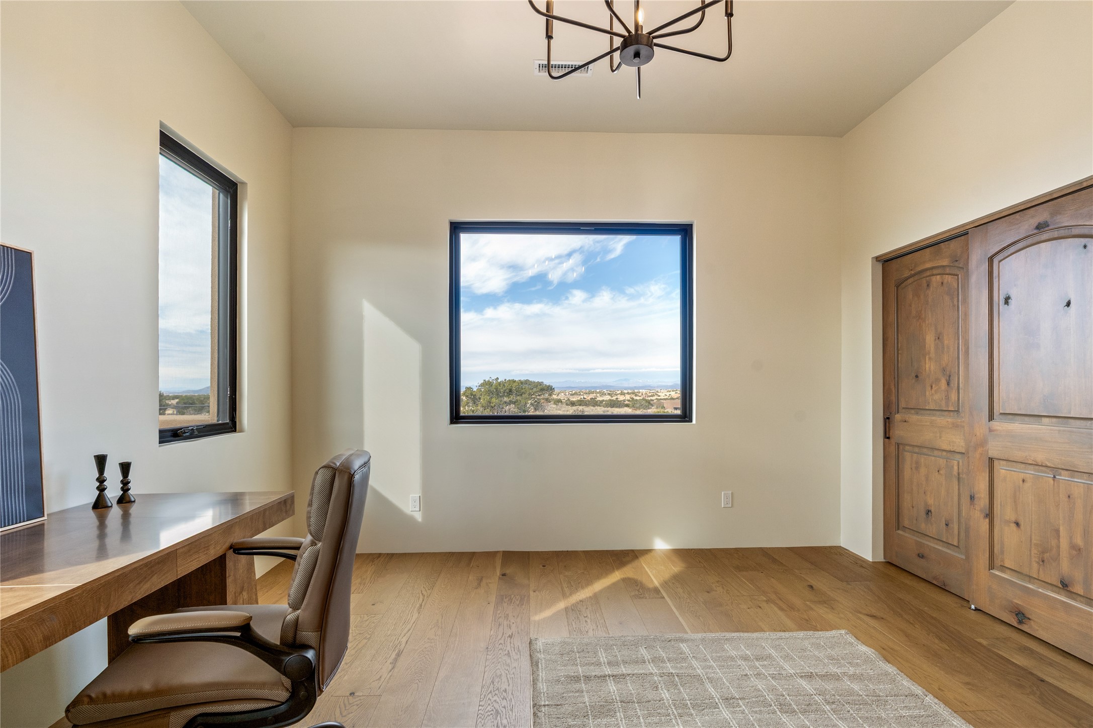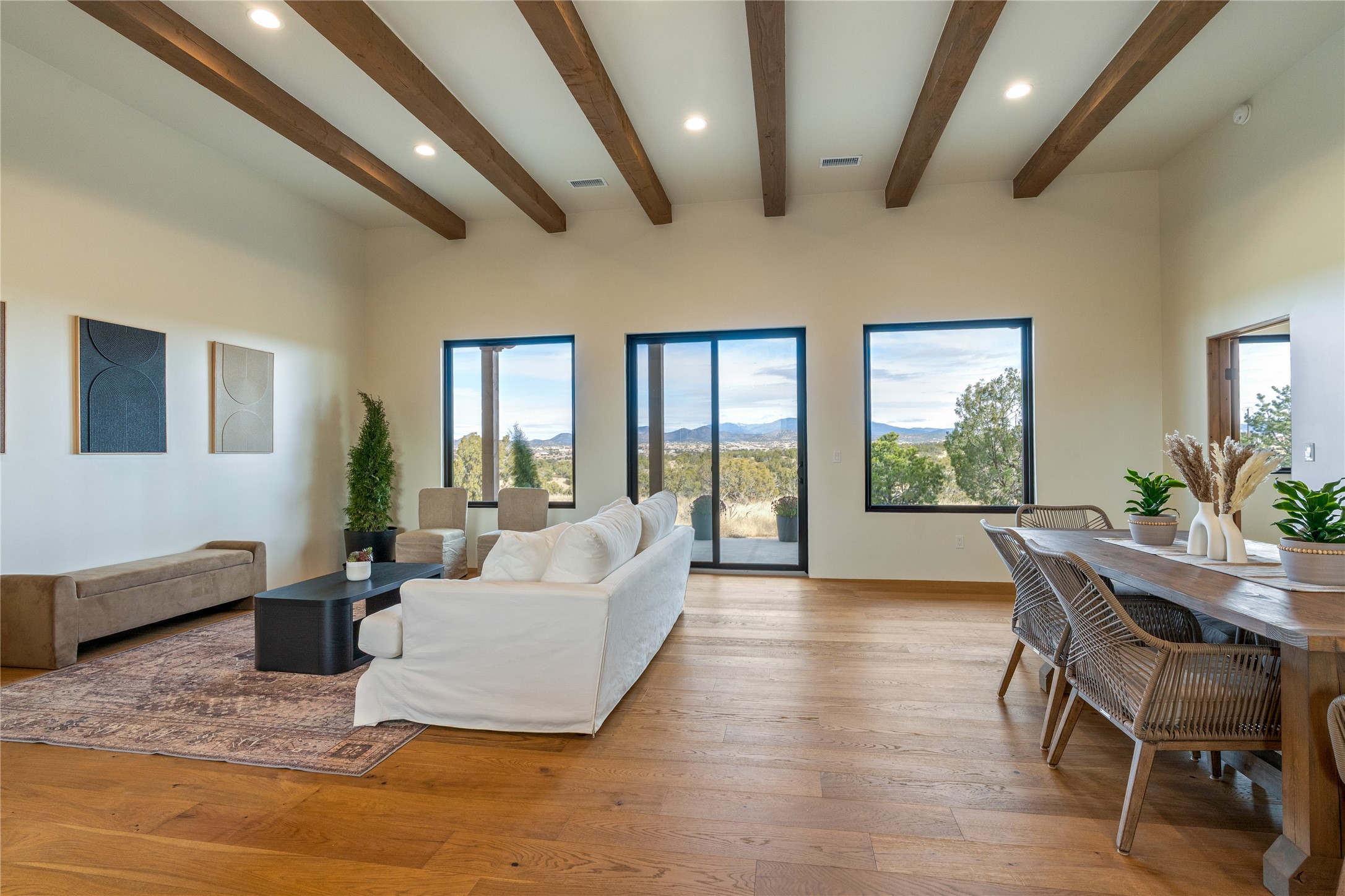 What an incredible place! The views are outstanding! Here you have 6.19+/- acres on a hilltop with views that reach far to the north and far to the west. At this property you can have an art studio or a business right at your home. There is plumbing and septic, and electric all set up to build another building on this lot. You can build an additional casita or guest house! This home is complete and ready to move into. It has the landscaping done with irrigation. The windows were placed to maximize light as well as mountain views. This modern home has gorgeous elements that also tie in the traditional styles of Santa Fe. There are viga beams in the main open concept living/dining/kitchen area. Both the front and back porches have Fir posts and beams with plenty of space to entertain or just relax and take in the beauty of this place. Watch the weather with a cup of coffee or tea on the back porch. There is a Douglas Fir custom-built modern vanity in the guest bathroom as well. The floors are a gorgeous, real wood engineered white oak. The doors are all a beautiful alder wood. Here you have a certified Green design home with Energy Star appliances, a HERS rating certification, and a very well-insulated house with highly insulated windows. This home comes with A/C and forced air heating, which is great when you want the temperature to adjust right away. Every detail was thought out and selected with a discriminating eye.You must come check this beautiful home out to feel what it will be like to live here.