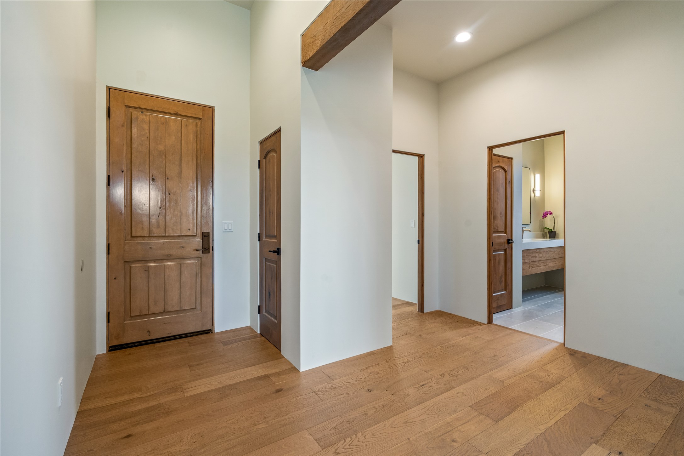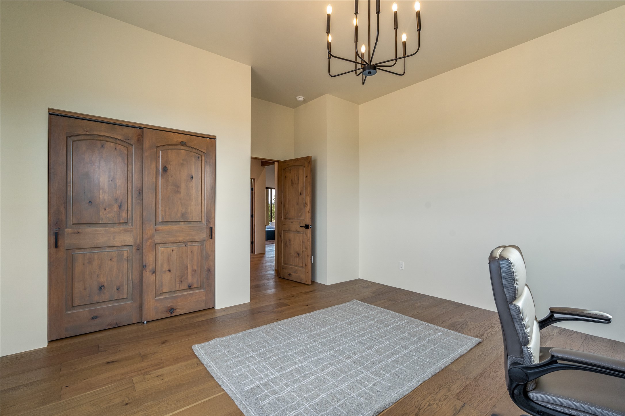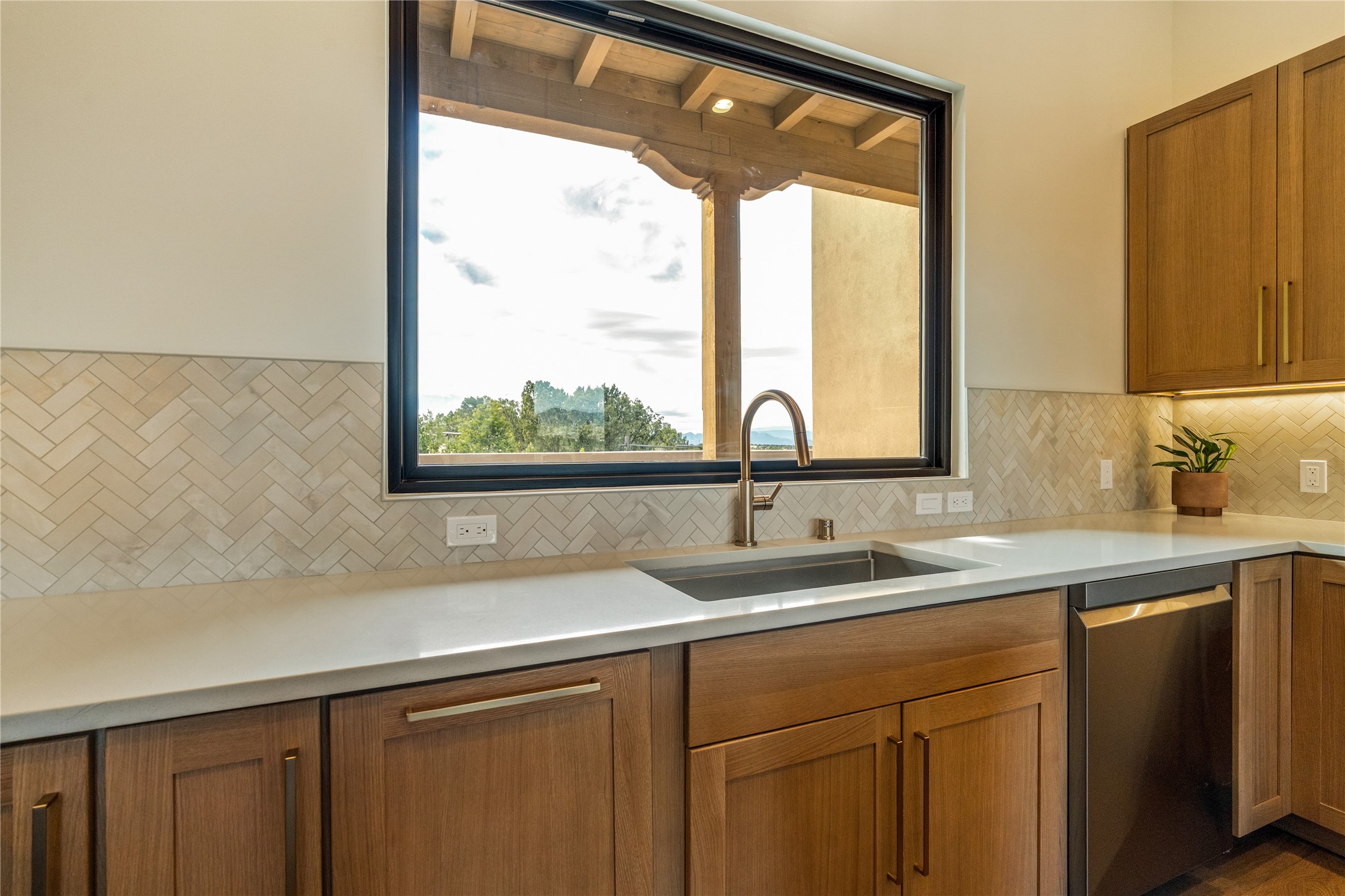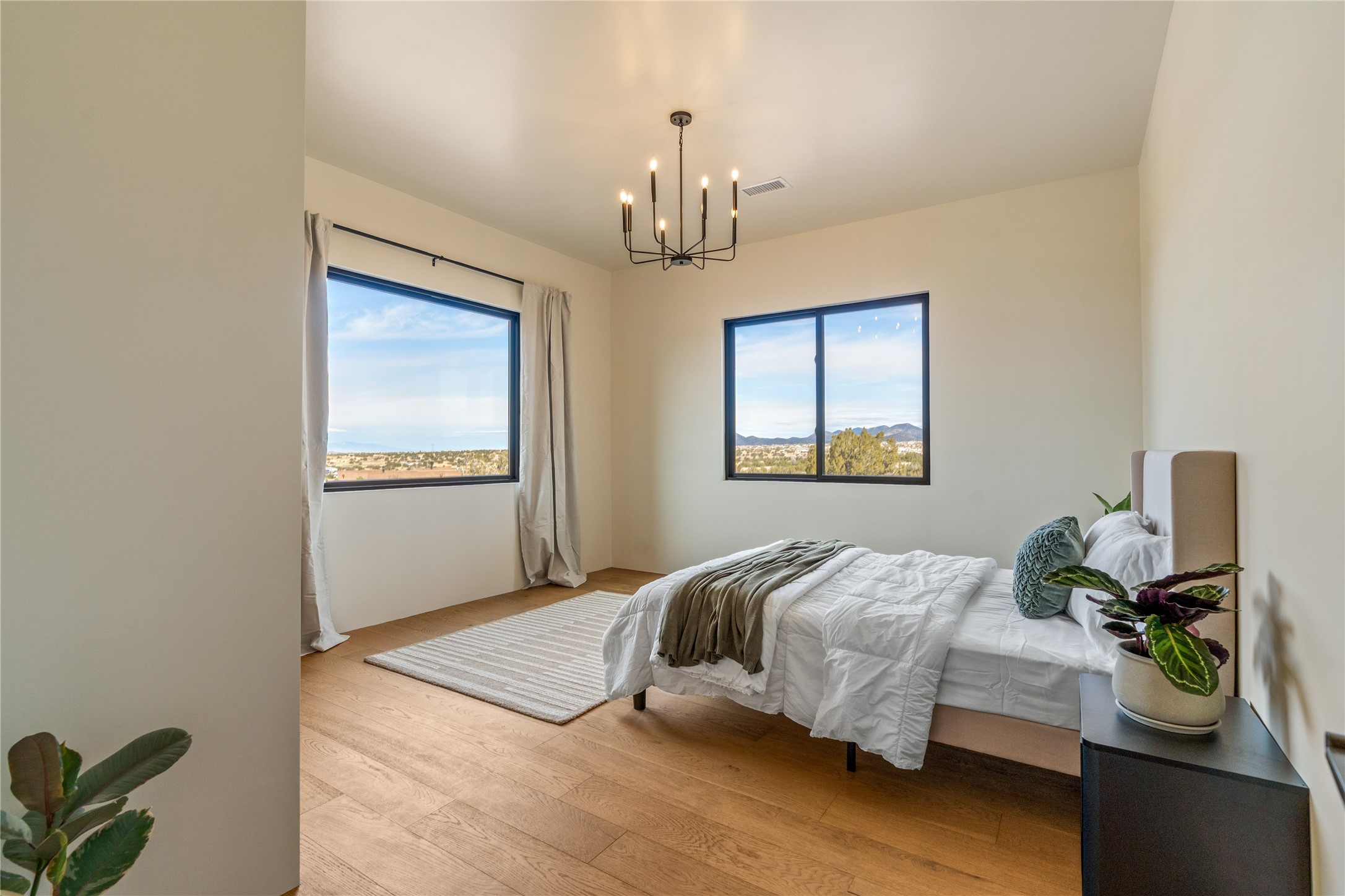 What an incredible place! The views are outstanding! Here you have 6.19+/- acres on a hilltop with views that reach far to the north and far to the west. At this property you can have an art studio or a business right at your home. There is plumbing and septic, and electric all set up to build another building on this lot. You can build an additional casita or guest house! This home is complete and ready to move into. It has the landscaping done with irrigation. The windows were placed to maximize light as well as mountain views. This modern home has gorgeous elements that also tie in the traditional styles of Santa Fe. There are viga beams in the main open concept living/dining/kitchen area. Both the front and back porches have Fir posts and beams with plenty of space to entertain or just relax and take in the beauty of this place. Watch the weather with a cup of coffee or tea on the back porch. There is a Douglas Fir custom-built modern vanity in the guest bathroom as well. The floors are a gorgeous, real wood engineered white oak. The doors are all a beautiful alder wood. Here you have a certified Green design home with Energy Star appliances, a HERS rating certification, and a very well-insulated house with highly insulated windows. This home comes with A/C and forced air heating, which is great when you want the temperature to adjust right away. Every detail was thought out and selected with a discriminating eye.You must come check this beautiful home out to feel what it will be like to live here.