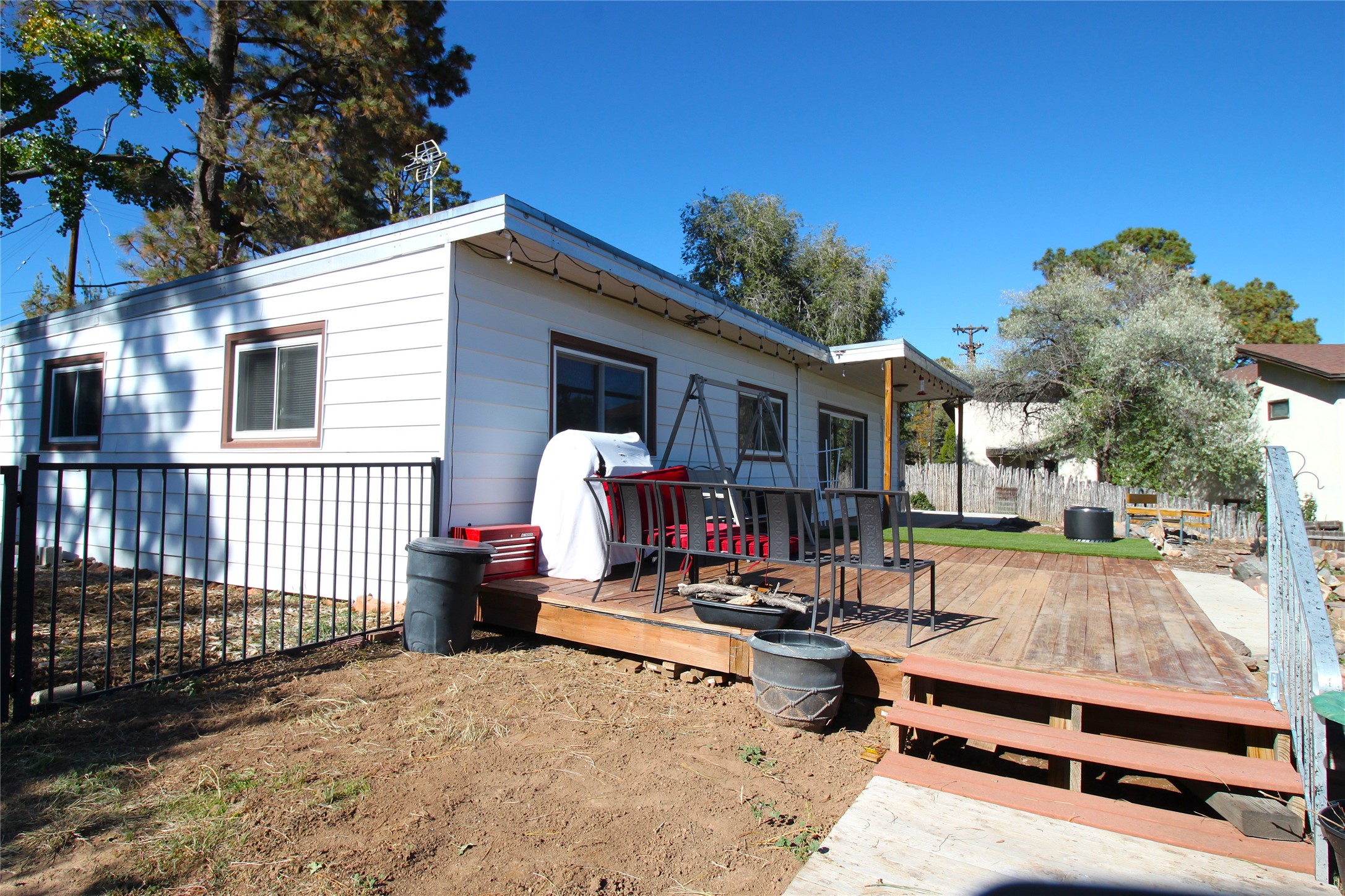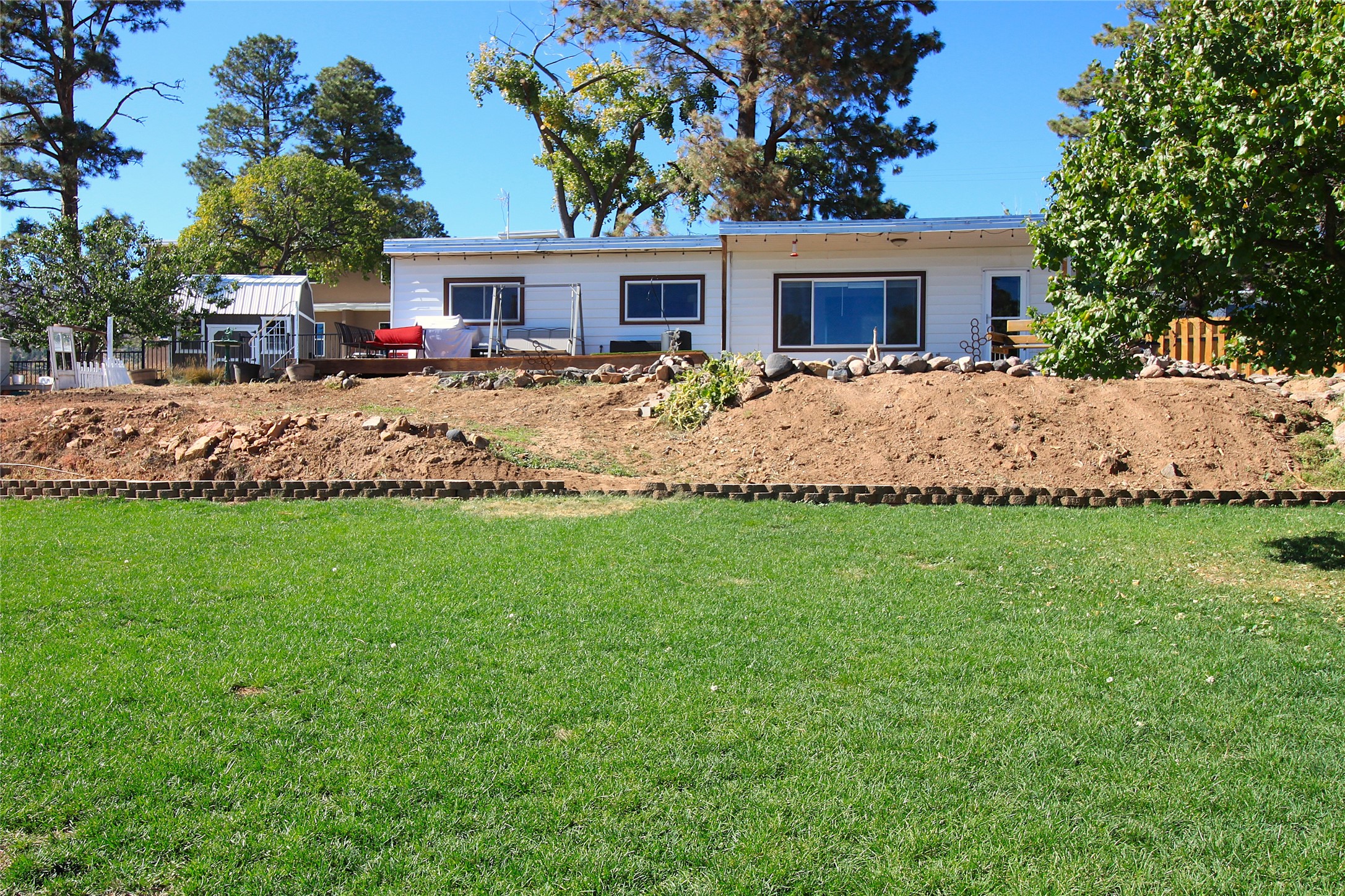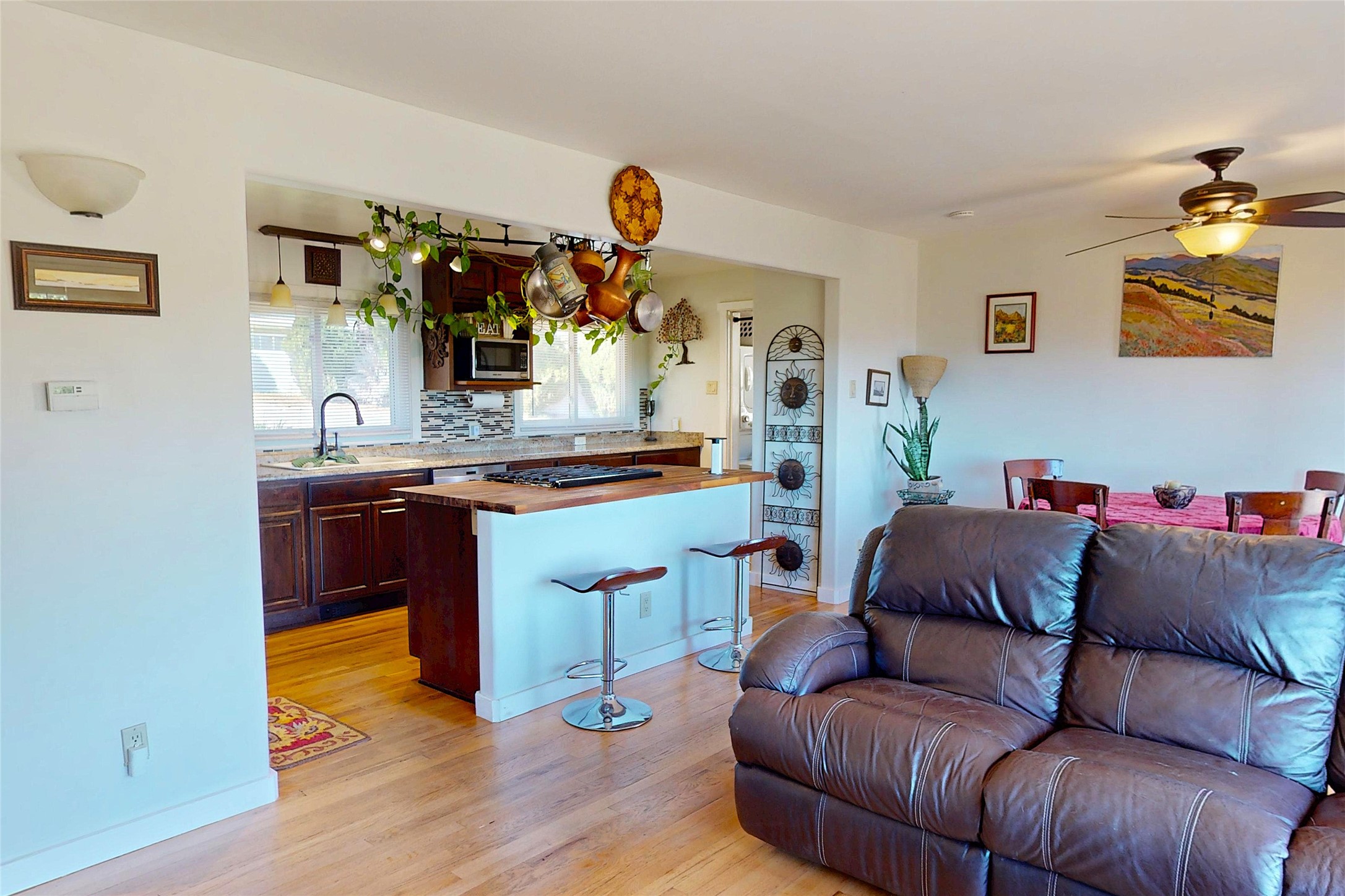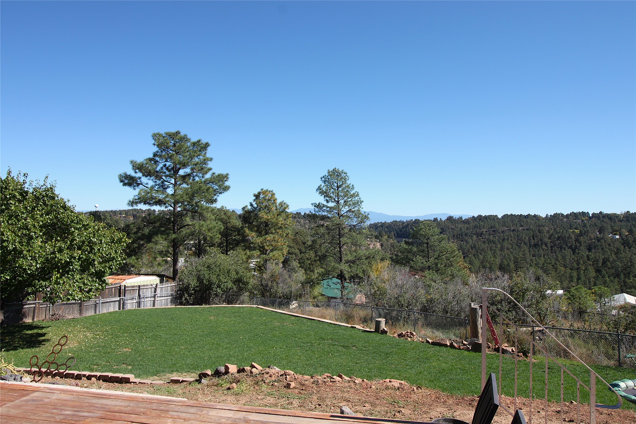 Charming Single-Story Home with Stunning Views and a Spacious Backyard. Welcome to this delightful 3-bedroom, 1-bath single-story home that perfectly blends comfort, functionality, and scenic beauty. Tucked near the end of a quiet street, this property offers peaceful surroundings and sweeping views of Los Alamos, the mountains, and the mesas. Step inside to an inviting open floor plan that seamlessly connects the living, dining and kitchen areas, creating a bright and welcoming space for everyday living or entertaining. Beautiful hard wood floors flow throughout, while large windows fill the home with natural light and frame stunning views. The updated kitchen features rich wood cabinetry, walnut butcherblock countertops, modern appliances, and abundant storage, including a pantry. Just off the kitchen is a laundry area, additional storage and a second freezer. Thoughtful lighting in the kitchen includes track lighting for ambient illumination, under-cabinet lighting for workspaces, and stylish pendant fixtures for added character. Outside, the expansive lot offers endless possibilities for outdoor living, gardening, and play. Enjoy sunrises from the wooden deck, dine al fresco, or relax in the spacious backyard surrounded by established gardens. A sprinkler and drip system with rain delay helps keep the yard easy to maintain. Ample parking includes space for an RV, complete with a convenient 30-amp circuit near the driveway. With close proximity to hiking trails, schools, LANL, and LAMC, this home delivers the ideal blend of Los Alamos tranquility and everyday practicality. Schedule your showing today!