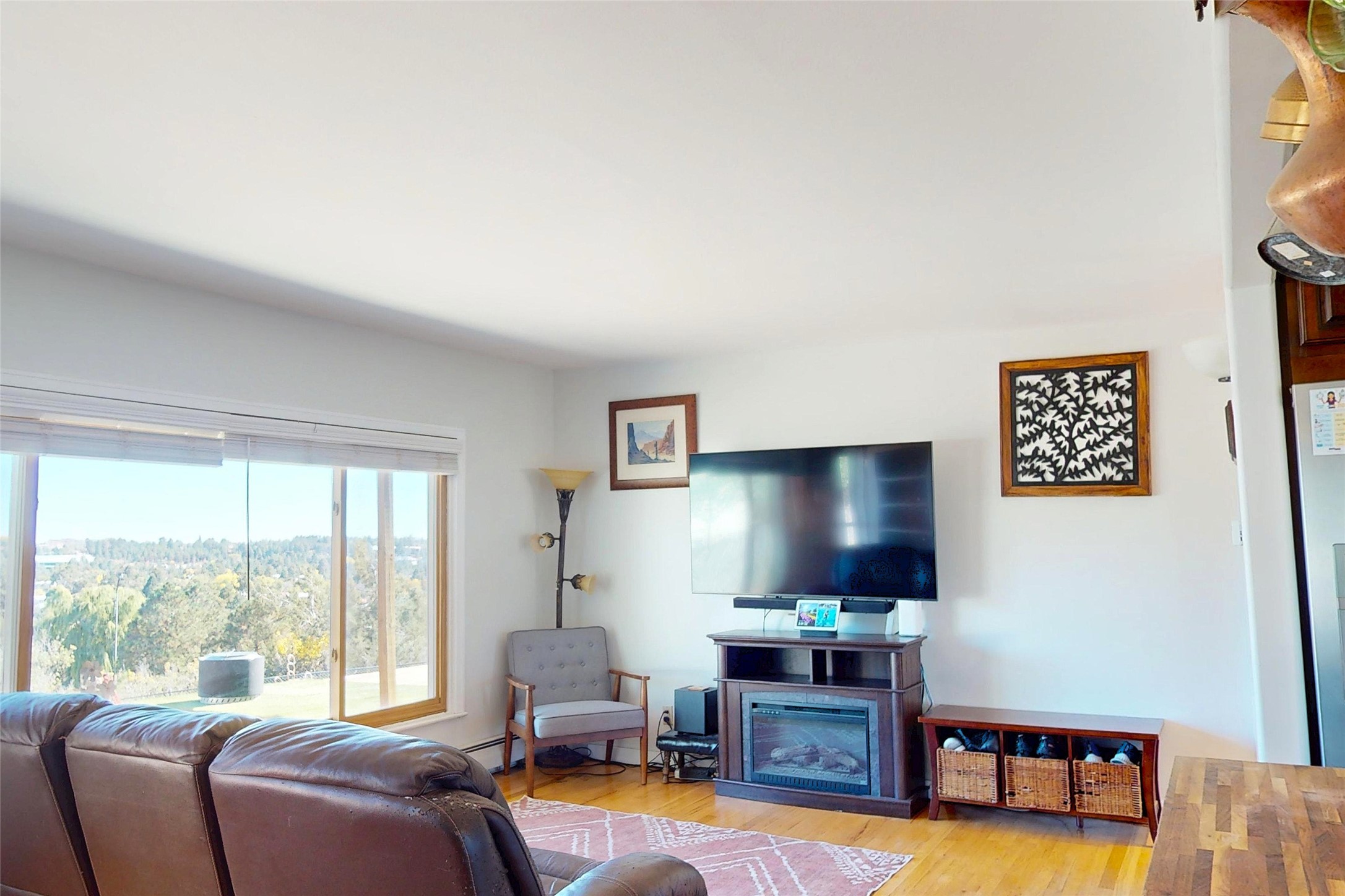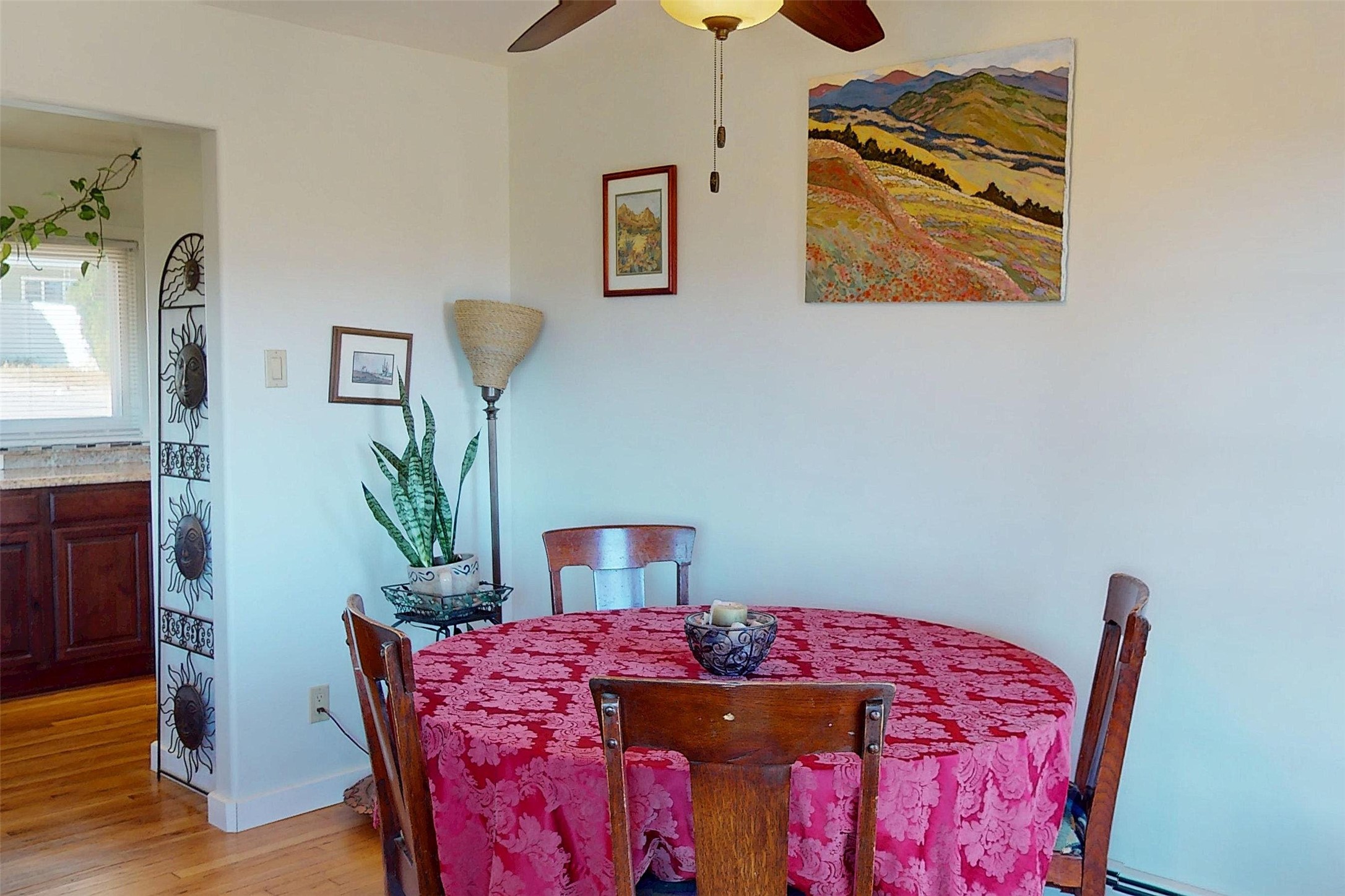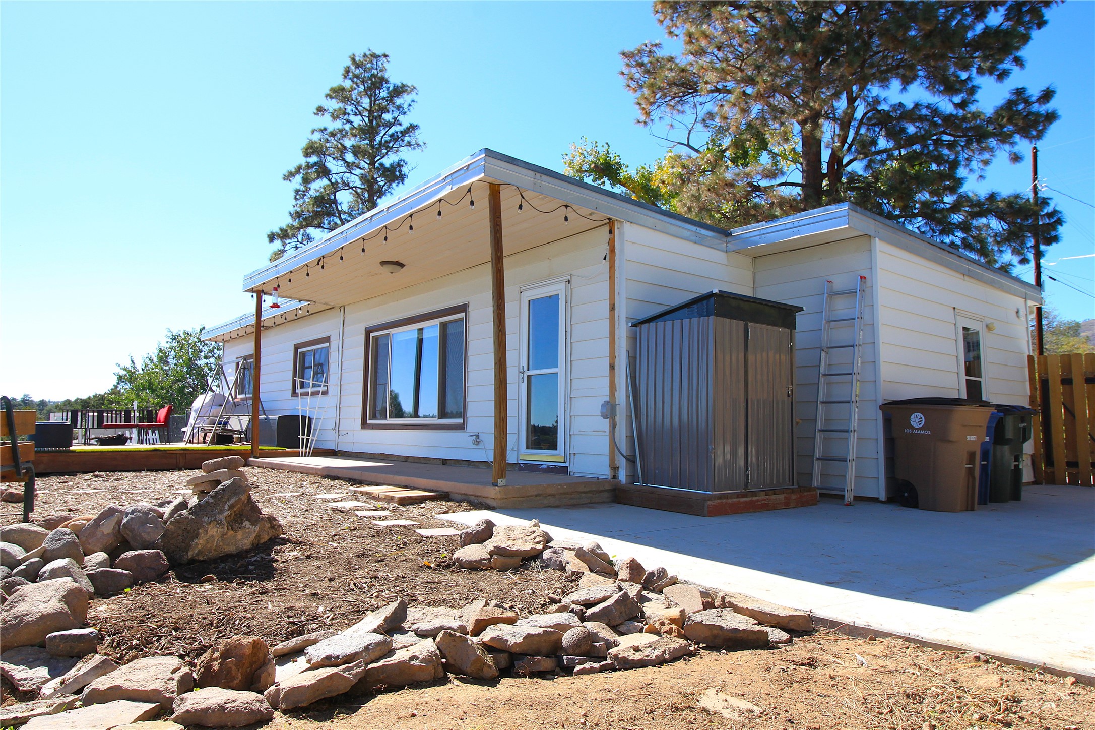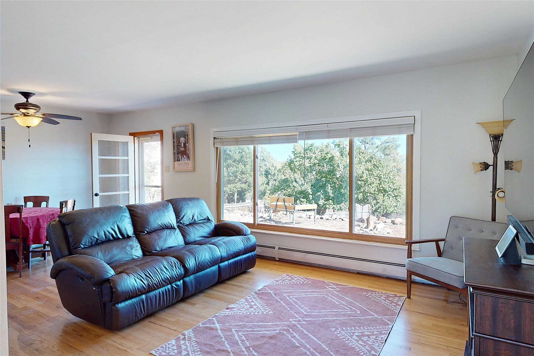 Charming Single-Story Home with Stunning Views and a Spacious Backyard. Welcome to this delightful 3-bedroom, 1-bath single-story home that perfectly blends comfort, functionality, and scenic beauty. Tucked near the end of a quiet street, this property offers peaceful surroundings and sweeping views of Los Alamos, the mountains, and the mesas. Step inside to an inviting open floor plan that seamlessly connects the living, dining and kitchen areas, creating a bright and welcoming space for everyday living or entertaining. Beautiful hard wood floors flow throughout, while large windows fill the home with natural light and frame stunning views. The updated kitchen features rich wood cabinetry, walnut butcherblock countertops, modern appliances, and abundant storage, including a pantry. Just off the kitchen is a laundry area, additional storage and a second freezer. Thoughtful lighting in the kitchen includes track lighting for ambient illumination, under-cabinet lighting for workspaces, and stylish pendant fixtures for added character. Outside, the expansive lot offers endless possibilities for outdoor living, gardening, and play. Enjoy sunrises from the wooden deck, dine al fresco, or relax in the spacious backyard surrounded by established gardens. A sprinkler and drip system with rain delay helps keep the yard easy to maintain. Ample parking includes space for an RV, complete with a convenient 30-amp circuit near the driveway. With close proximity to hiking trails, schools, LANL, and LAMC, this home delivers the ideal blend of Los Alamos tranquility and everyday practicality. Schedule your showing today!