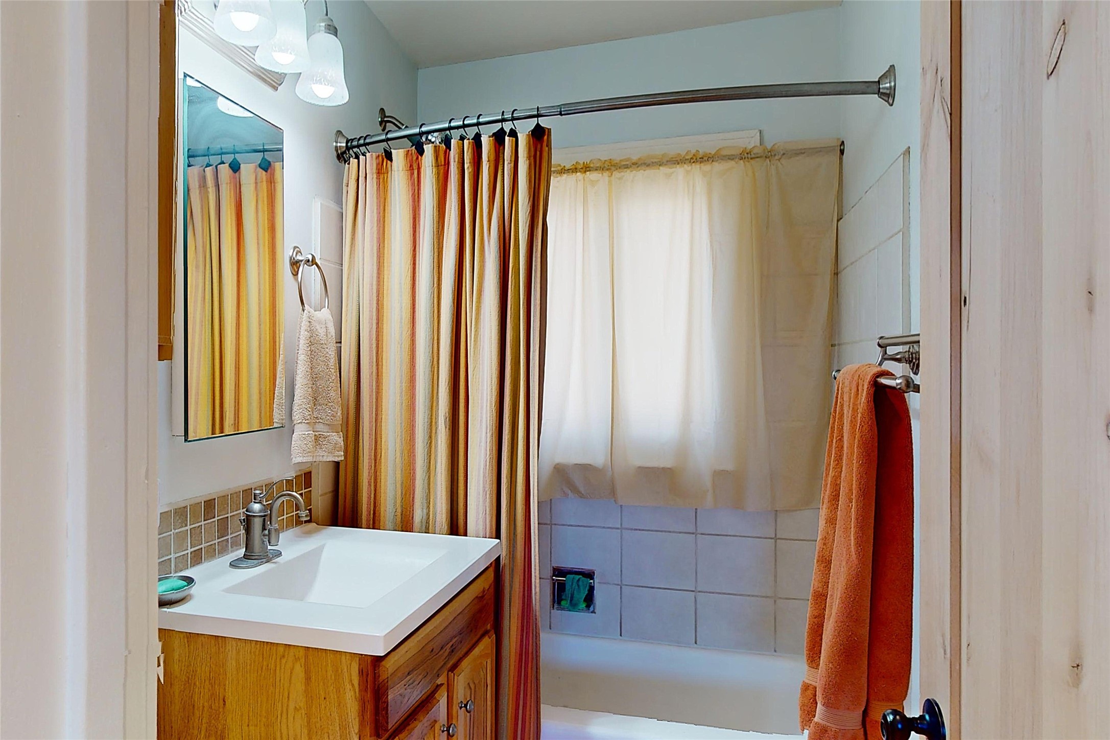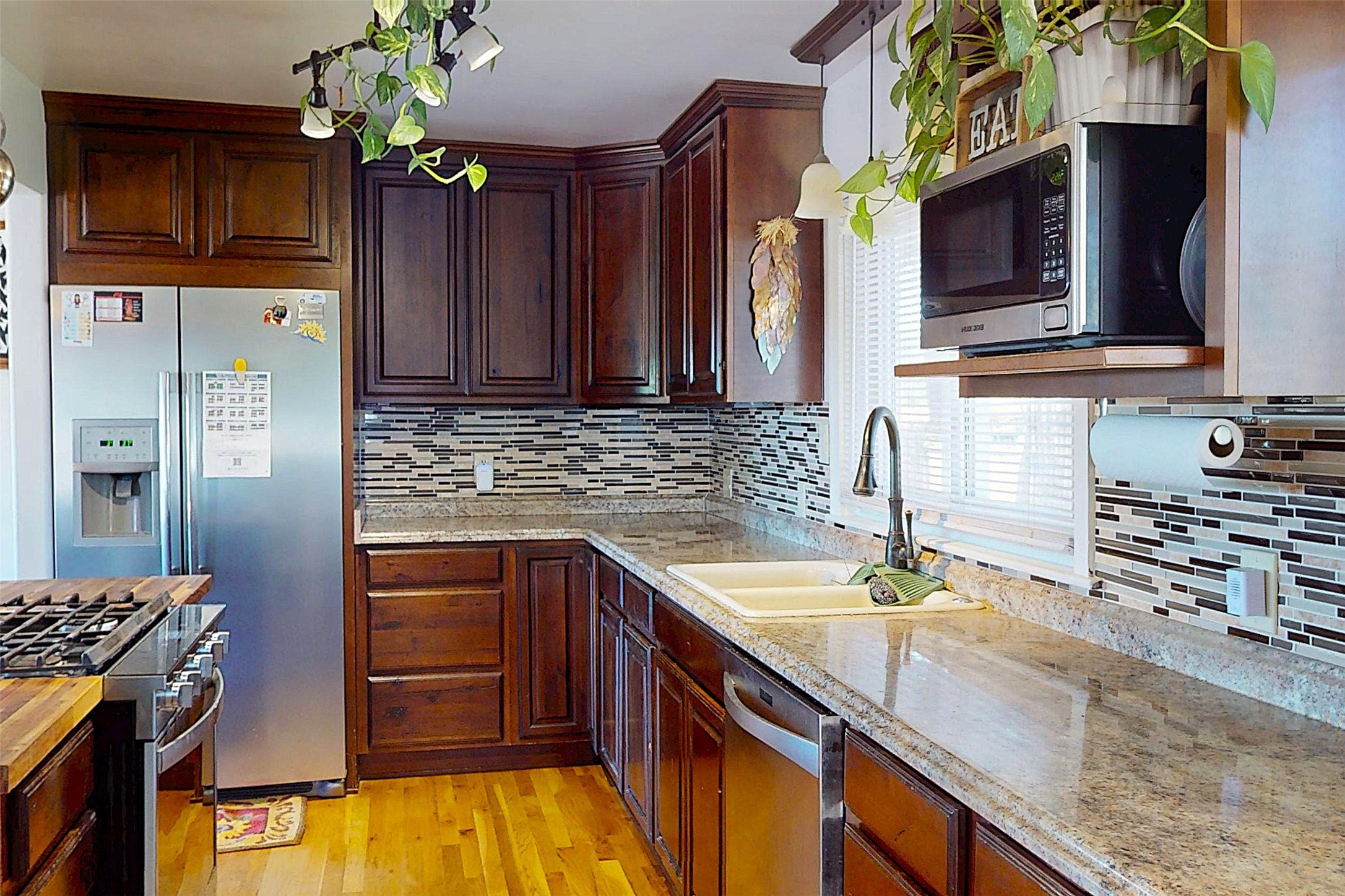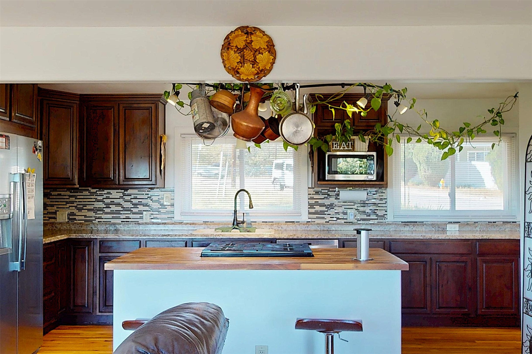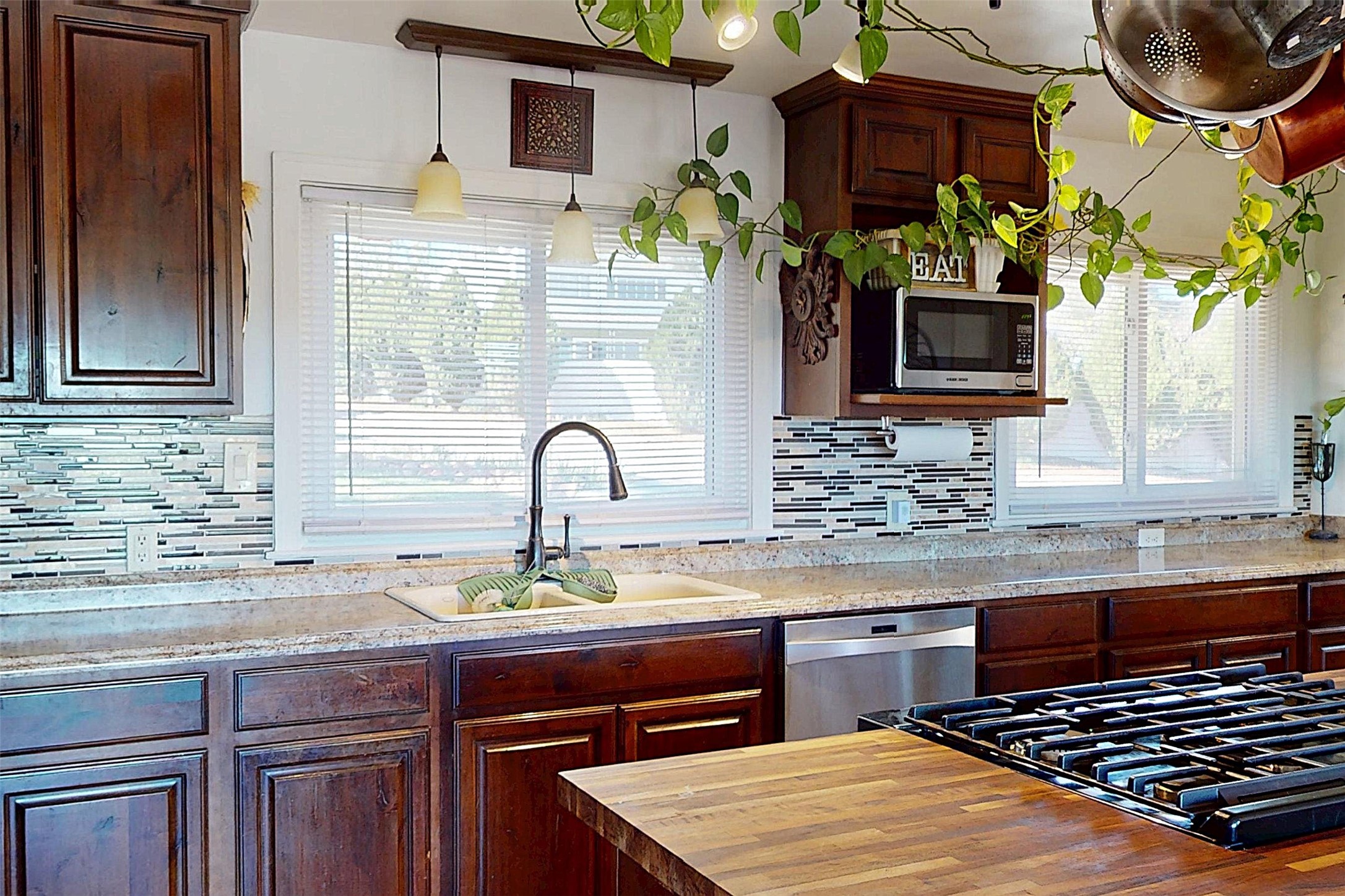 Charming Single-Story Home with Stunning Views and a Spacious Backyard. Welcome to this delightful 3-bedroom, 1-bath single-story home that perfectly blends comfort, functionality, and scenic beauty. Tucked near the end of a quiet street, this property offers peaceful surroundings and sweeping views of Los Alamos, the mountains, and the mesas. Step inside to an inviting open floor plan that seamlessly connects the living, dining and kitchen areas, creating a bright and welcoming space for everyday living or entertaining. Beautiful hard wood floors flow throughout, while large windows fill the home with natural light and frame stunning views. The updated kitchen features rich wood cabinetry, walnut butcherblock countertops, modern appliances, and abundant storage, including a pantry. Just off the kitchen is a laundry area, additional storage and a second freezer. Thoughtful lighting in the kitchen includes track lighting for ambient illumination, under-cabinet lighting for workspaces, and stylish pendant fixtures for added character. Outside, the expansive lot offers endless possibilities for outdoor living, gardening, and play. Enjoy sunrises from the wooden deck, dine al fresco, or relax in the spacious backyard surrounded by established gardens. A sprinkler and drip system with rain delay helps keep the yard easy to maintain. Ample parking includes space for an RV, complete with a convenient 30-amp circuit near the driveway. With close proximity to hiking trails, schools, LANL, and LAMC, this home delivers the ideal blend of Los Alamos tranquility and everyday practicality. Schedule your showing today!
