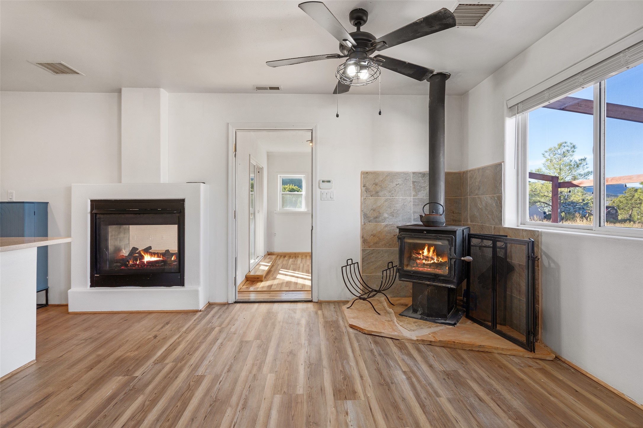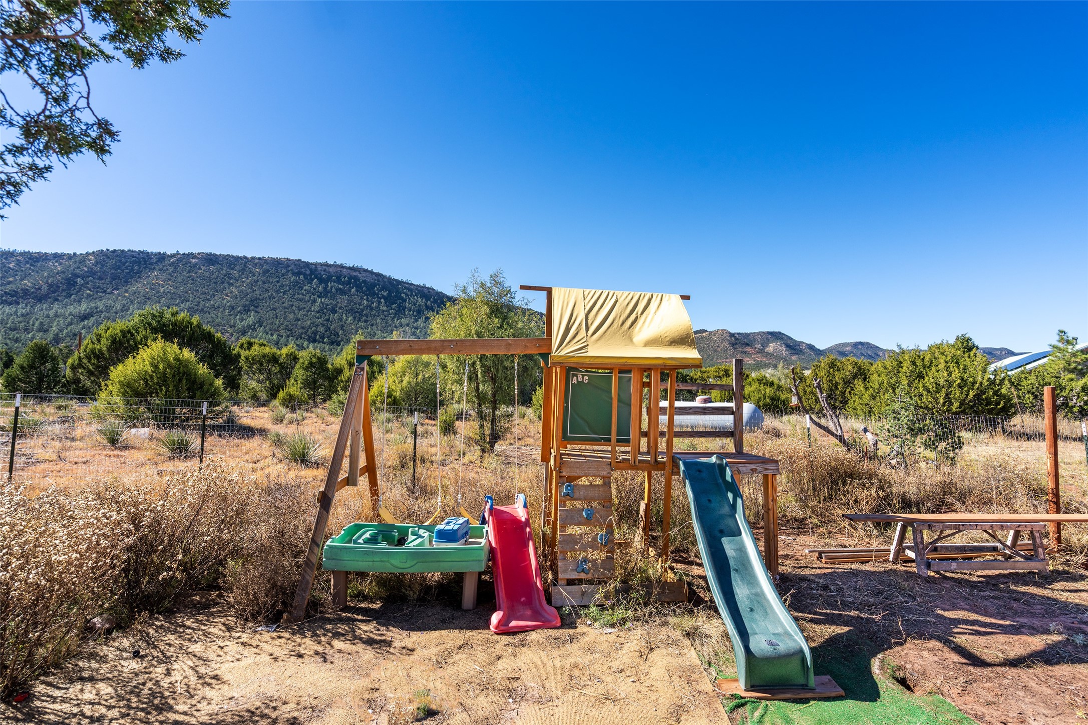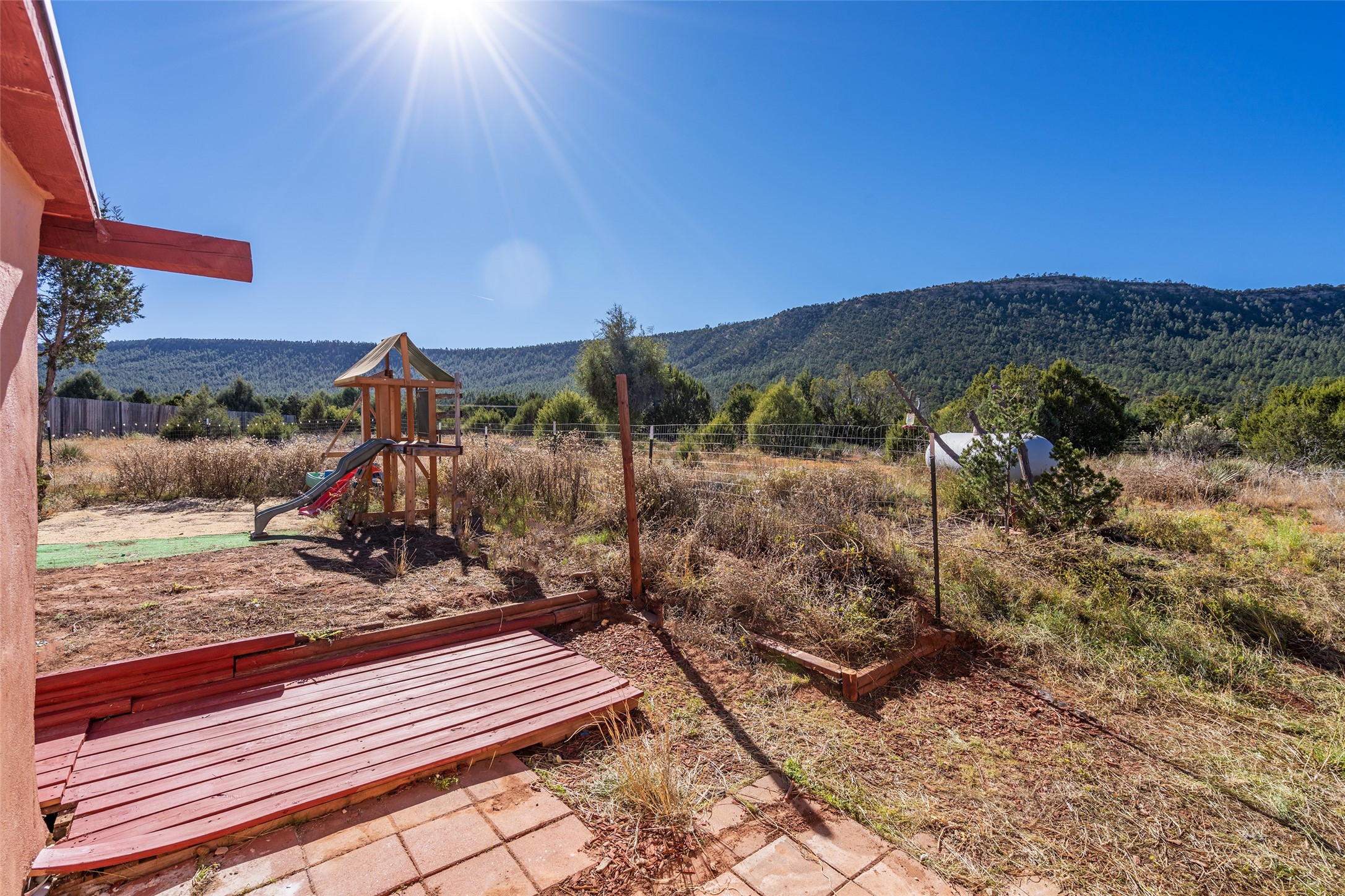 Nestled in serene Rowe area, this delightful energy-efficient home offers a rare opportunity to enjoy 1.39 +/- acres of peace and privacy, just 25 minutes from Santa Fe, this property is designed for comfort all year round. This well-maintained residence includes two spacious bedrooms and one and three-quarter baths. The heart of the home boasts a modern kitchen with stainless steel appliances. A large flex space could make an ideal office, music/art/yoga studio, or even a third bedroom.Triple osmosis water filtration system in kitchen. Water softener. Brand new fridge.The property features a generous fully fenced lot with, Ponderosa Pine and Fir trees, striking rugged mountain views and a convenient graveled circle driveway. The home includes a large, attached 2-car garage with attic space, and a high producing private well drilled in 1999. With no Homeowners Association and minimal CC&Rs, this is a perfect choice for buyers looking for a complete, move-in-ready property. Don't miss out on this unique opportunity--schedule your showing today!500 Gal propane tank rented from AmerigasSq ft of home not warranted. Any fire in photos added digitally by photographer. Buyer advised to independently verify all items of material consideration, including sq ft and fireplace functionality. Docs and attachments to listing not warranted to be most recent or accurate. See MLS docs for writing an offer. 1-2 trains passing by daily around 2:00-3:00 PM.