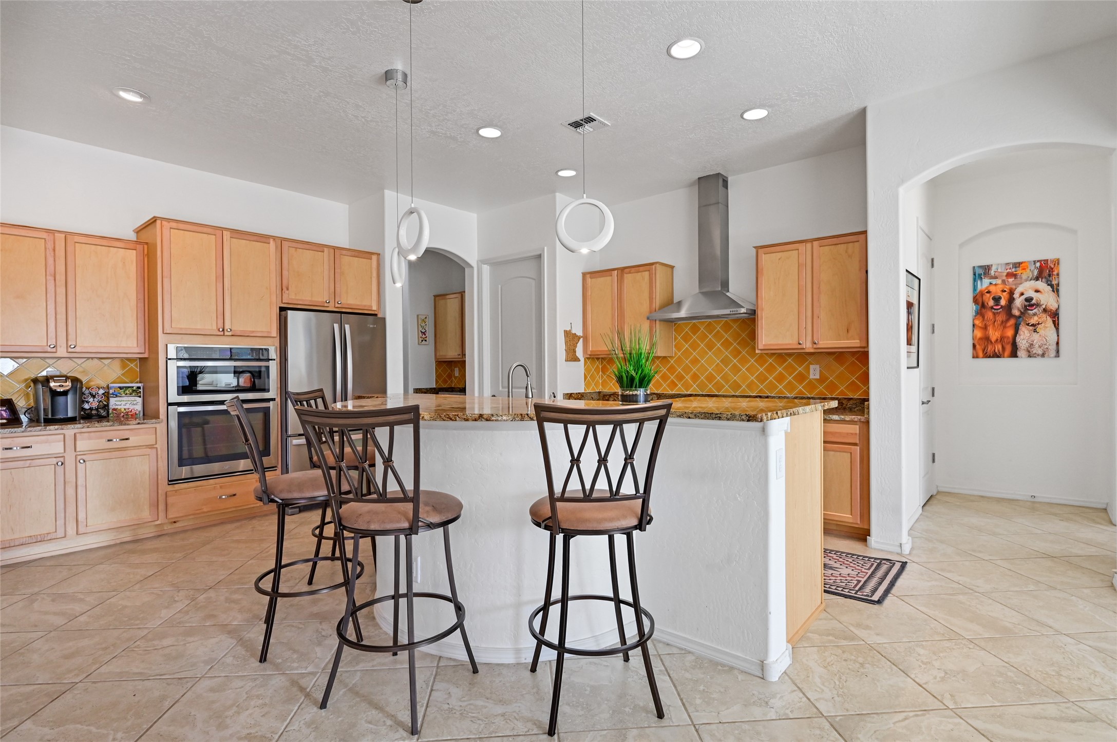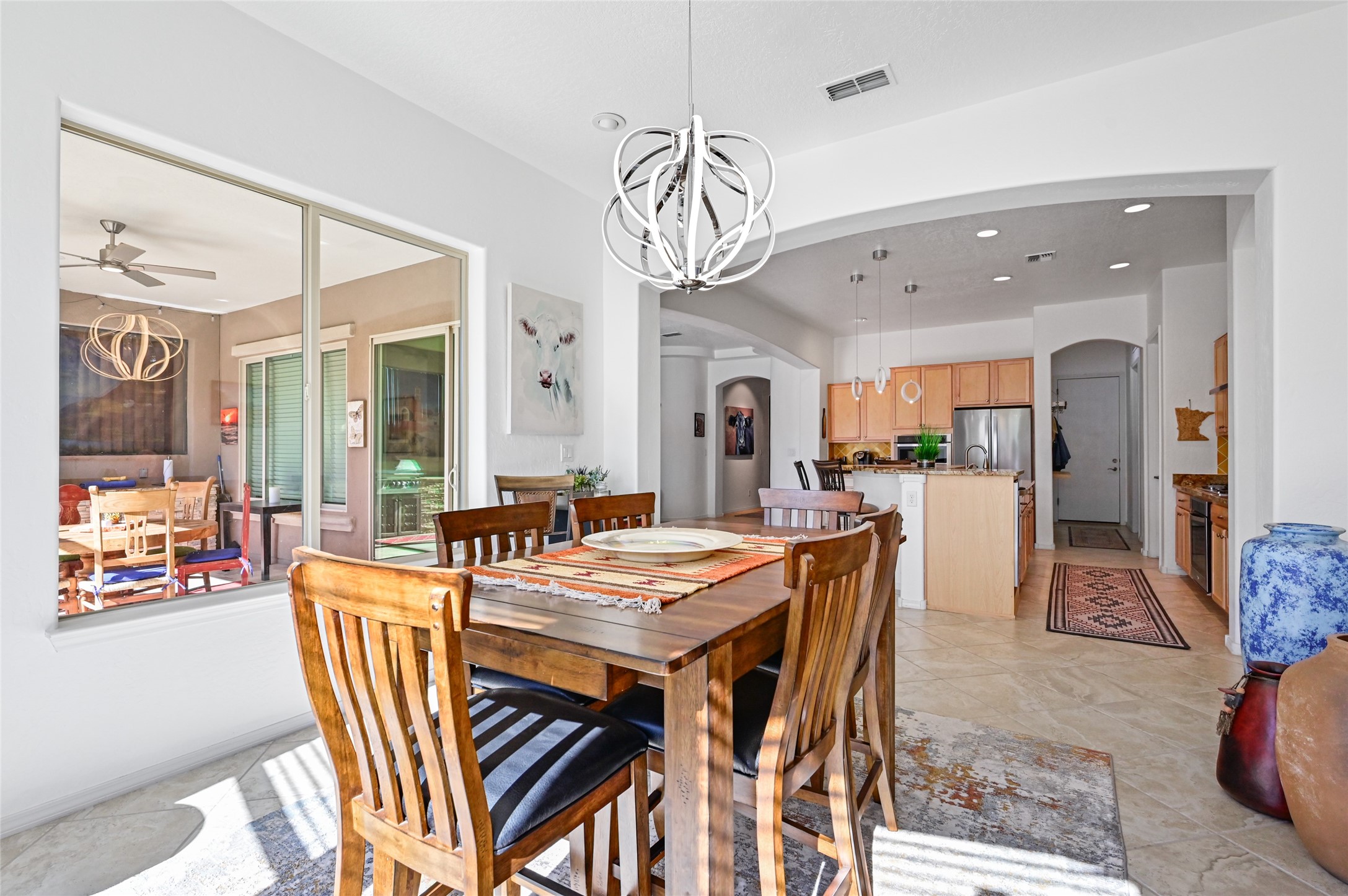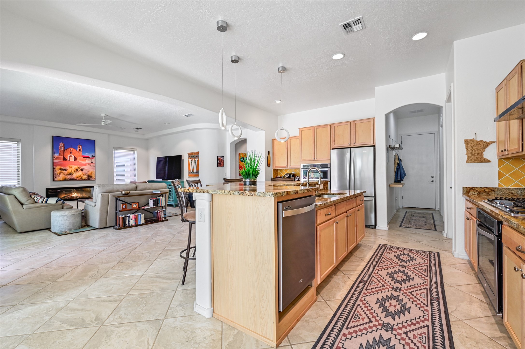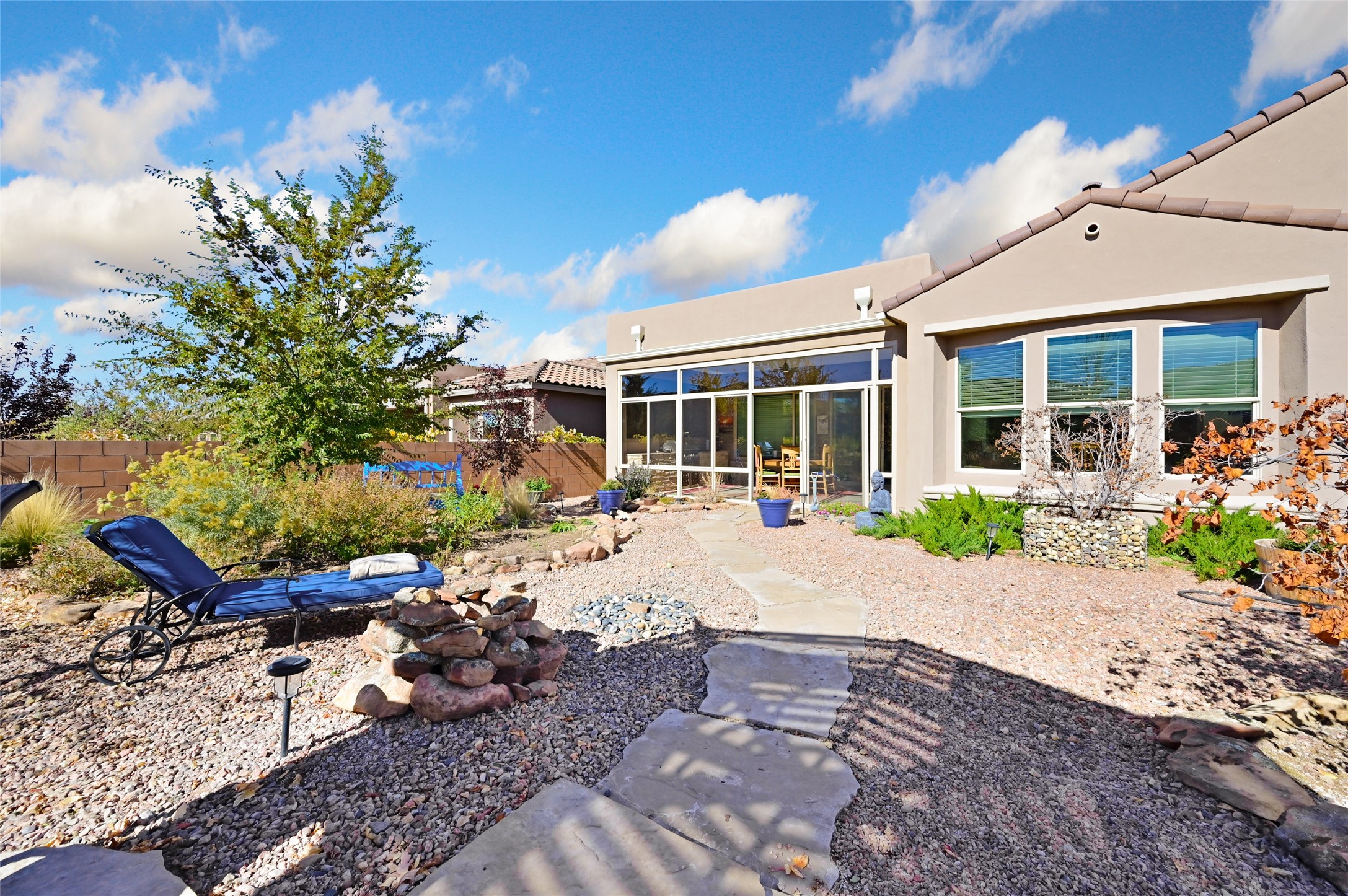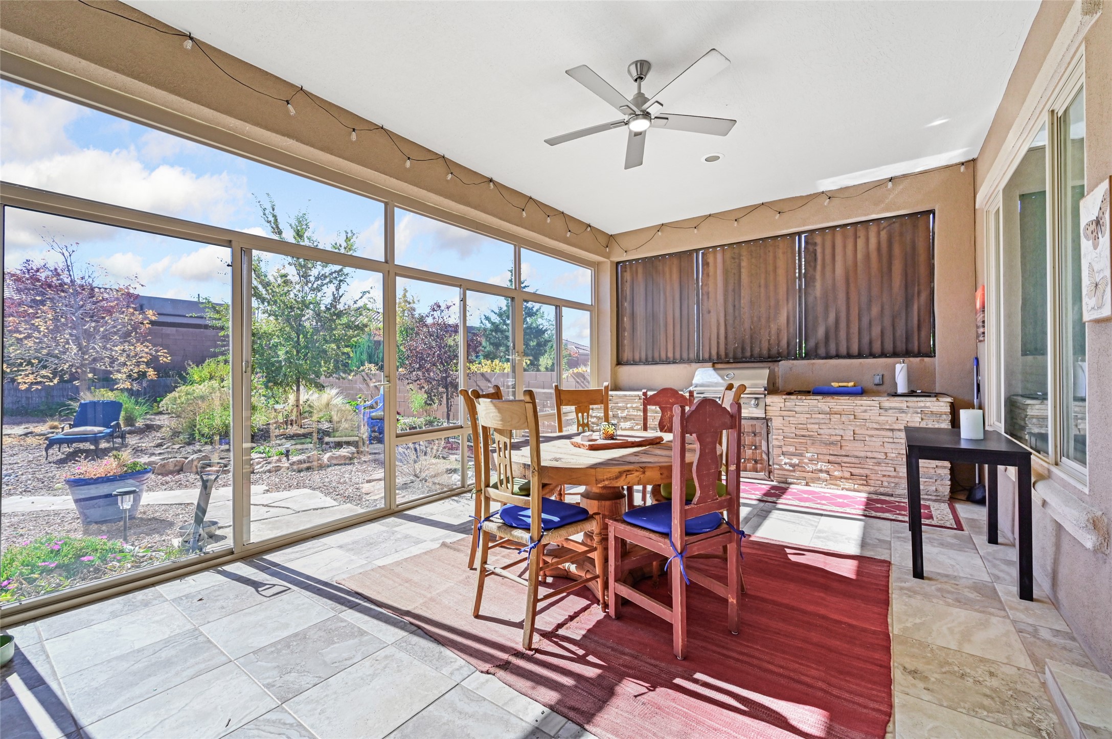 Step Inside Your Dream Home! Welcome to this beautifully designed, single-level retreat featuring 3 spacious bedrooms, a den/office and 2 full bathrooms. Thoughful design with the comfort of refrigerated air conditioning and the stunning scale provided by 10-ft ceilings and 8-ft doors throughout. An open-concept floor plan flows effortlessly from the living room to the kitchen and dining areas. Fall in love with the gourmet kitchen, a true chef's haven! It's equipped with a gas cooktop, two electric ovens, and a brilliantly designed 42-inch island that even features a convenient, elevated dishwasher. A consistent flow of porcelain tile flooring ties the entire home together, offering both beauty and easy upkeep. A Retreat for Everyone. You'll find the tranquil primary bedroom suite on one end of the home, while the comfortable guest wing is tucked away on the other. A serene enclosed sunroom, complete with windows and screening, features a built-in barbecue grill! An ideal place to unwind while enjoying views of the walled yard. The same luxurious granite countertops you see inside right into the outdoor kitchen area for a sophisticated, continuous look. Outdoor Oasis and Community Perks. The backyard features a custom pergola--the perfect spot to enjoy the beautiful Southwest Garden. And the community adds value with a great jogging path just steps away! This home truly brings together style, comfort, and functionality.