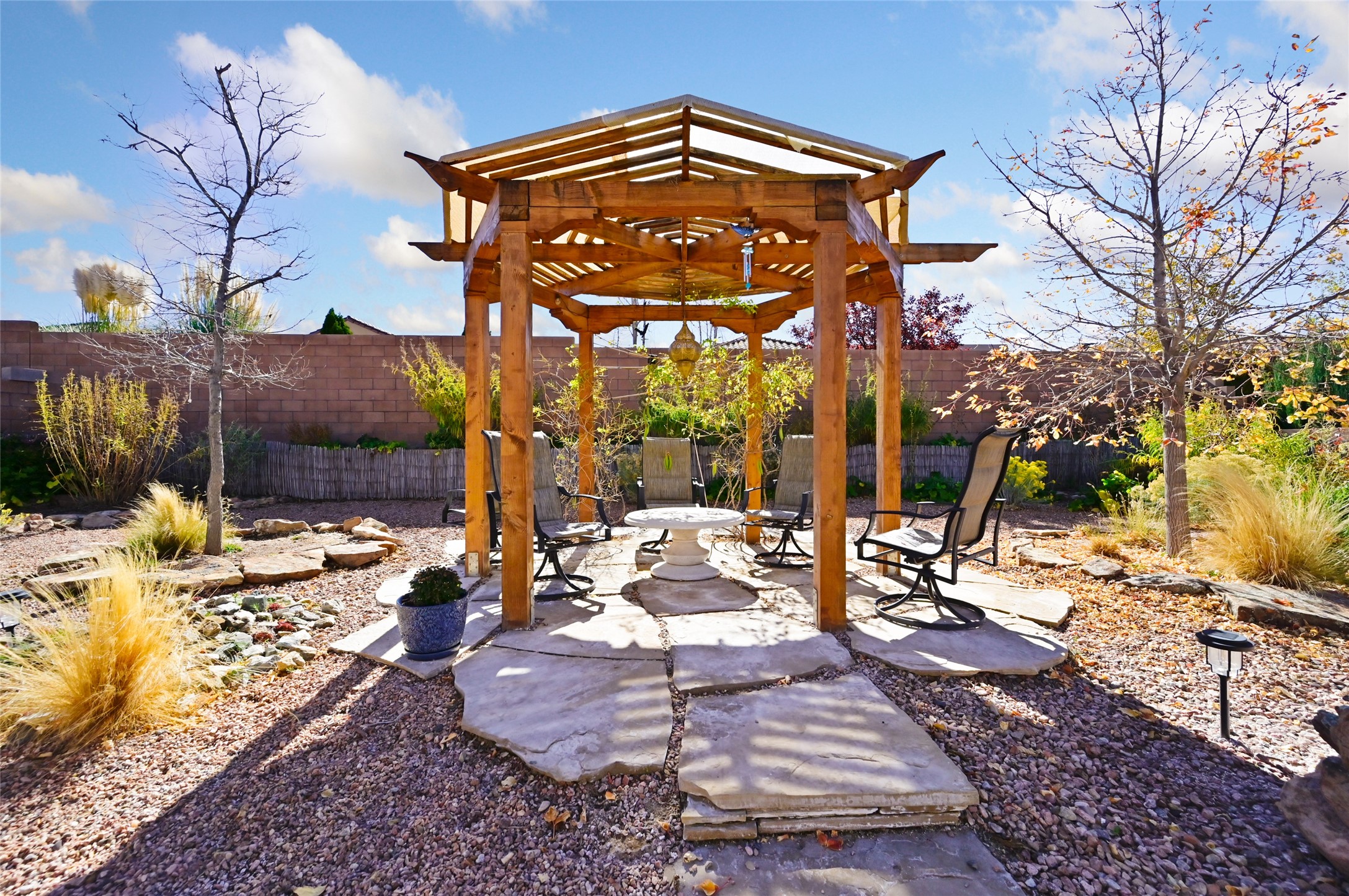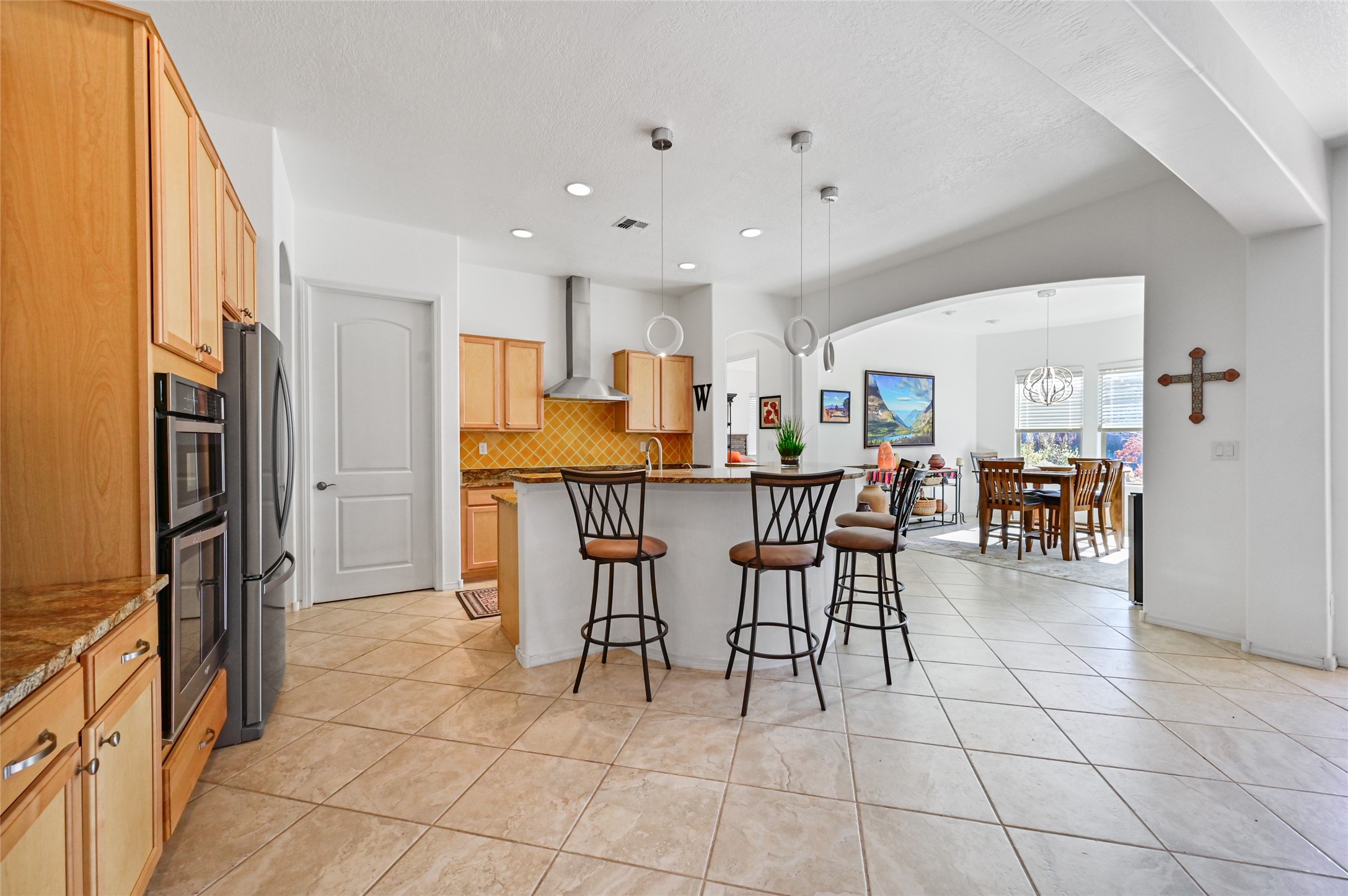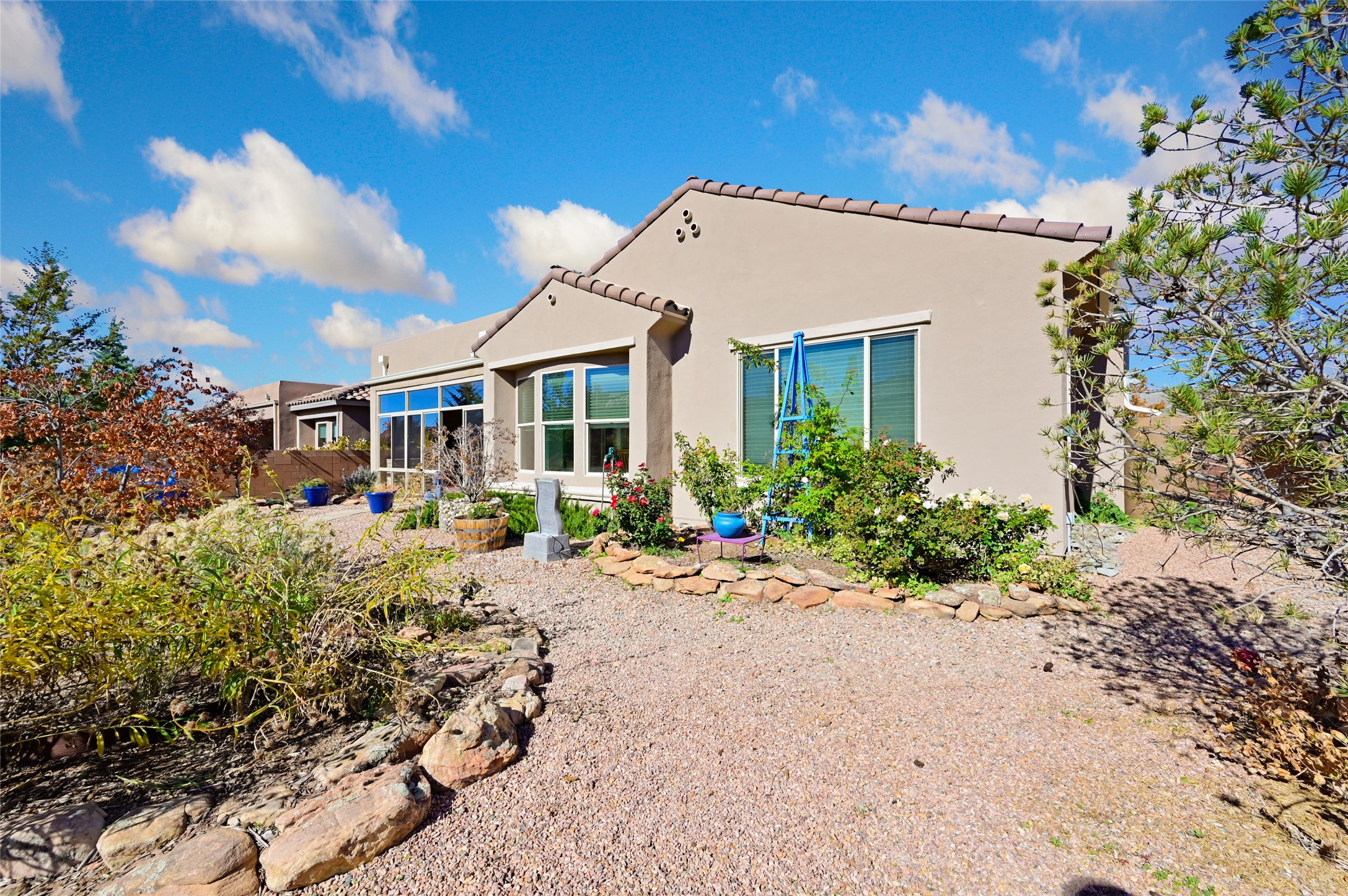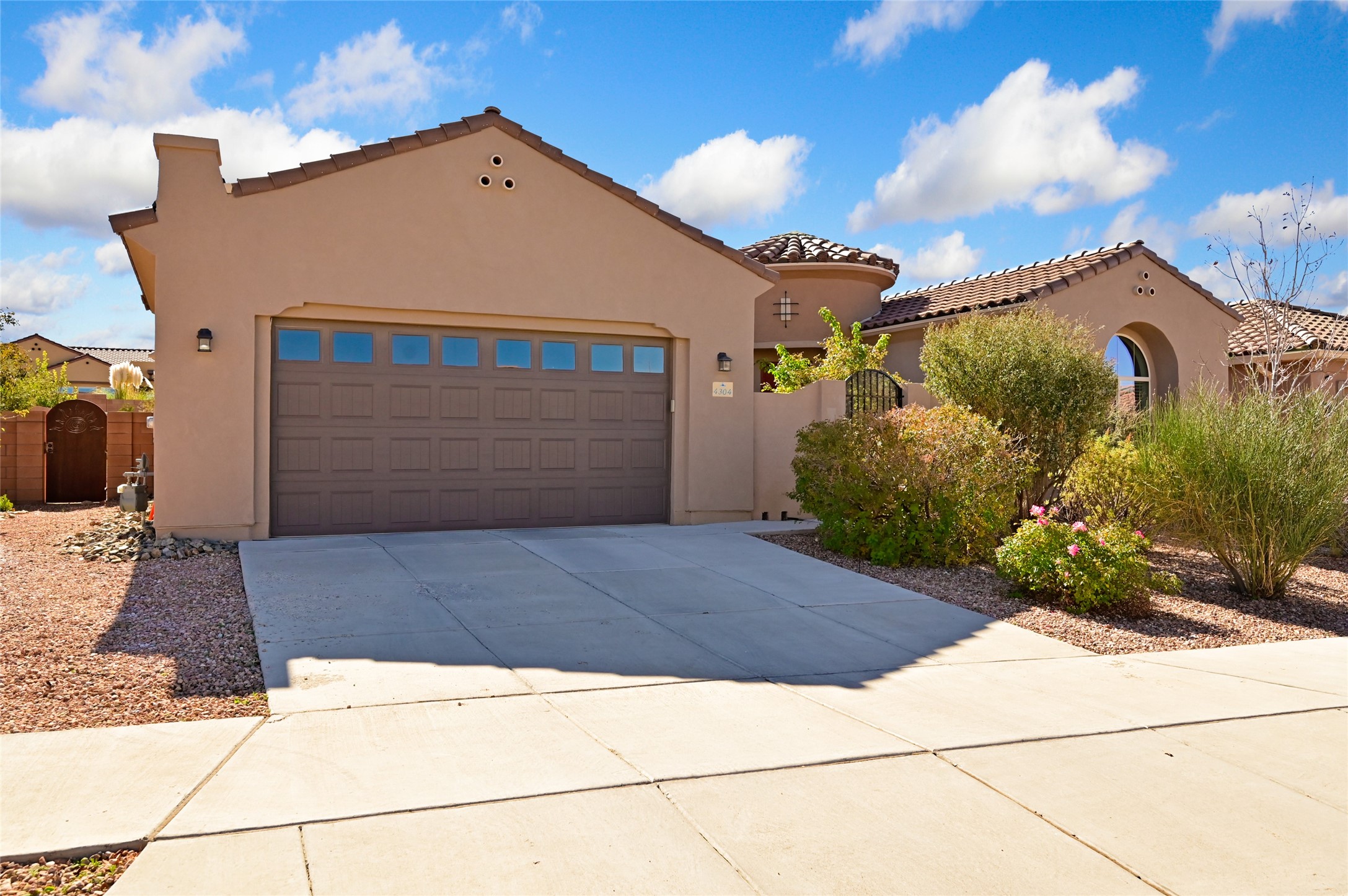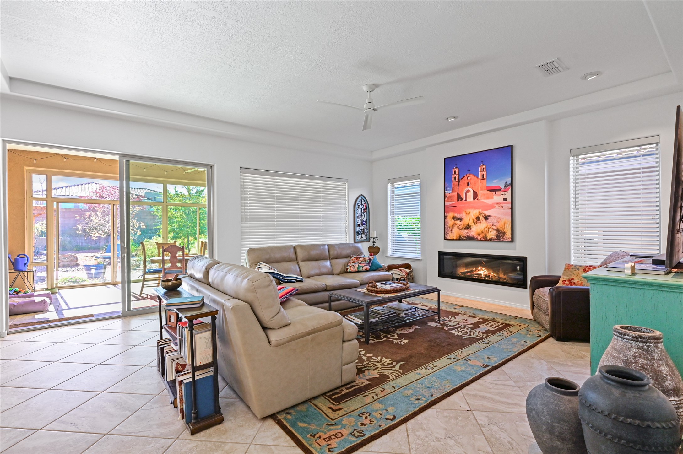 Step Inside Your Dream Home! Welcome to this beautifully designed, single-level retreat featuring 3 spacious bedrooms, a den/office and 2 full bathrooms. Thoughful design with the comfort of refrigerated air conditioning and the stunning scale provided by 10-ft ceilings and 8-ft doors throughout. An open-concept floor plan flows effortlessly from the living room to the kitchen and dining areas. Fall in love with the gourmet kitchen, a true chef's haven! It's equipped with a gas cooktop, two electric ovens, and a brilliantly designed 42-inch island that even features a convenient, elevated dishwasher. A consistent flow of porcelain tile flooring ties the entire home together, offering both beauty and easy upkeep. A Retreat for Everyone. You'll find the tranquil primary bedroom suite on one end of the home, while the comfortable guest wing is tucked away on the other. A serene enclosed sunroom, complete with windows and screening, features a built-in barbecue grill! An ideal place to unwind while enjoying views of the walled yard. The same luxurious granite countertops you see inside right into the outdoor kitchen area for a sophisticated, continuous look. Outdoor Oasis and Community Perks. The backyard features a custom pergola--the perfect spot to enjoy the beautiful Southwest Garden. And the community adds value with a great jogging path just steps away! This home truly brings together style, comfort, and functionality.