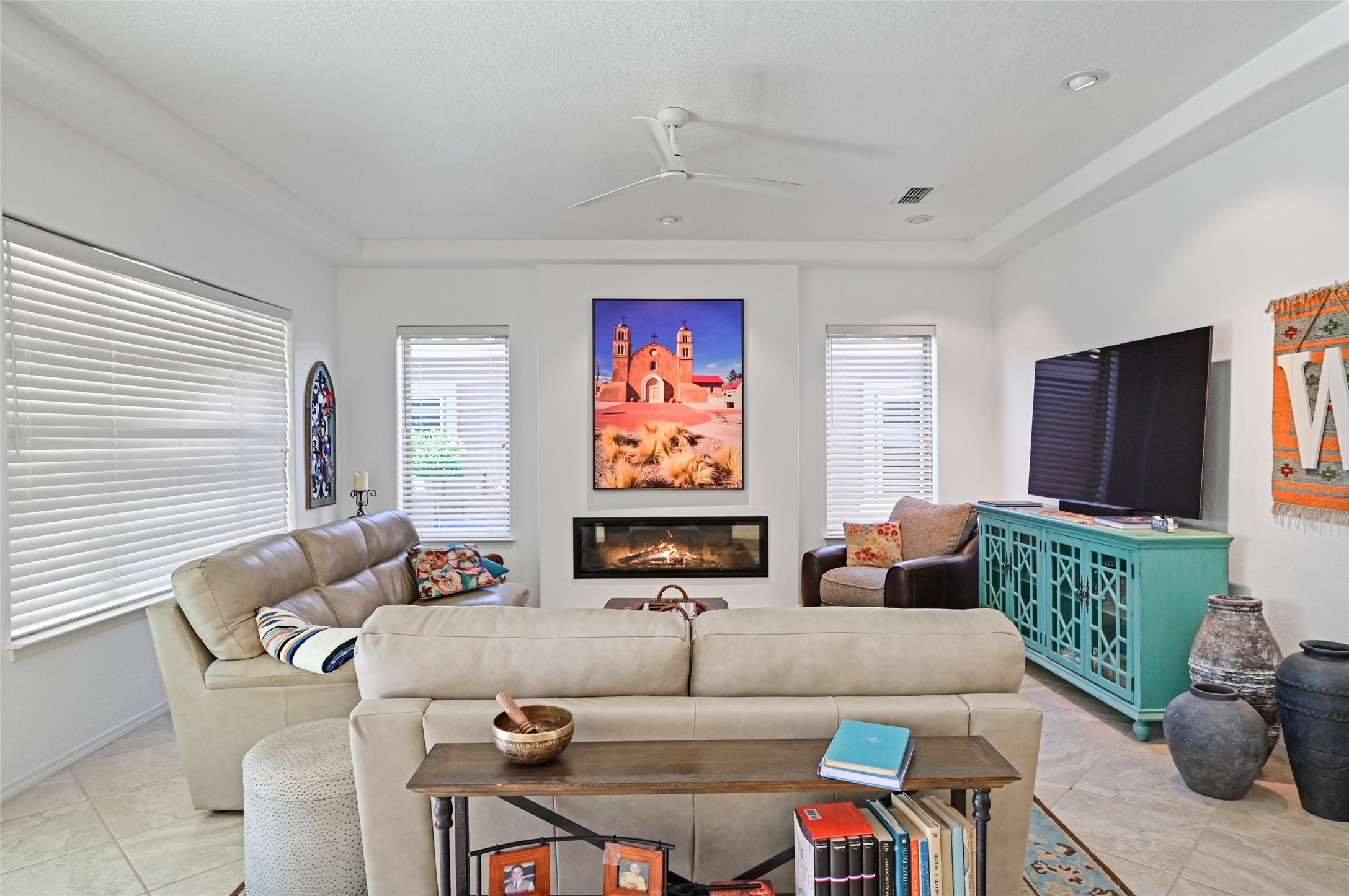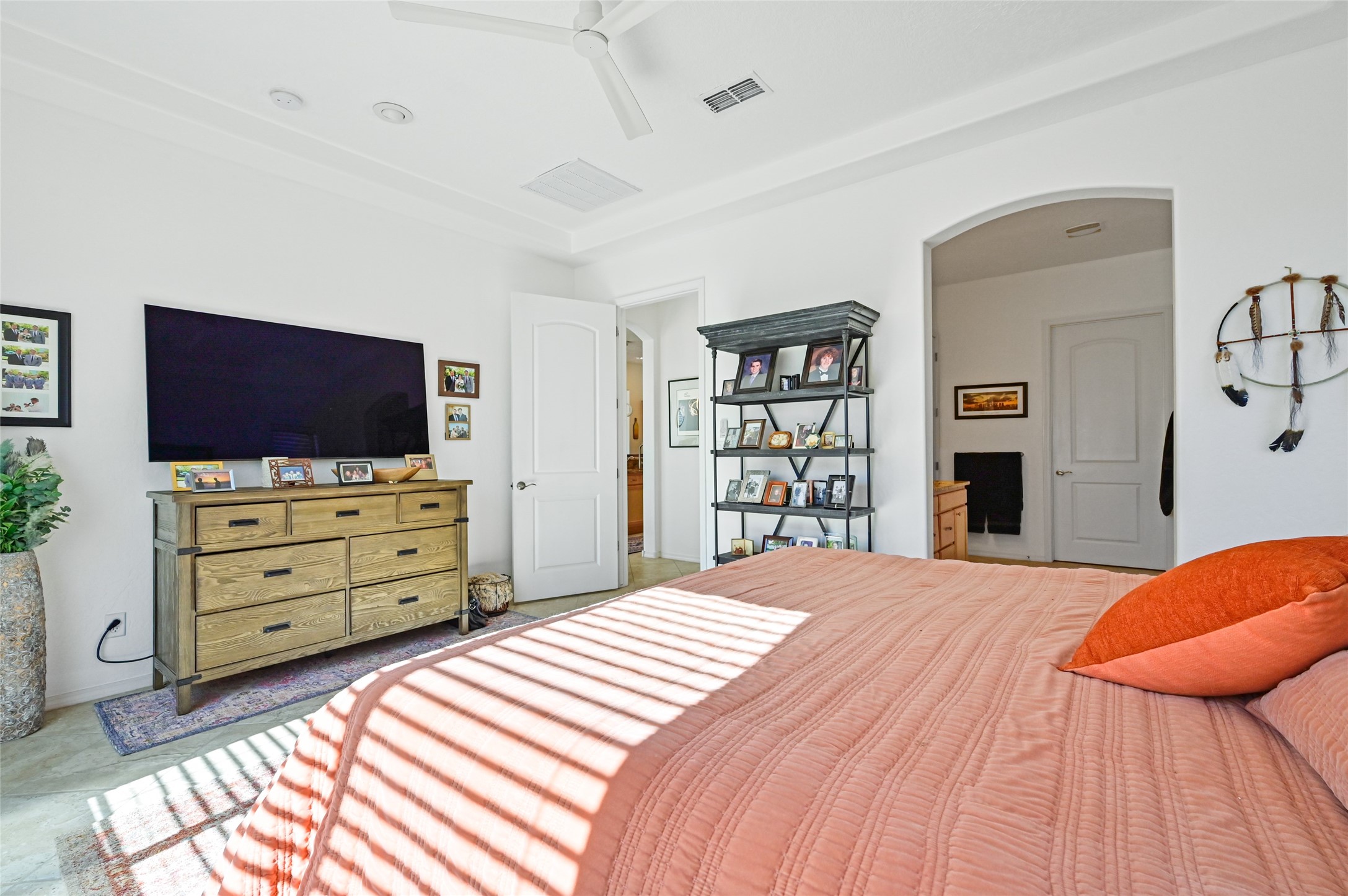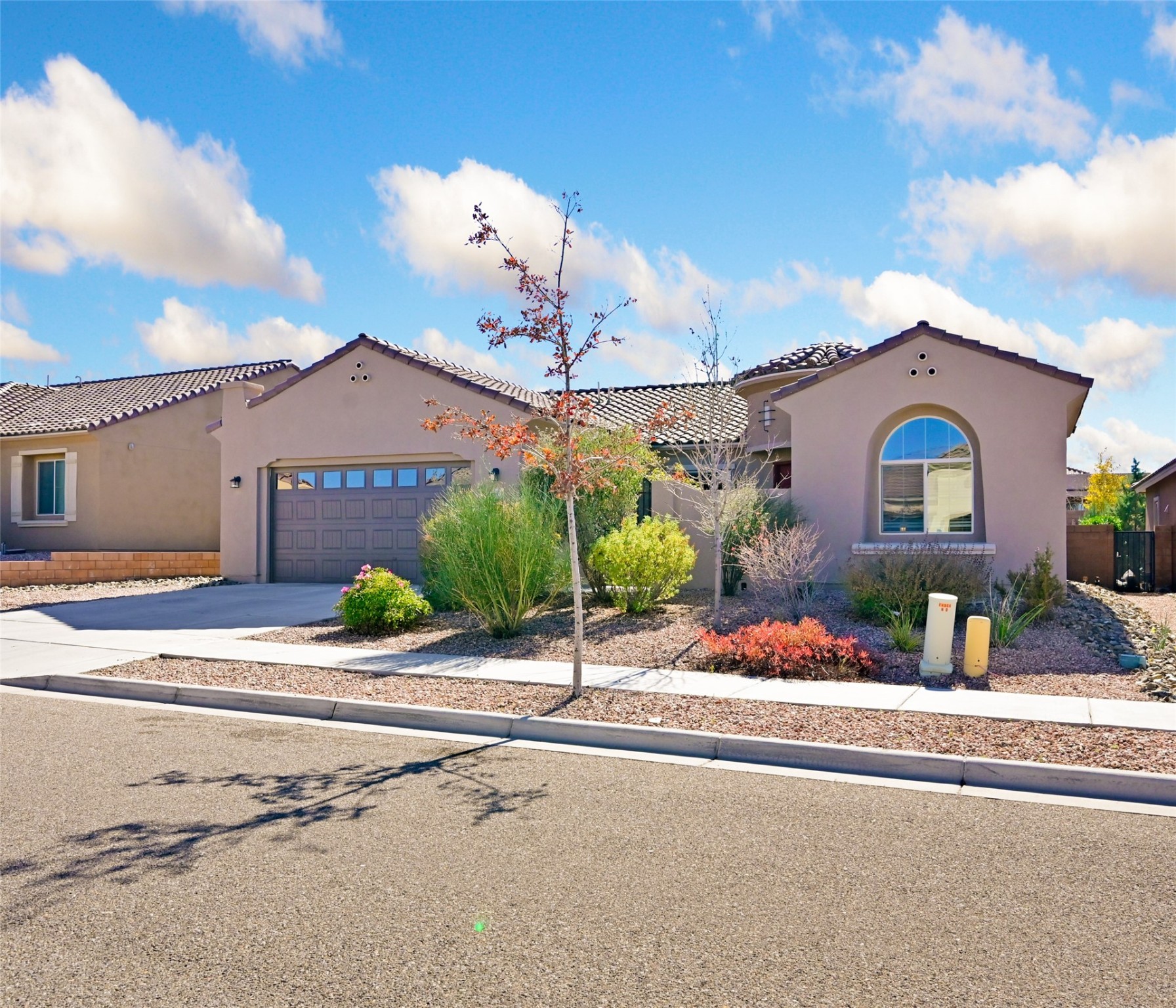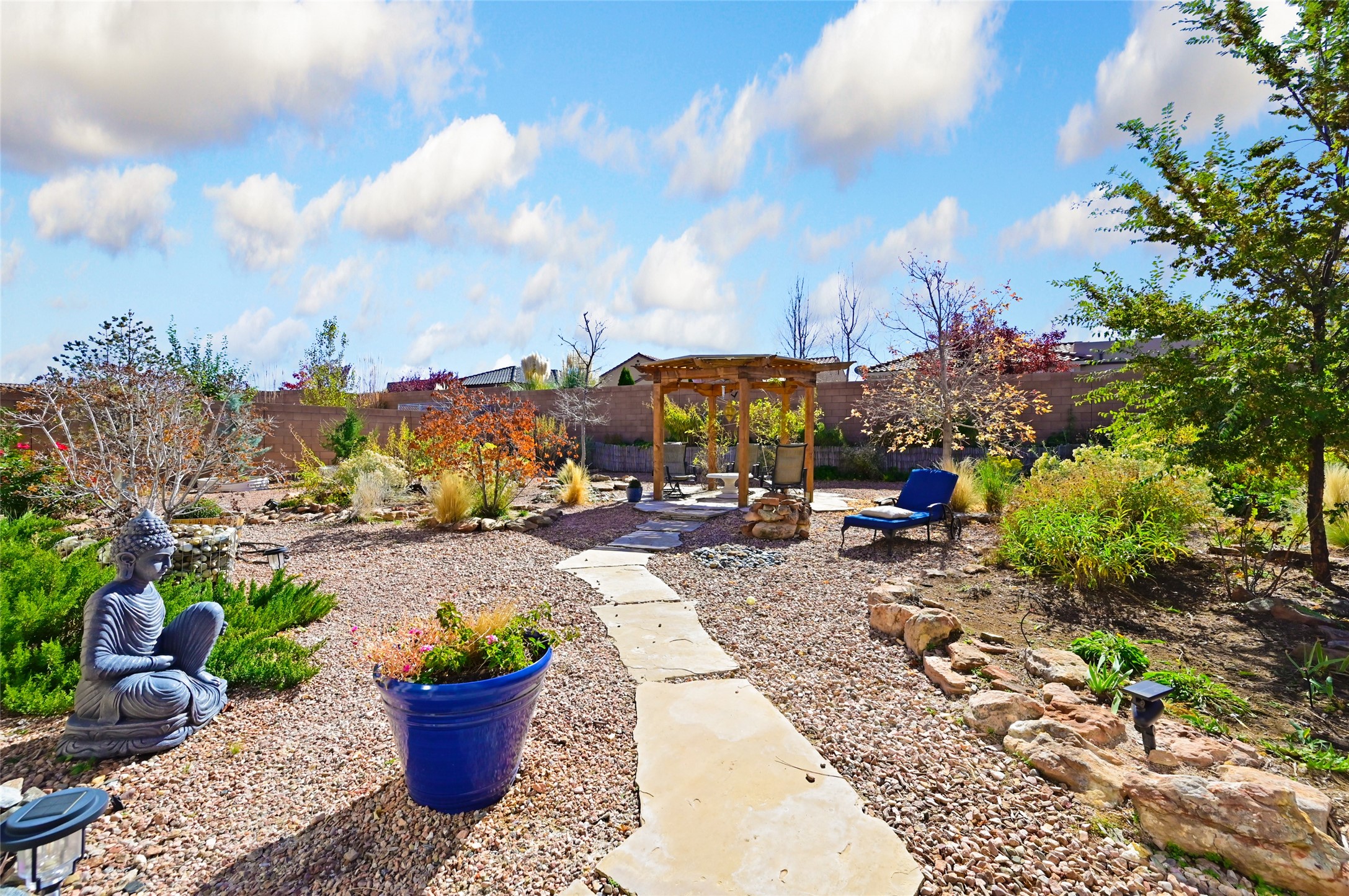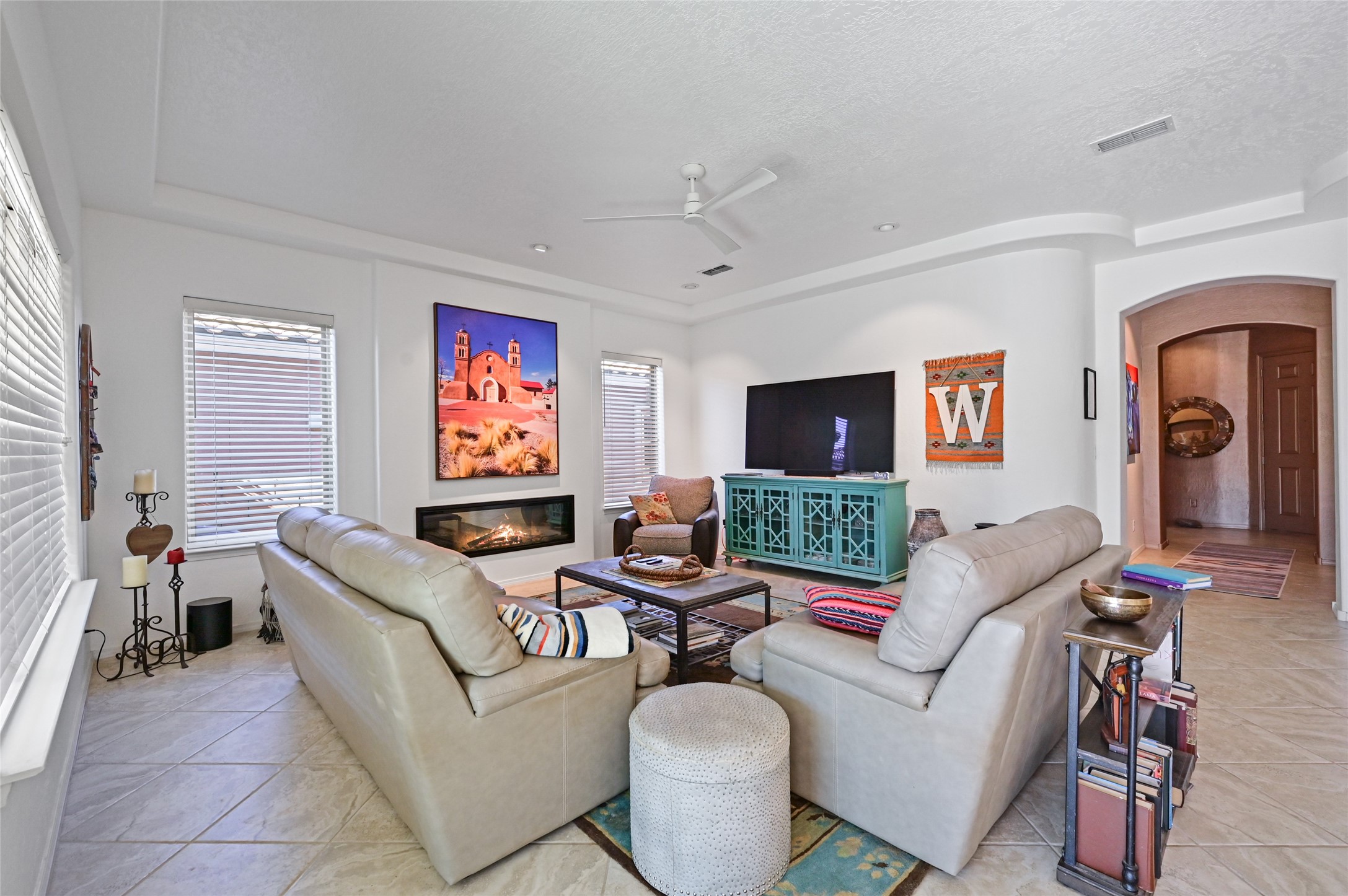 Step Inside Your Dream Home! Welcome to this beautifully designed, single-level retreat featuring 3 spacious bedrooms, a den/office and 2 full bathrooms. Thoughful design with the comfort of refrigerated air conditioning and the stunning scale provided by 10-ft ceilings and 8-ft doors throughout. An open-concept floor plan flows effortlessly from the living room to the kitchen and dining areas. Fall in love with the gourmet kitchen, a true chef's haven! It's equipped with a gas cooktop, two electric ovens, and a brilliantly designed 42-inch island that even features a convenient, elevated dishwasher. A consistent flow of porcelain tile flooring ties the entire home together, offering both beauty and easy upkeep. A Retreat for Everyone. You'll find the tranquil primary bedroom suite on one end of the home, while the comfortable guest wing is tucked away on the other. A serene enclosed sunroom, complete with windows and screening, features a built-in barbecue grill! An ideal place to unwind while enjoying views of the walled yard. The same luxurious granite countertops you see inside right into the outdoor kitchen area for a sophisticated, continuous look. Outdoor Oasis and Community Perks. The backyard features a custom pergola--the perfect spot to enjoy the beautiful Southwest Garden. And the community adds value with a great jogging path just steps away! This home truly brings together style, comfort, and functionality.