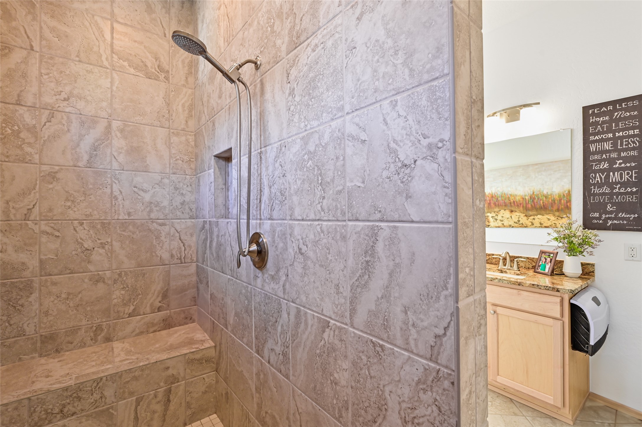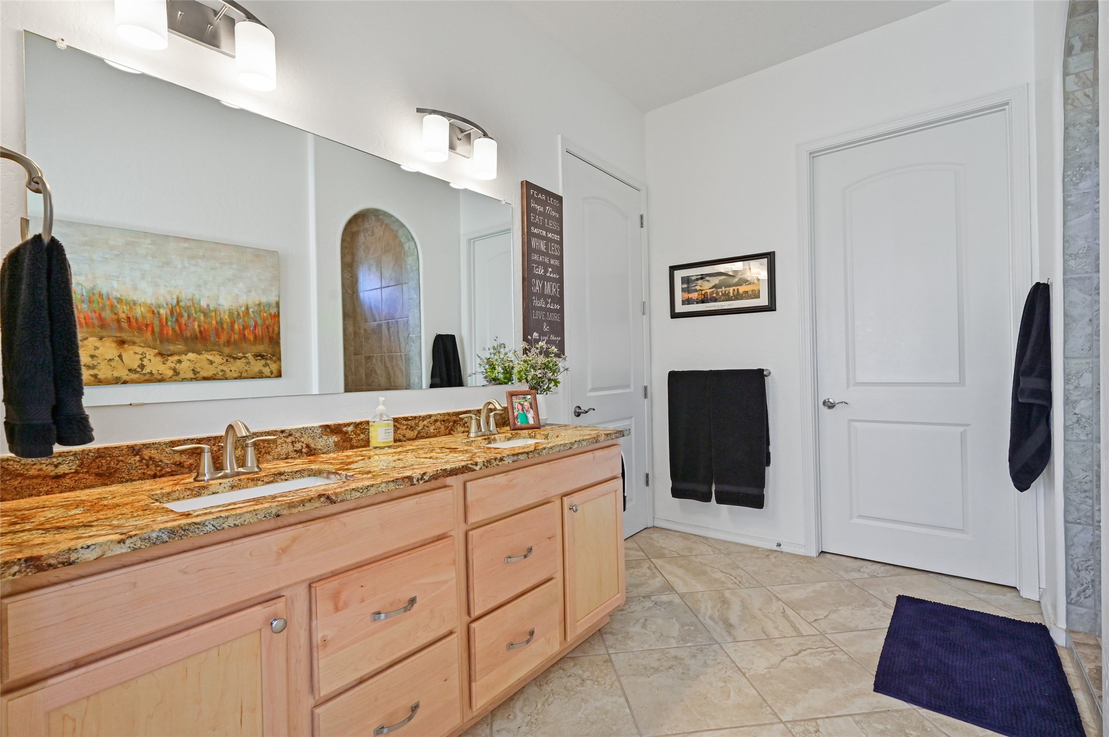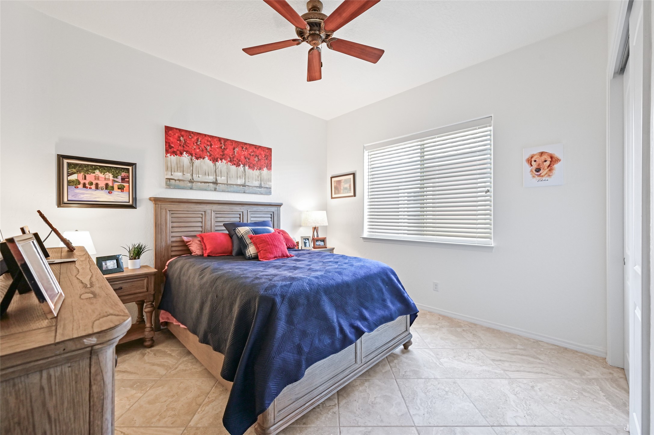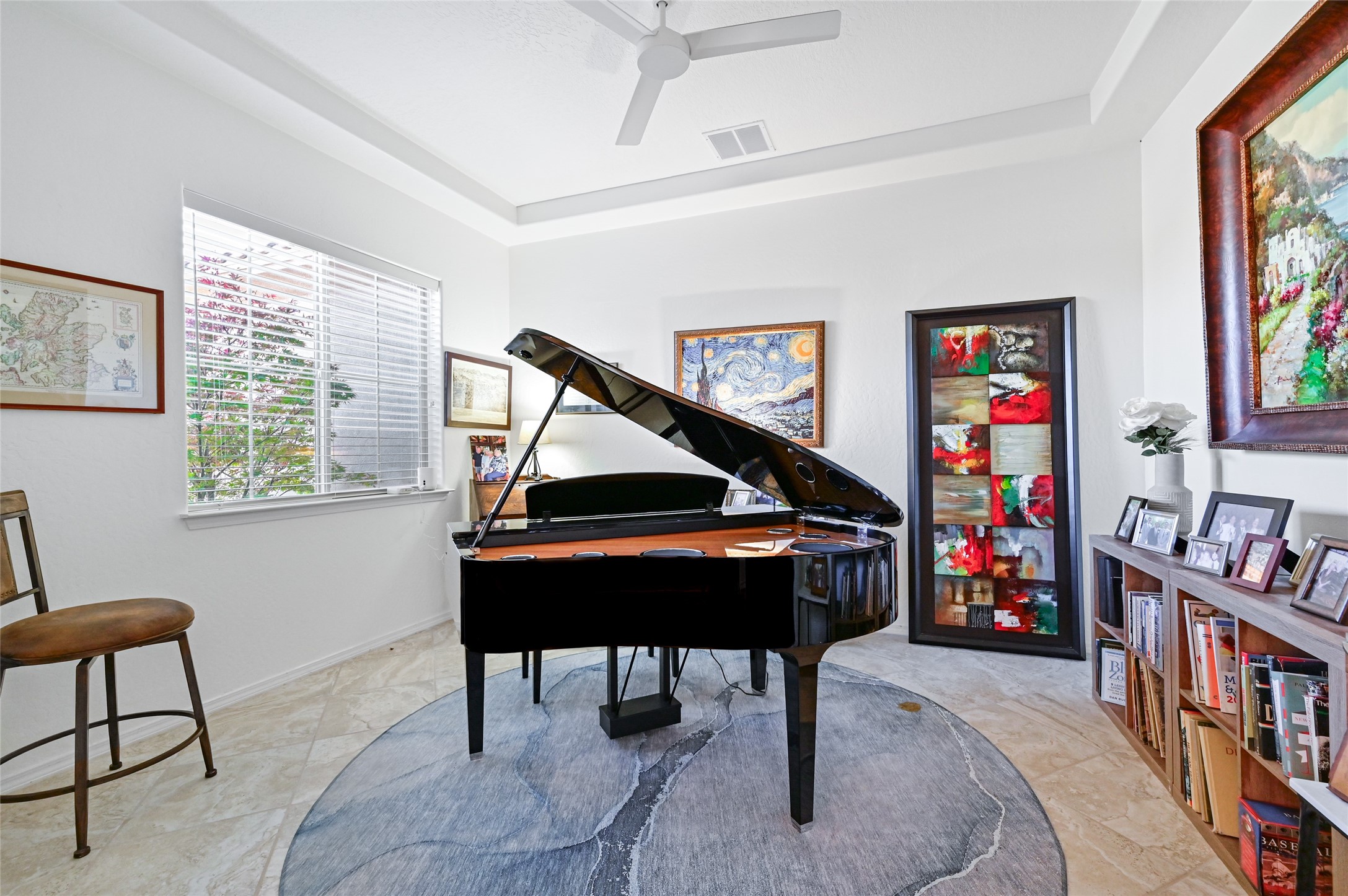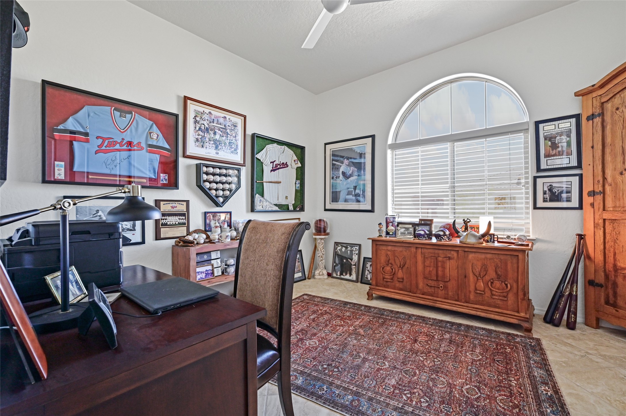 Step Inside Your Dream Home! Welcome to this beautifully designed, single-level retreat featuring 3 spacious bedrooms, a den/office and 2 full bathrooms. Thoughful design with the comfort of refrigerated air conditioning and the stunning scale provided by 10-ft ceilings and 8-ft doors throughout. An open-concept floor plan flows effortlessly from the living room to the kitchen and dining areas. Fall in love with the gourmet kitchen, a true chef's haven! It's equipped with a gas cooktop, two electric ovens, and a brilliantly designed 42-inch island that even features a convenient, elevated dishwasher. A consistent flow of porcelain tile flooring ties the entire home together, offering both beauty and easy upkeep. A Retreat for Everyone. You'll find the tranquil primary bedroom suite on one end of the home, while the comfortable guest wing is tucked away on the other. A serene enclosed sunroom, complete with windows and screening, features a built-in barbecue grill! An ideal place to unwind while enjoying views of the walled yard. The same luxurious granite countertops you see inside right into the outdoor kitchen area for a sophisticated, continuous look. Outdoor Oasis and Community Perks. The backyard features a custom pergola--the perfect spot to enjoy the beautiful Southwest Garden. And the community adds value with a great jogging path just steps away! This home truly brings together style, comfort, and functionality.