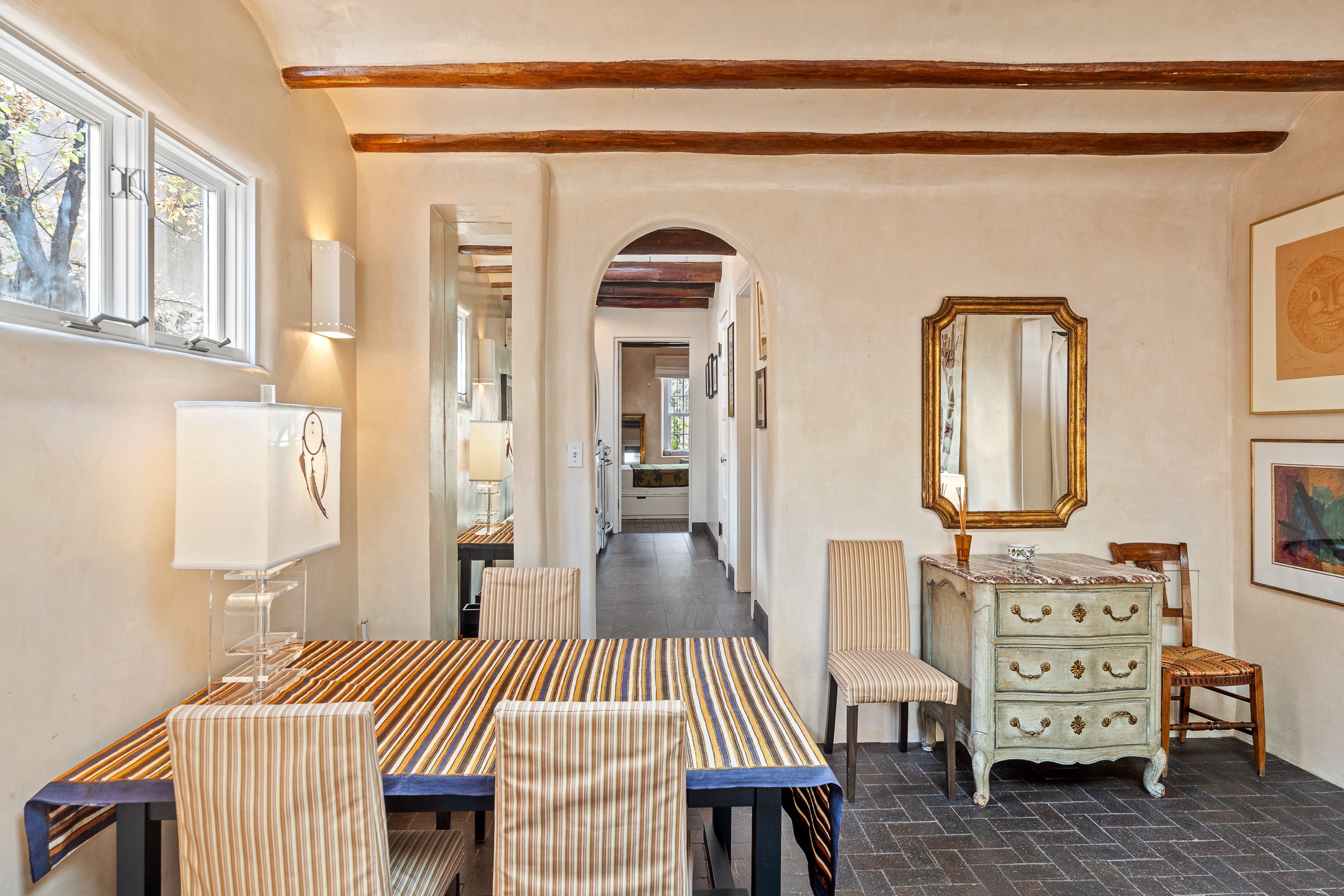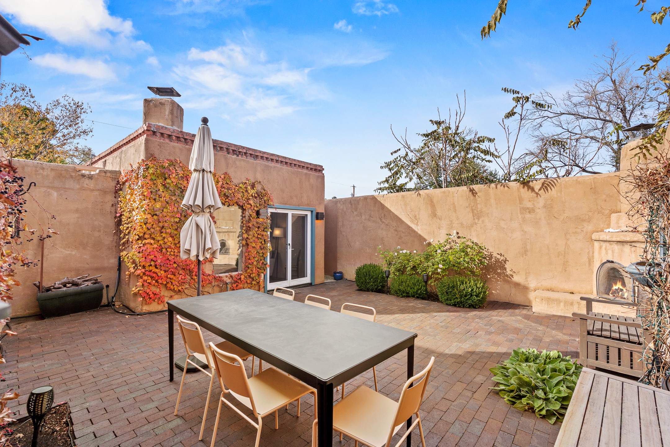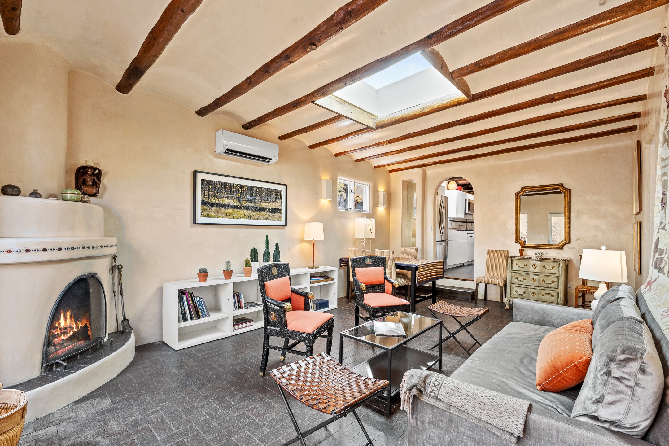 Exuding the timeless character of original Santa Fe style, this light-filled 1-bedroom, 1-bath adobe is perfectly positioned on picturesque Arroyo Tenorio--just around the corner from Kaune's, the Plaza, and your morning coffee at Downtown Subscription. The ideal Santa Fe pied--terre, lock-and-leave retreat, or turnkey rental.Showcasing the warmth of classic Territorial adobe architecture, the inviting living room features a wood-burning kiva fireplace, vigas, plaster walls, and tile floors that beautifully reflect the home's authentic character. Sunlight streams through the space, creating a bright and welcoming ambiance. A private outdoor patio extends the living area and offers a sunny, tranquil setting for morning coffee or evening gatherings--complete with its own kiva fireplace for year-round enjoyment. The cozy bedroom offers a peaceful retreat, while the sweet, efficient kitchen blends charm with functionality--perfect for preparing a quiet breakfast or hosting friends. Comfort is ensured with two mini-split systems providing efficient heating and cooling.Beautifully located, beautifully styled, and effortlessly livable--this enchanting home places you just steps from Santa Fe's finest dining, boutiques, galleries, and cultural landmarks. A rare opportunity to own a turnkey treasure in one of the city's most beloved and walkable neighborhoods.