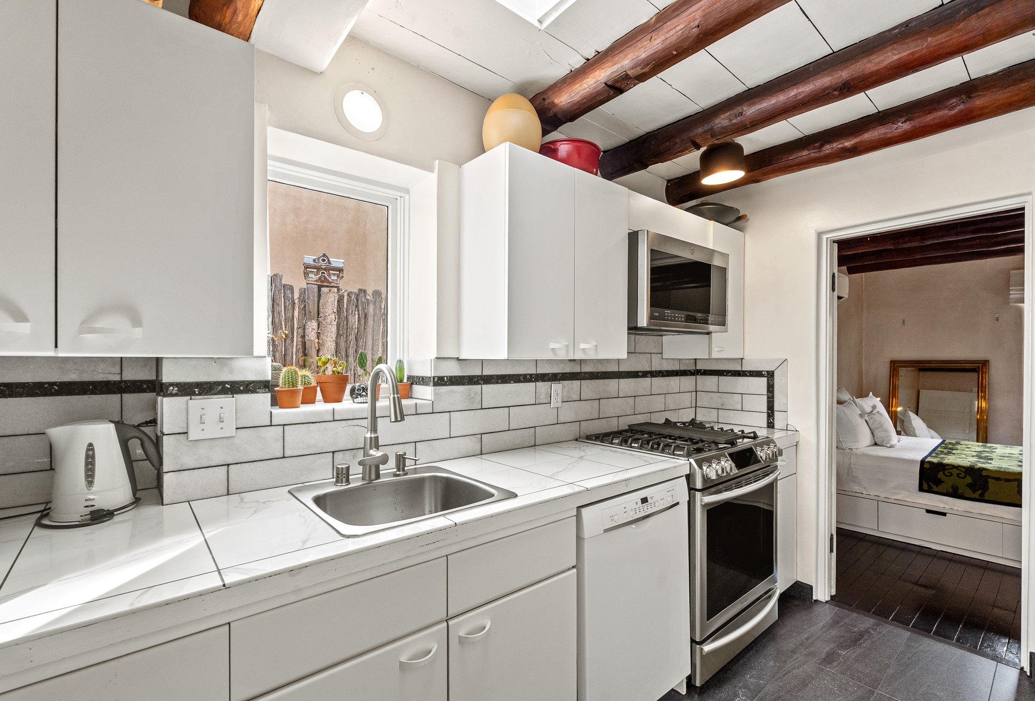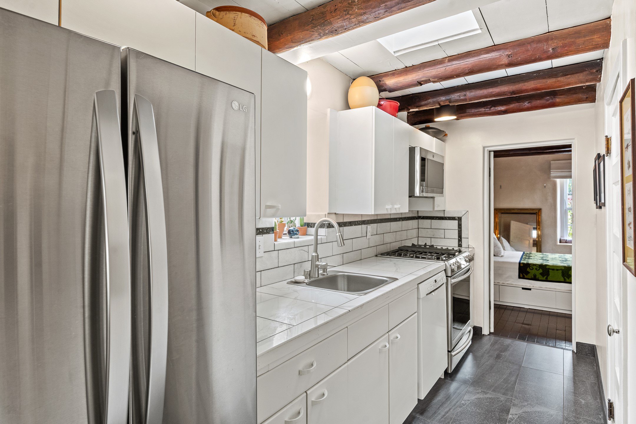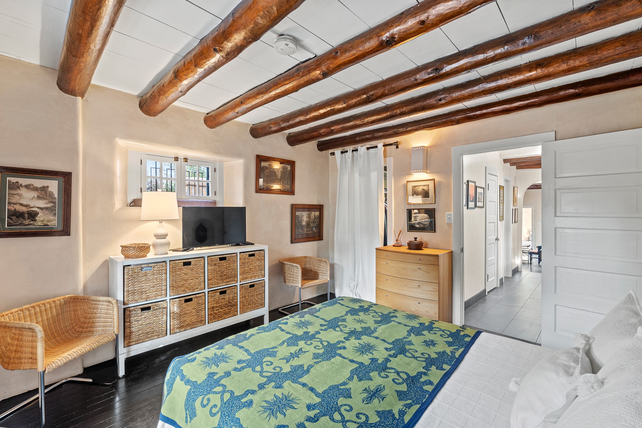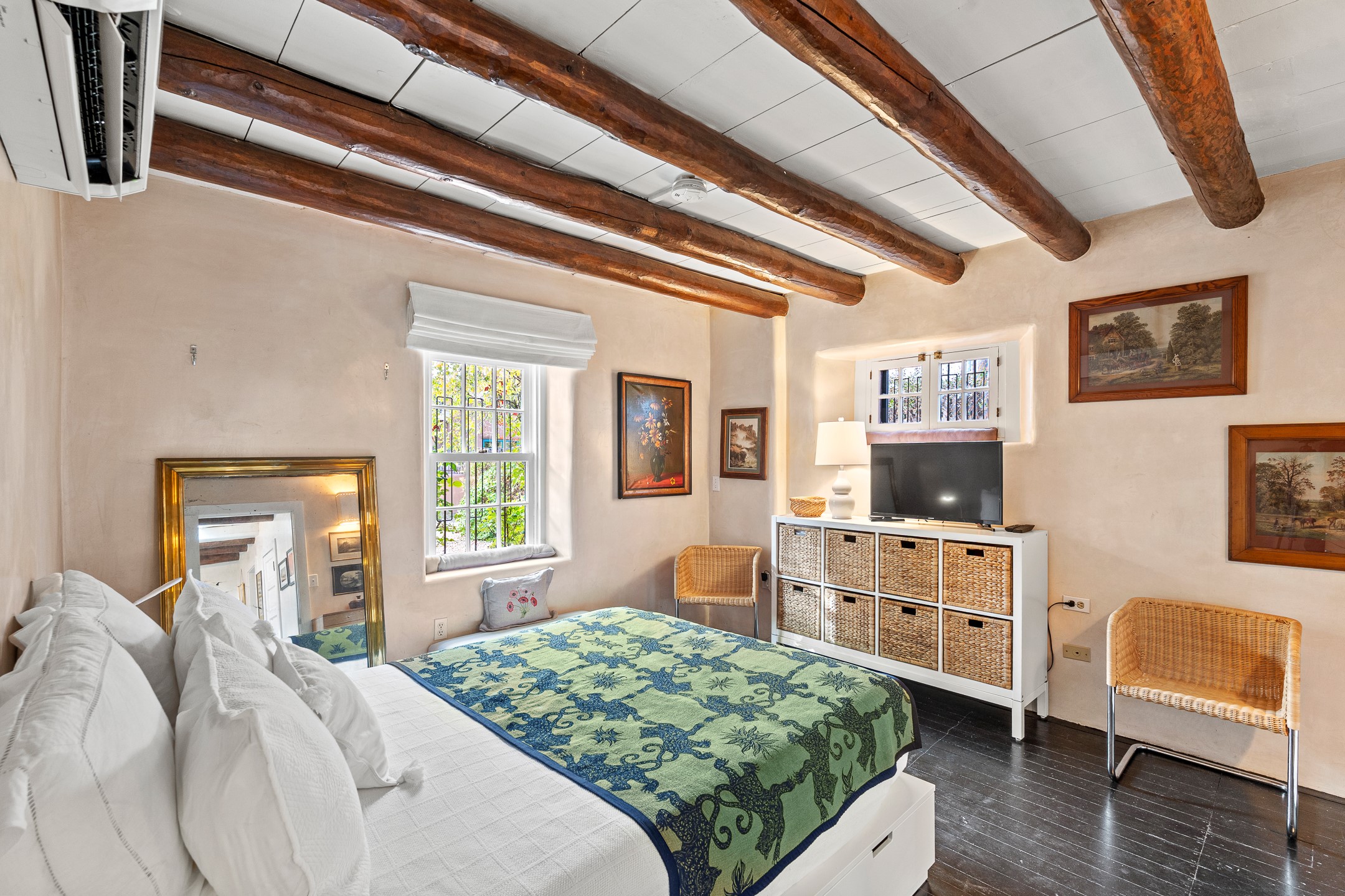 Exuding the timeless character of original Santa Fe style, this light-filled 1-bedroom, 1-bath adobe is perfectly positioned on picturesque Arroyo Tenorio--just around the corner from Kaune's, the Plaza, and your morning coffee at Downtown Subscription. The ideal Santa Fe pied--terre, lock-and-leave retreat, or turnkey rental.Showcasing the warmth of classic Territorial adobe architecture, the inviting living room features a wood-burning kiva fireplace, vigas, plaster walls, and tile floors that beautifully reflect the home's authentic character. Sunlight streams through the space, creating a bright and welcoming ambiance. A private outdoor patio extends the living area and offers a sunny, tranquil setting for morning coffee or evening gatherings--complete with its own kiva fireplace for year-round enjoyment. The cozy bedroom offers a peaceful retreat, while the sweet, efficient kitchen blends charm with functionality--perfect for preparing a quiet breakfast or hosting friends. Comfort is ensured with two mini-split systems providing efficient heating and cooling.Beautifully located, beautifully styled, and effortlessly livable--this enchanting home places you just steps from Santa Fe's finest dining, boutiques, galleries, and cultural landmarks. A rare opportunity to own a turnkey treasure in one of the city's most beloved and walkable neighborhoods.